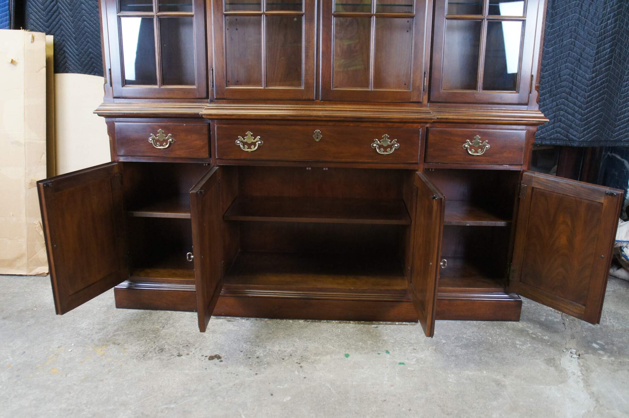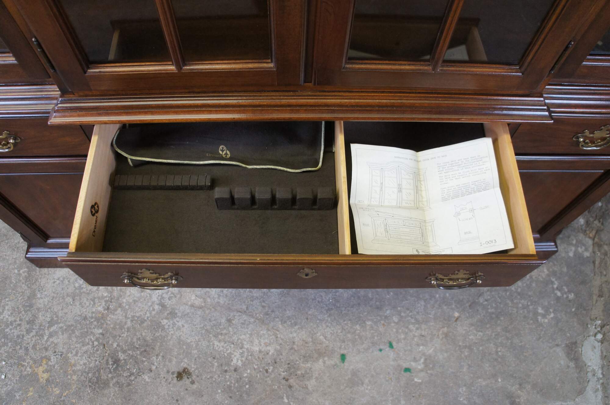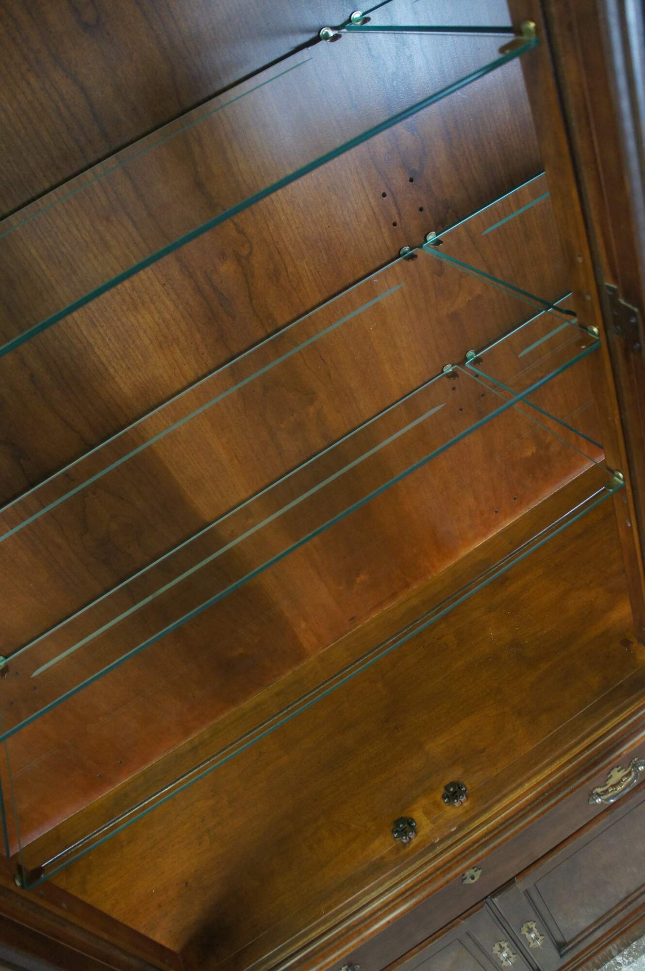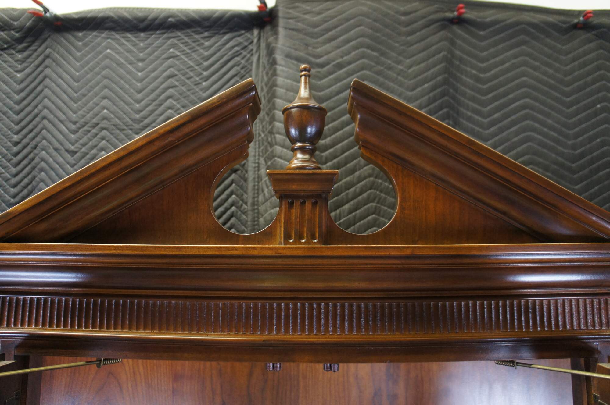 Vintage 1987 Drexel Furniture China cabinet featuring traditional styling with open pediment trophy finial over an illumined showcase, supported by a lower cabinet with large silverware drawer and additional storage.