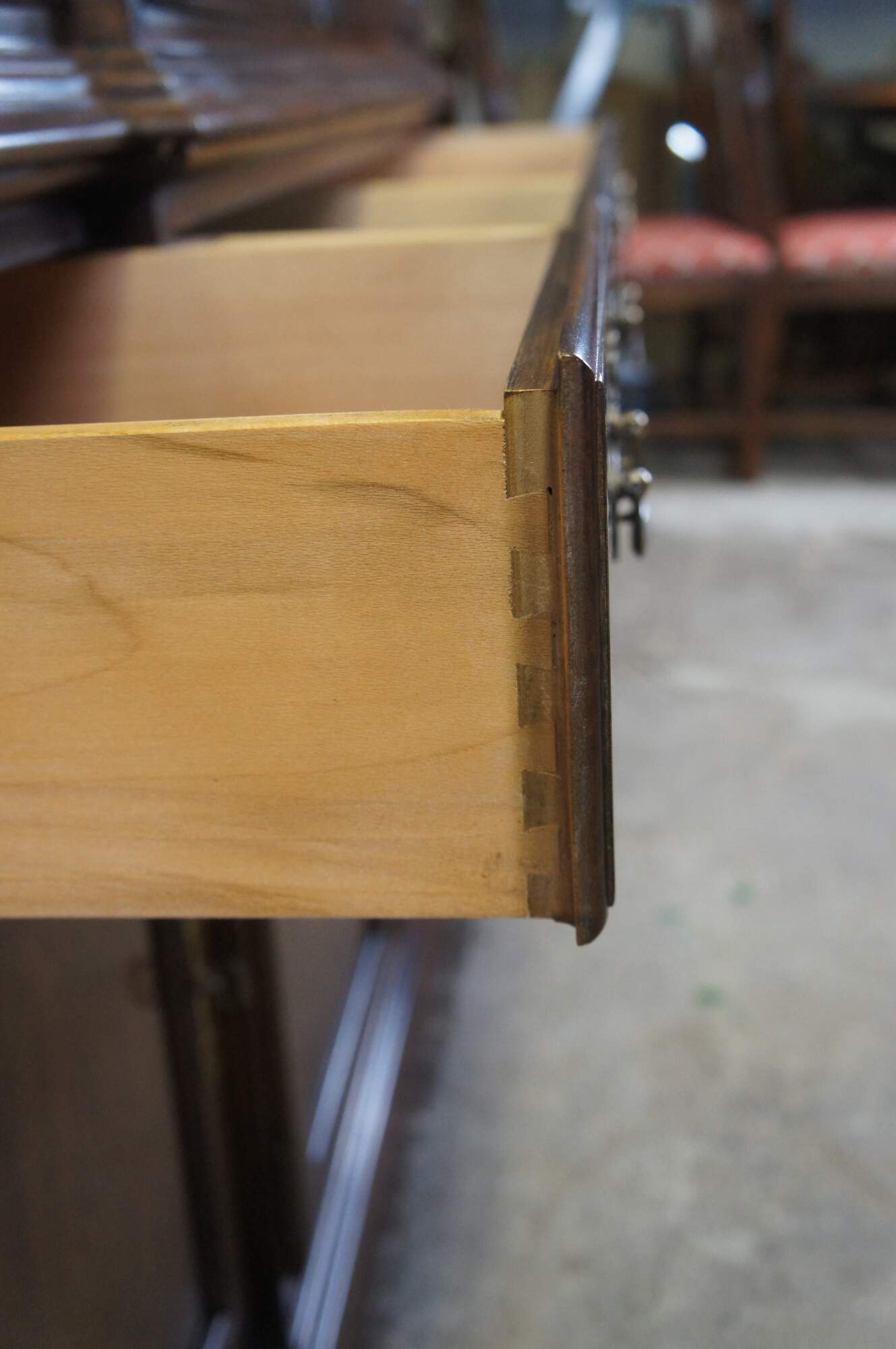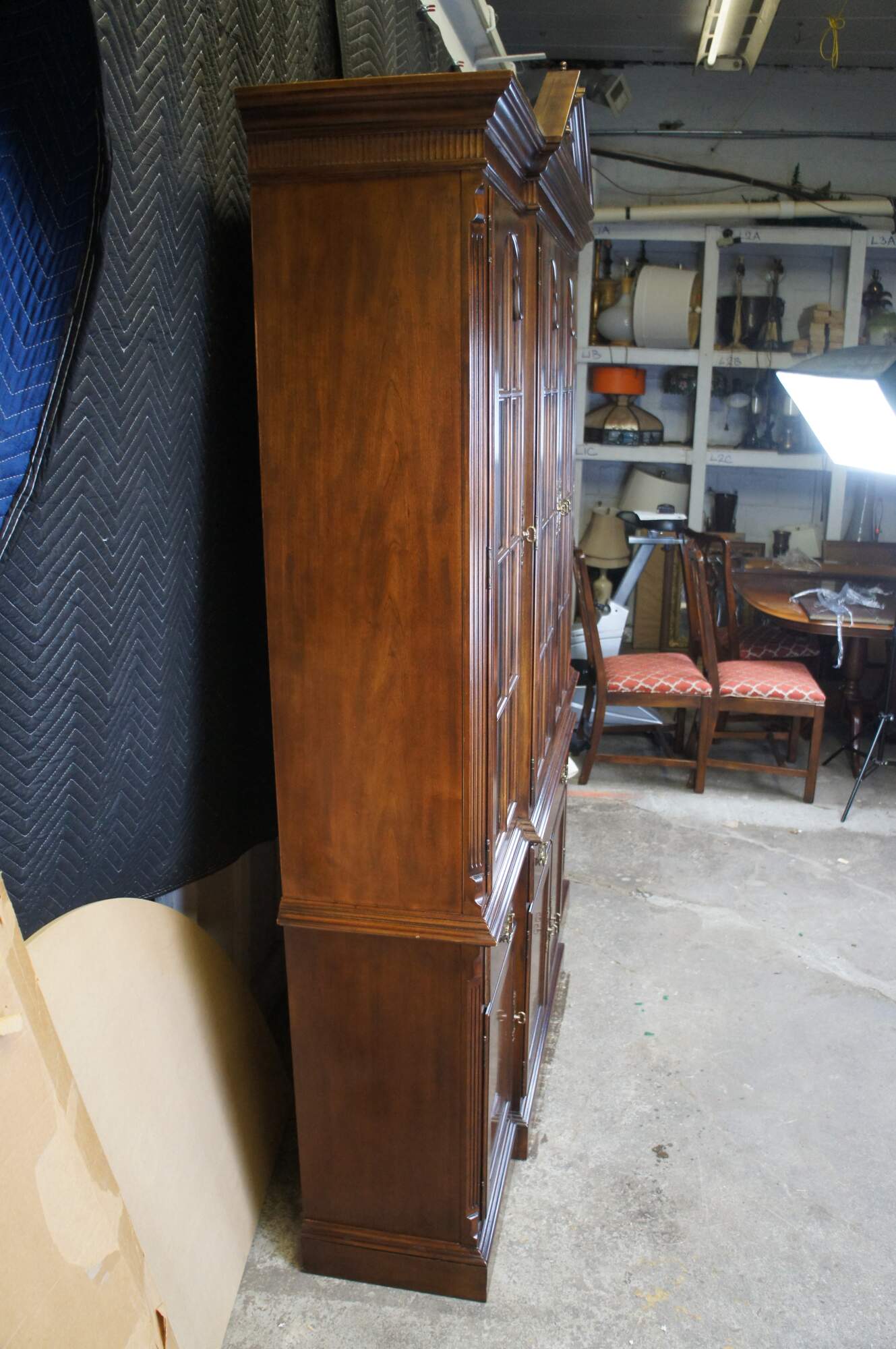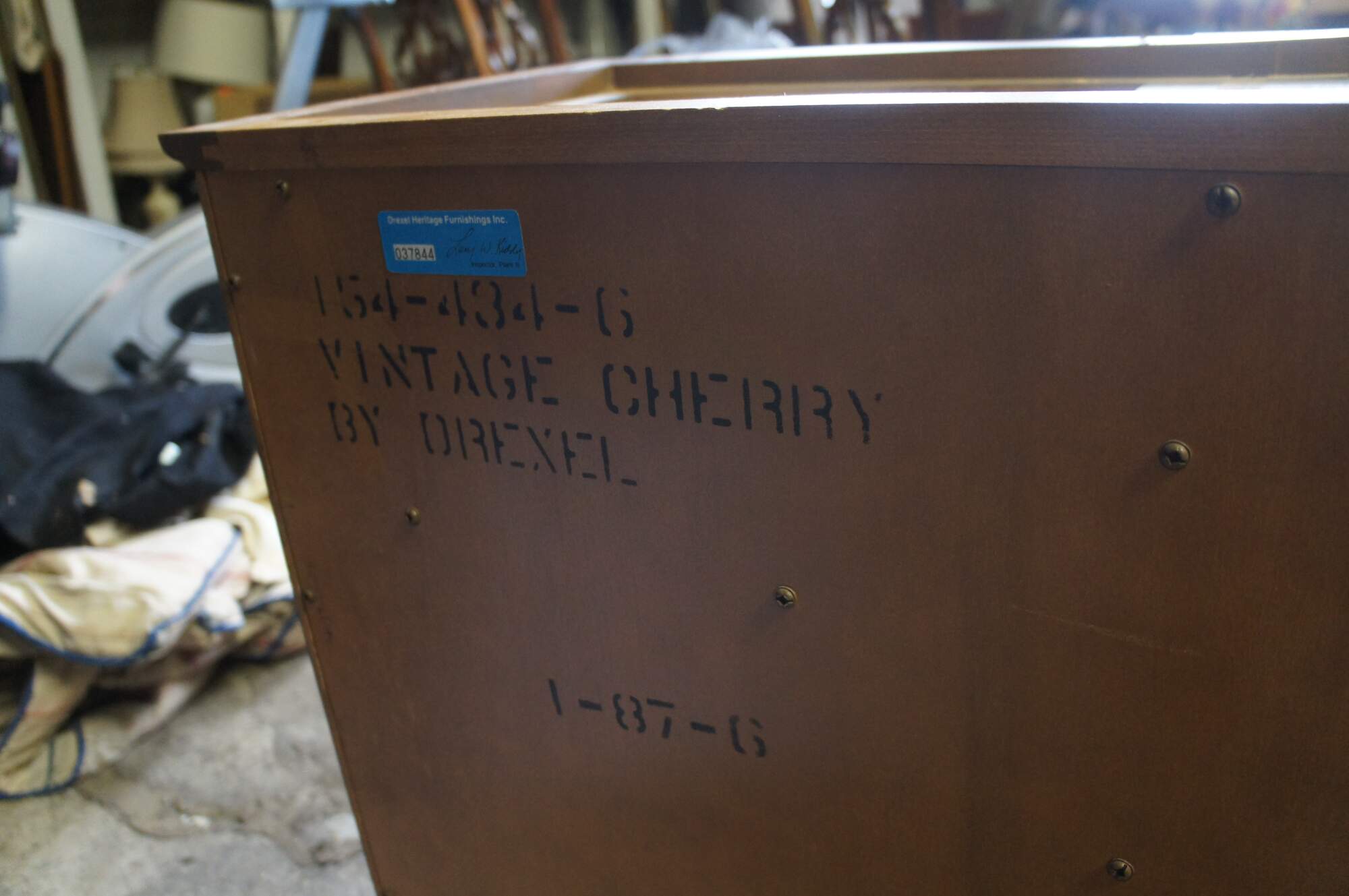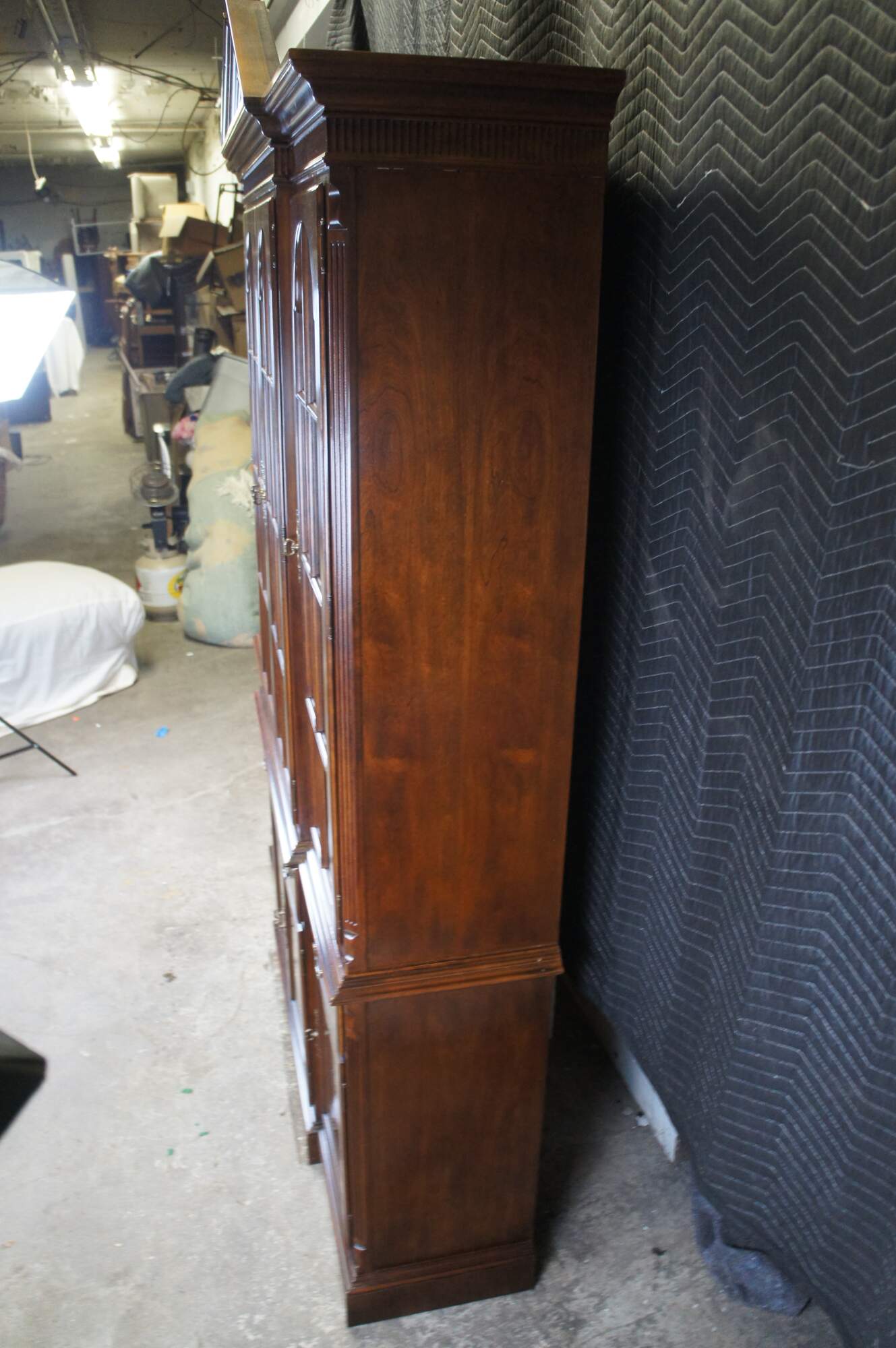 Vintage 1987 Drexel Furniture China cabinet featuring traditional styling with open pediment trophy finial over an illumined showcase, supported by a lower cabinet with large silverware drawer and additional storage.
