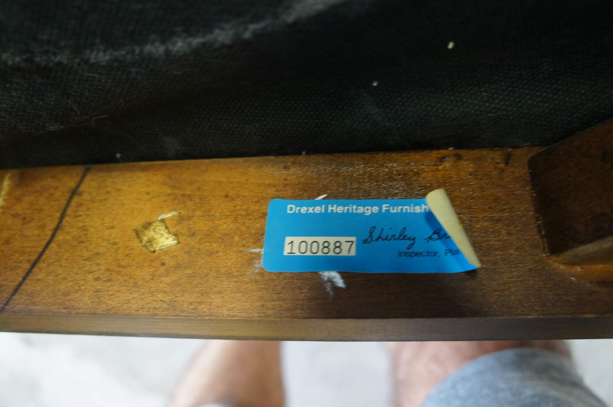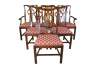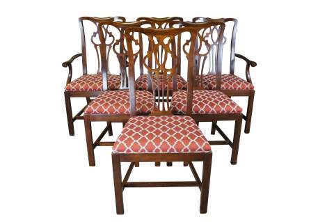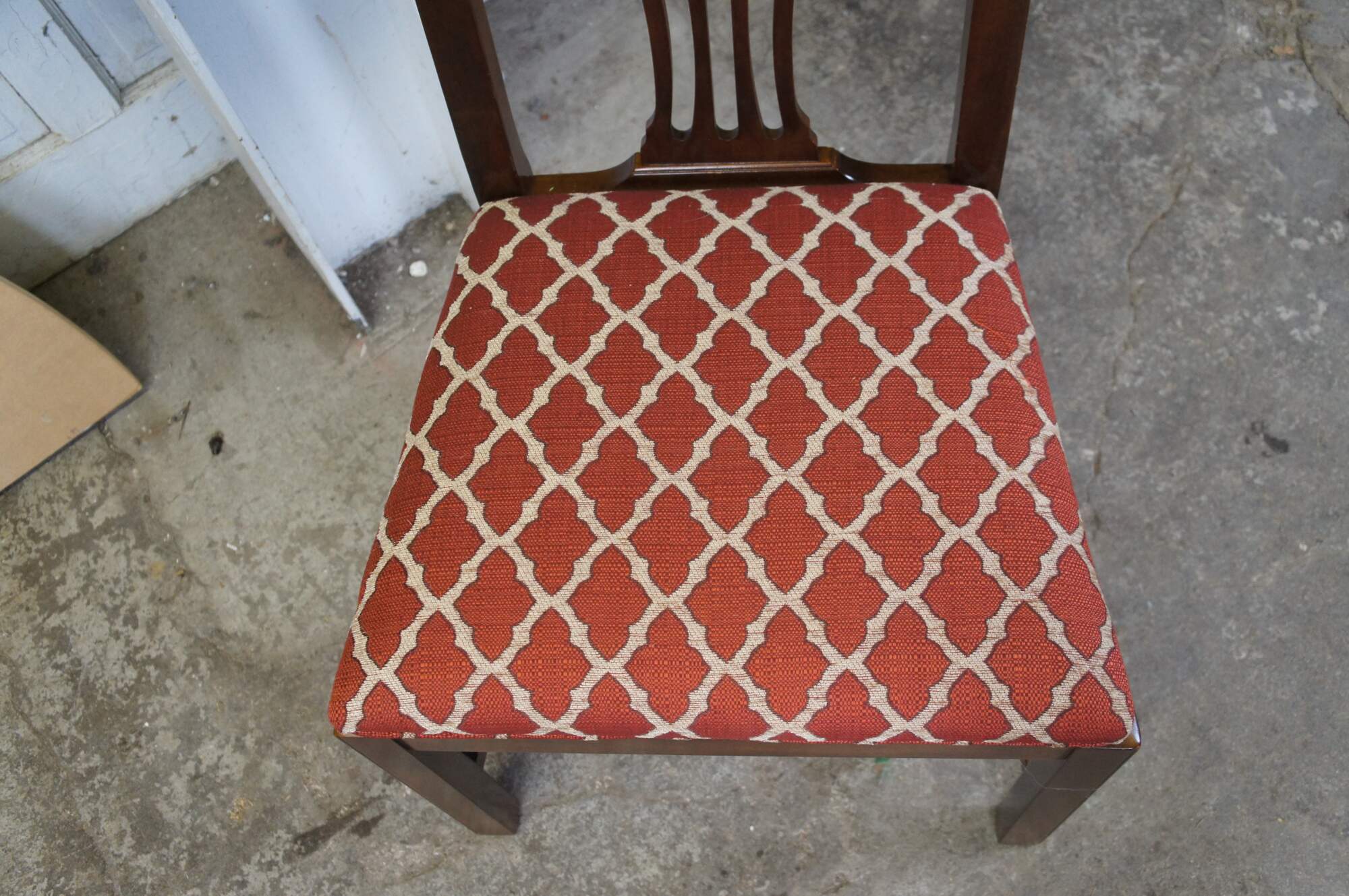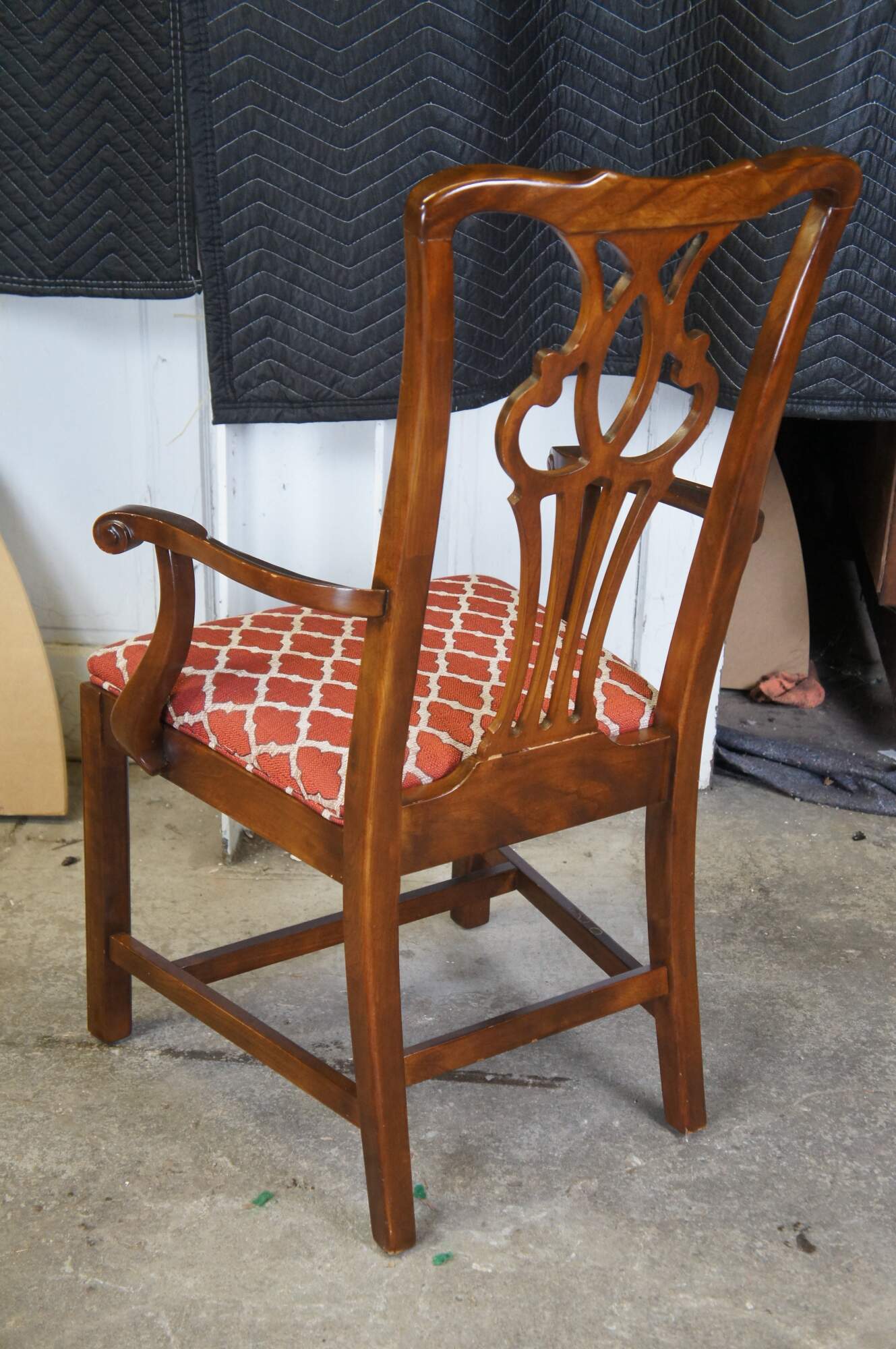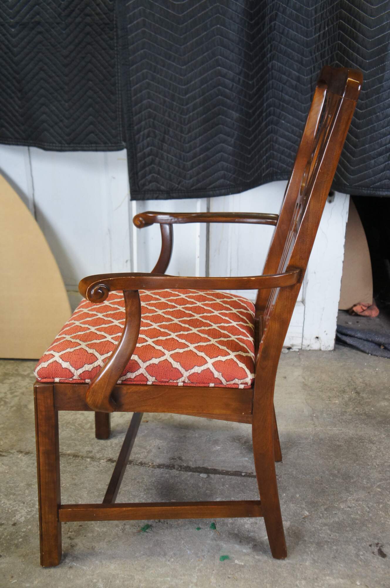 Vintage set of six Drexel dining chairs. Made of cherry featuring American Chippendale styling with a pierced reticulated back splat and quatrefoil style fabric.