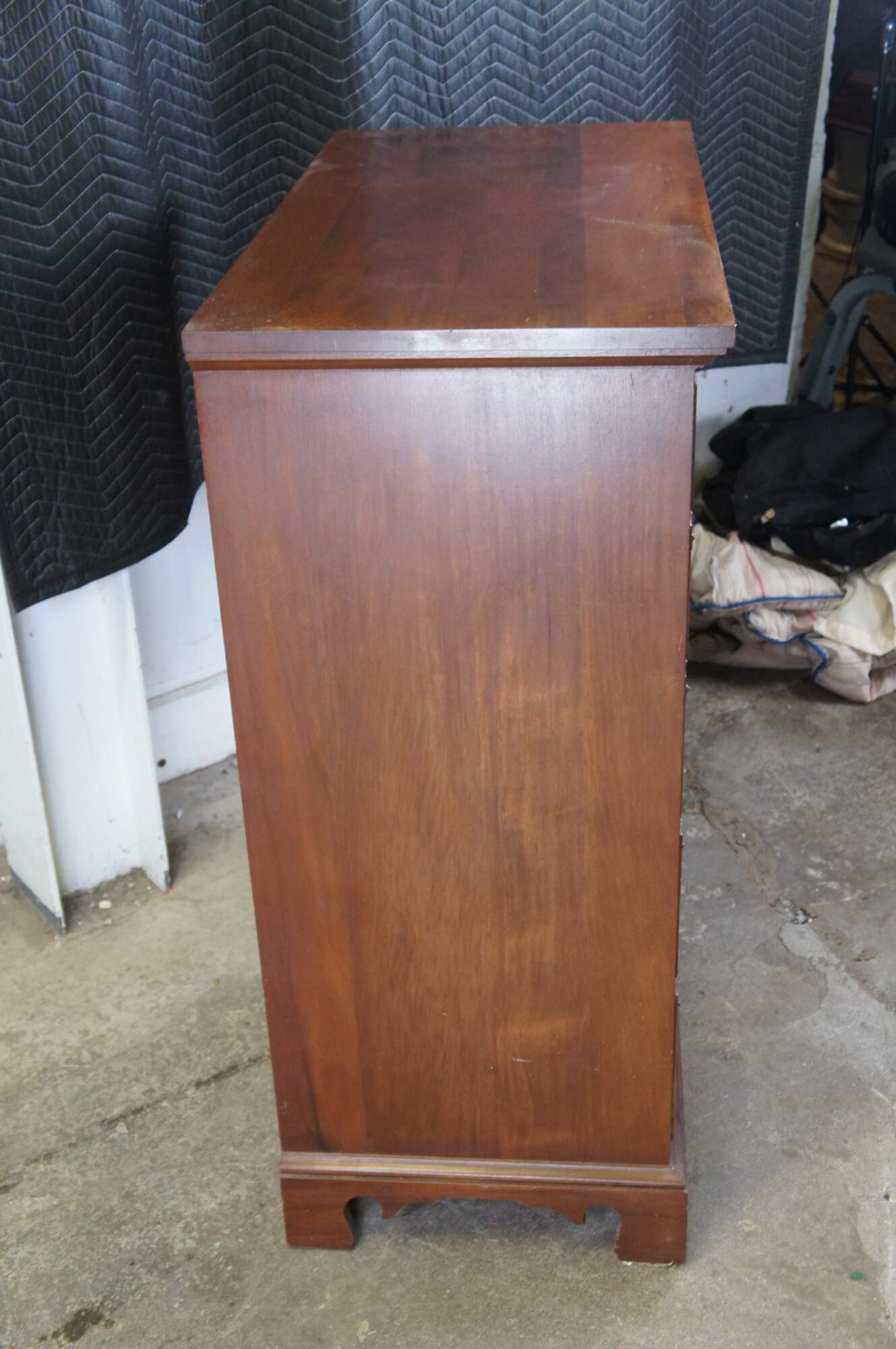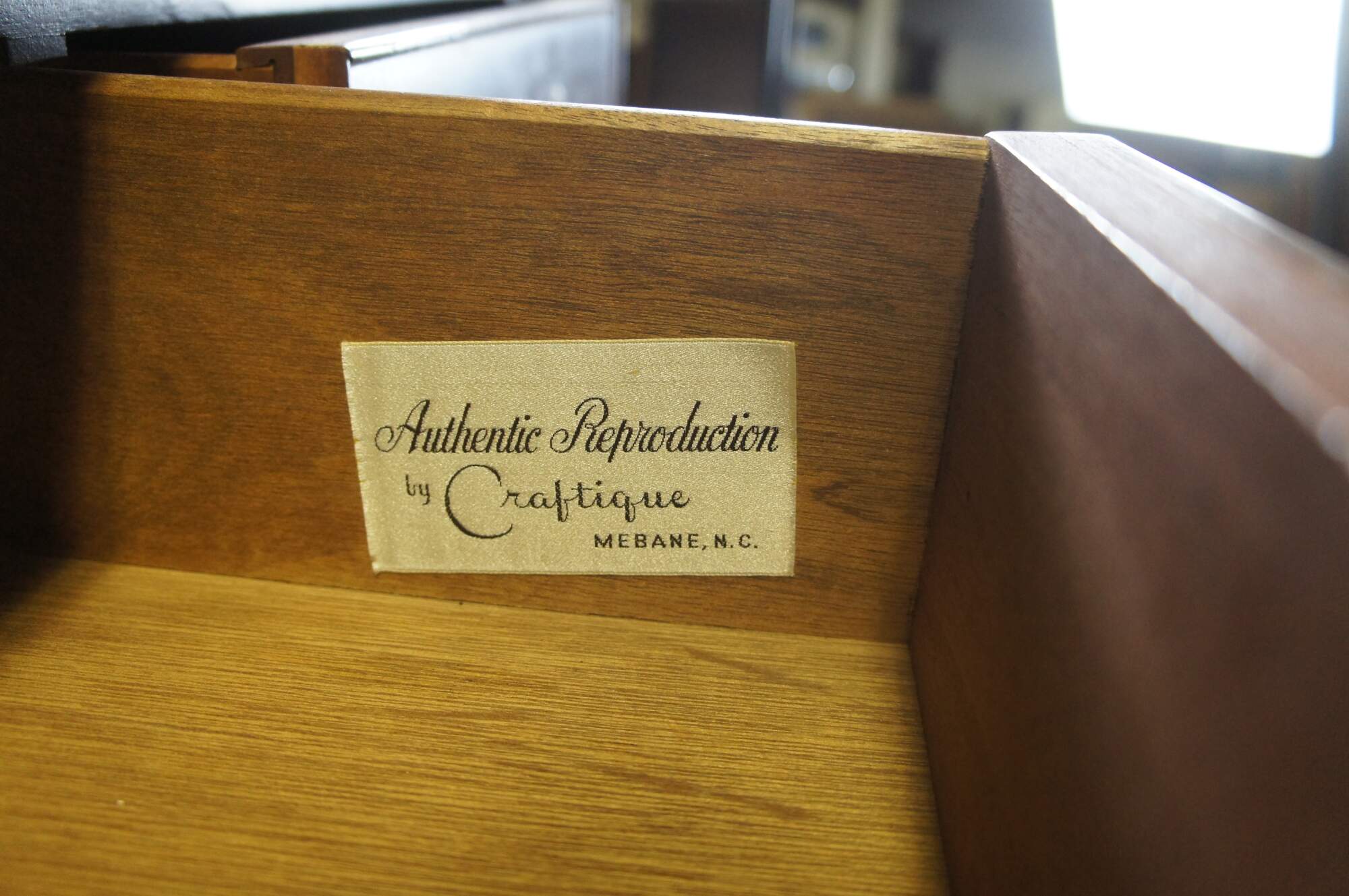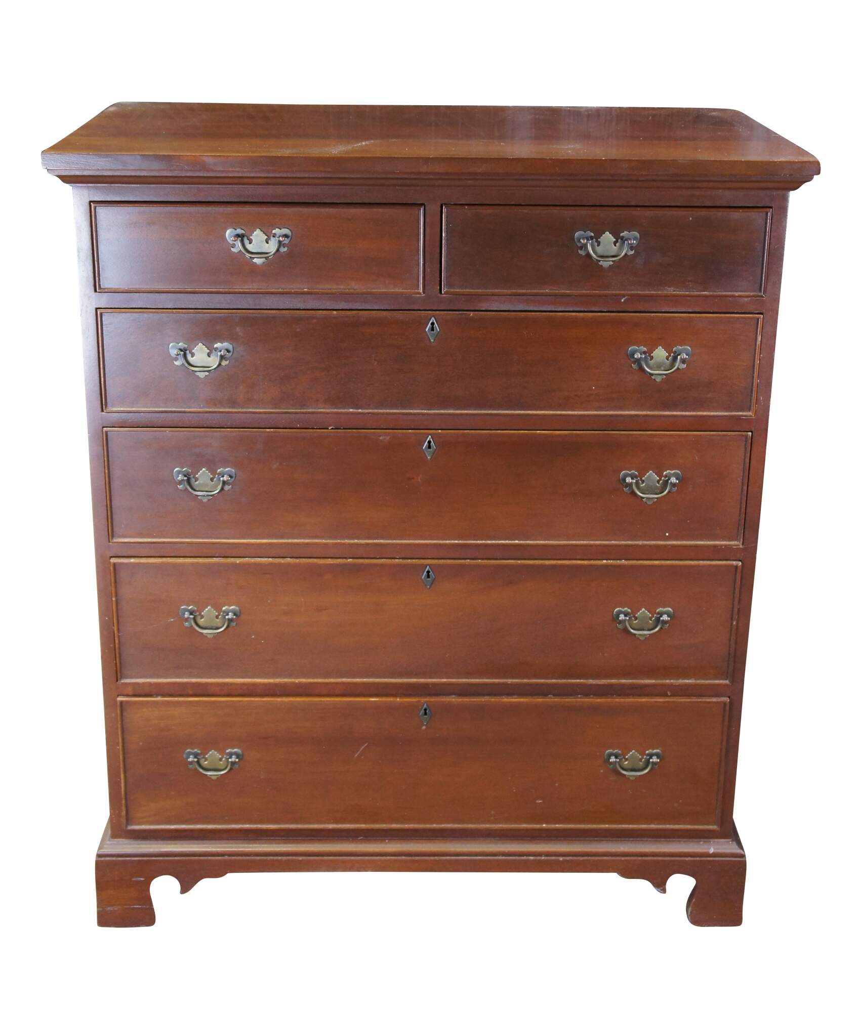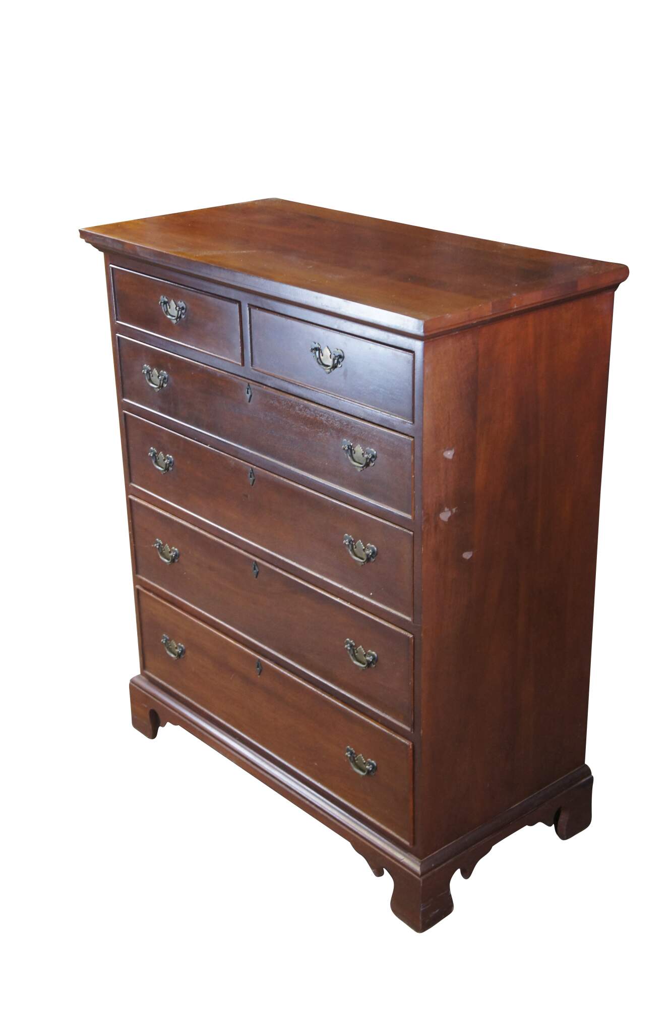 Vintage Craftique Authentic Reproduction tallboy dresser or chest of drawers. Made of mahogany featuring Chippendale styling with six drawers, brass hardware and bracket feet.