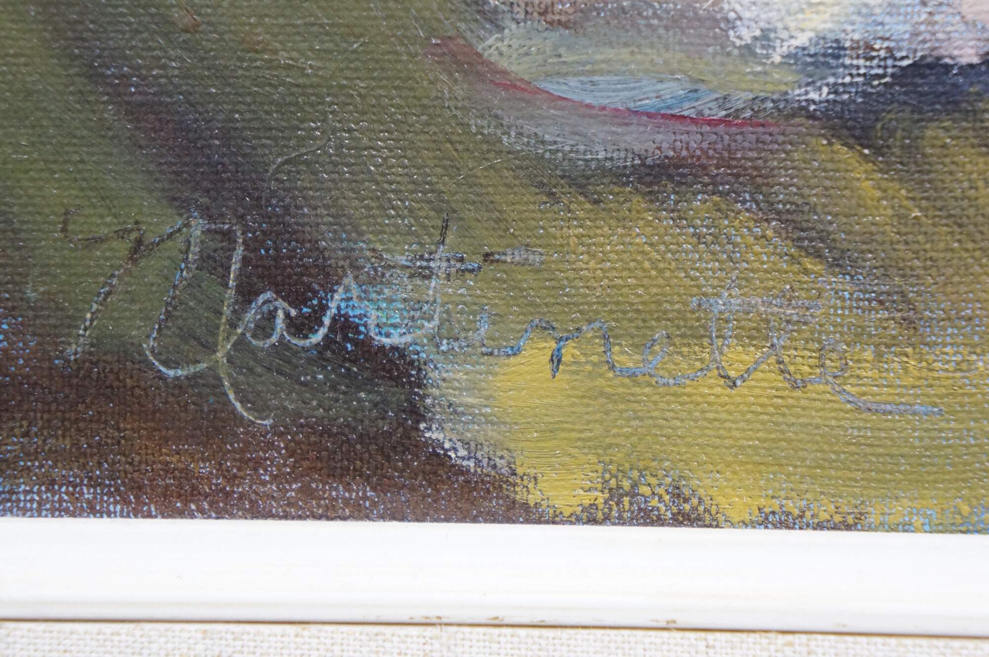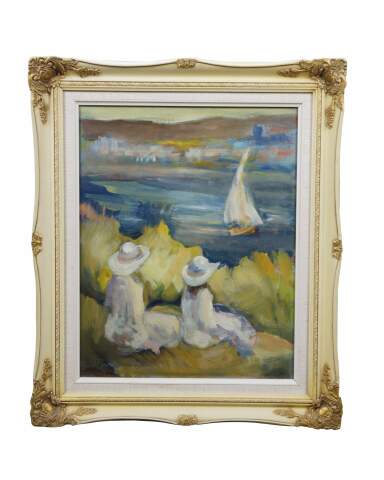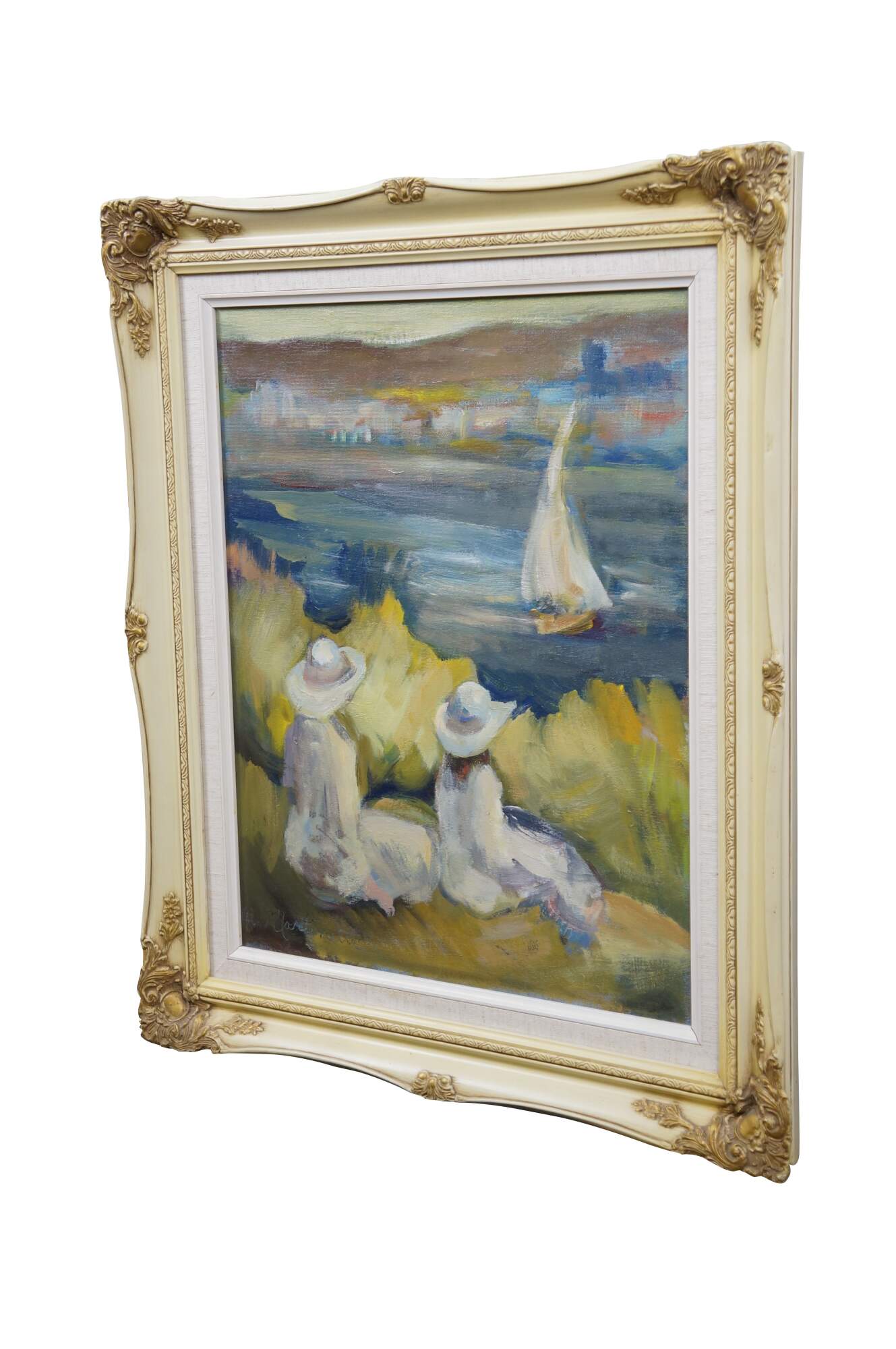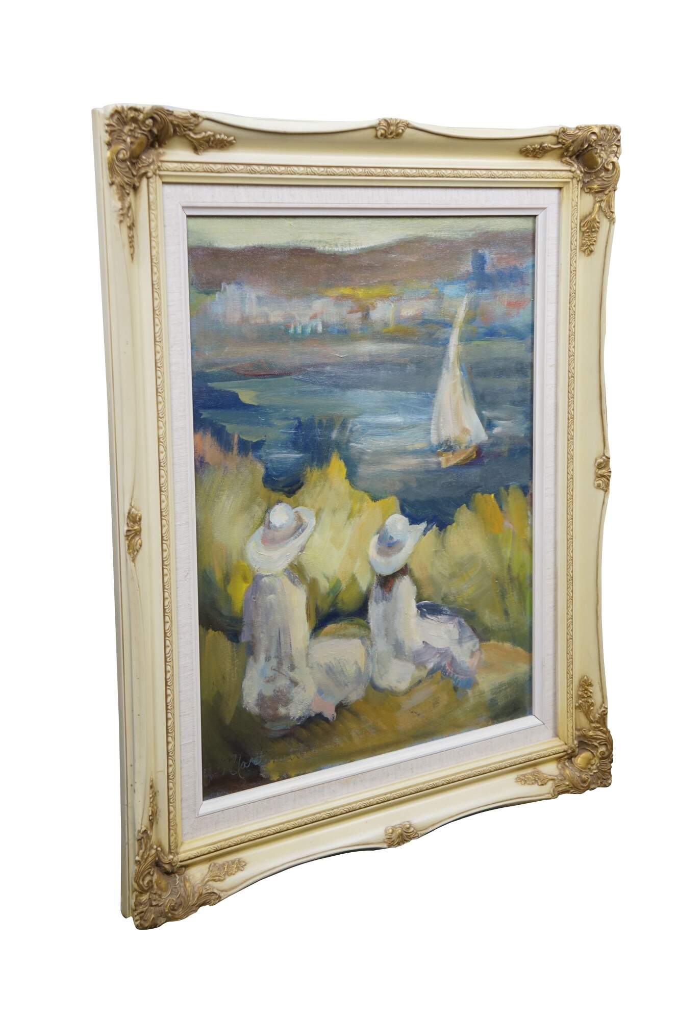 Late 20th century impressionist oil on canvas painting depicting a pair of women in white, seated on a hill and gazing at a sail boat on water. Signed Martinette, lower left. Cream painted and gilt composite French Provincial frame with foliate / scalloped corners; white linen mat.