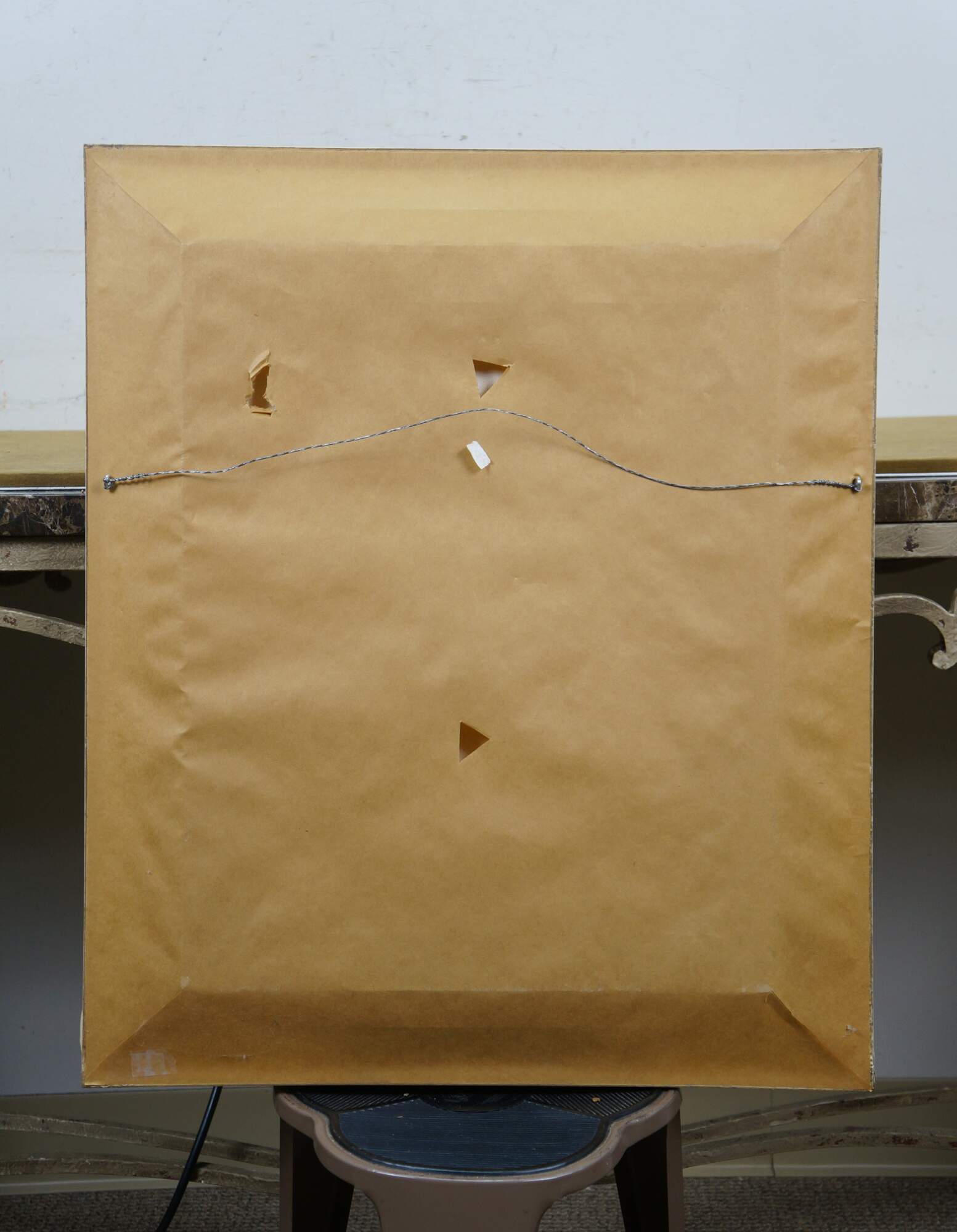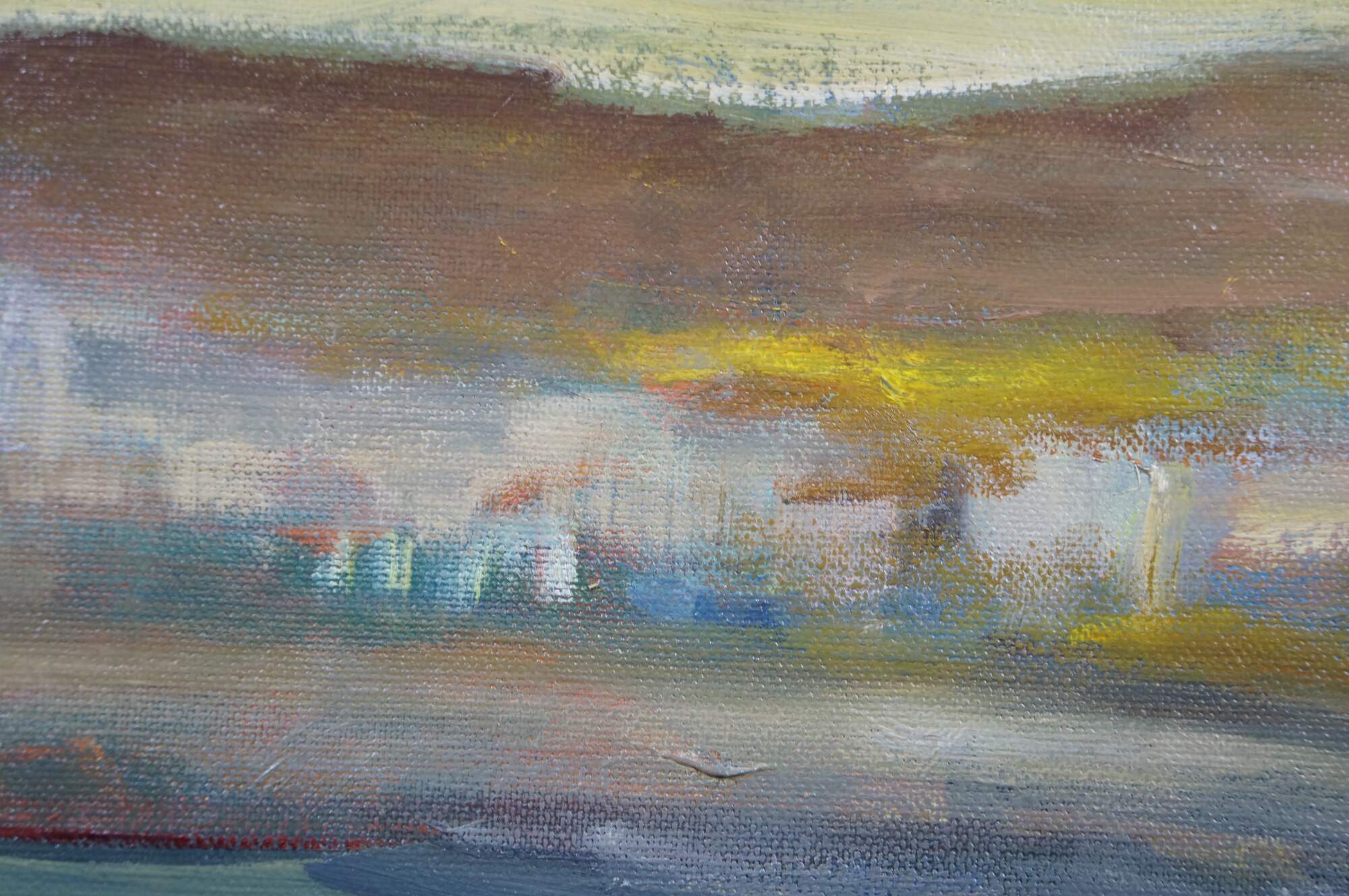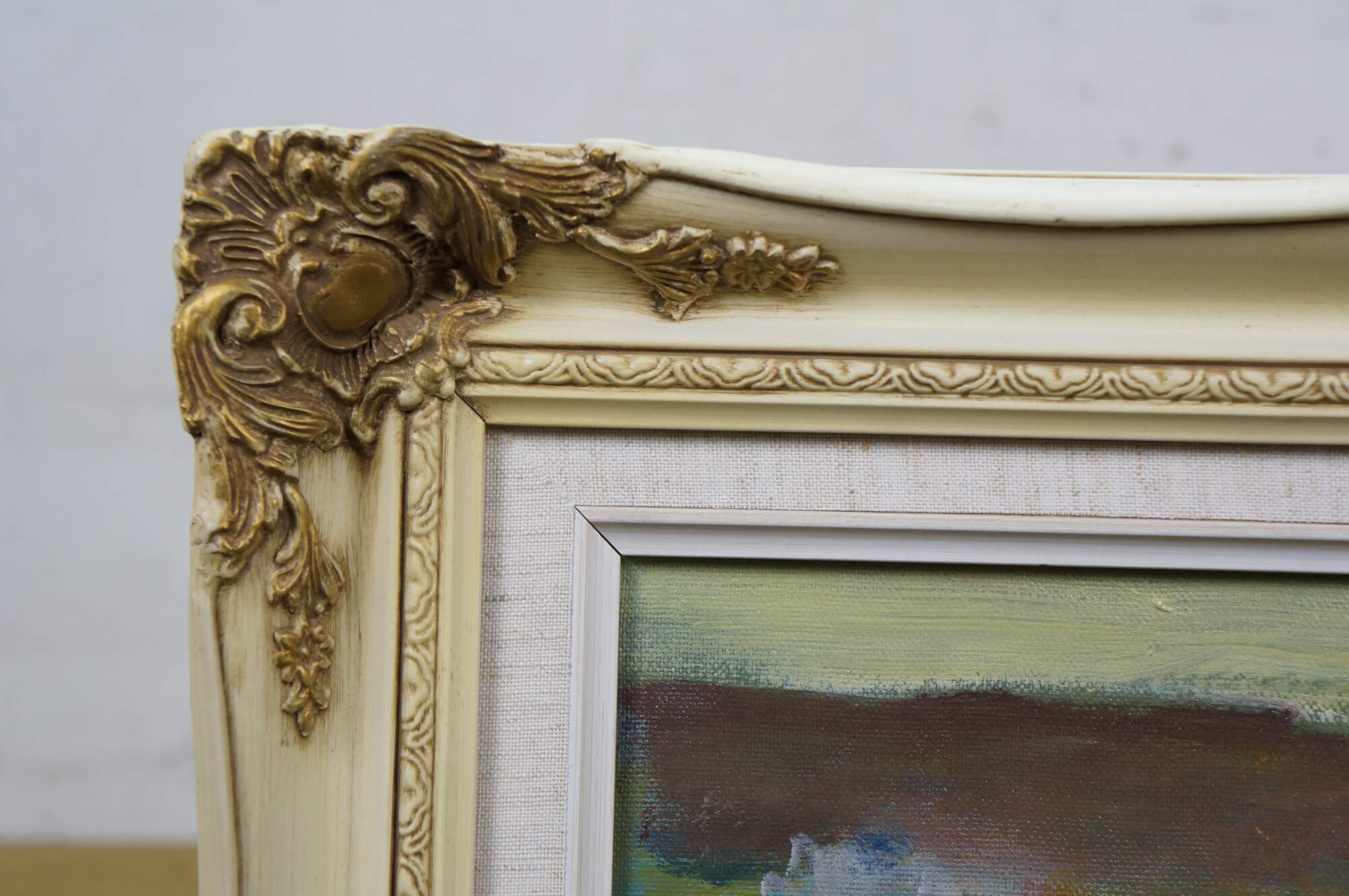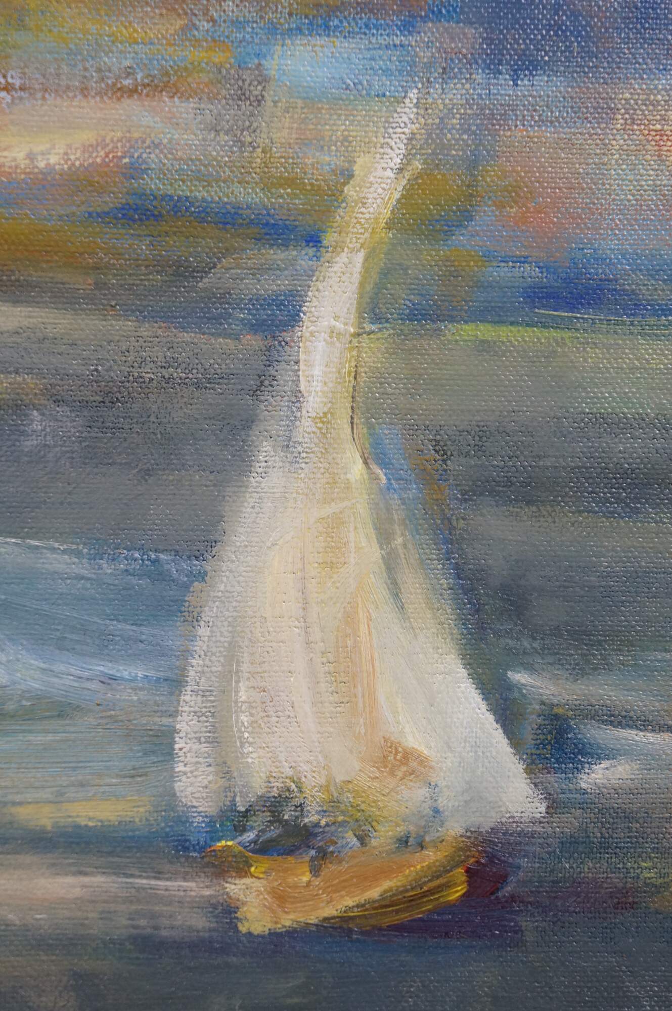 Late 20th century impressionist oil on canvas painting depicting a pair of women in white, seated on a hill and gazing at a sail boat on water. Signed Martinette, lower left. Cream painted and gilt composite French Provincial frame with foliate / scalloped corners; white linen mat.