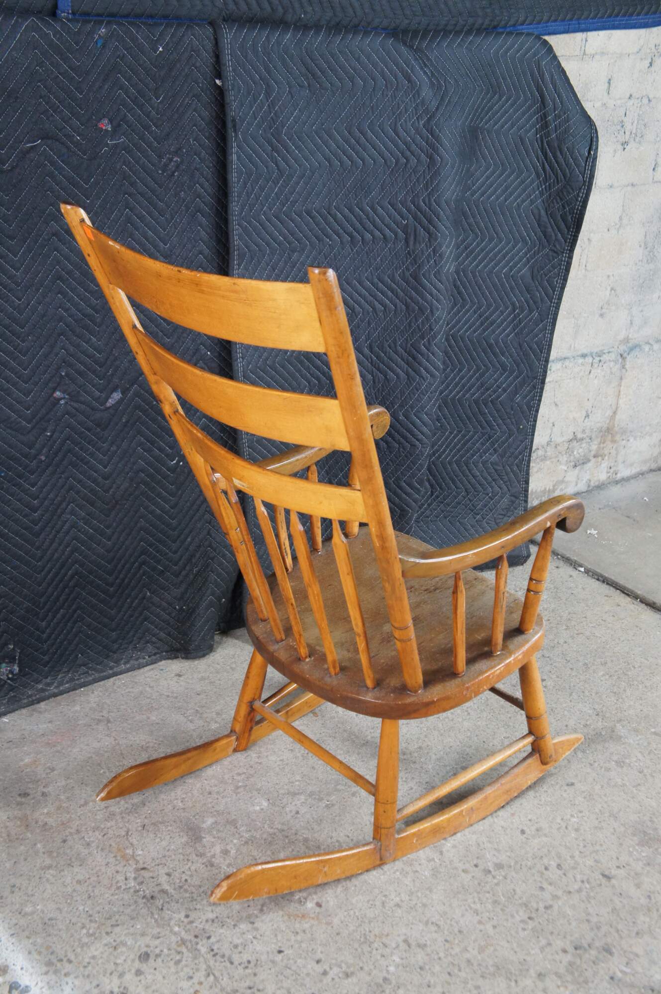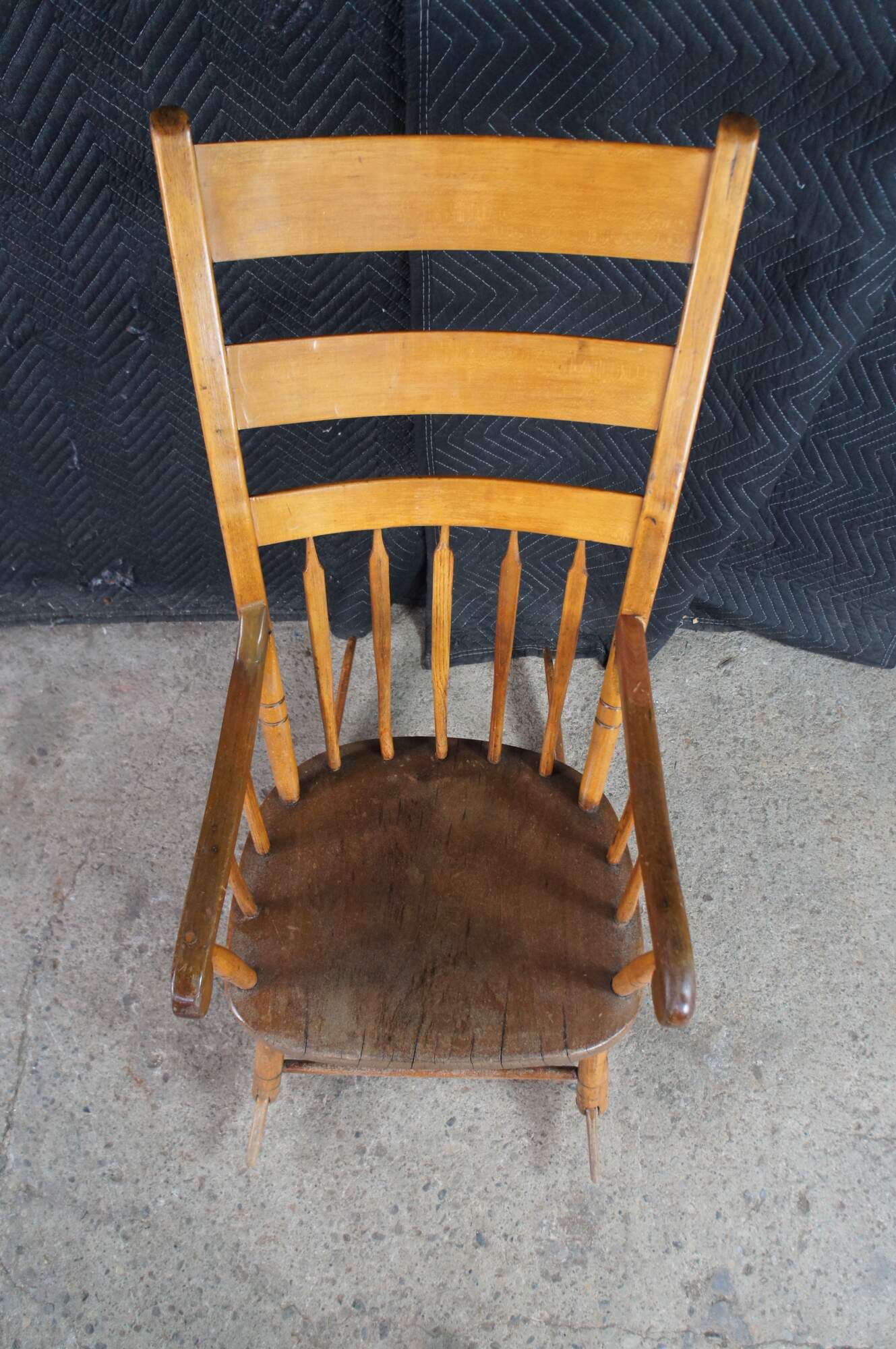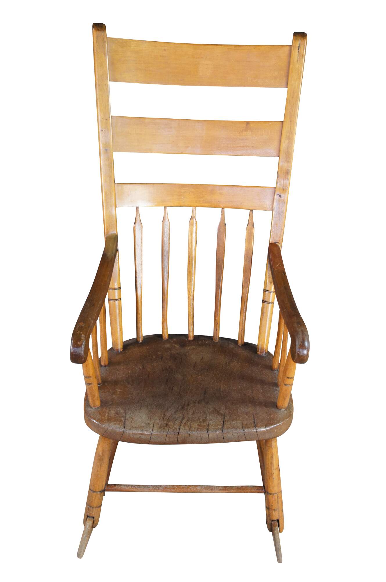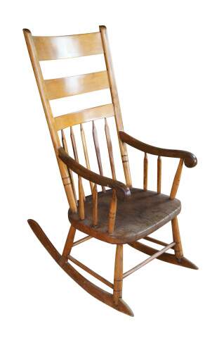 Antique Early American Country Farmhouse Windsor arm chair rocker. Made of maple featuring a primitive slatted ladderback design.
