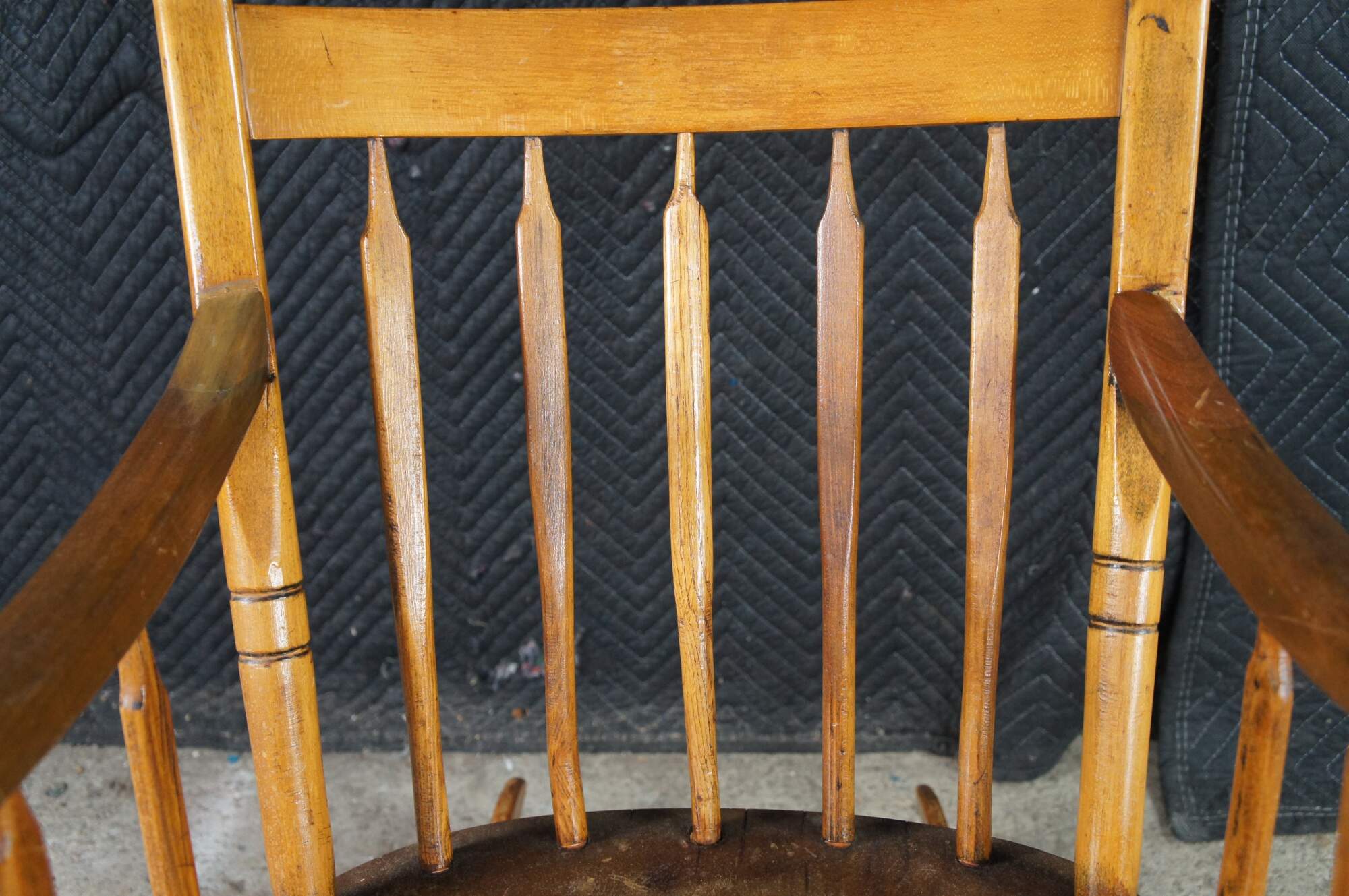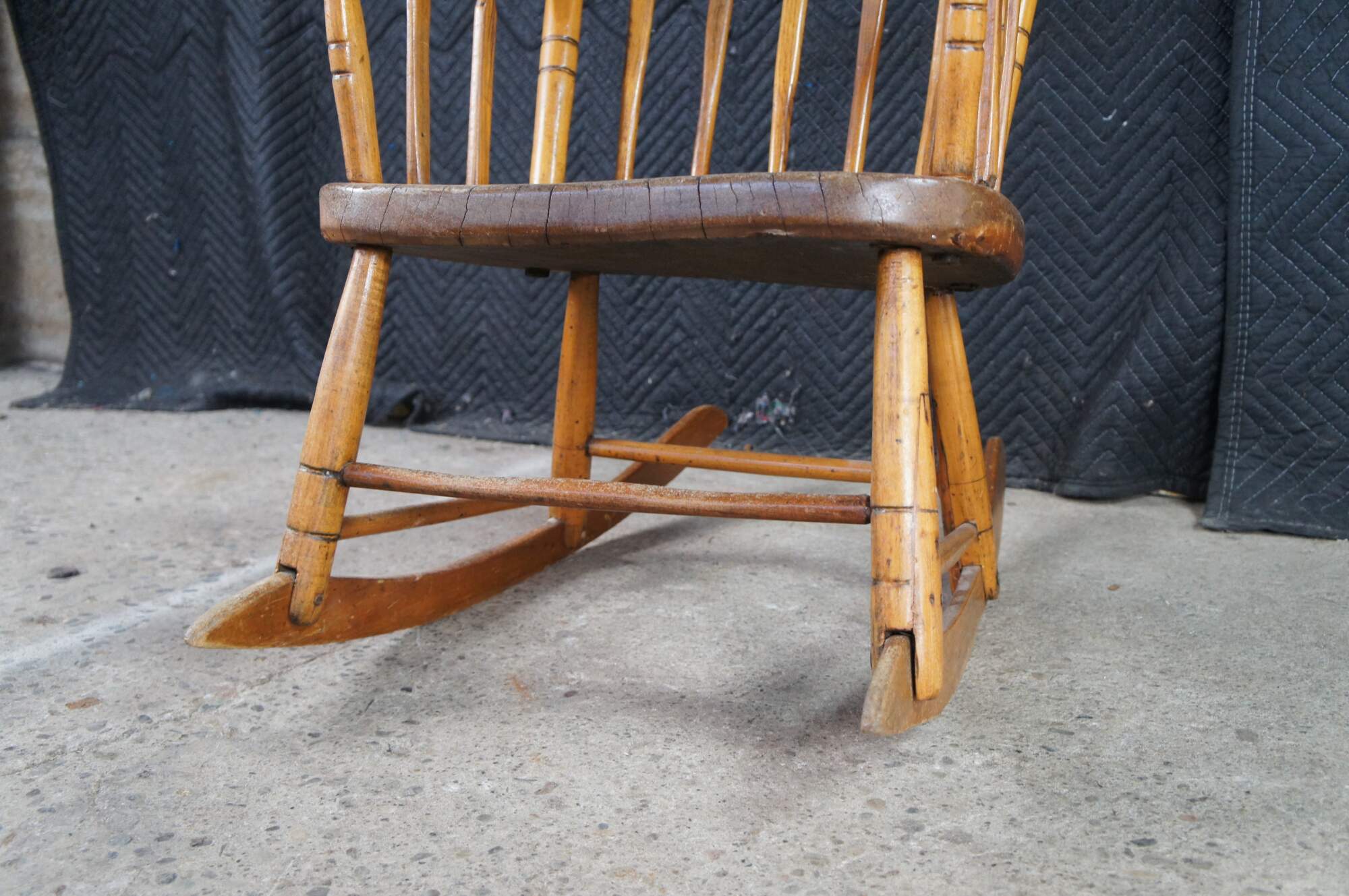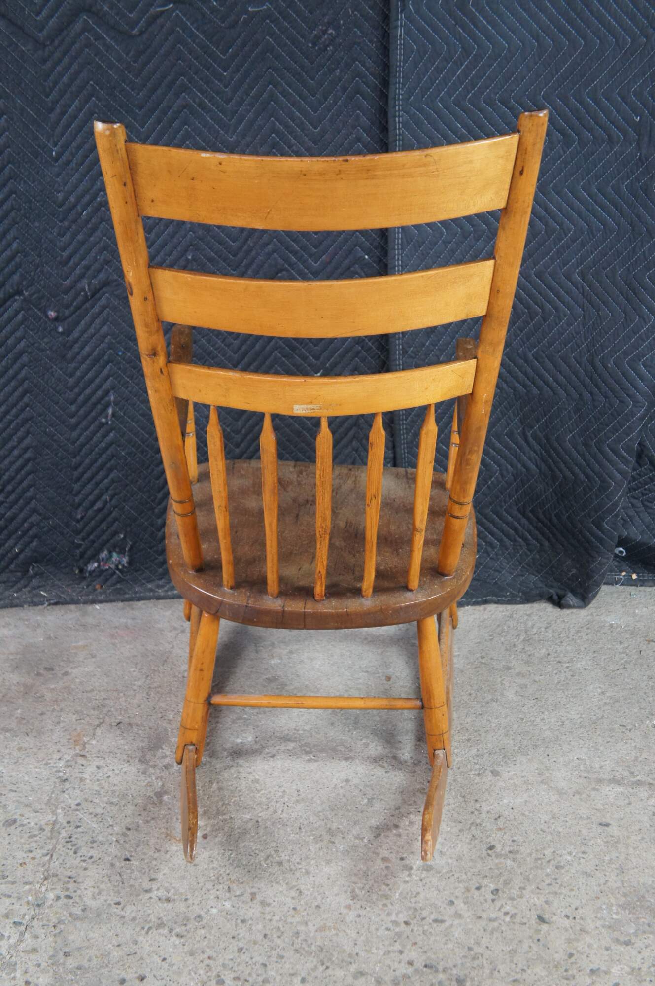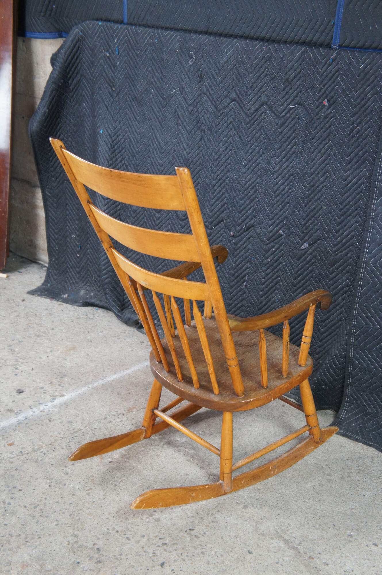Antique Early American Country Farmhouse Windsor arm chair rocker. Made of maple featuring a primitive slatted ladderback design.