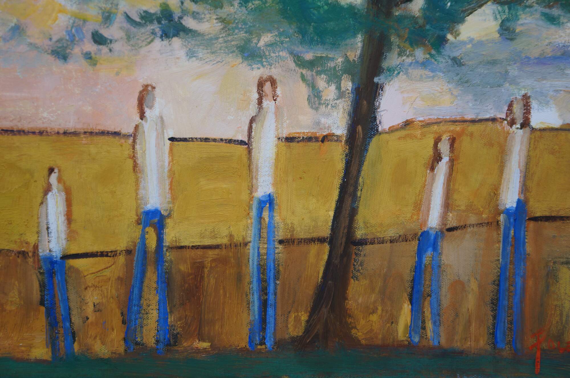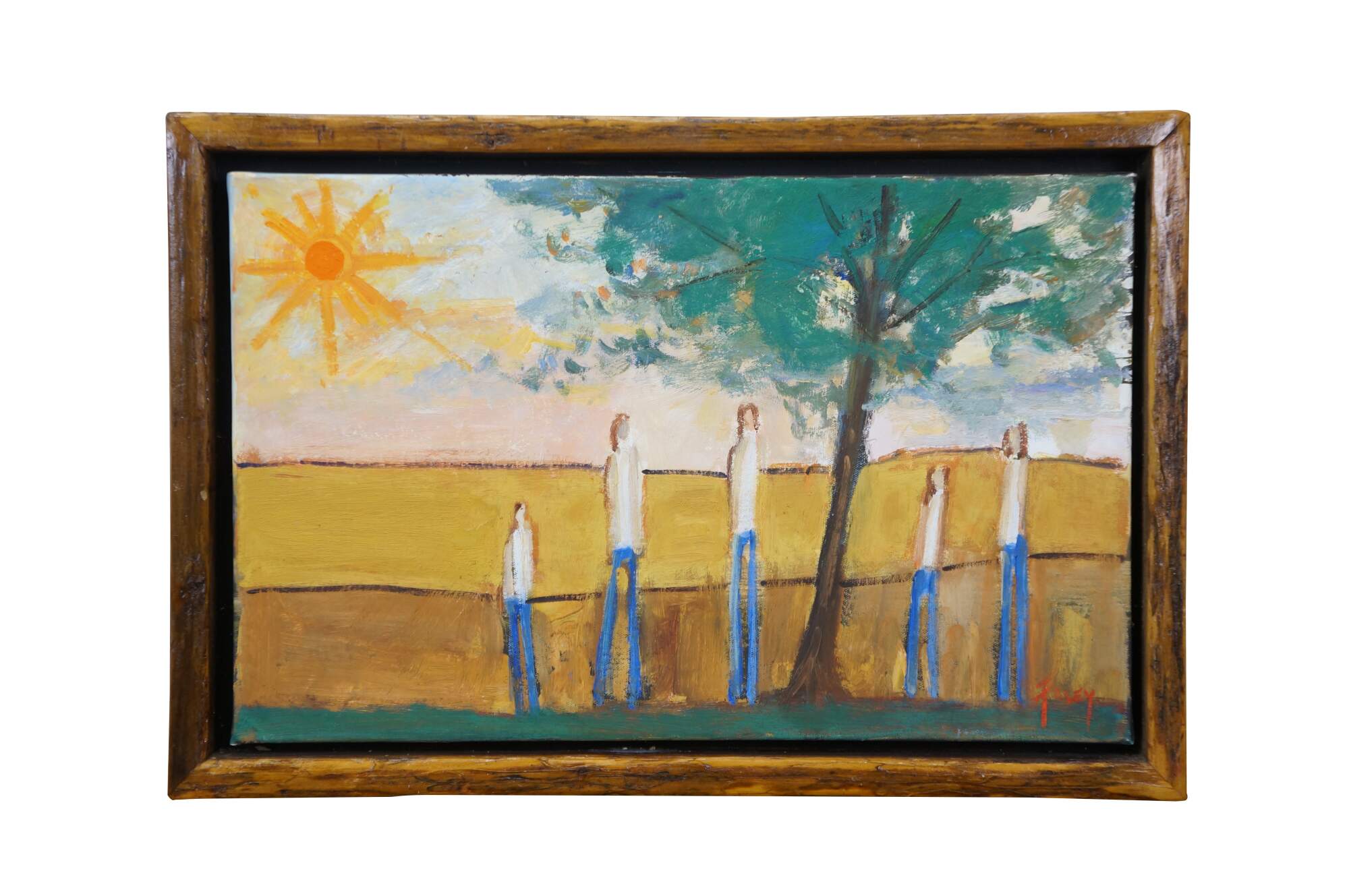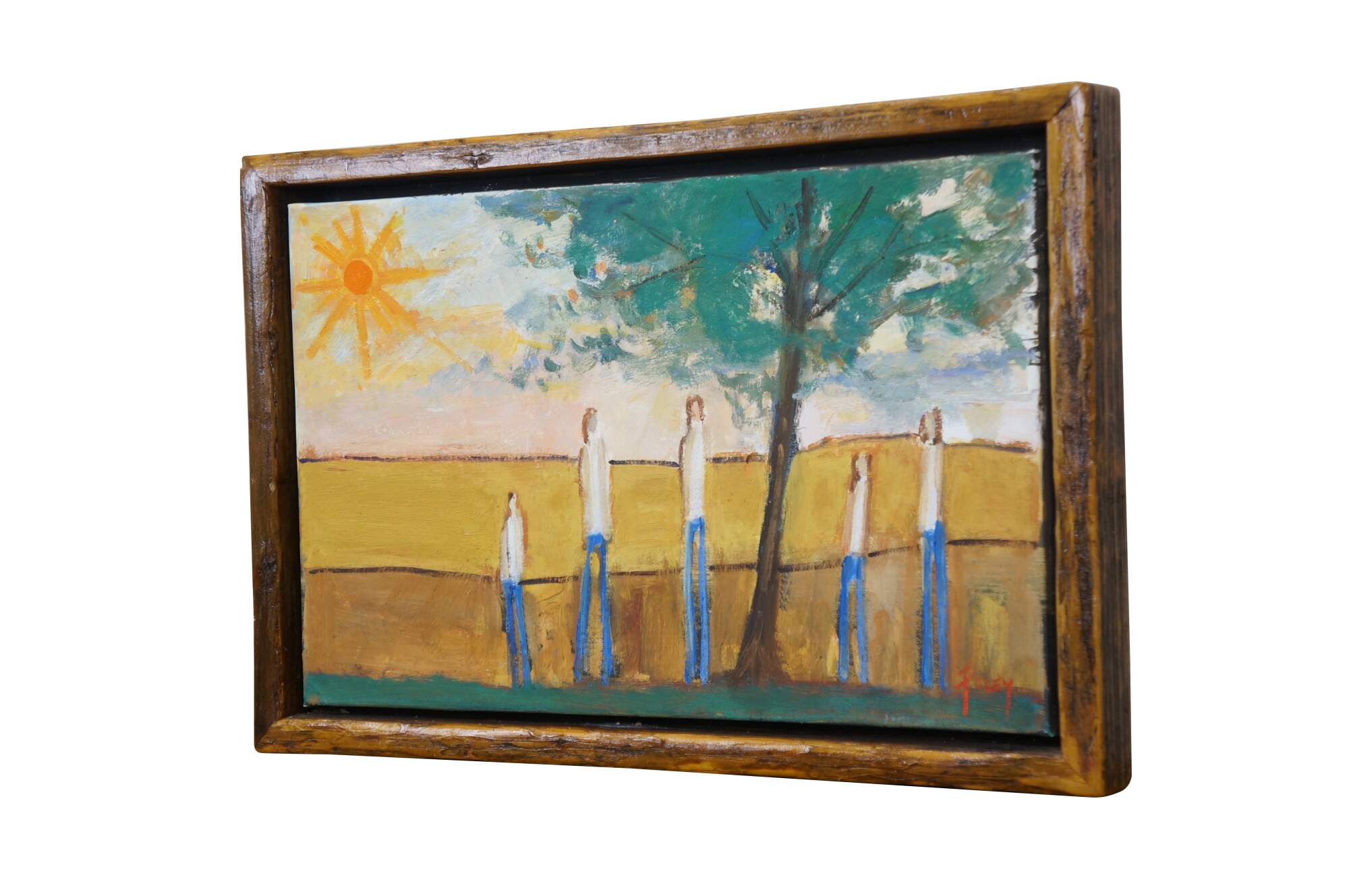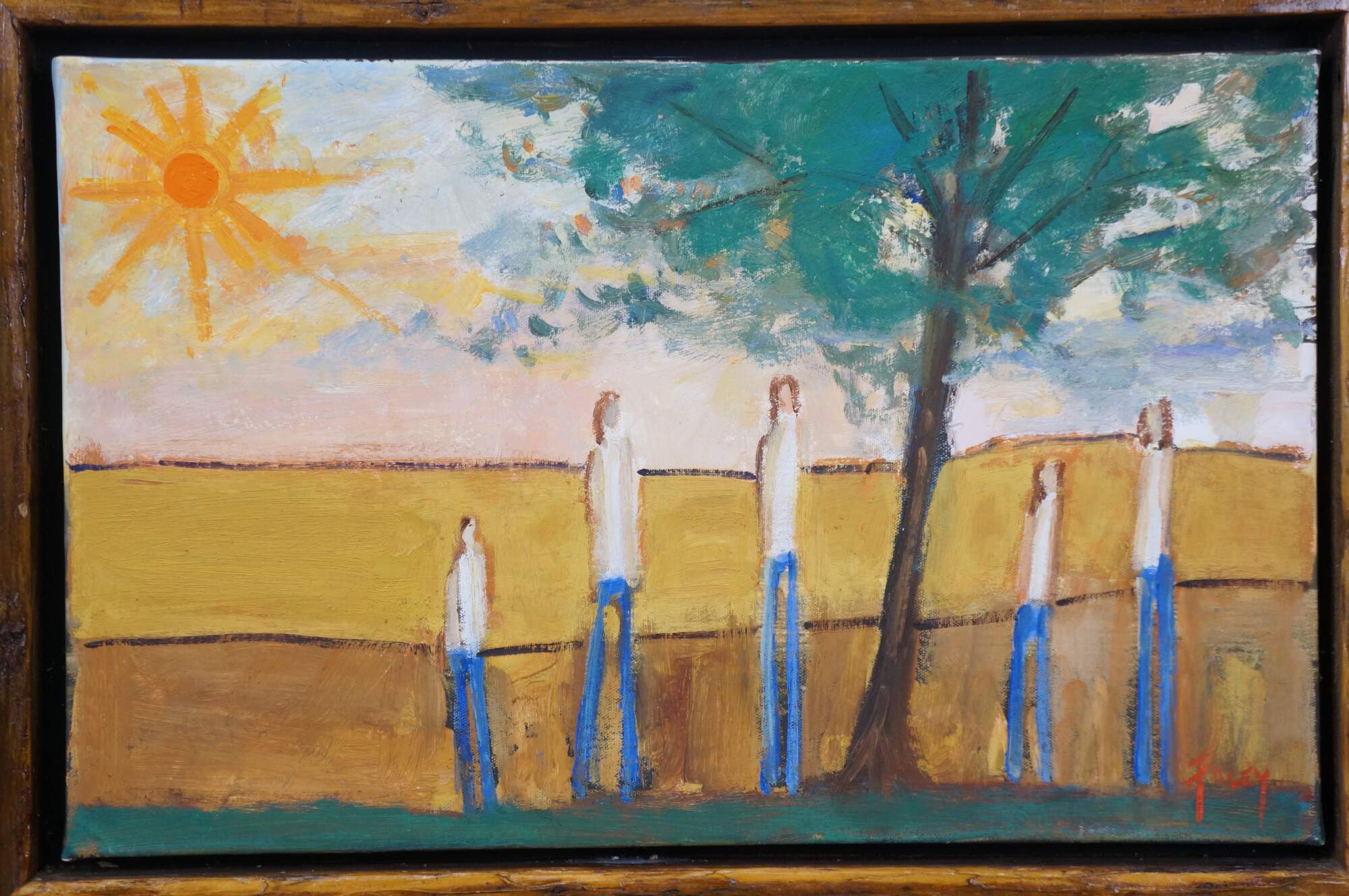 Late 20th century expressionist figural landscape oil painting on canvas by artist Foley. Shows a sunlit golden field with a group of five figures standing under a tree. Signed Foley, lower right. Wood floating frame. In the style of William DeBilzan.