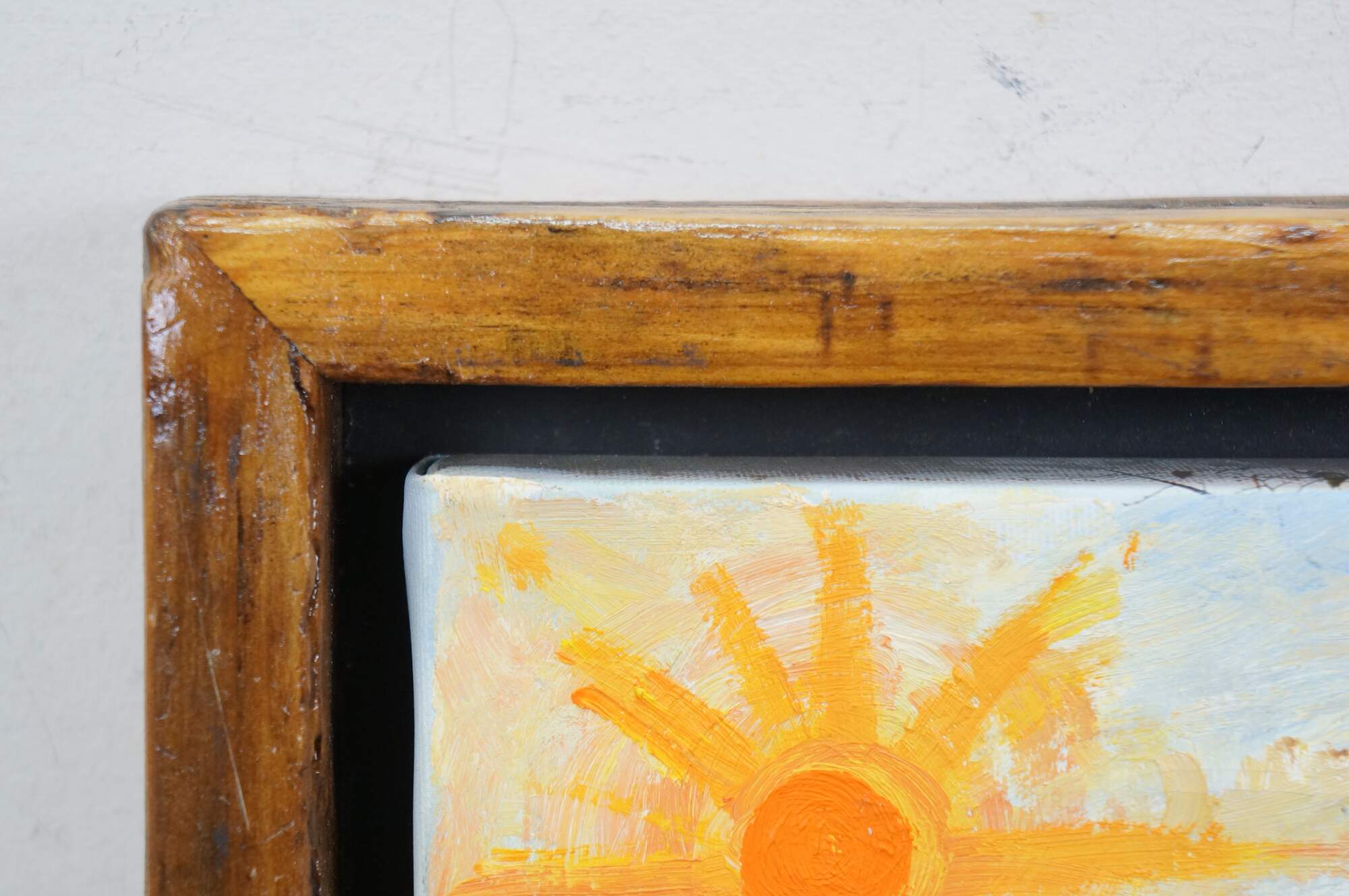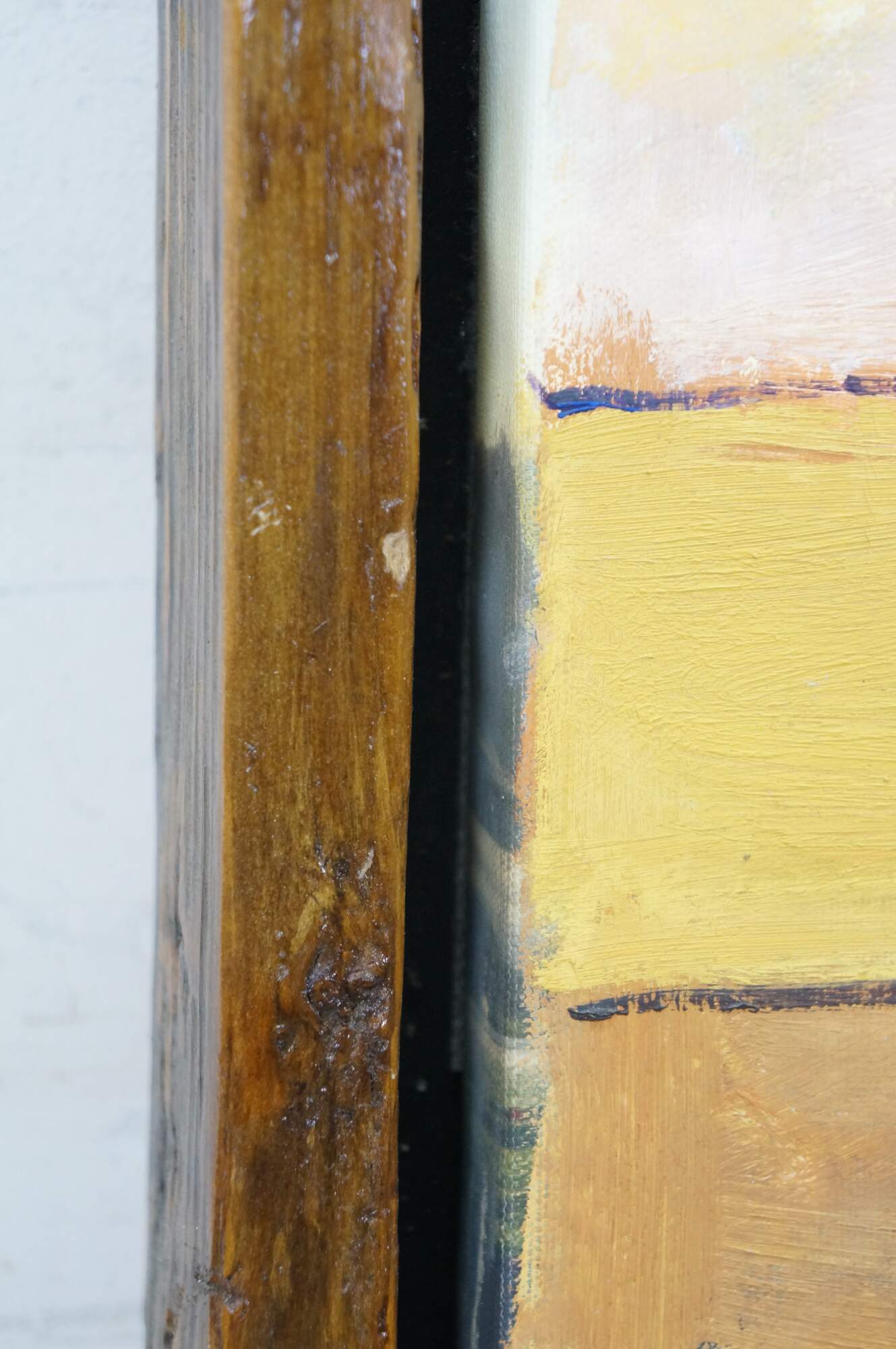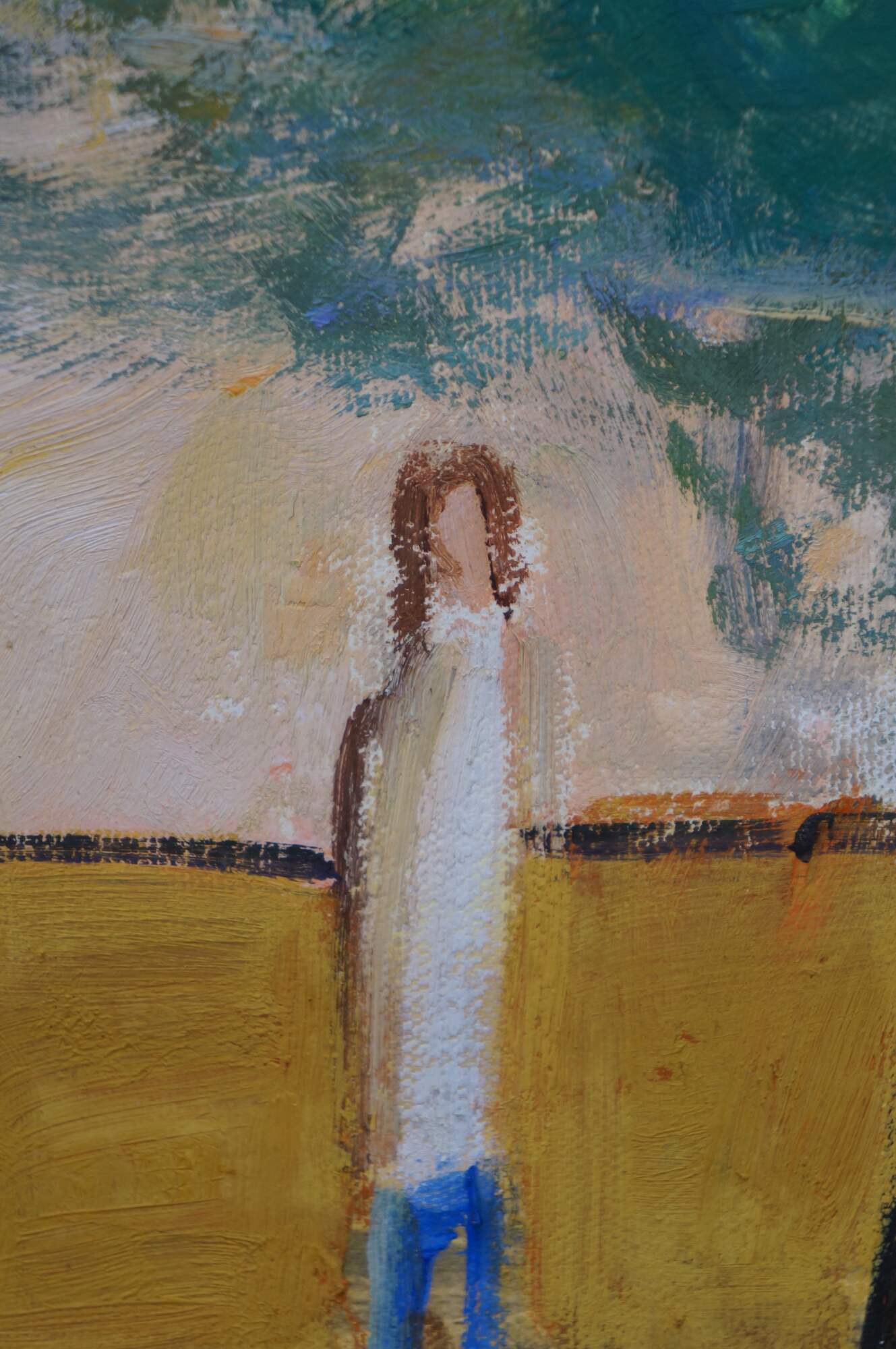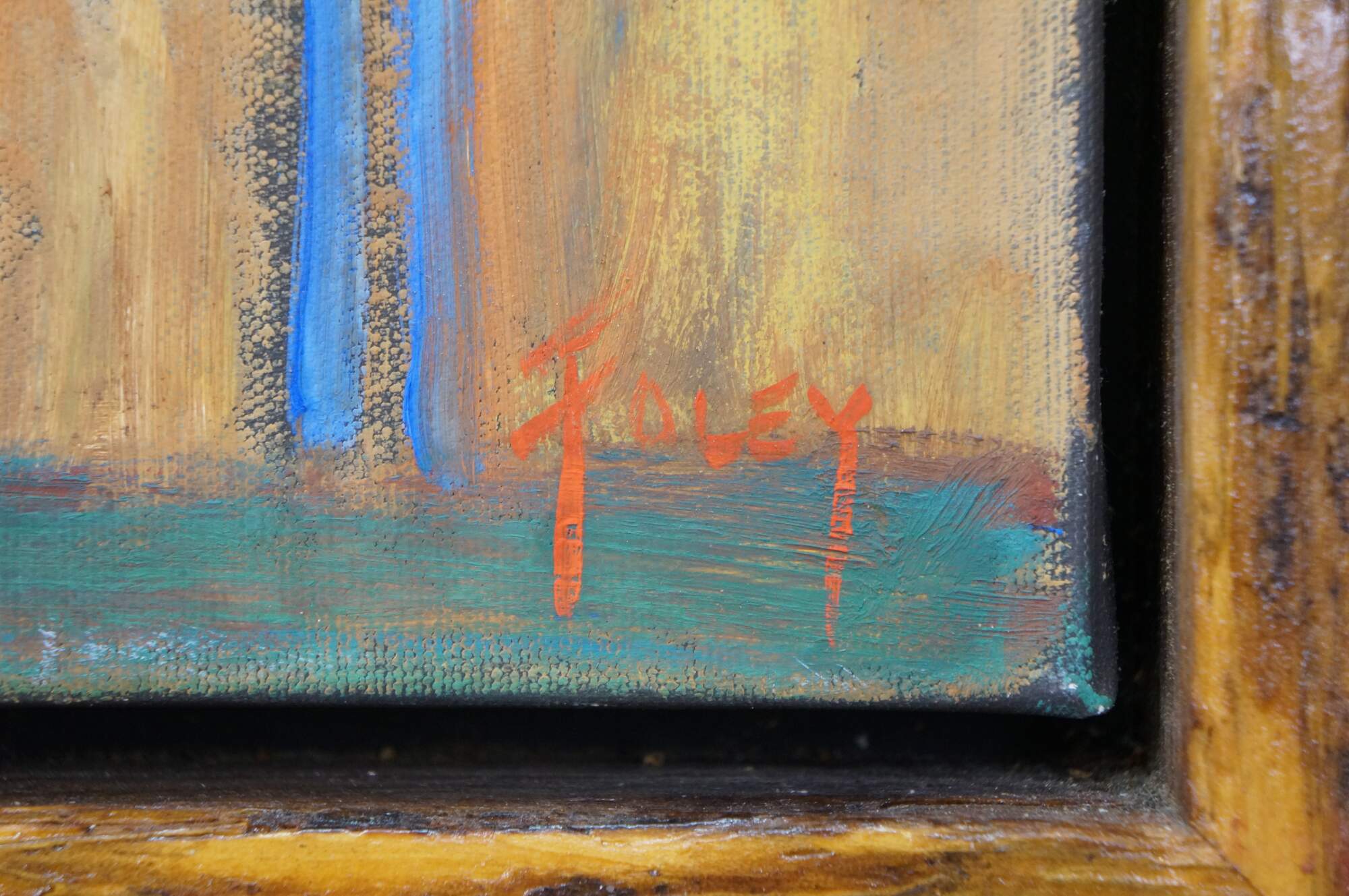Late 20th century expressionist figural landscape oil painting on canvas by artist Foley. Shows a sunlit golden field with a group of five figures standing under a tree. Signed Foley, lower right. Wood floating frame. In the style of William DeBilzan.