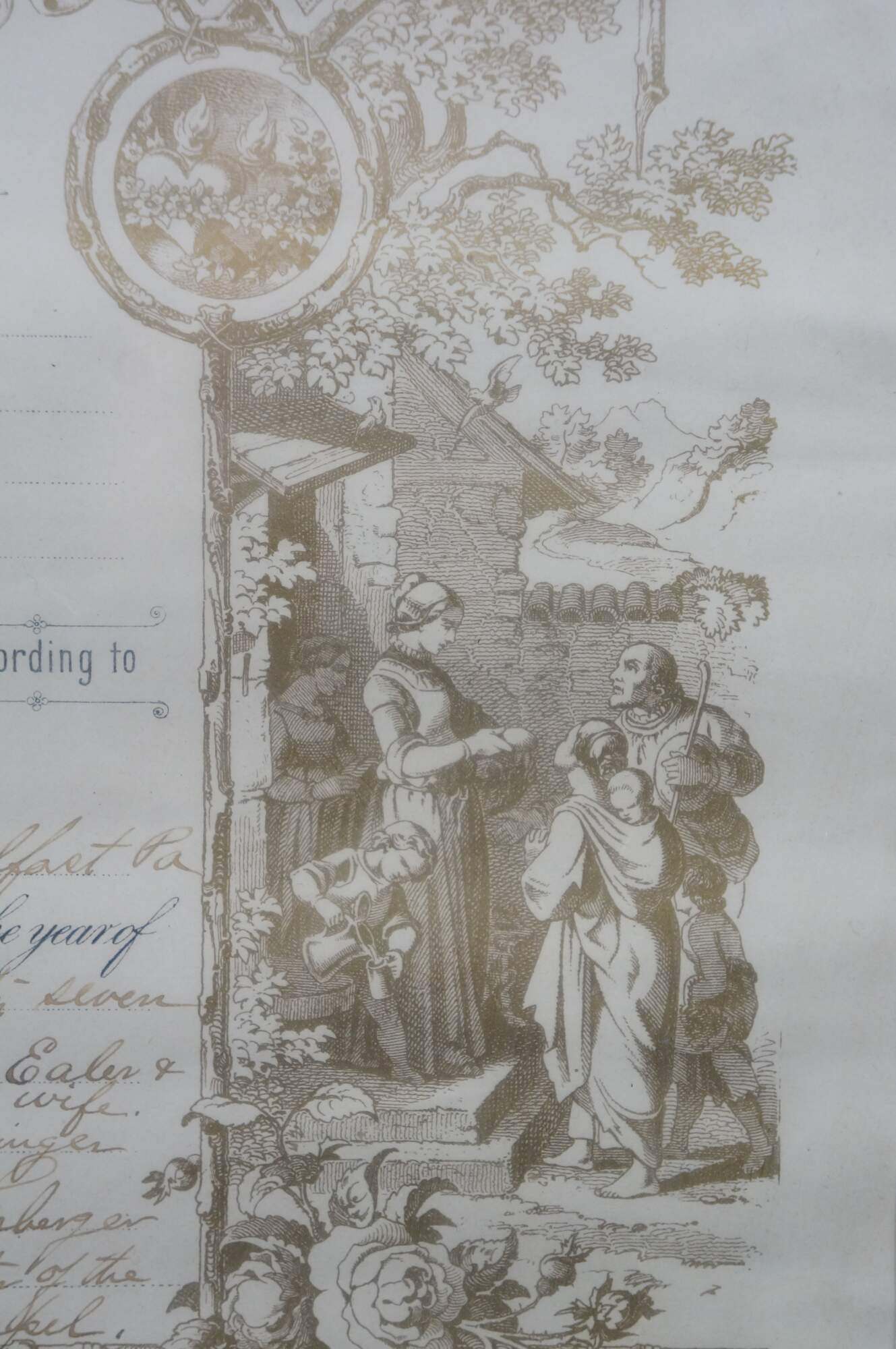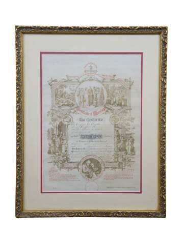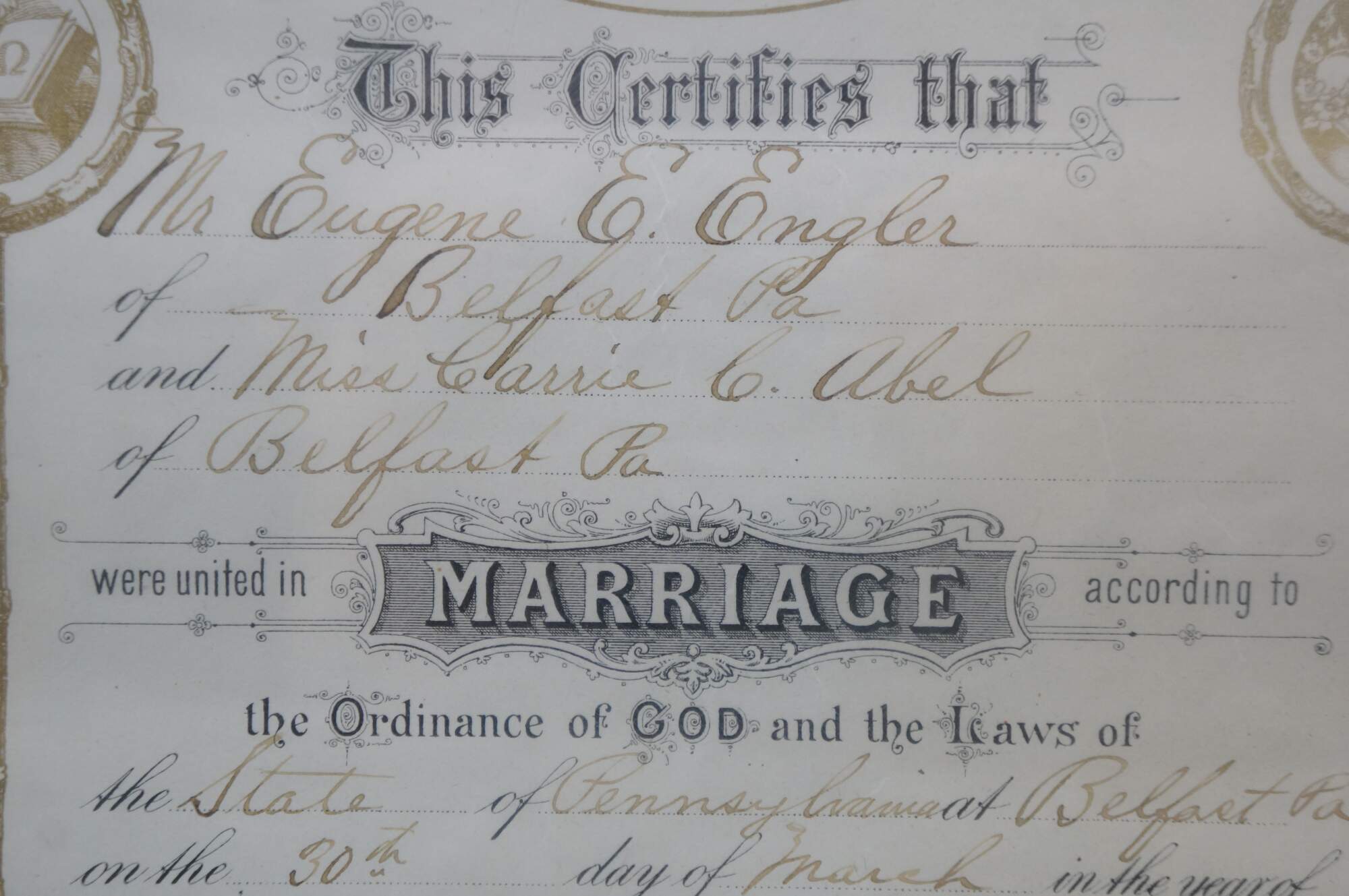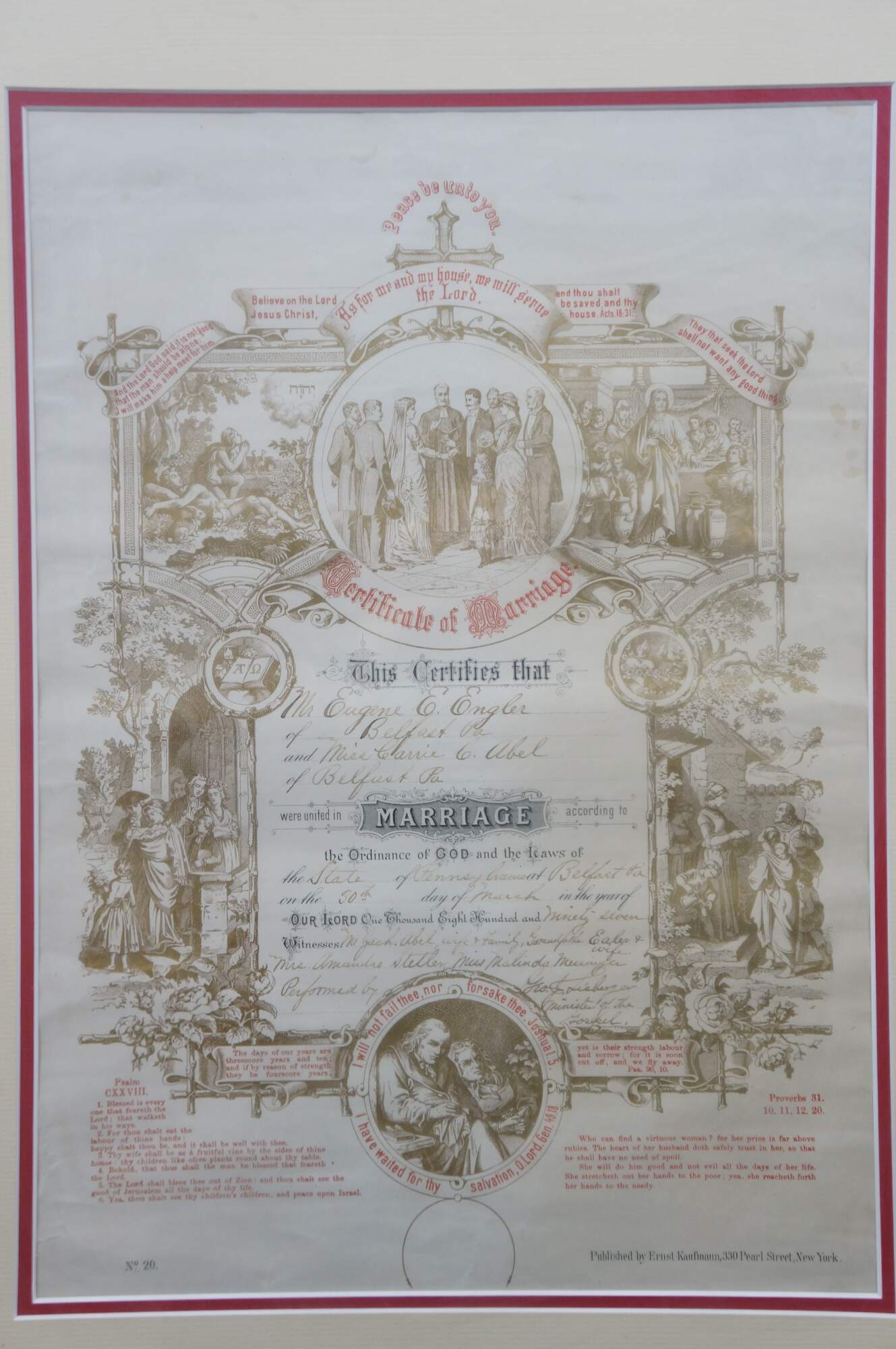 Late 19th century German fraktur style Certificate of Marriage for Mr Eugene E. Engler and Miss Carrie C. Abel of Belfast, PA. Form No. 20 - Published by Ernst Kaufmann, New York. Gilt wood & composite foliate frame; white and red layered mat.