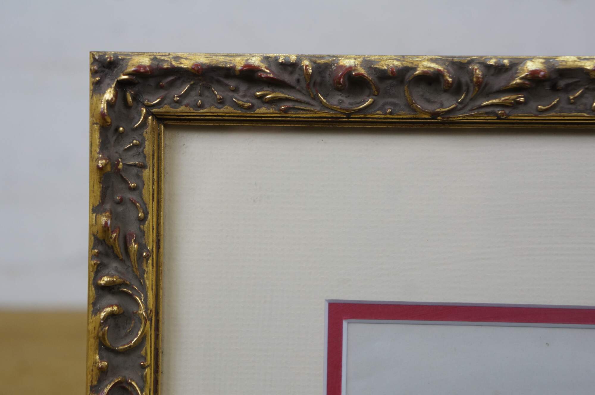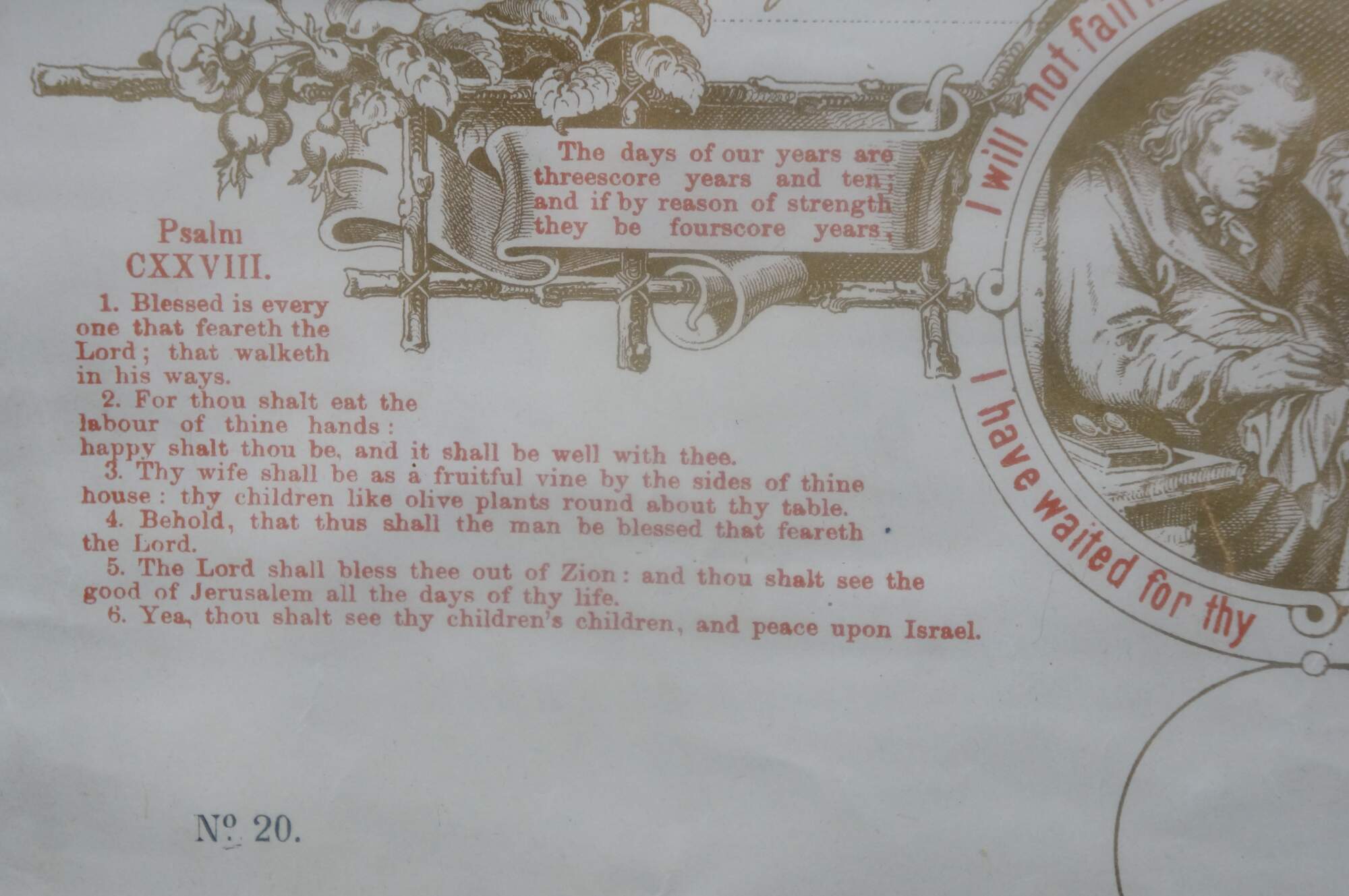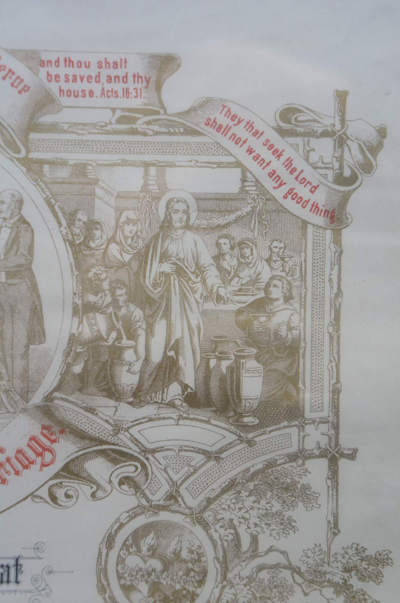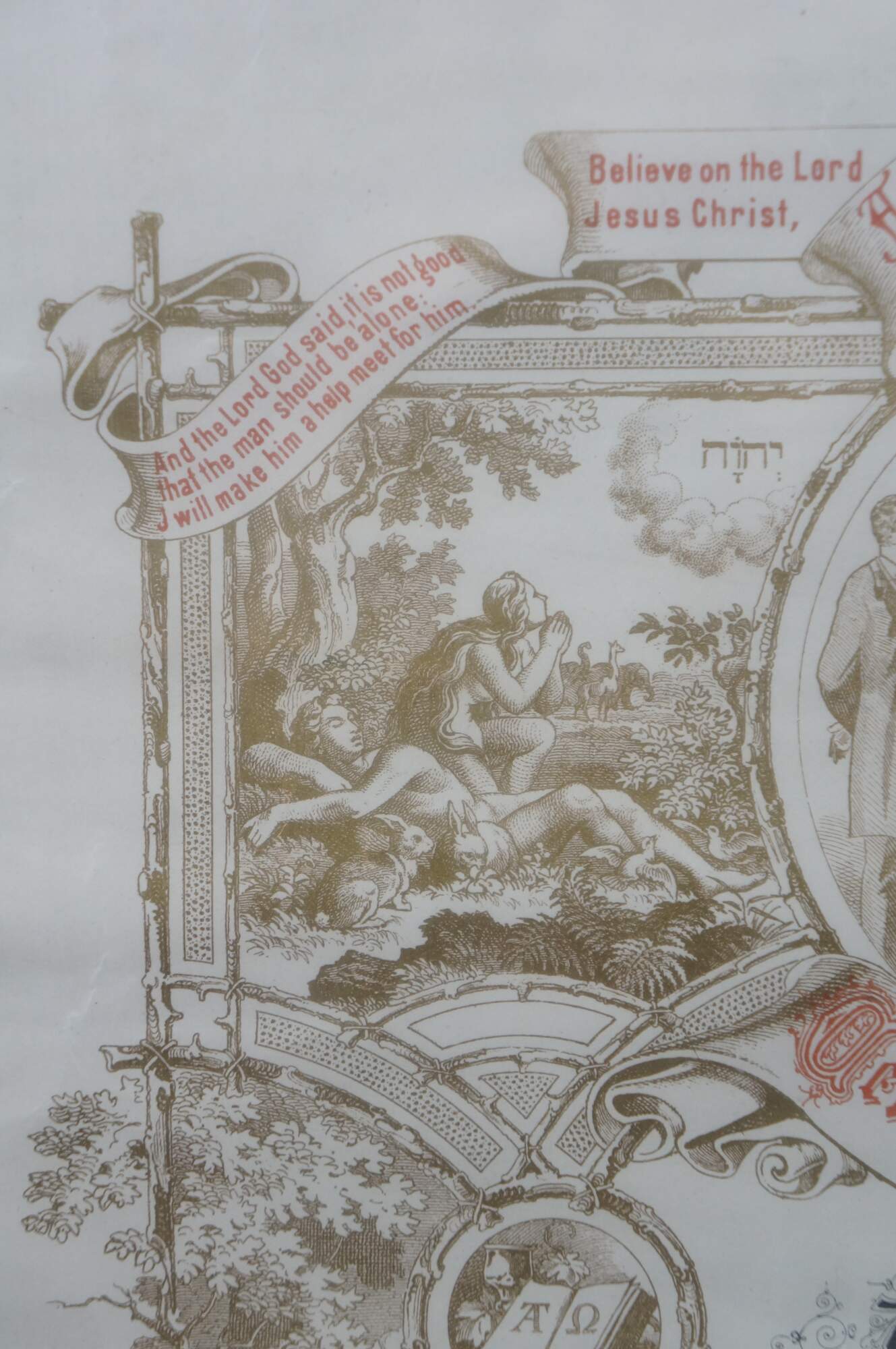 Late 19th century German fraktur style Certificate of Marriage for Mr Eugene E. Engler and Miss Carrie C. Abel of Belfast, PA. Form No. 20 - Published by Ernst Kaufmann, New York. Gilt wood & composite foliate frame; white and red layered mat.