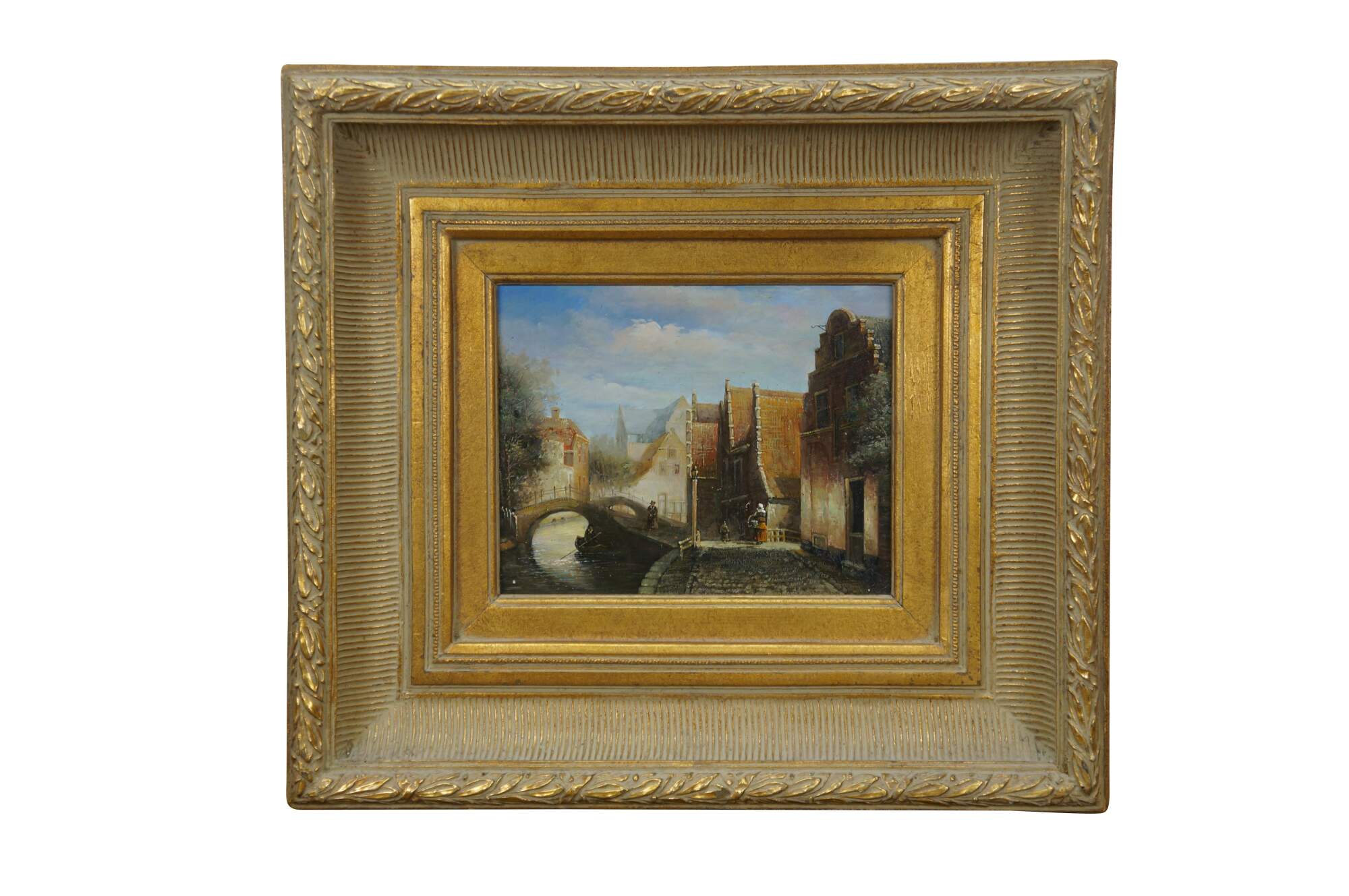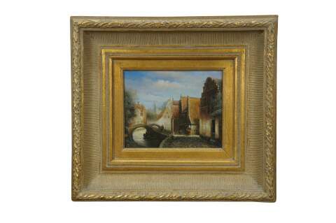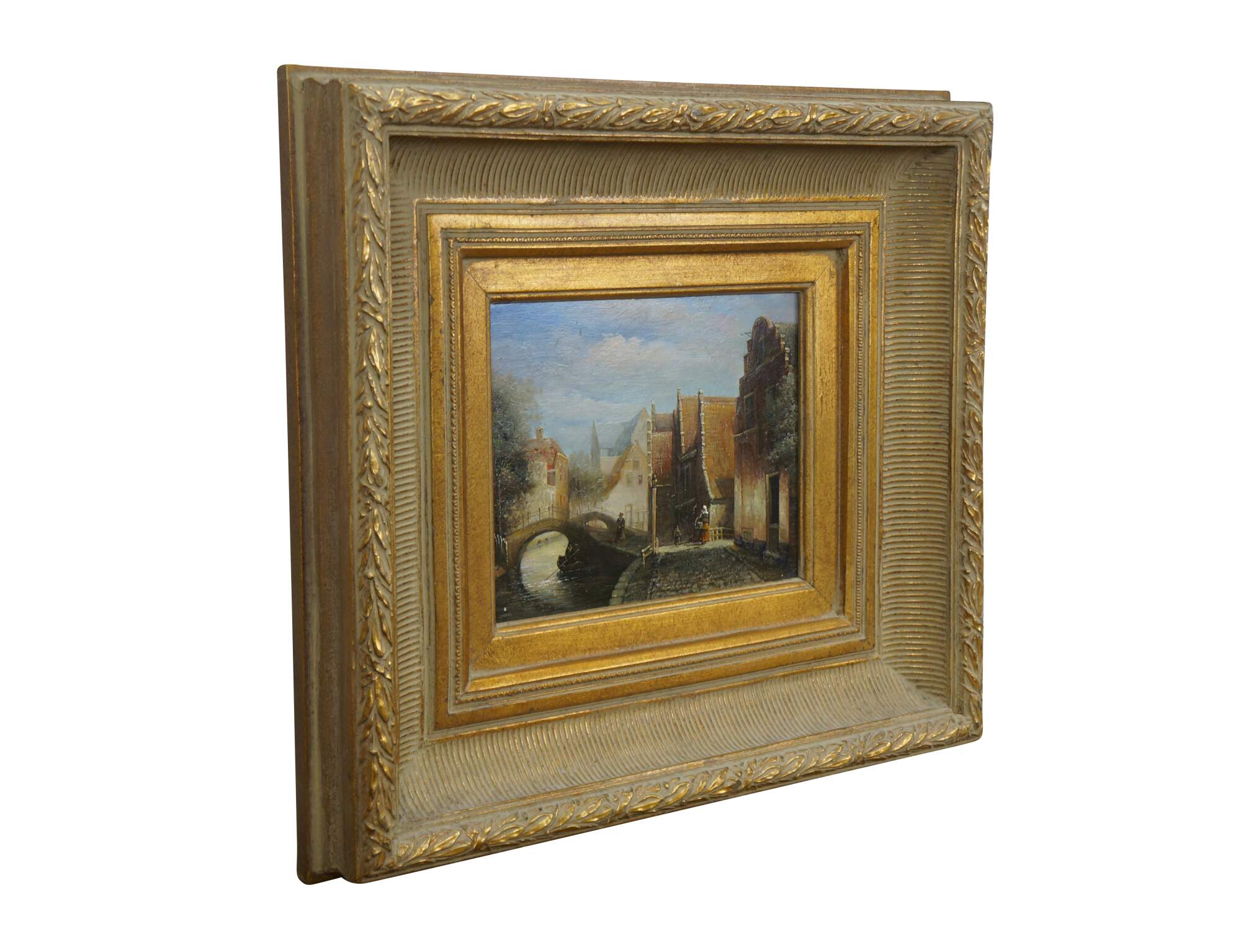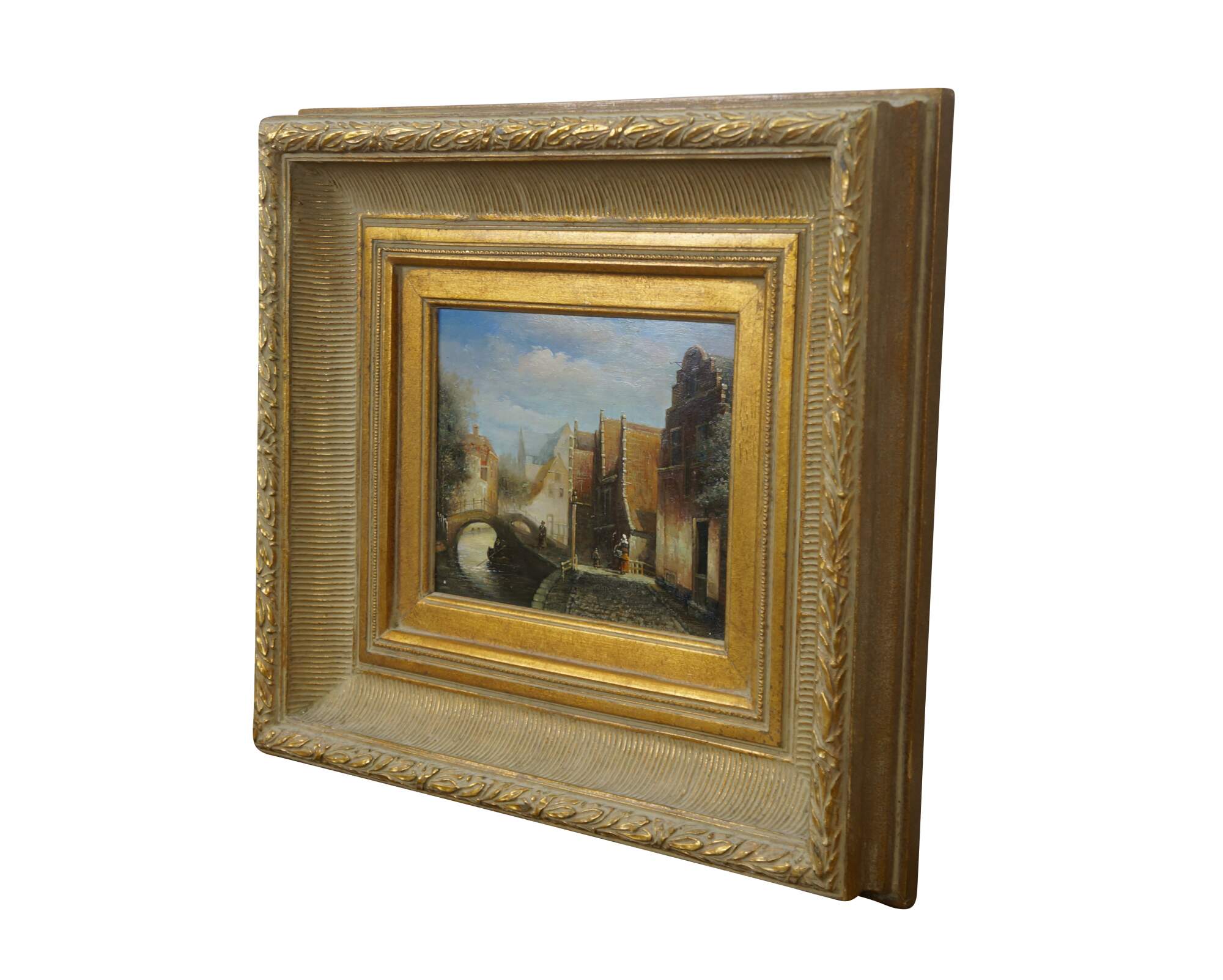 Late 20th century oil painting on panel showing a European / Dutch cityscape canal scene with figures in 19th century clothing. After Johannes Franciscus Spohler who was known for paintings of Rotterdam / Amsterdam in the Netherlands. Gilt composite on wood frame with laurel leaf border and grooved bevel.