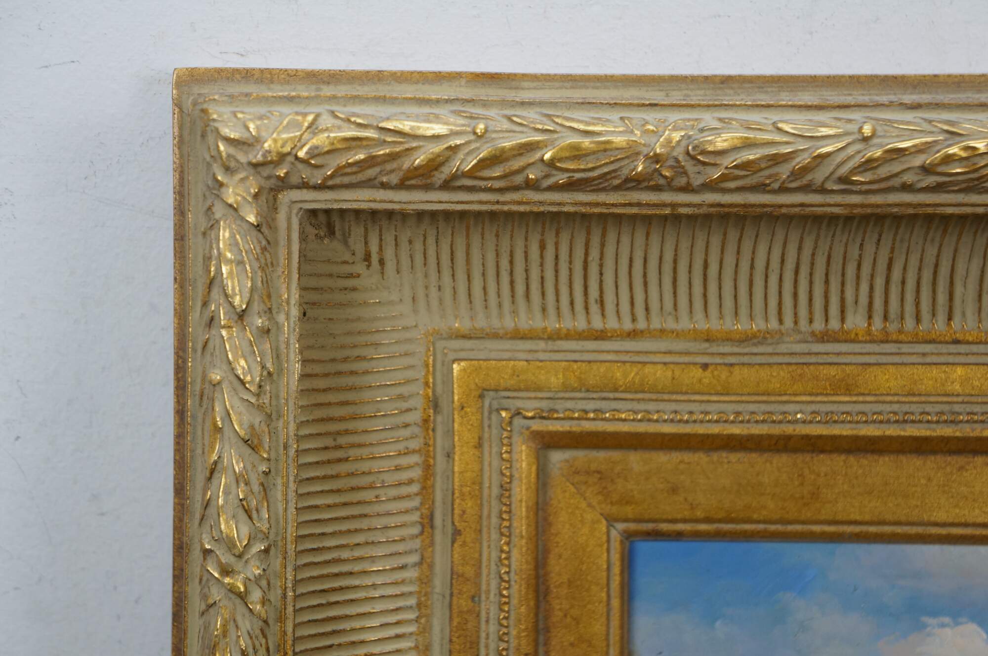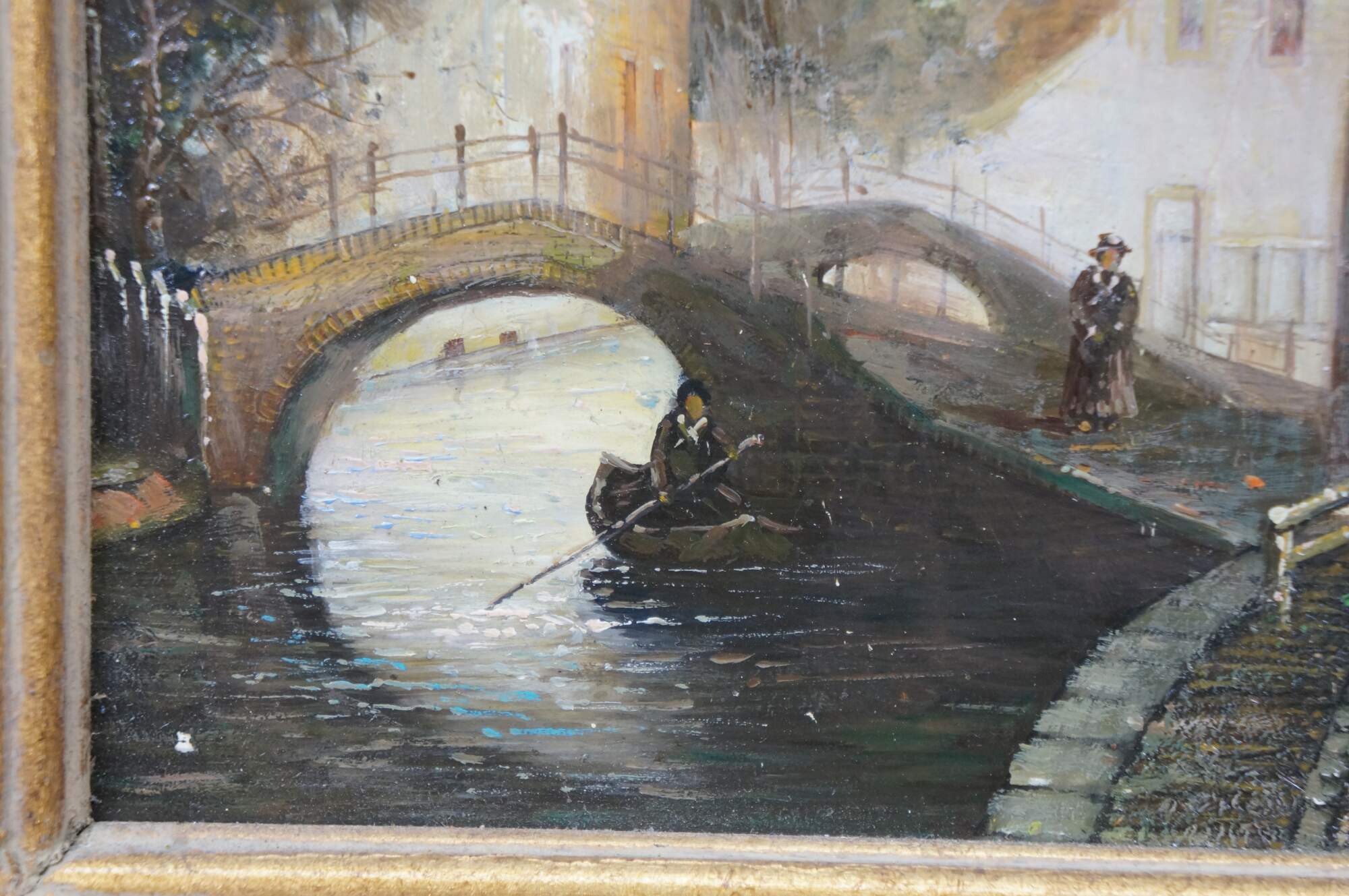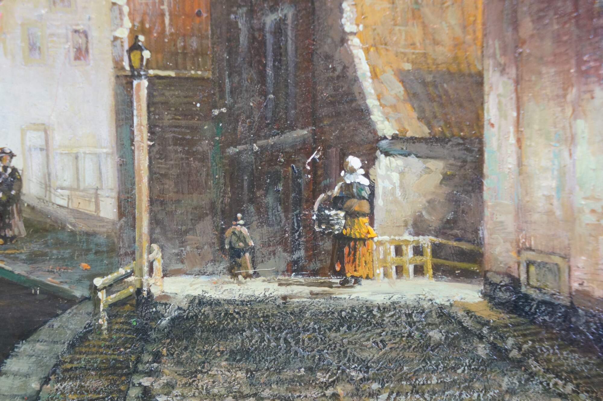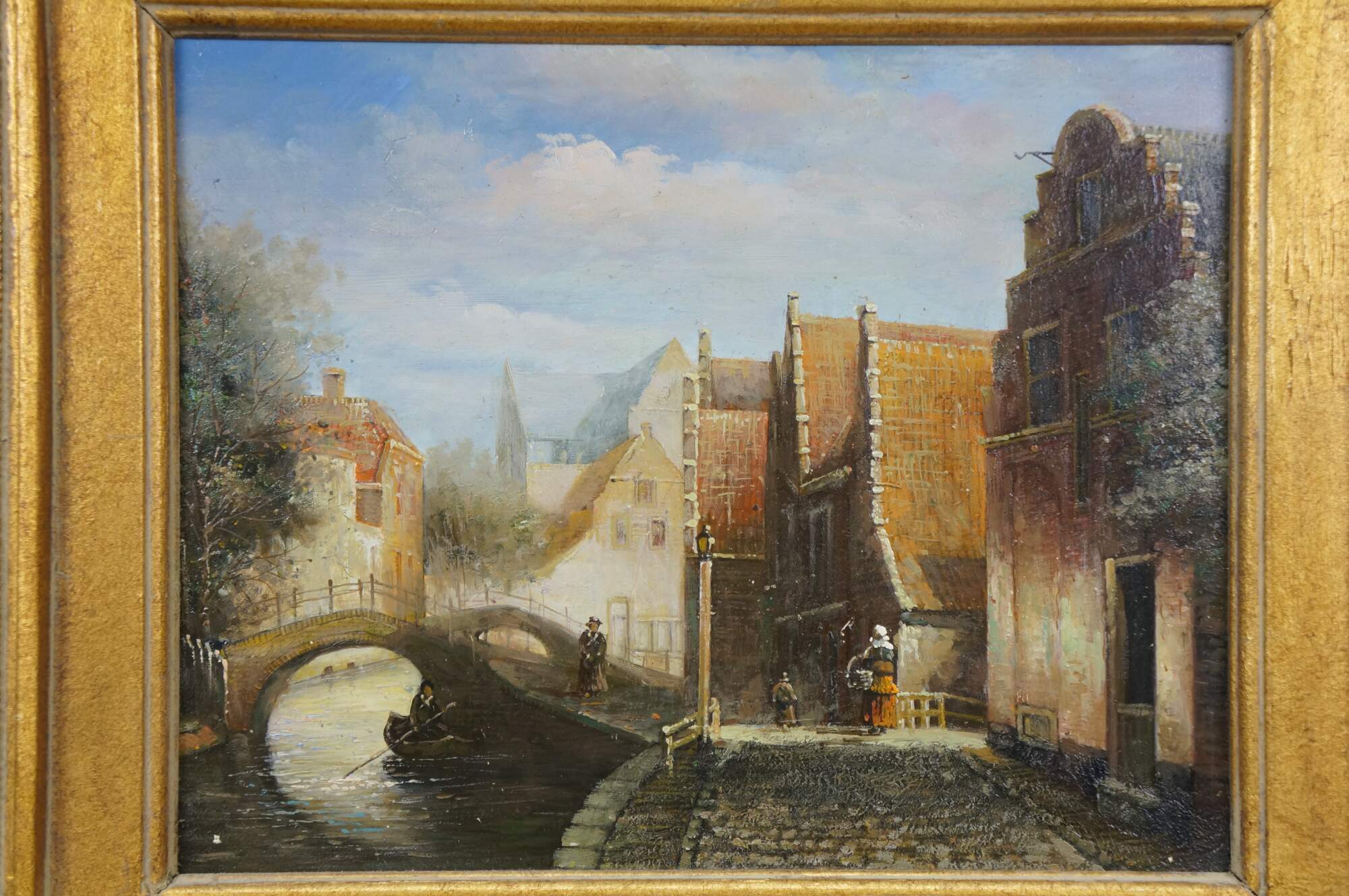 Late 20th century oil painting on panel showing a European / Dutch cityscape canal scene with figures in 19th century clothing. After Johannes Franciscus Spohler who was known for paintings of Rotterdam / Amsterdam in the Netherlands. Gilt composite on wood frame with laurel leaf border and grooved bevel.