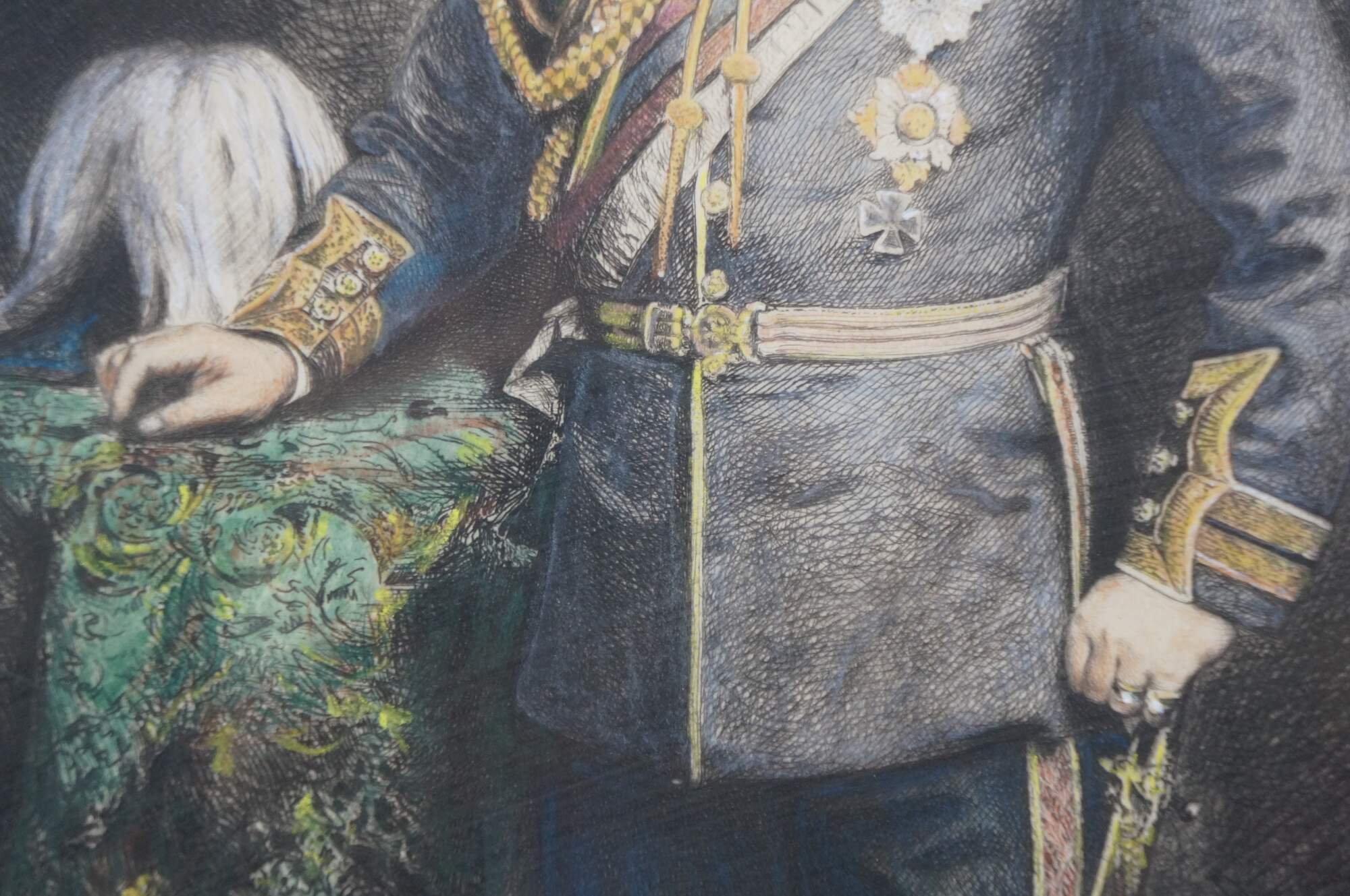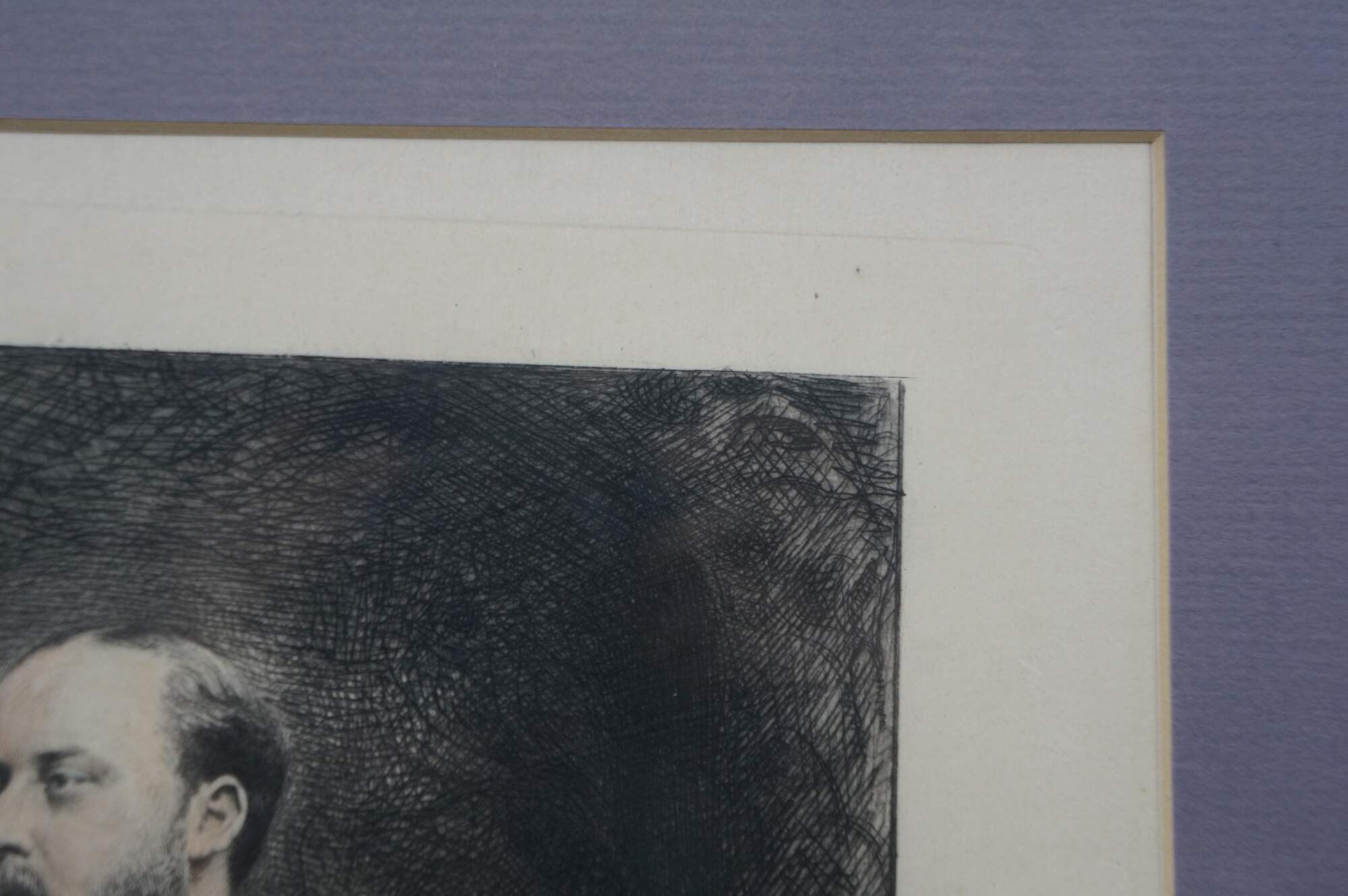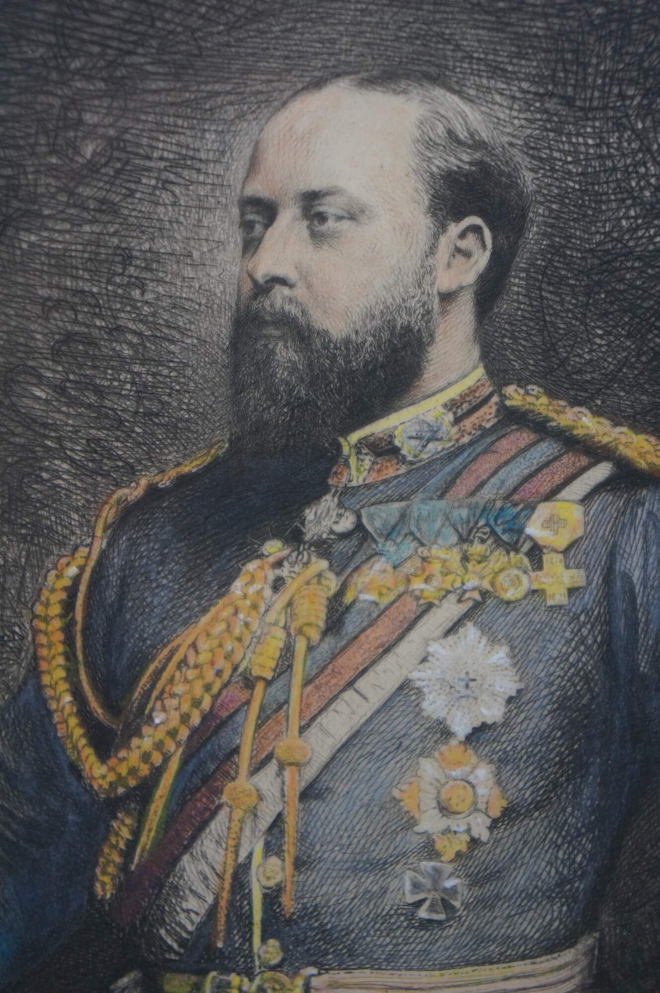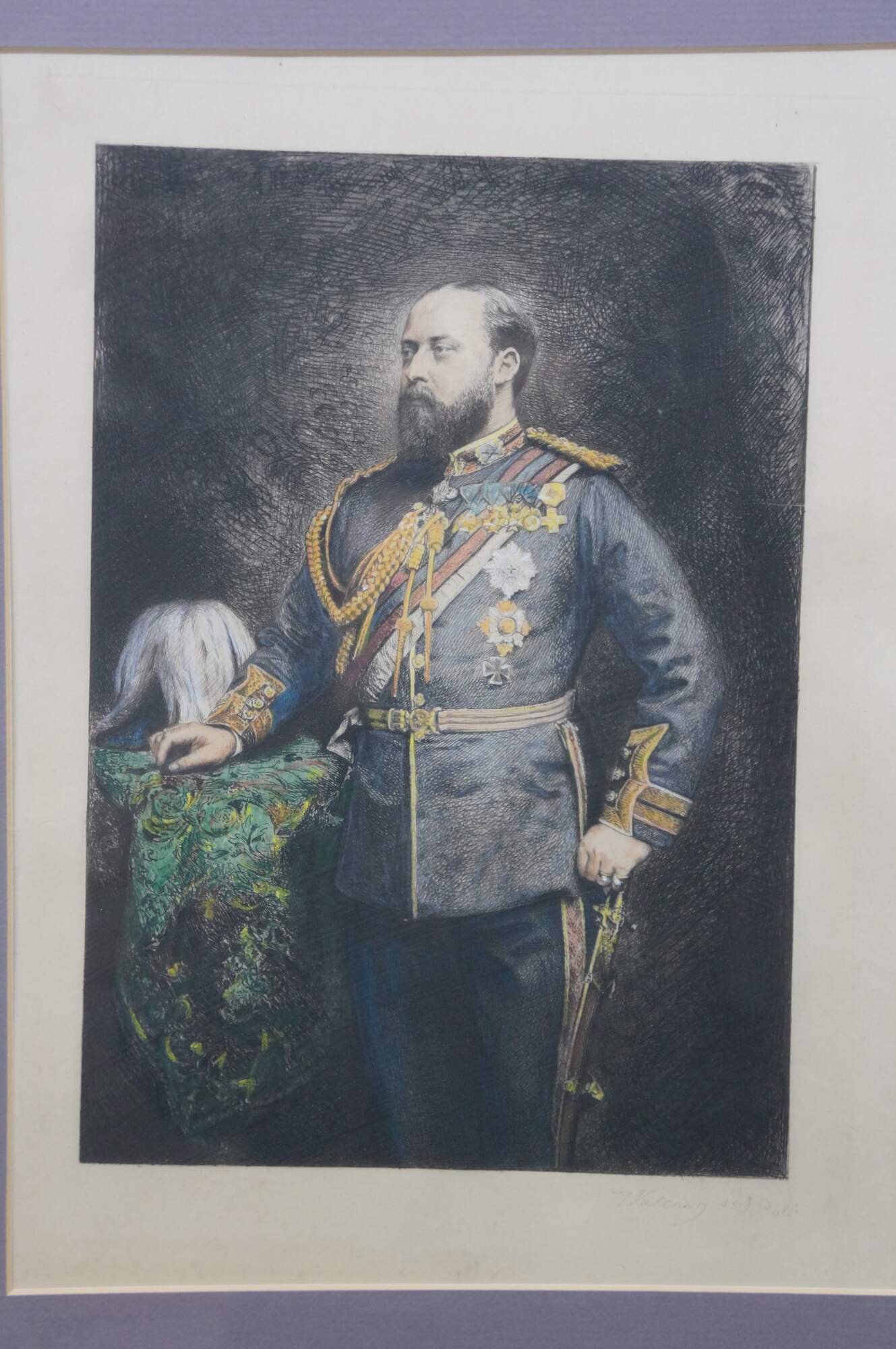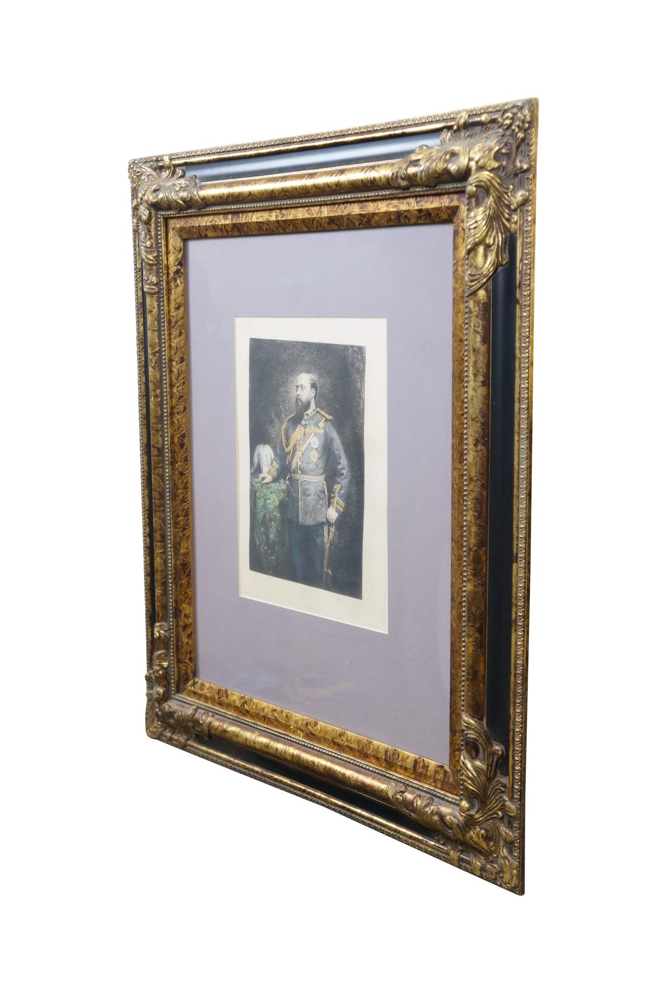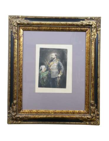 Late 19th century hand colored engraving depicting a portrait of King Edward VII by Charles Albert Waltner, circa late 1870s. Mottled gilt wood & composite frame with brown painted bevel and foliate corners.