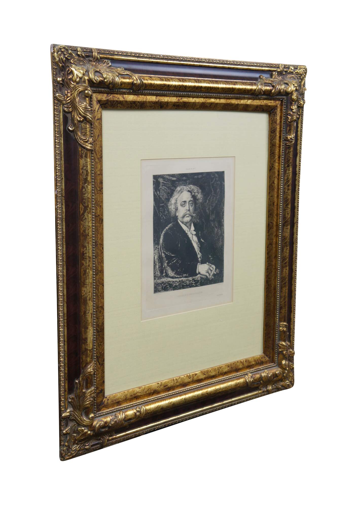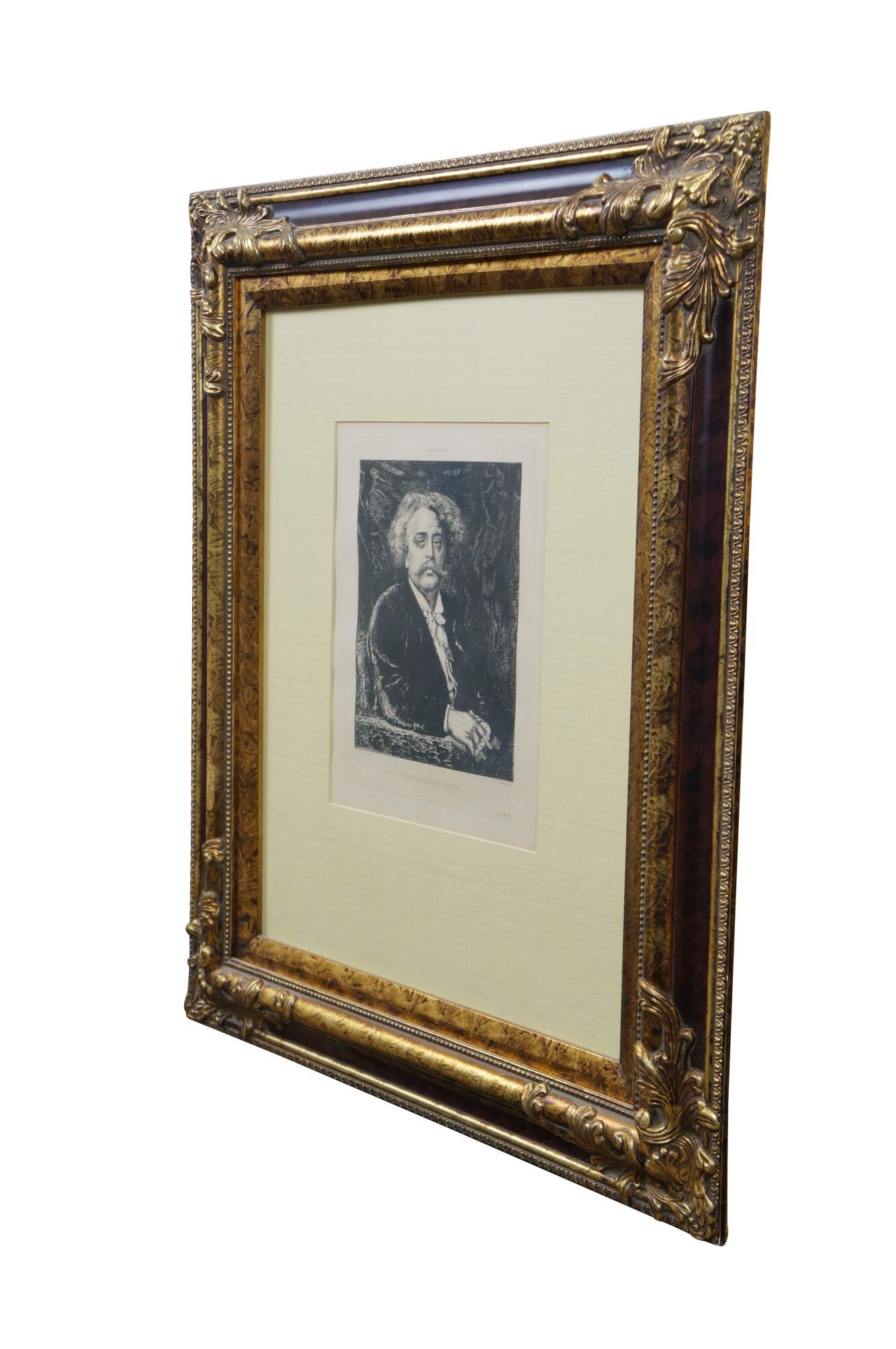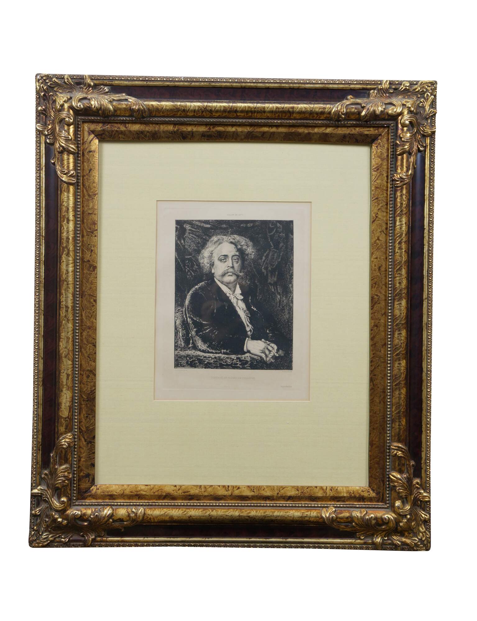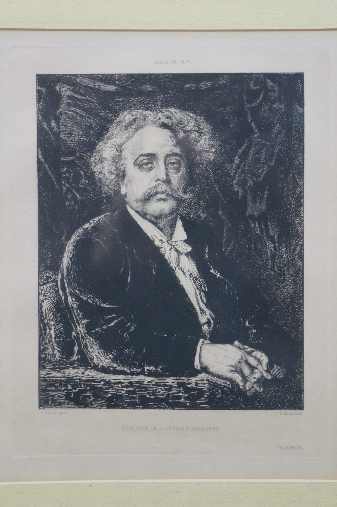 Late 19th century black and white etching titled "Salon de 1877 - Portrait de M. Carrier Belleuse" drawn by Fernand Cormon (24 December 1845 – 20 March 1924) and etched by Benjamin Louis Auguste Damman (1835 - 1921). Depicts a portrait of French painter Pierre-Gerard Carrier-Belleuse. Printed by A. Beillet. Mottled gilt wood & composite frame with brown painted bevel and foliate corners.