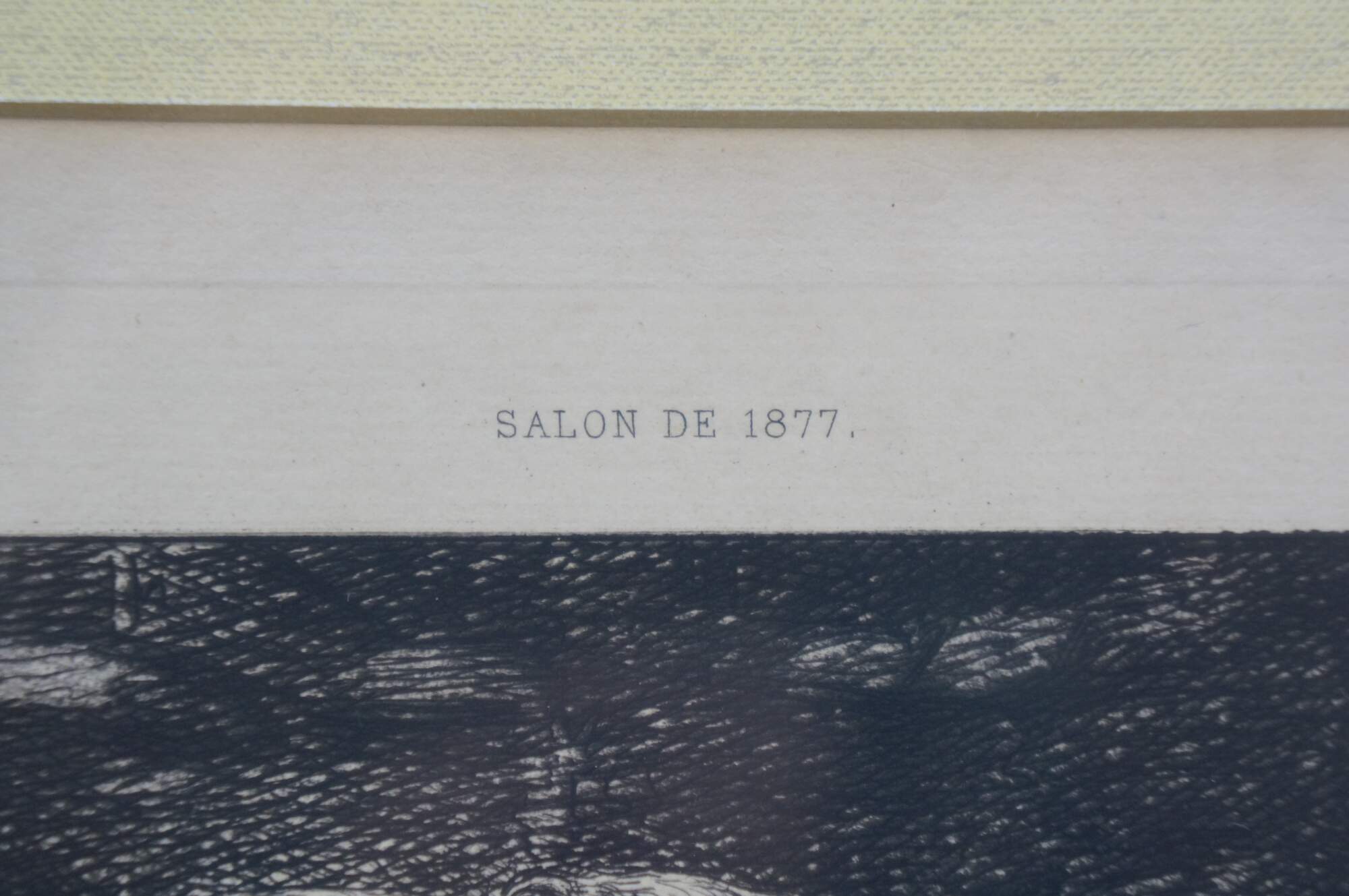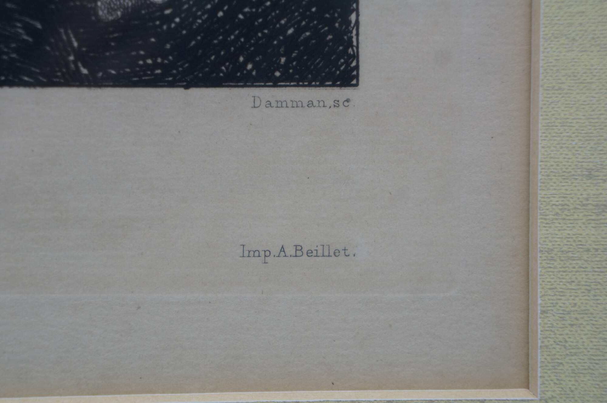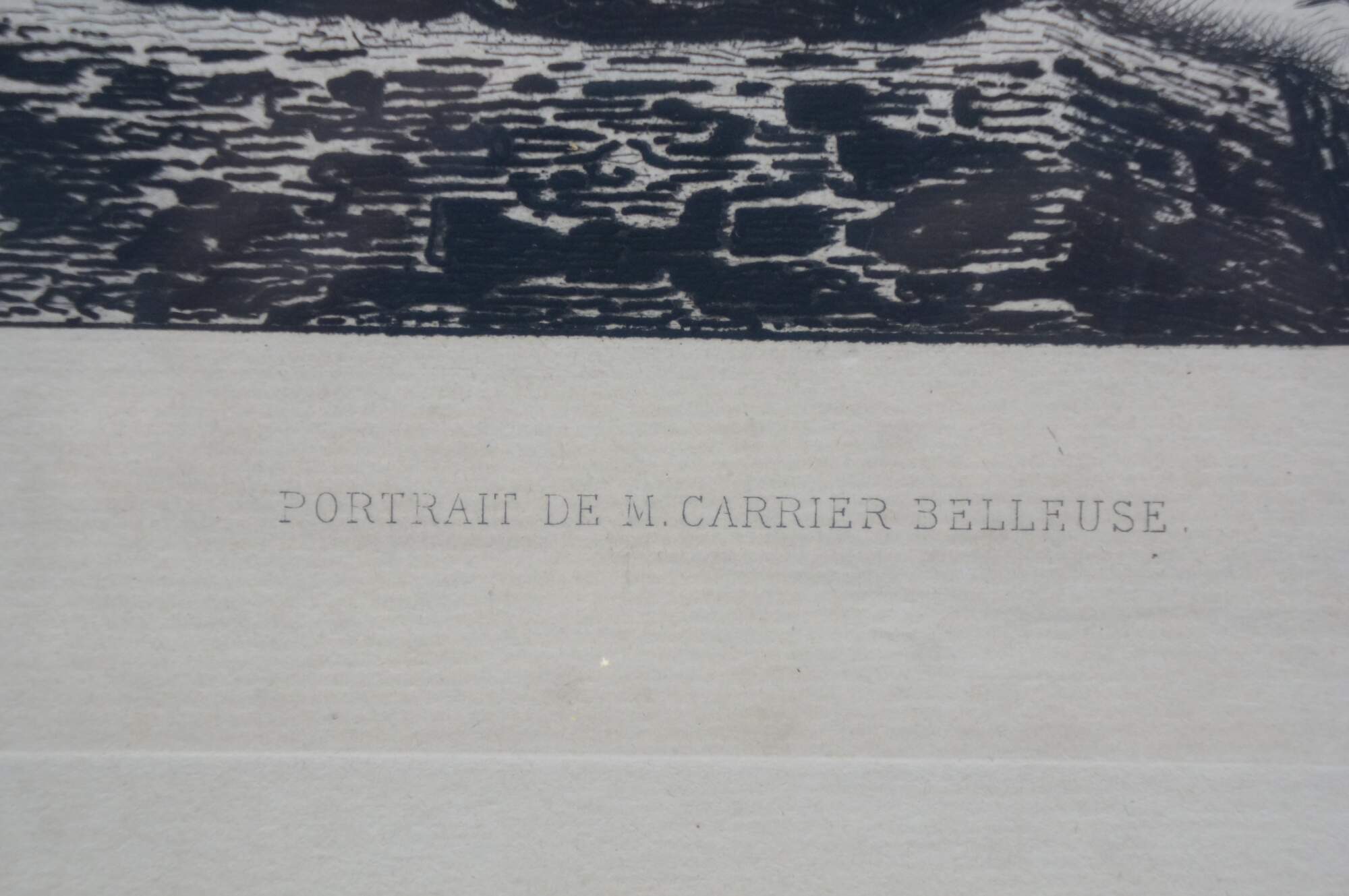 Late 19th century black and white etching titled "Salon de 1877 - Portrait de M. Carrier Belleuse" drawn by Fernand Cormon (24 December 1845 – 20 March 1924) and etched by Benjamin Louis Auguste Damman (1835 - 1921). Depicts a portrait of French painter Pierre-Gerard Carrier-Belleuse. Printed by A. Beillet. Mottled gilt wood & composite frame with brown painted bevel and foliate corners.