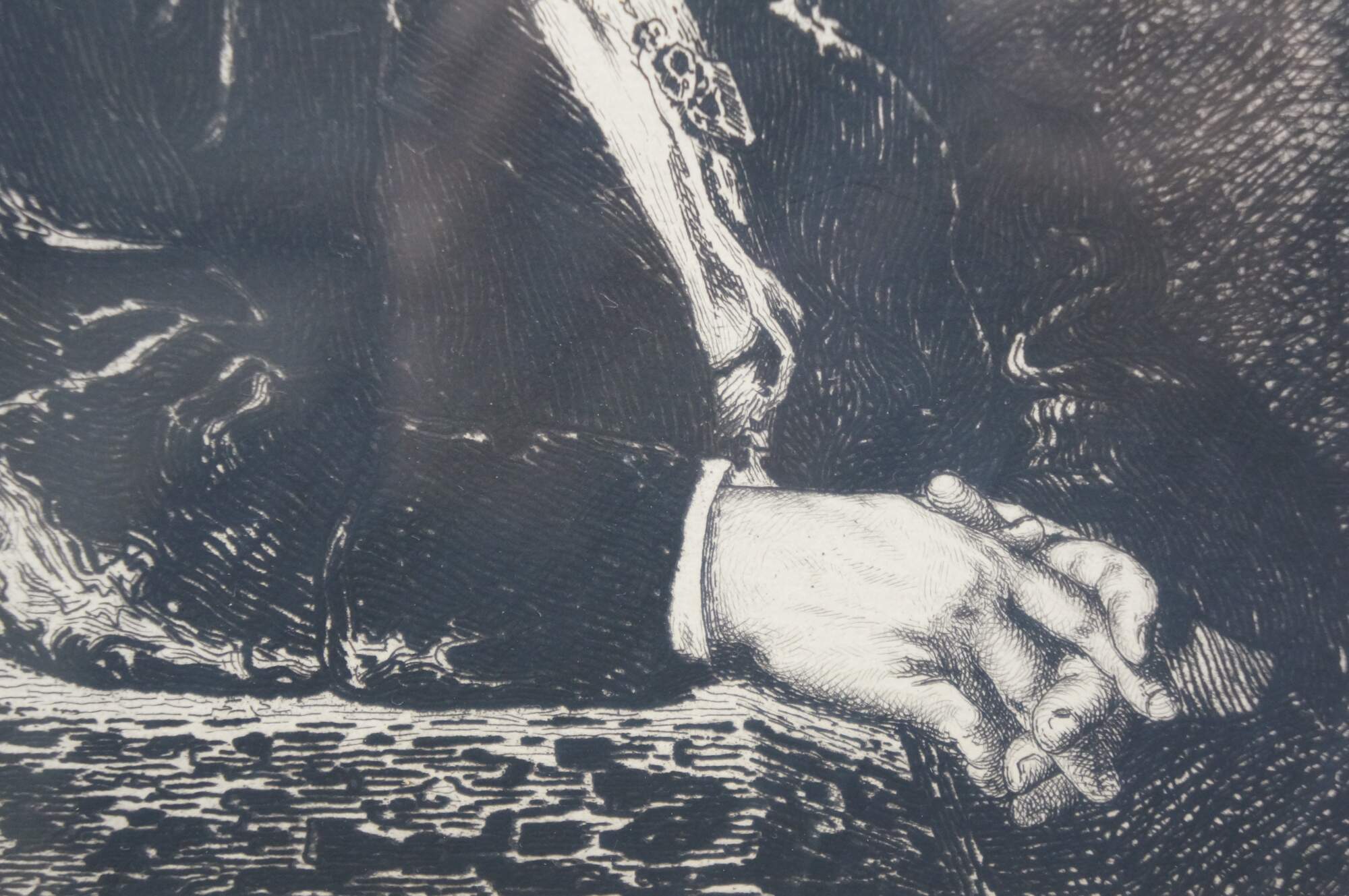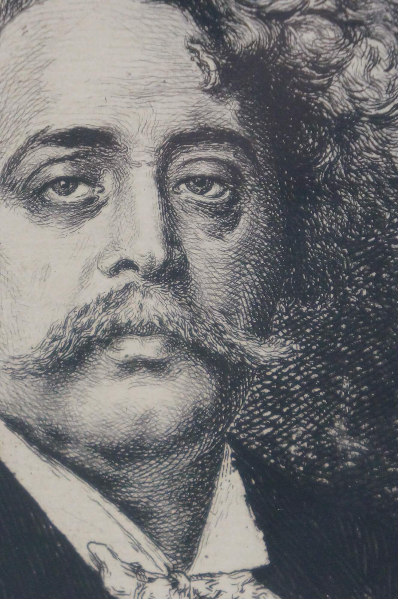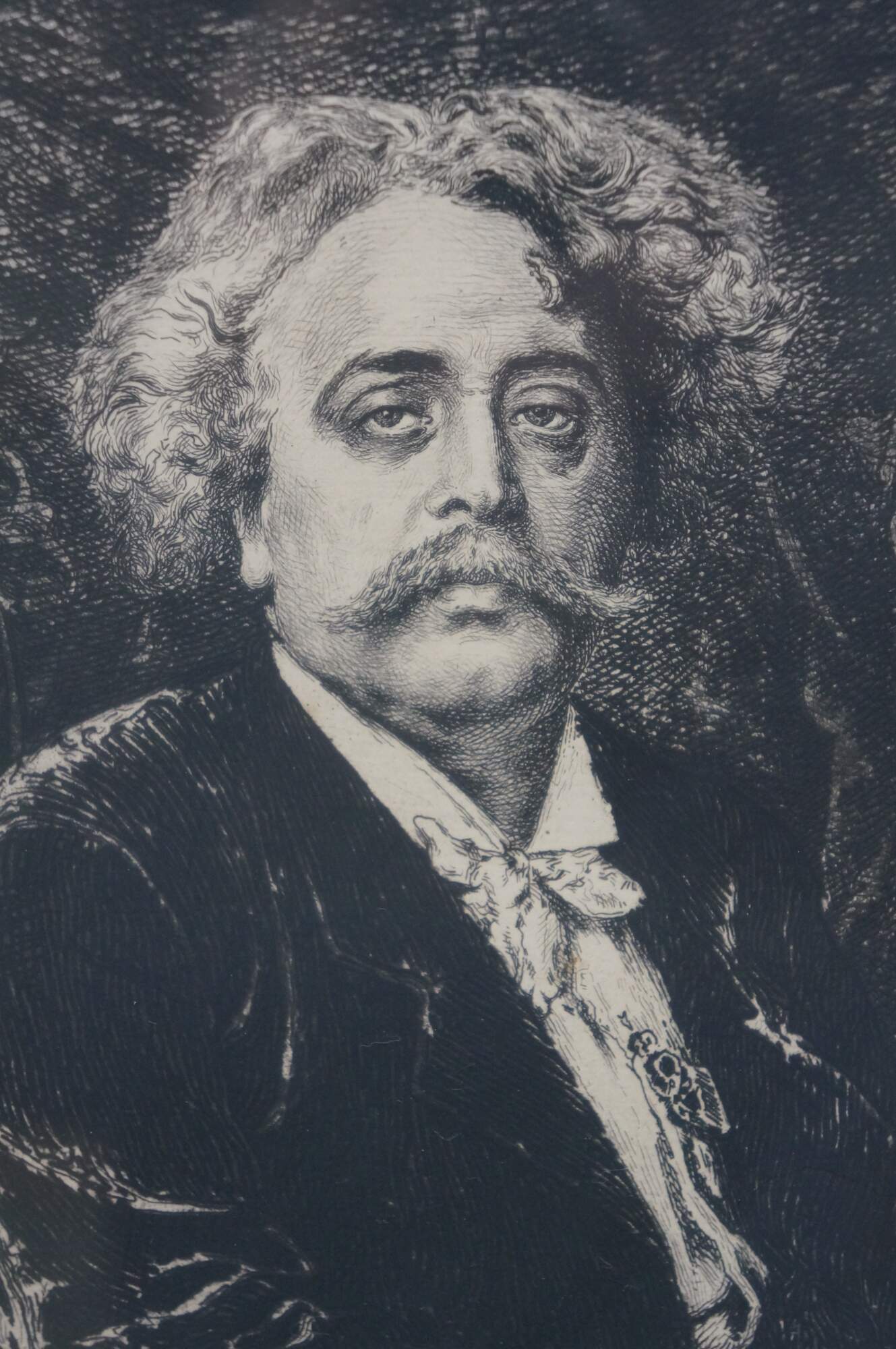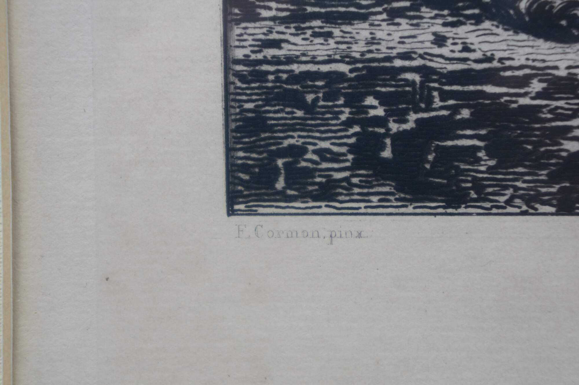 Late 19th century black and white etching titled "Salon de 1877 - Portrait de M. Carrier Belleuse" drawn by Fernand Cormon (24 December 1845 – 20 March 1924) and etched by Benjamin Louis Auguste Damman (1835 - 1921). Depicts a portrait of French painter Pierre-Gerard Carrier-Belleuse. Printed by A. Beillet. Mottled gilt wood & composite frame with brown painted bevel and foliate corners.
