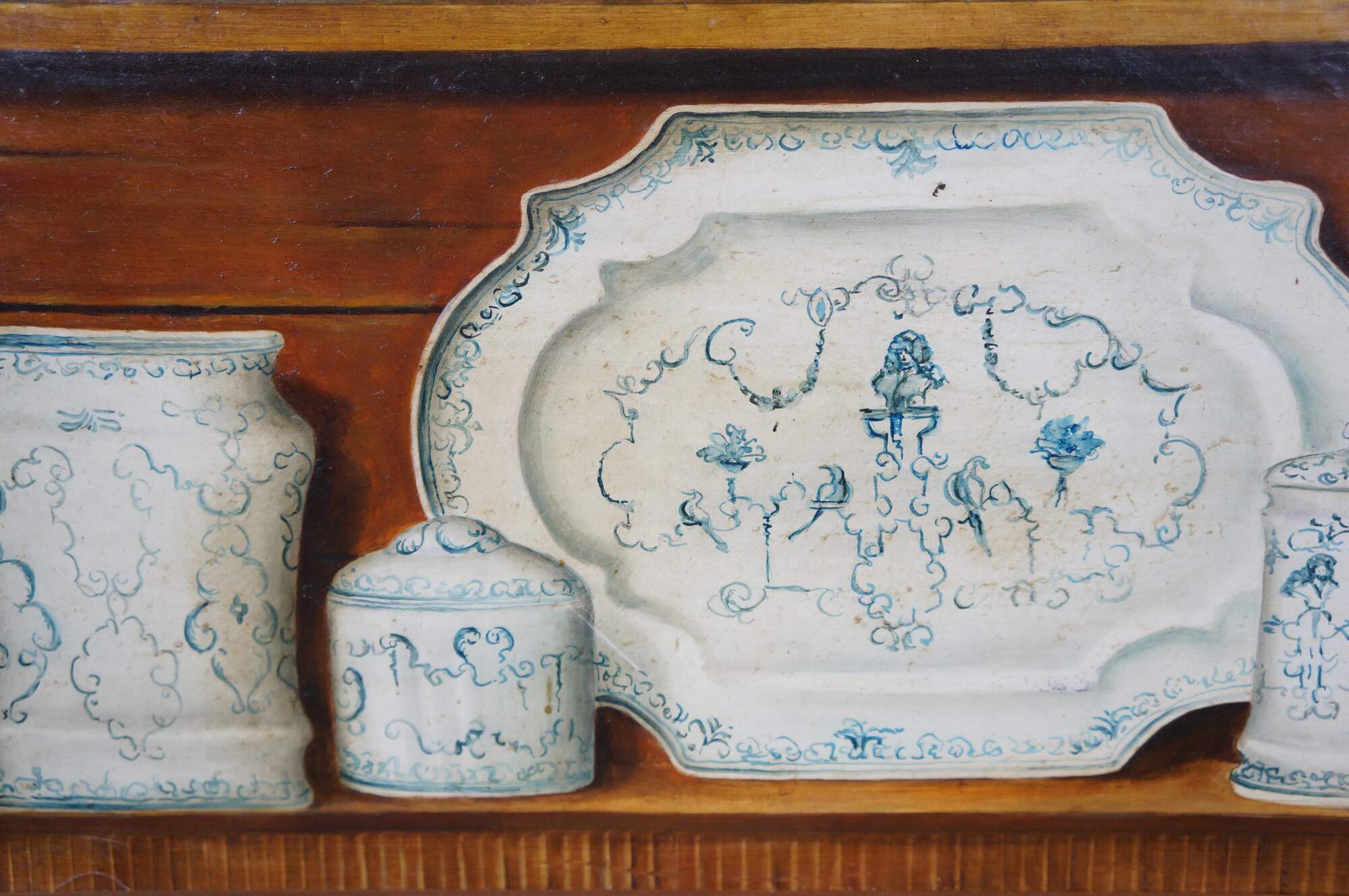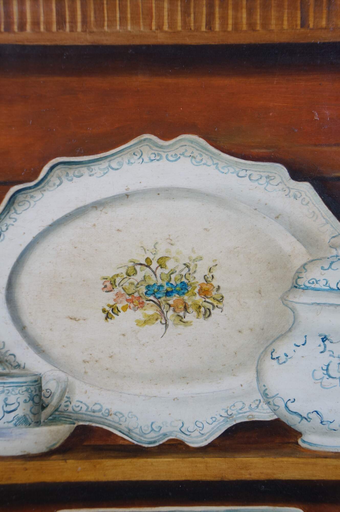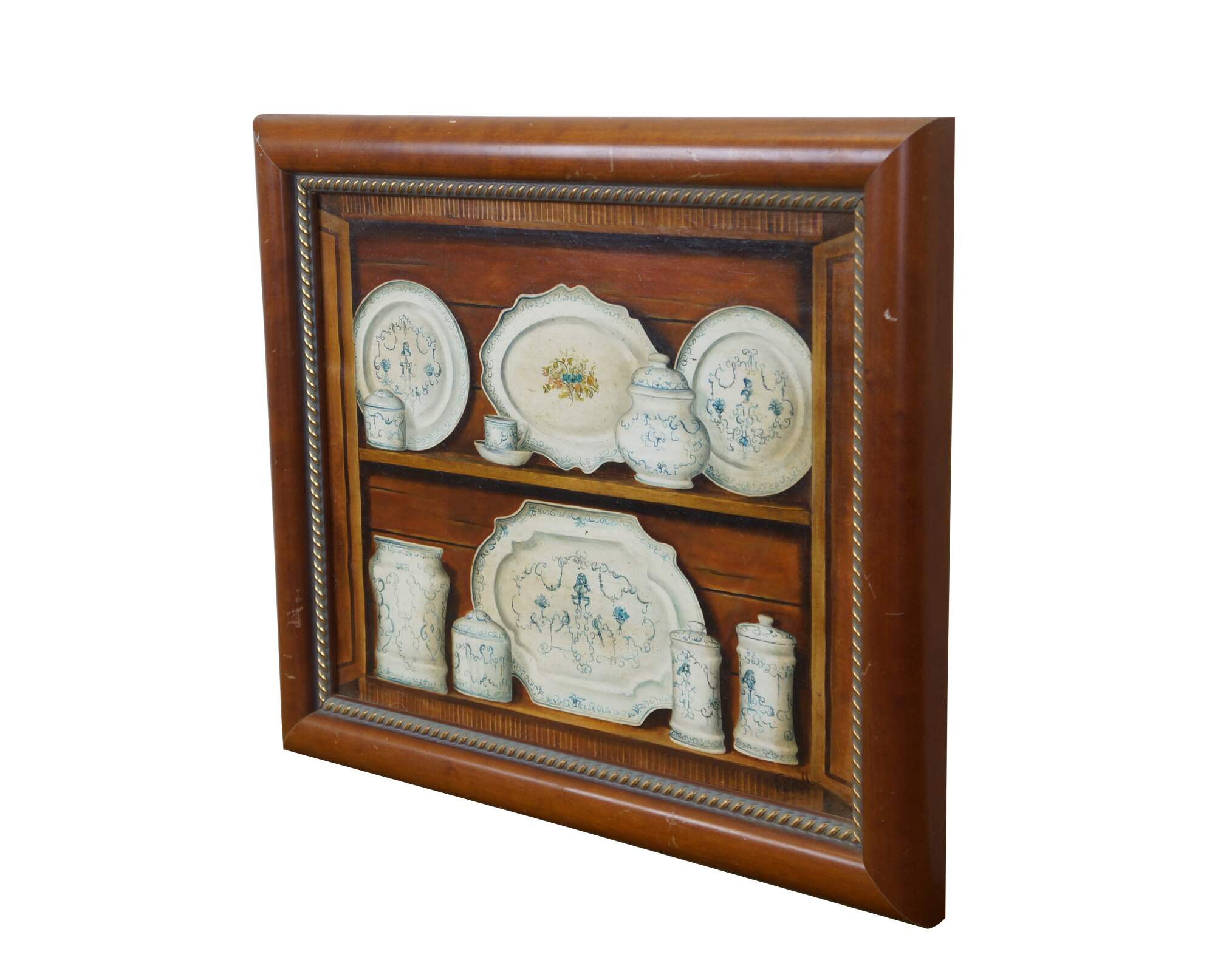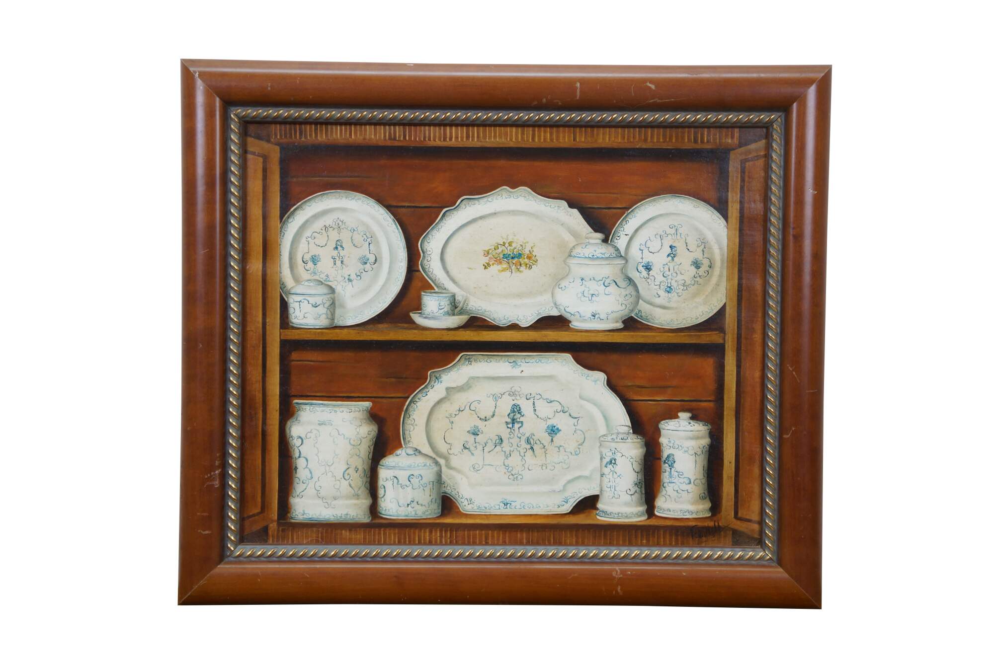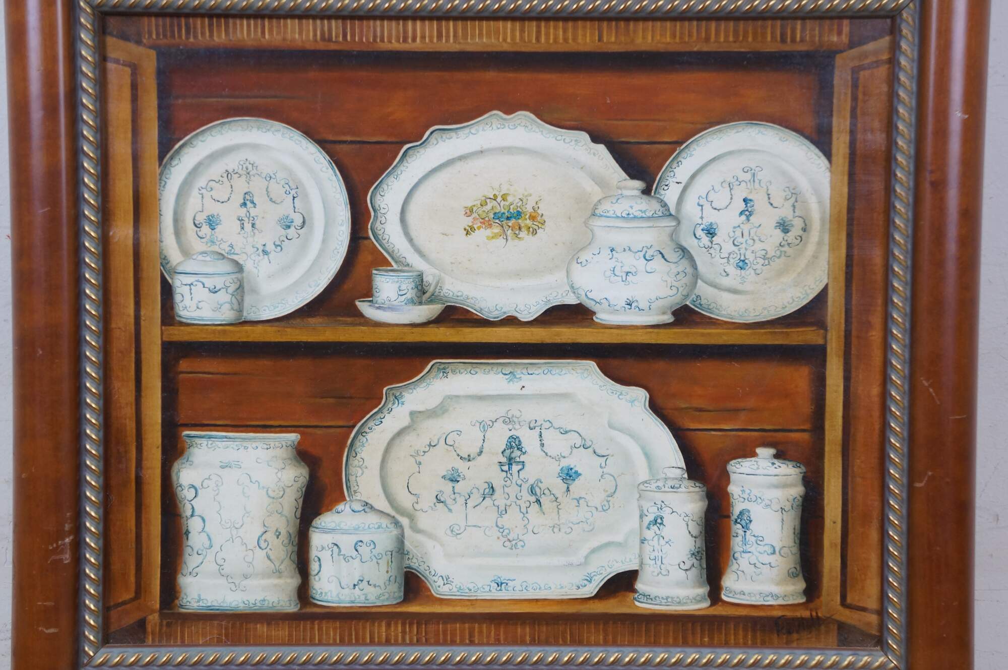 Late 20th century still life oil painting on canvas depicting a farmhouse hutch / cabinet containing a collection of blue and white china. Signed, lower right by artist Frabrice De Villeneuve. Wood frame with gilt rope twist edge.