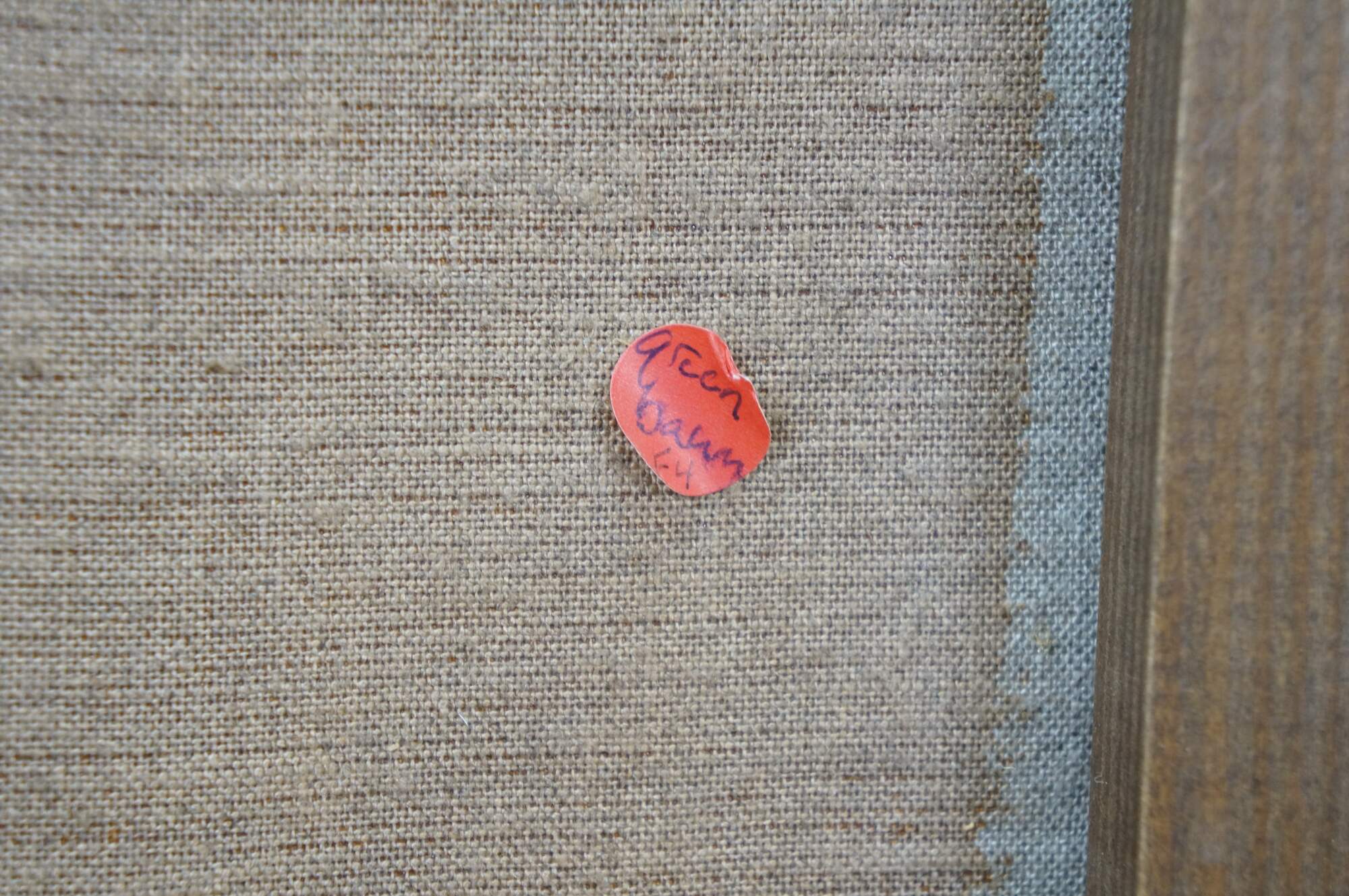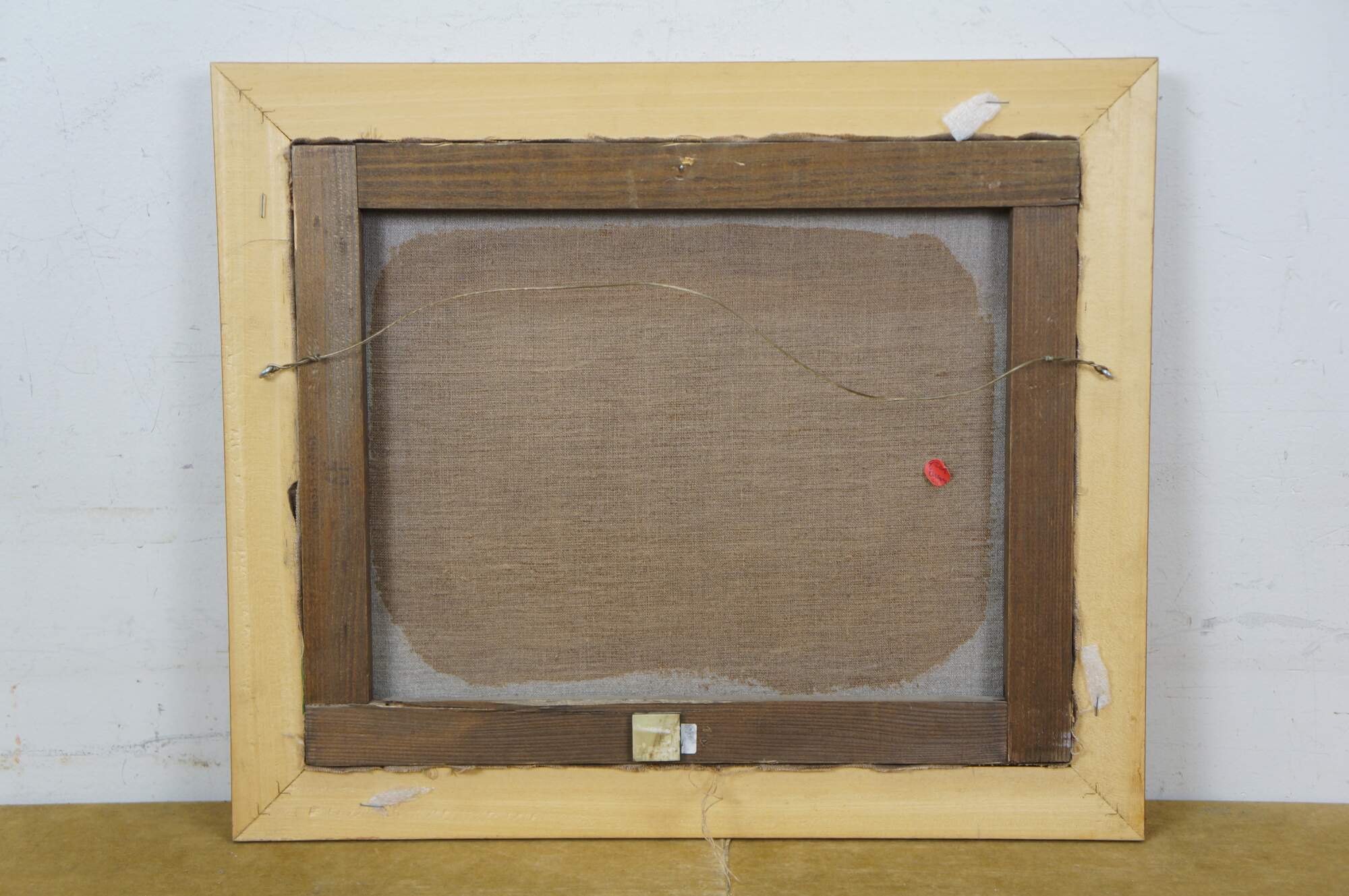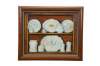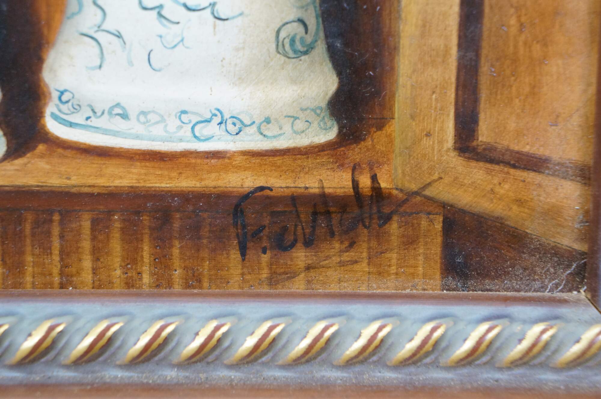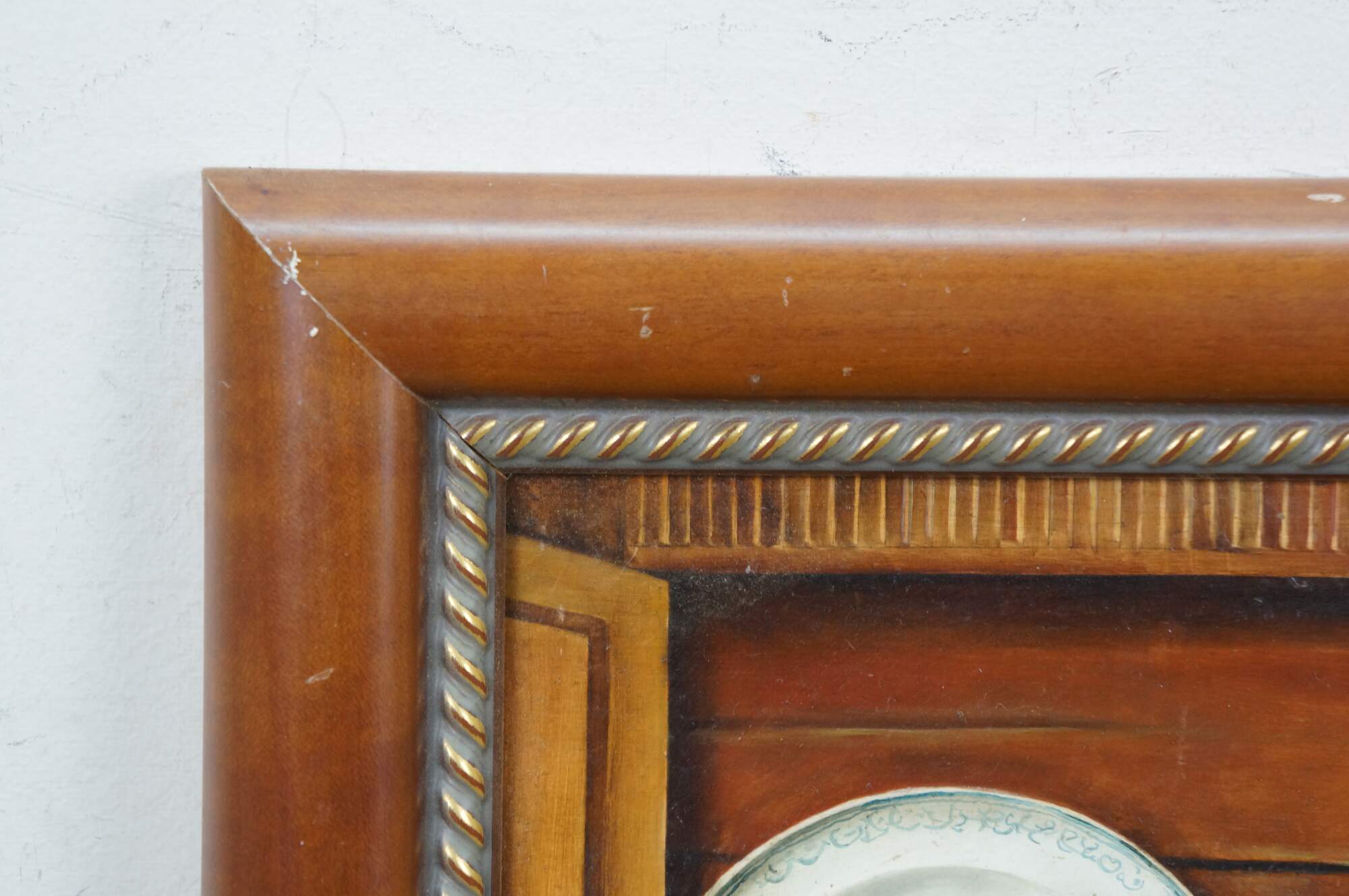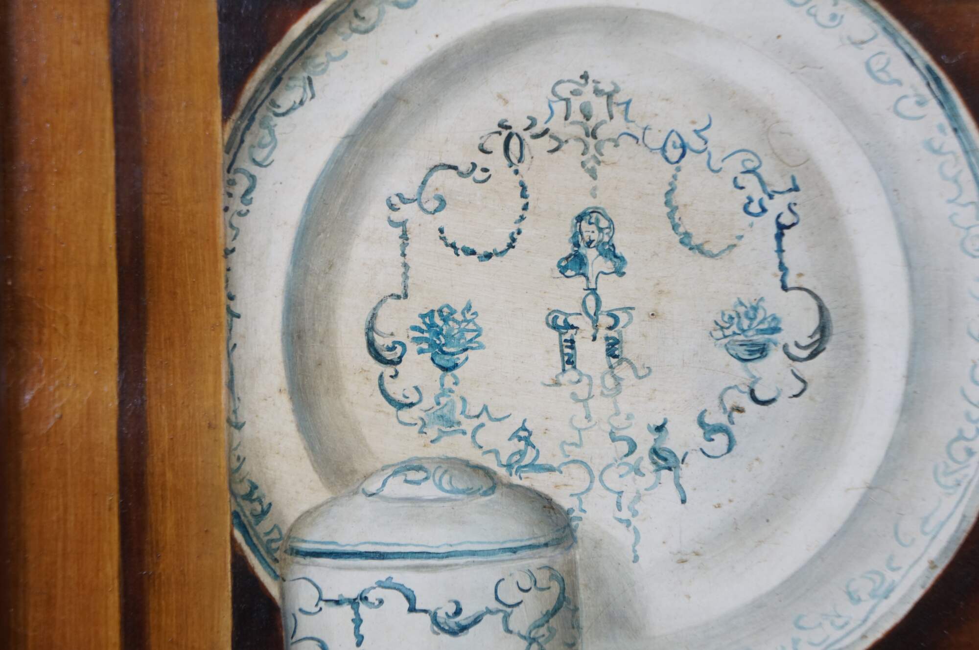 Late 20th century still life oil painting on canvas depicting a farmhouse hutch / cabinet containing a collection of blue and white china. Signed, lower right by artist Frabrice De Villeneuve. Wood frame with gilt rope twist edge.