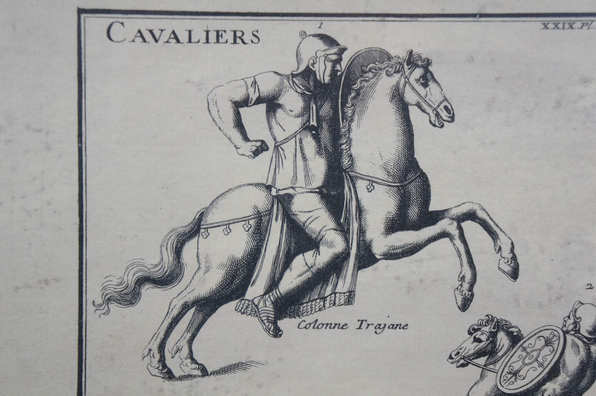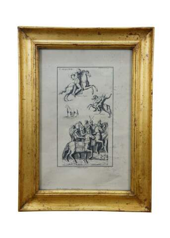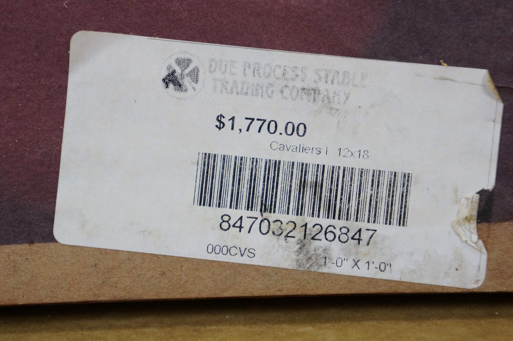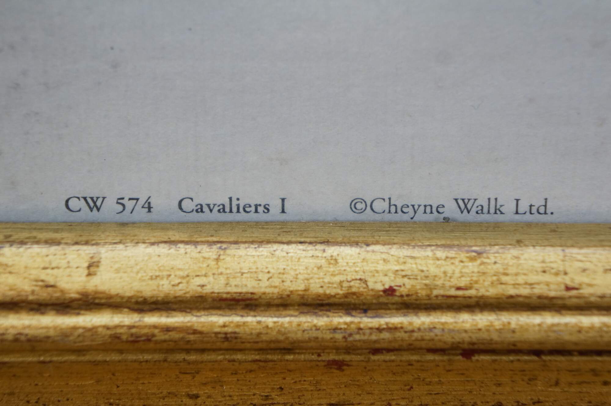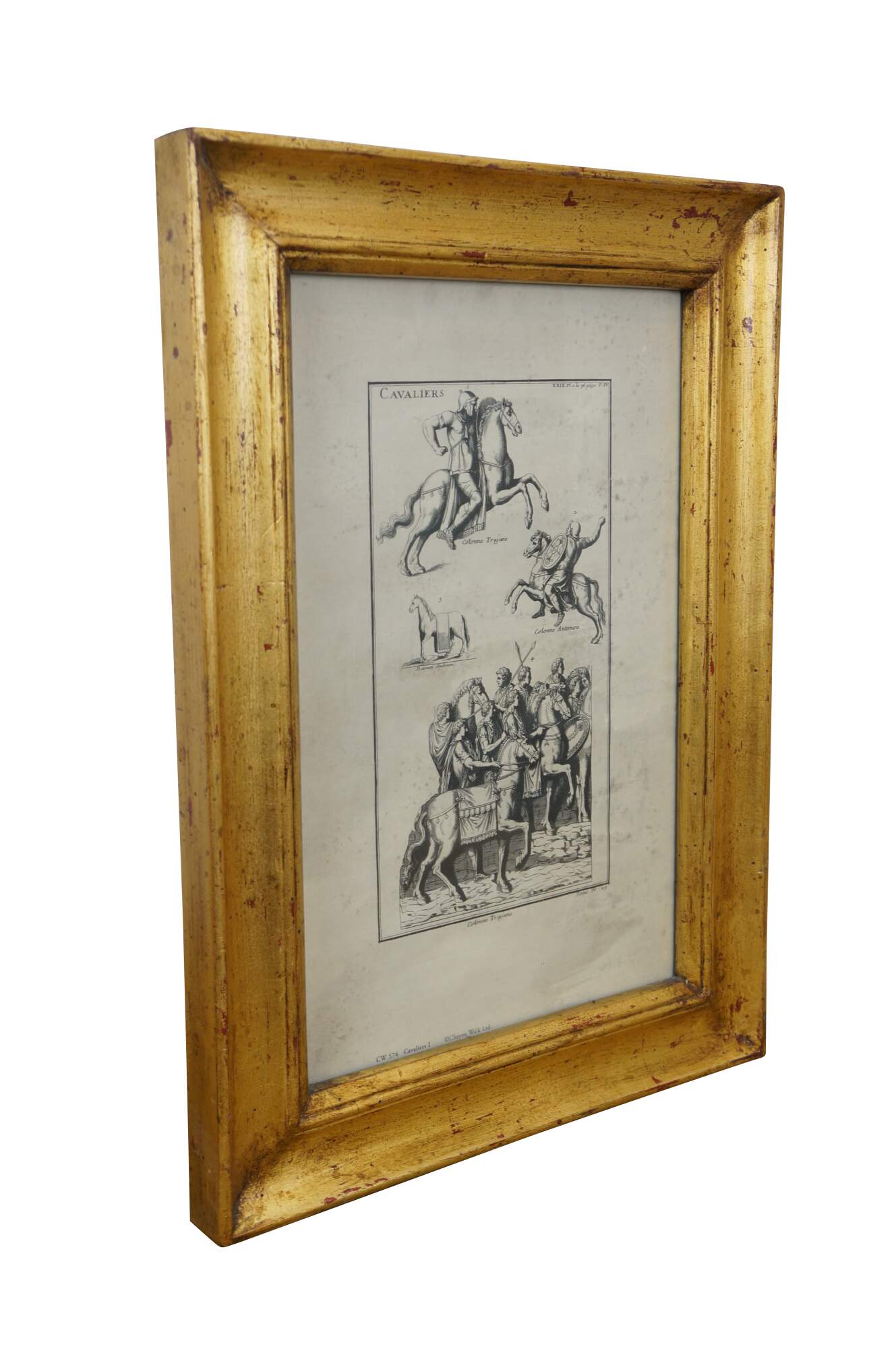 Cavaliers I antiqued print number CW 574 by Trevor James Company / Cheyne Walk Ltd. It features ancient Mediterranean soldiers on horseback. Giltwood beveled frame.