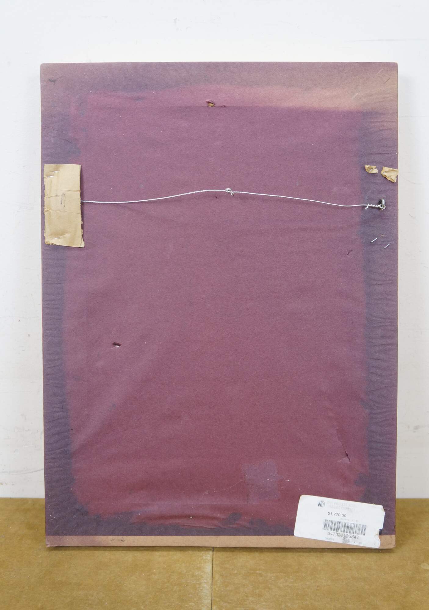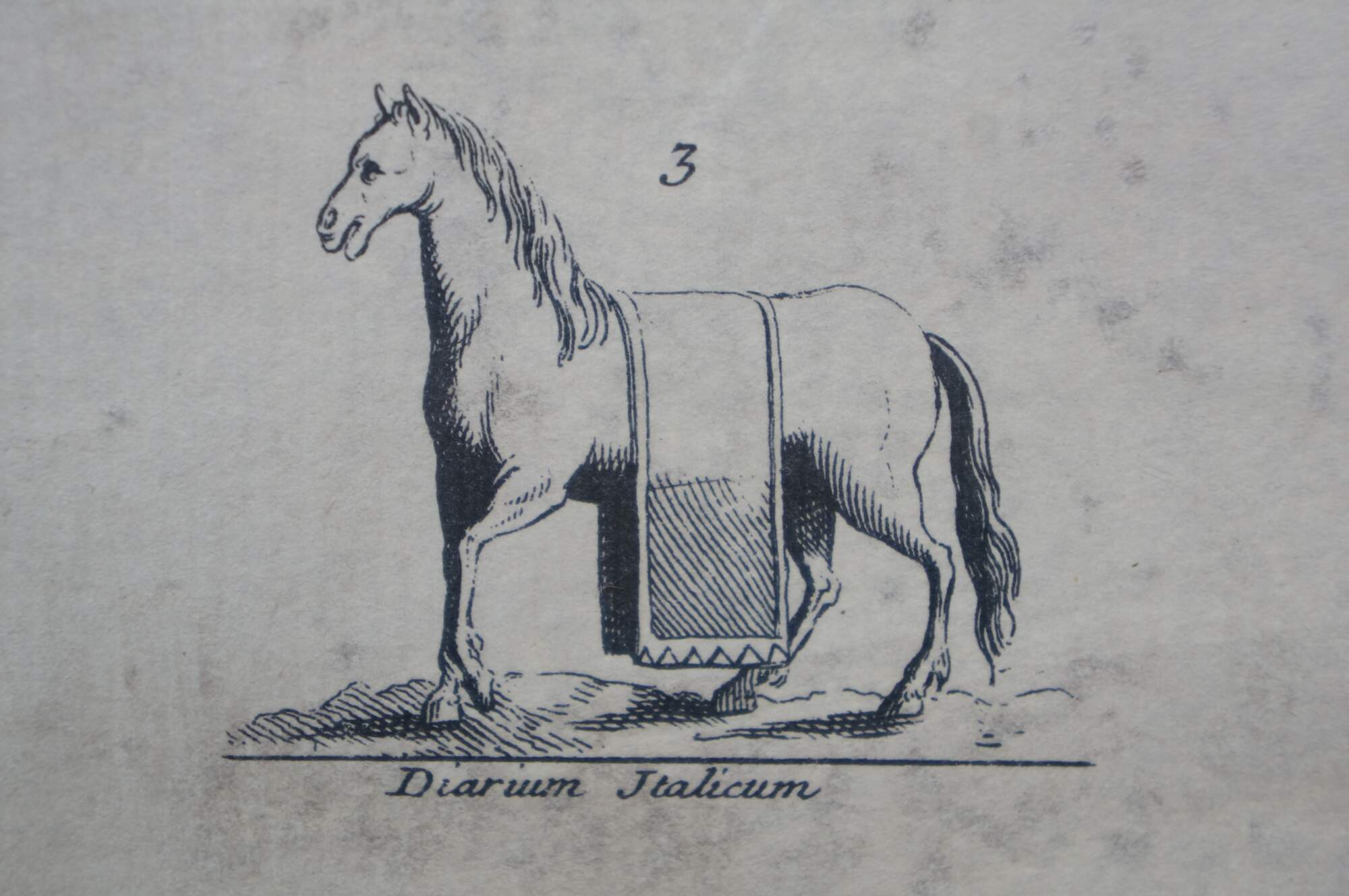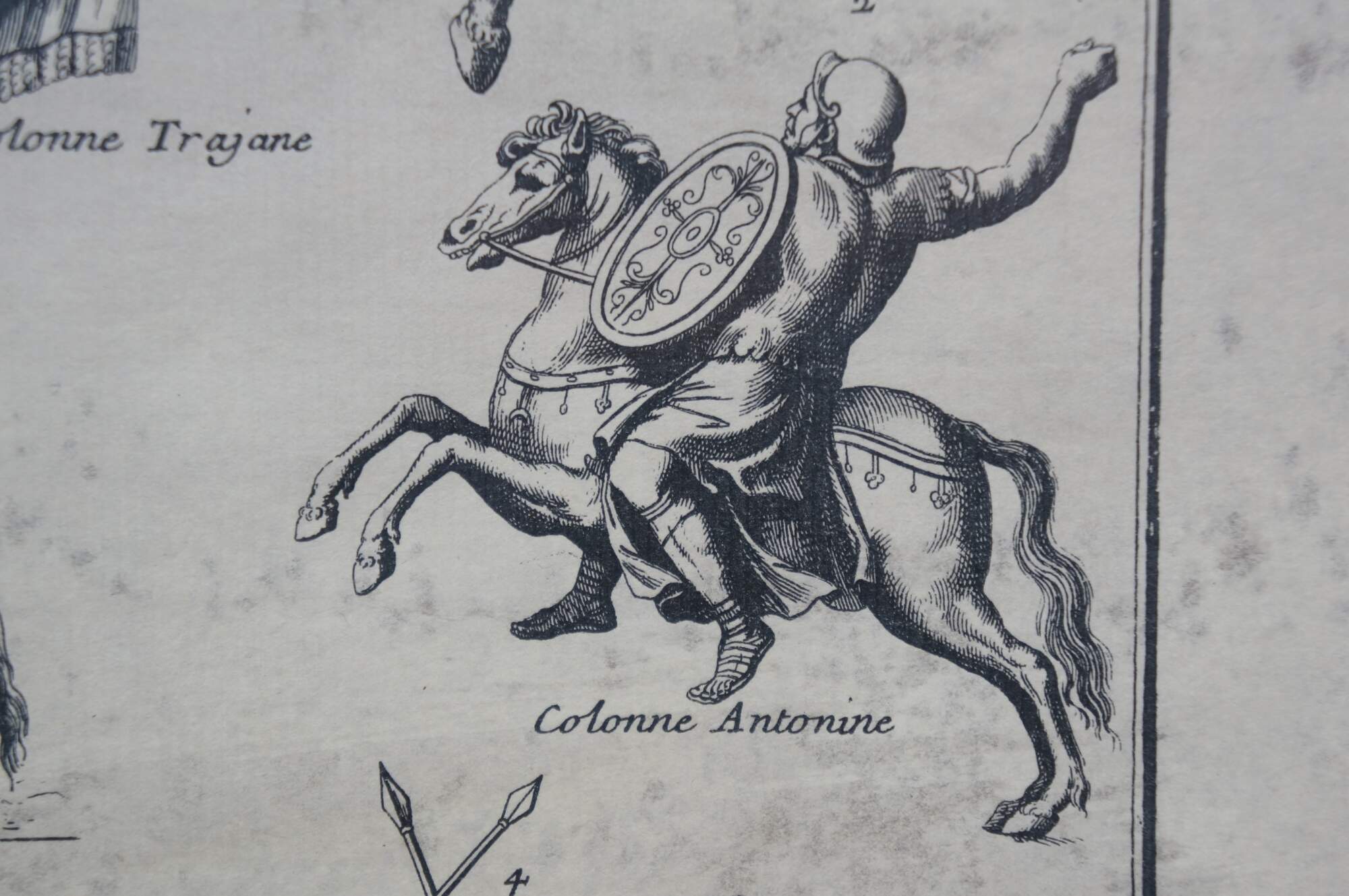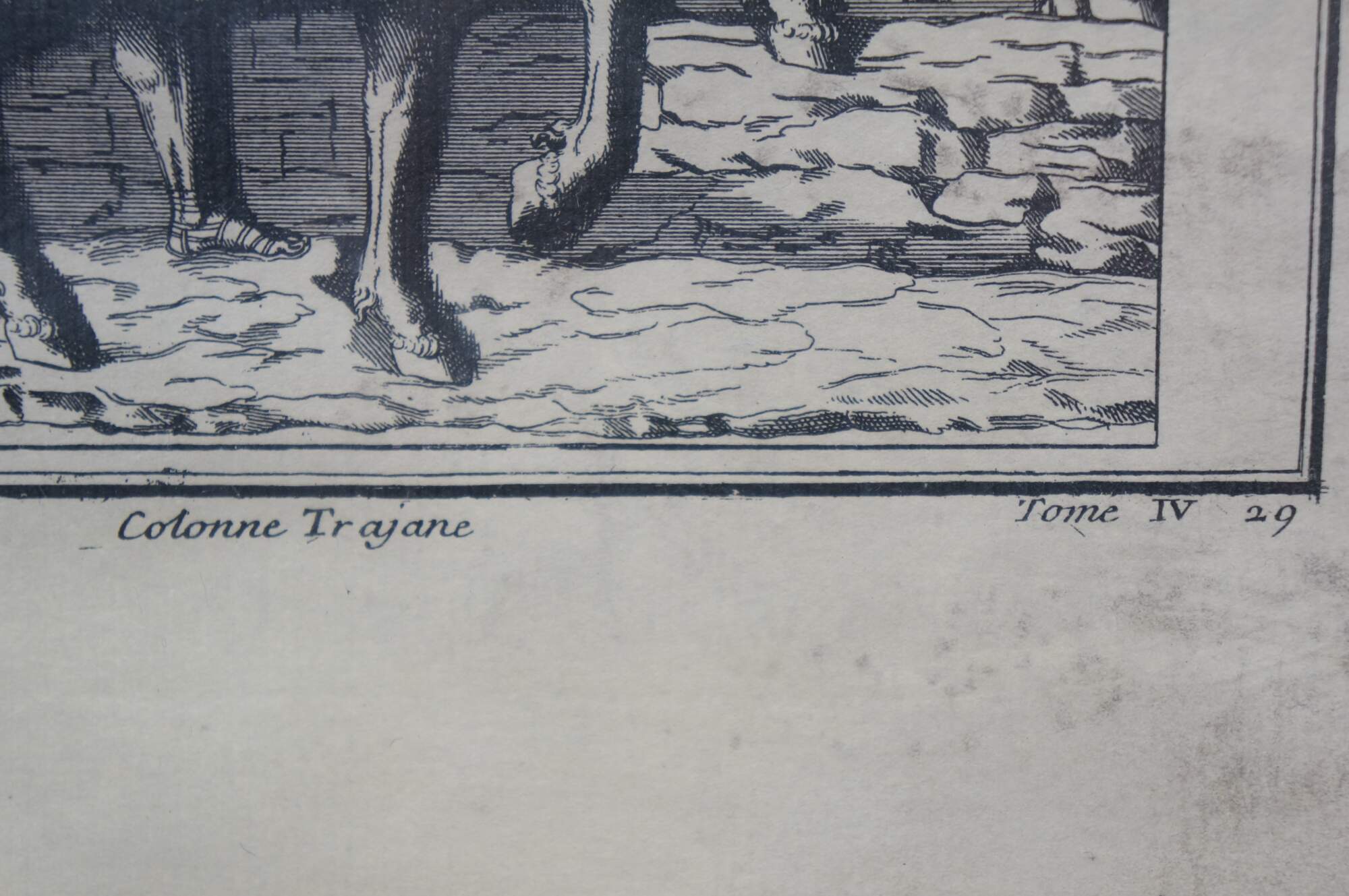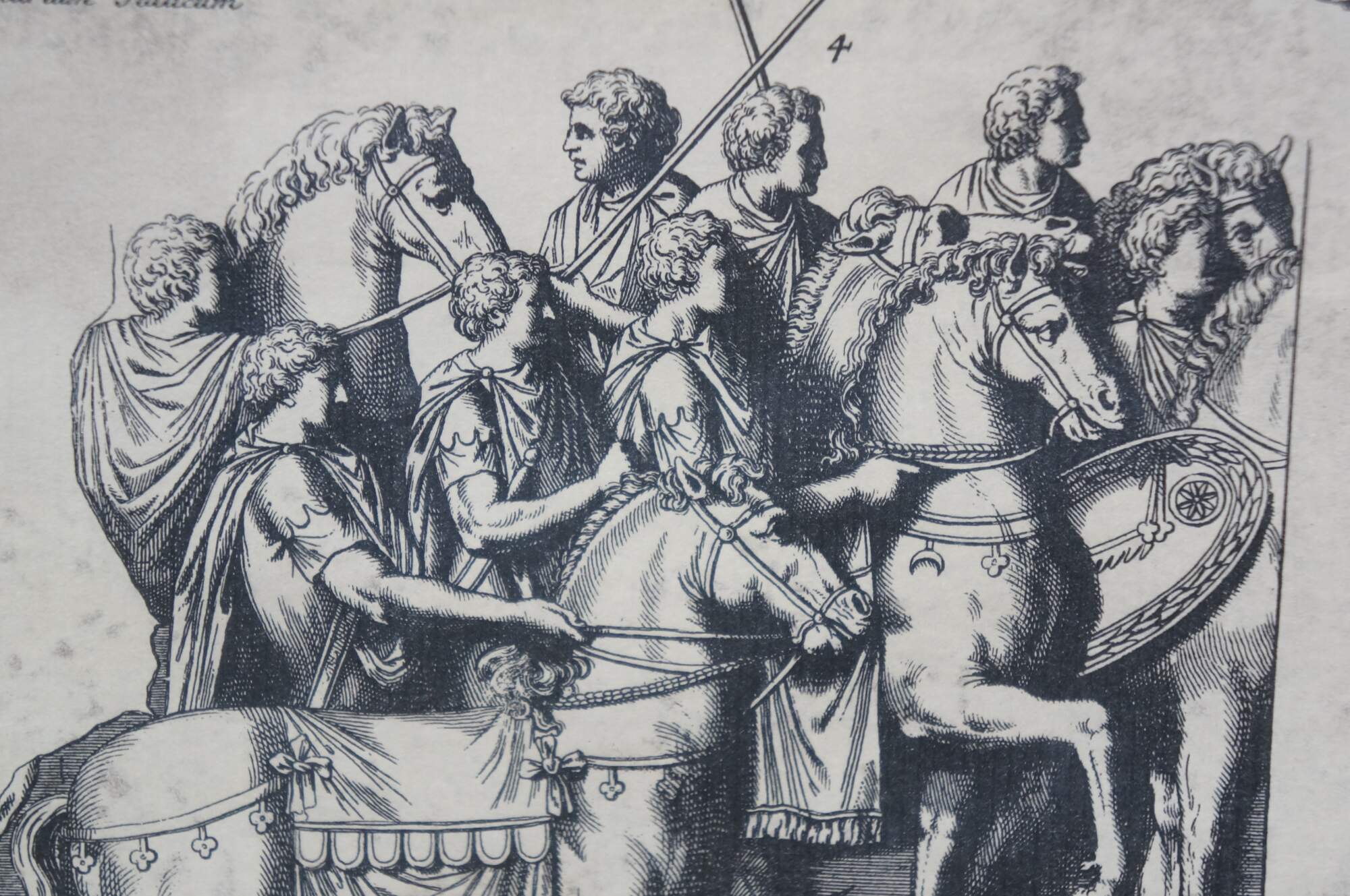 Cavaliers I antiqued print number CW 574 by Trevor James Company / Cheyne Walk Ltd. It features ancient Mediterranean soldiers on horseback. Giltwood beveled frame.