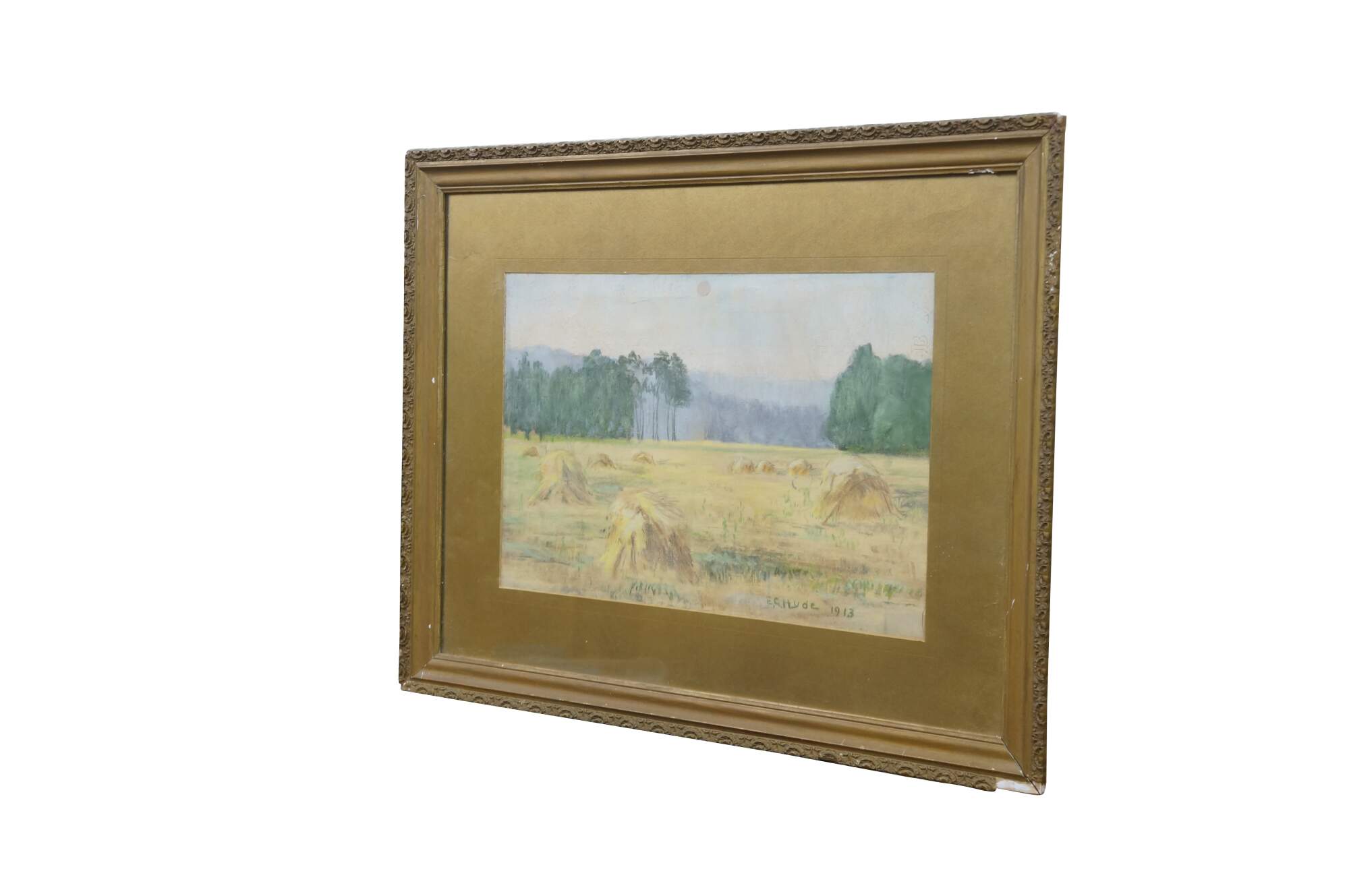 Antique 1913 Emily G. Hyde impressionist pastel on paper painting featuring a rural Indiana country farm / field landscape with haystacks / bales or sheaves under a hazy sky. Gold gesso frame.