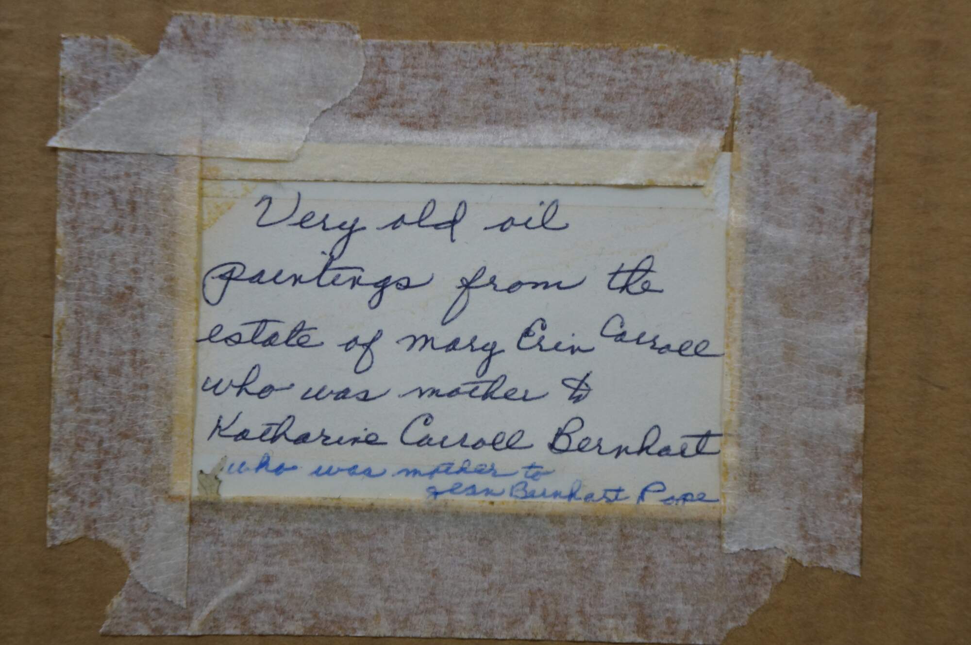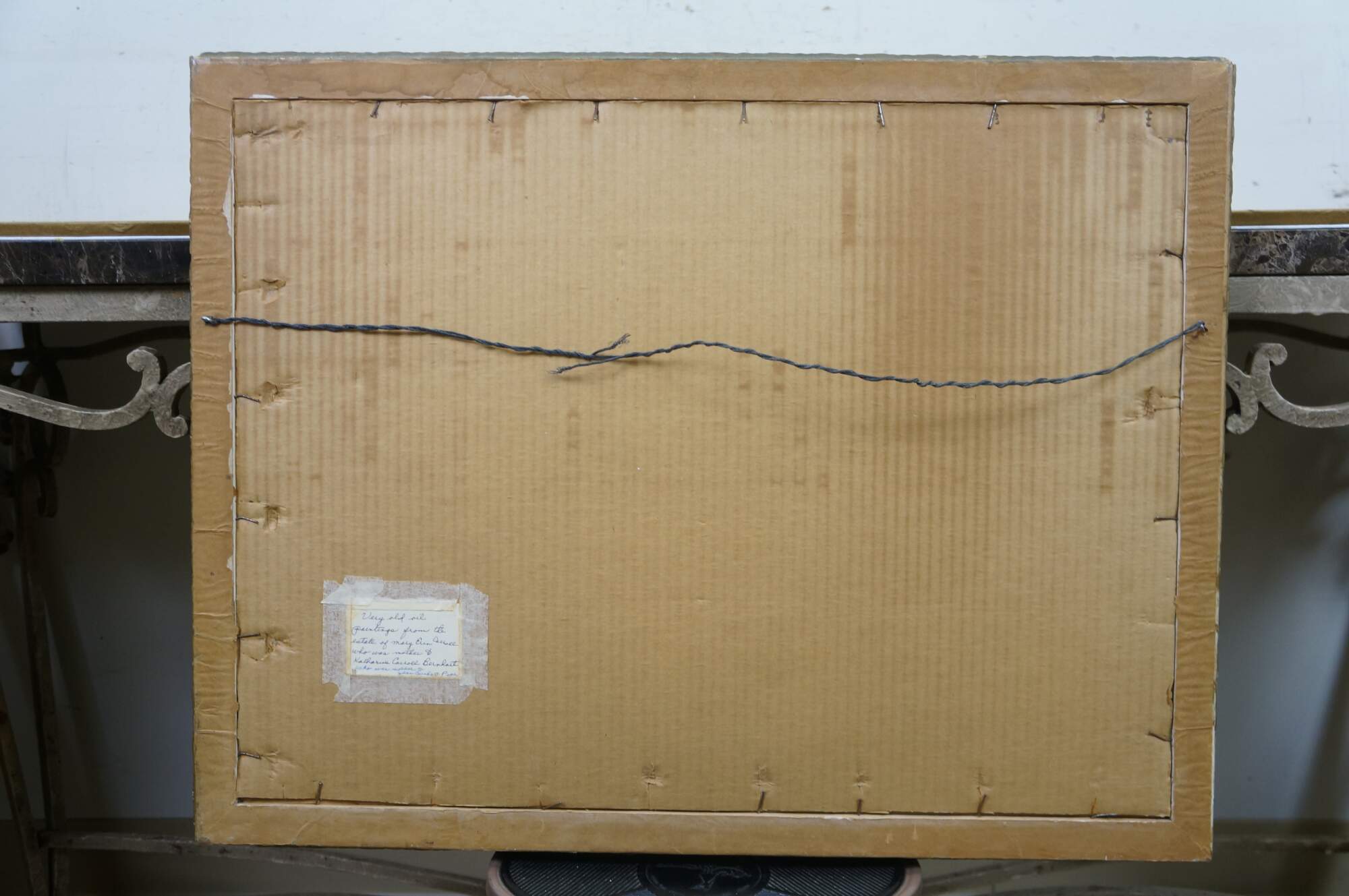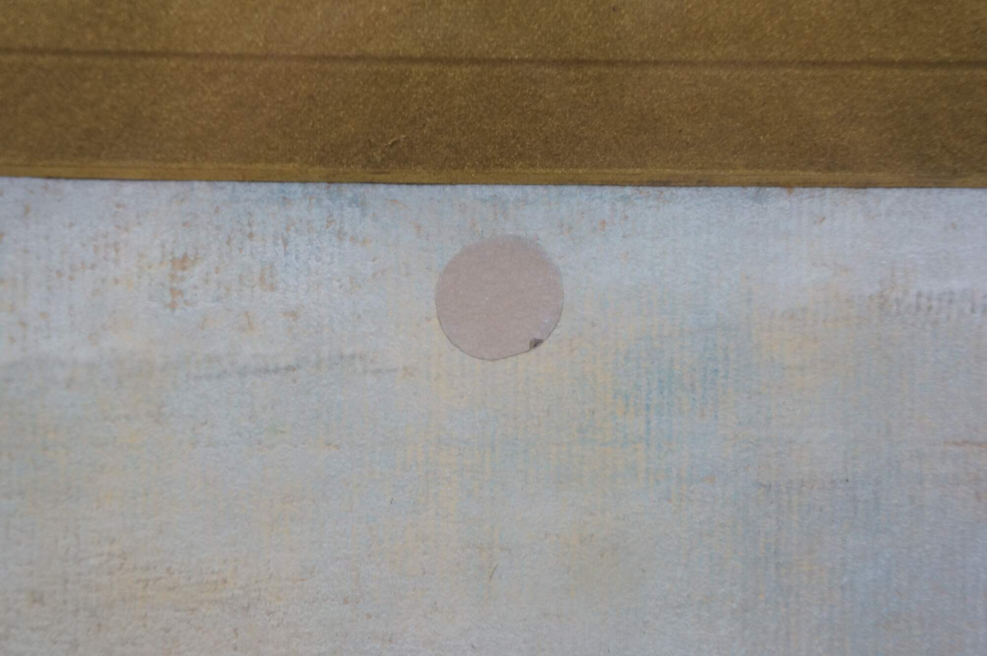 Wear and distressing from age, repair to canvas, finish loss, trim damage to frame, splitting / crazing.