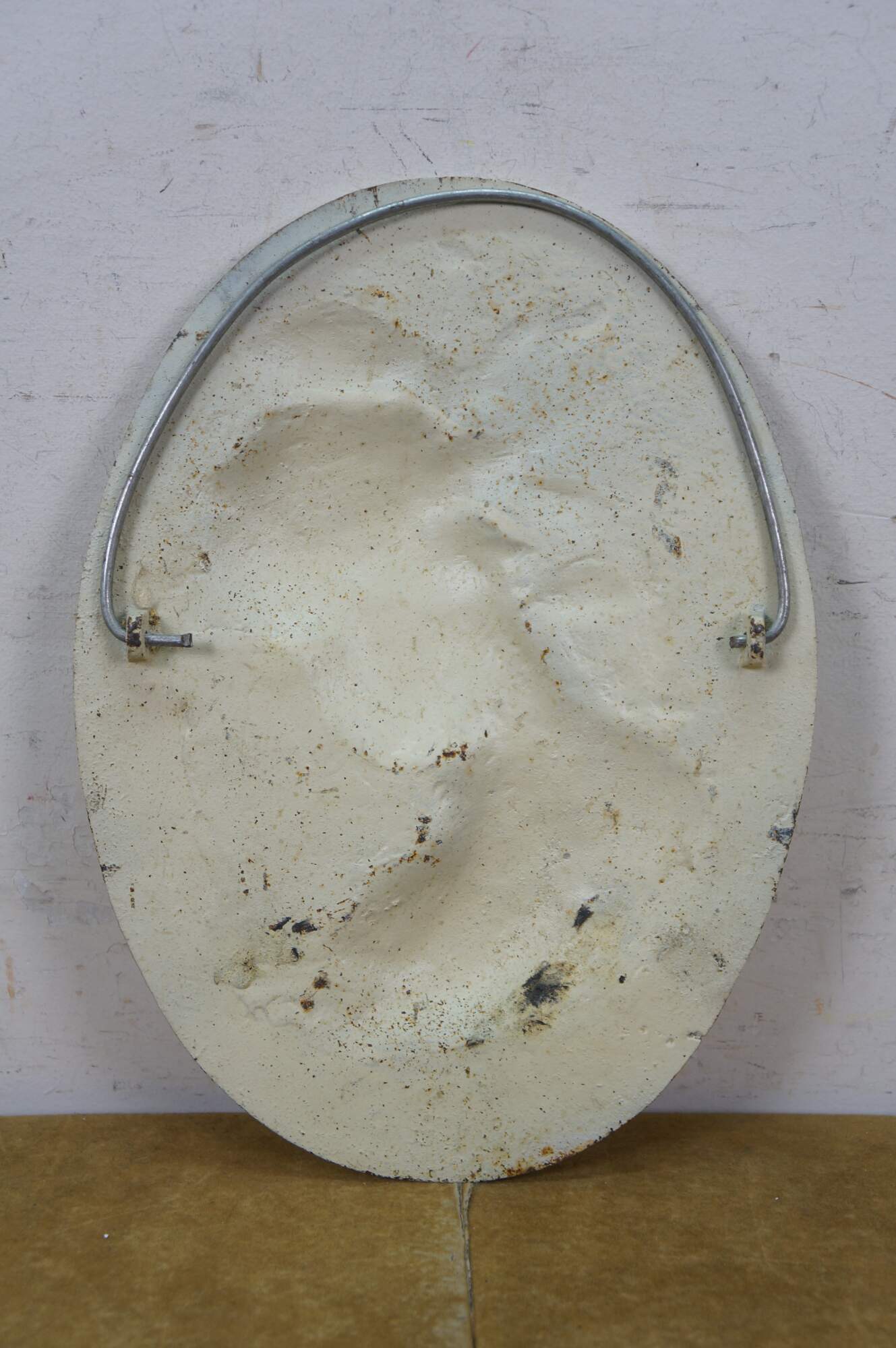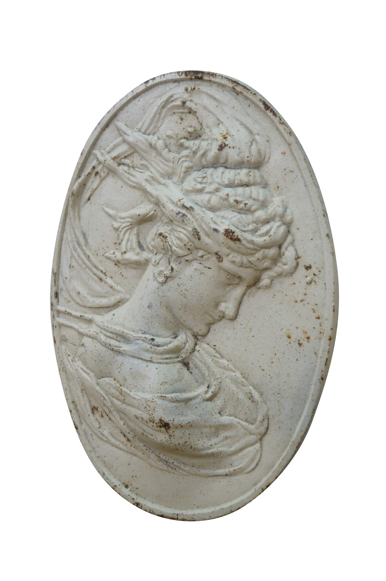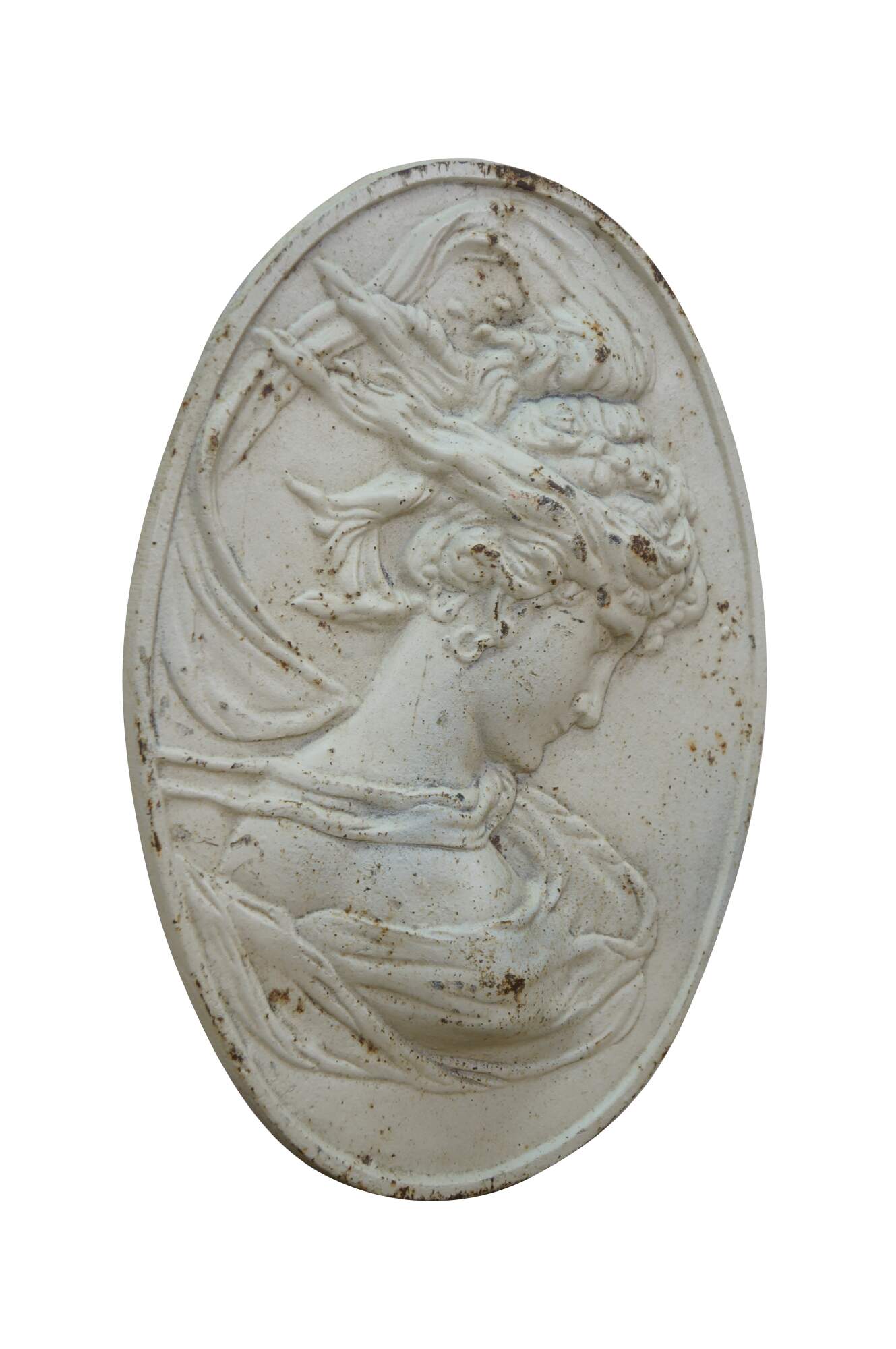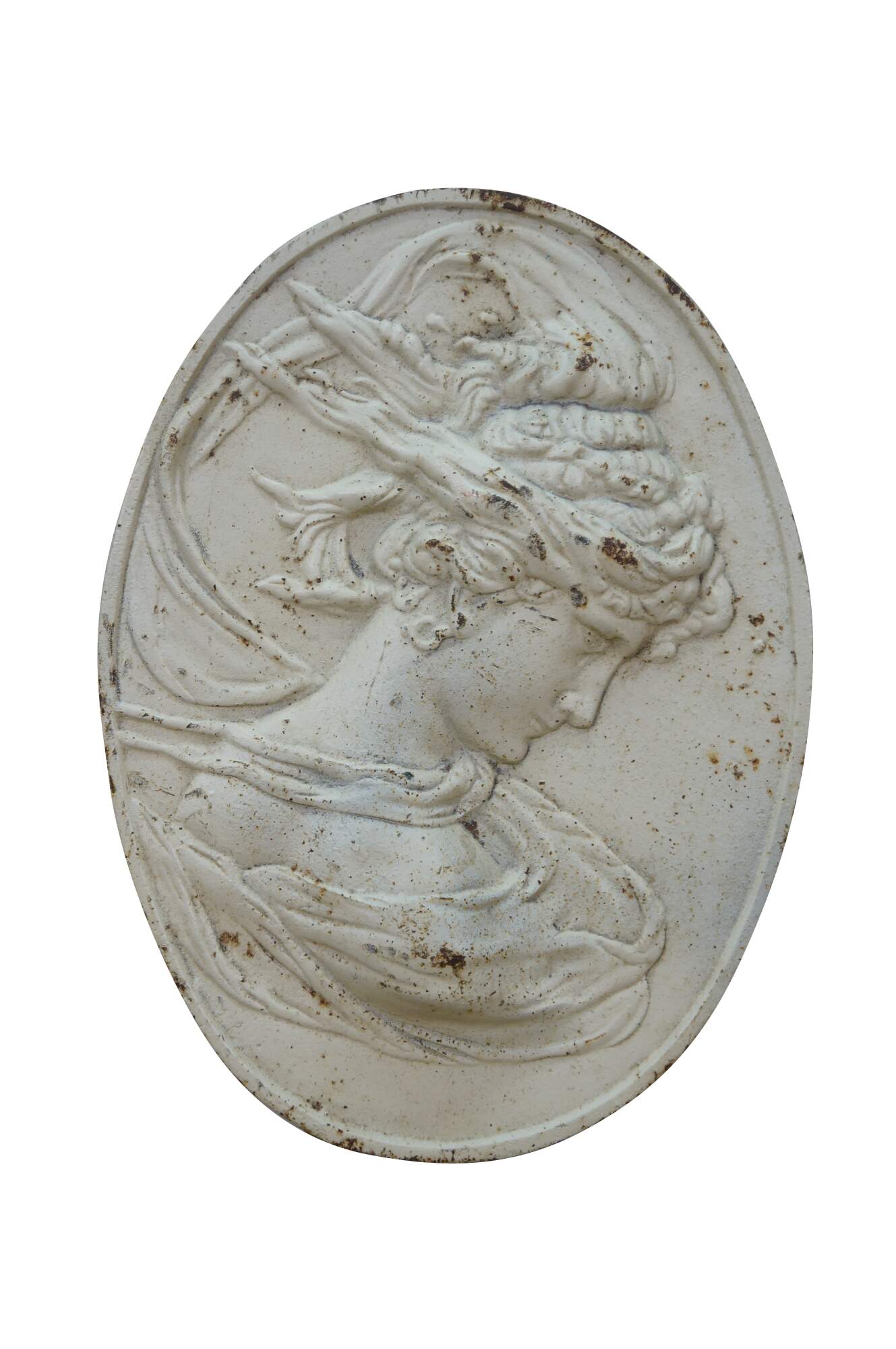 Mid to early century white painted cast iron oval bas relief cameo garden plaque showing a neoclassical / art nouveau style female bust representing the East Wind.