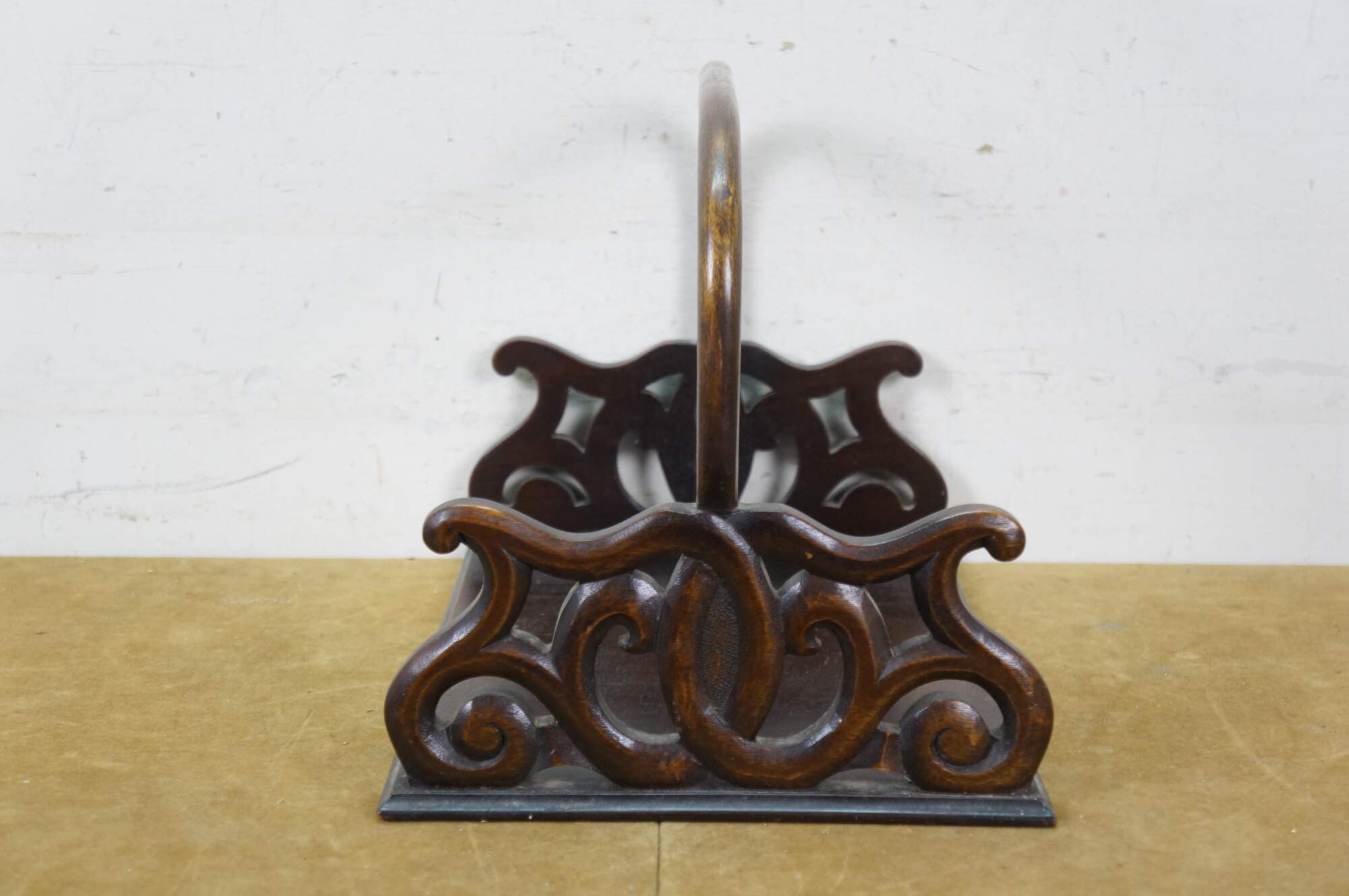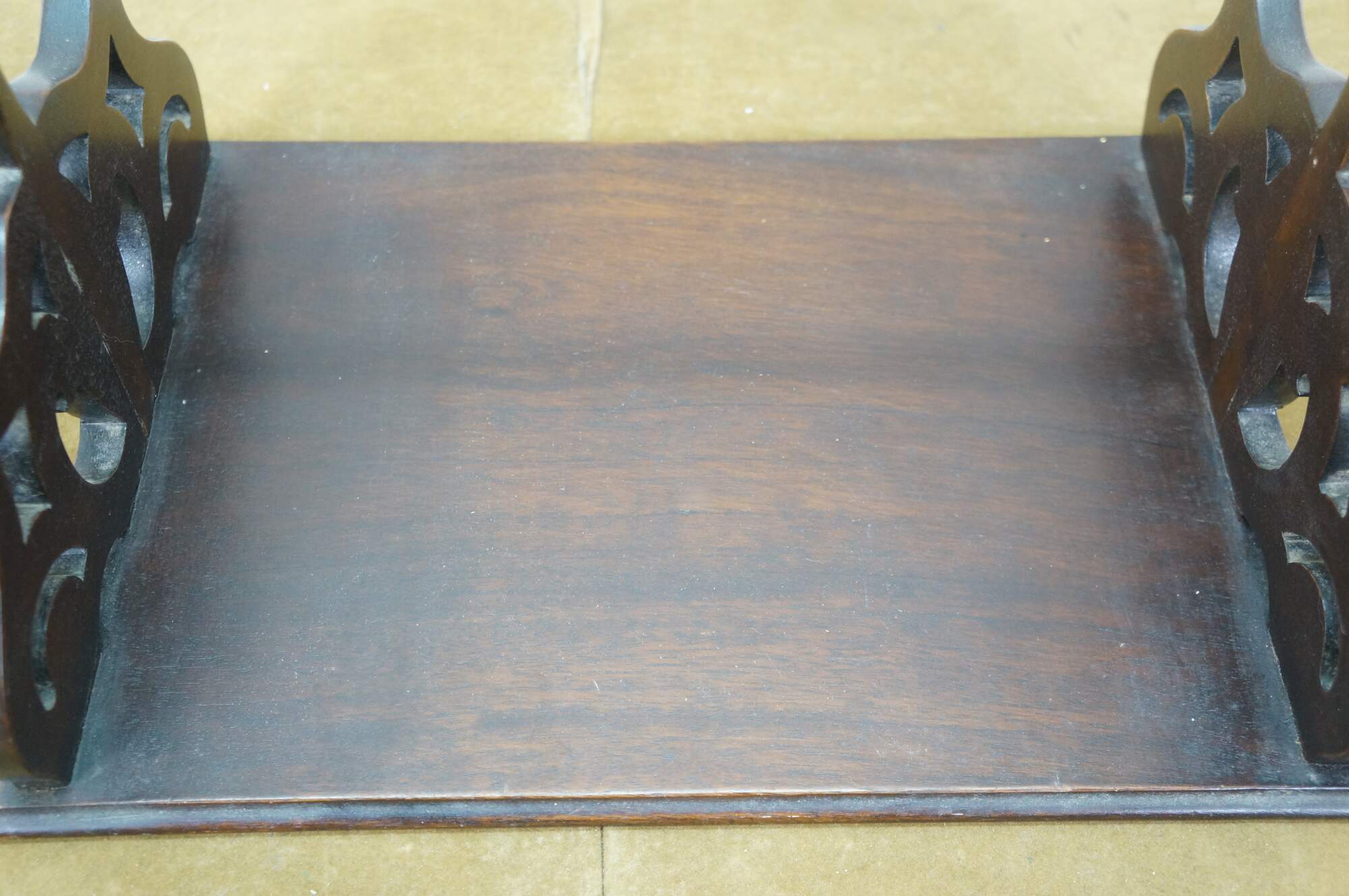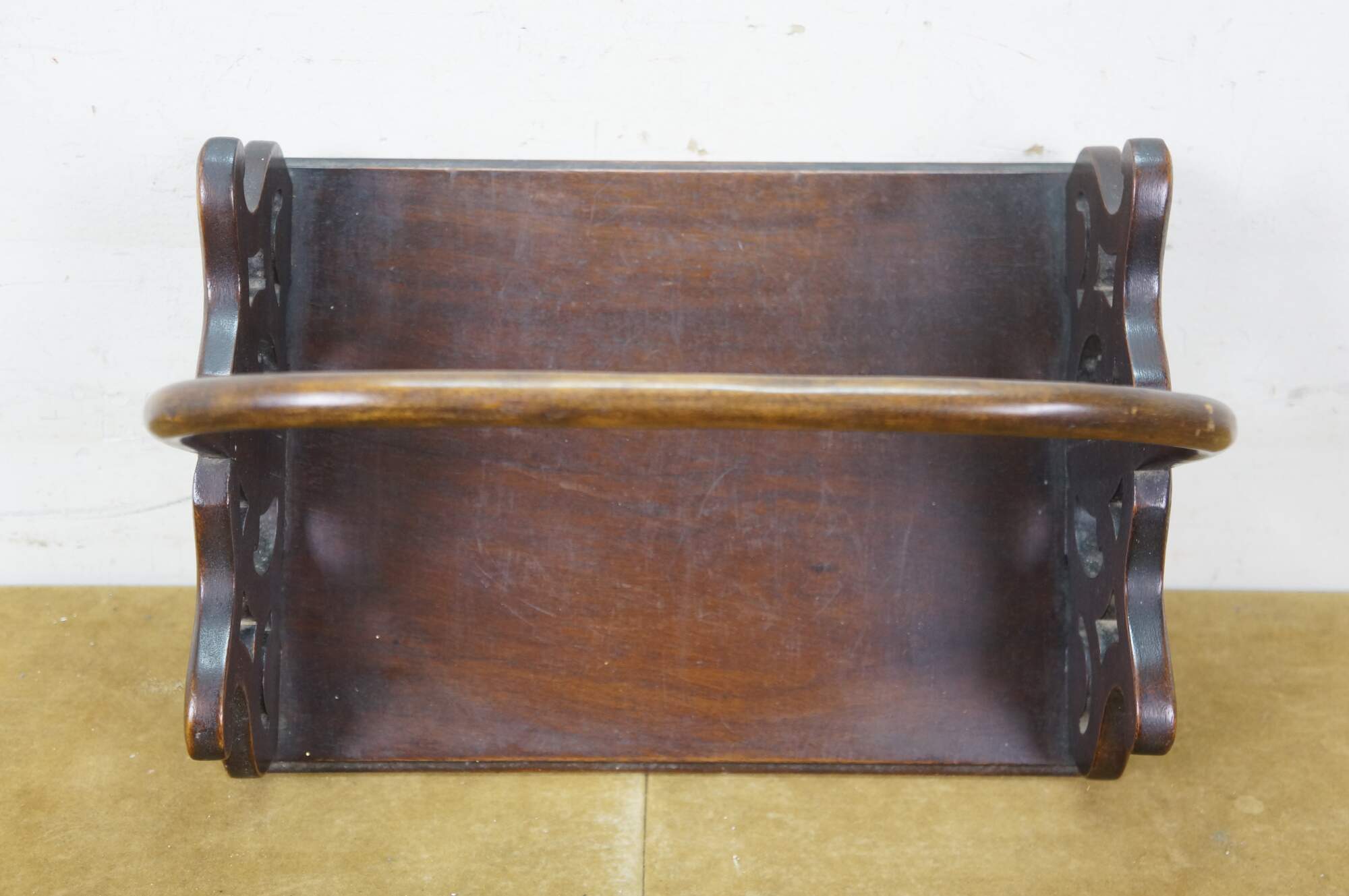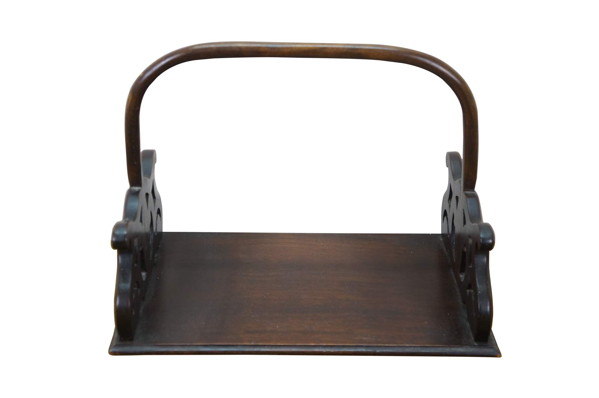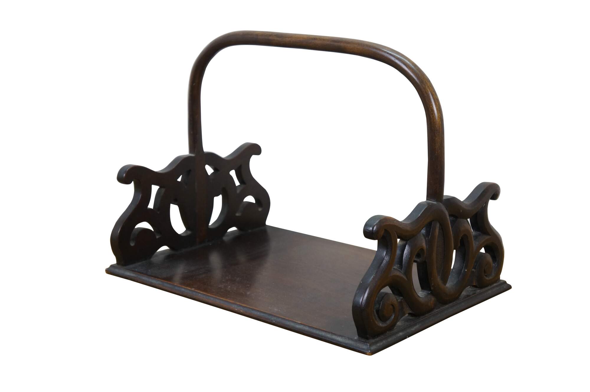 Late 20th century mahogany book rack / library tray / magazine holder. Rectangular base with pierced scrollwork ends joined with a fixed bentwood handle.