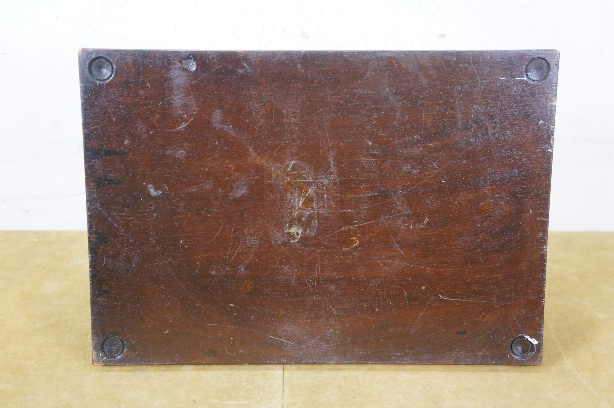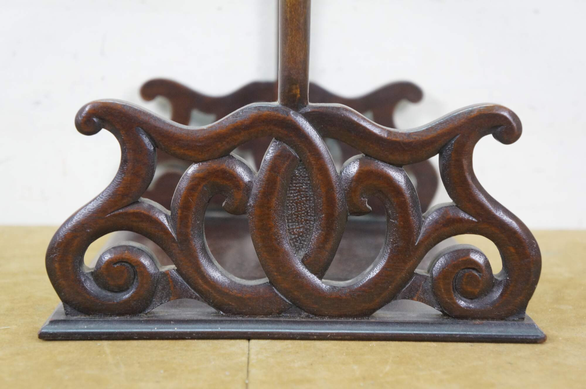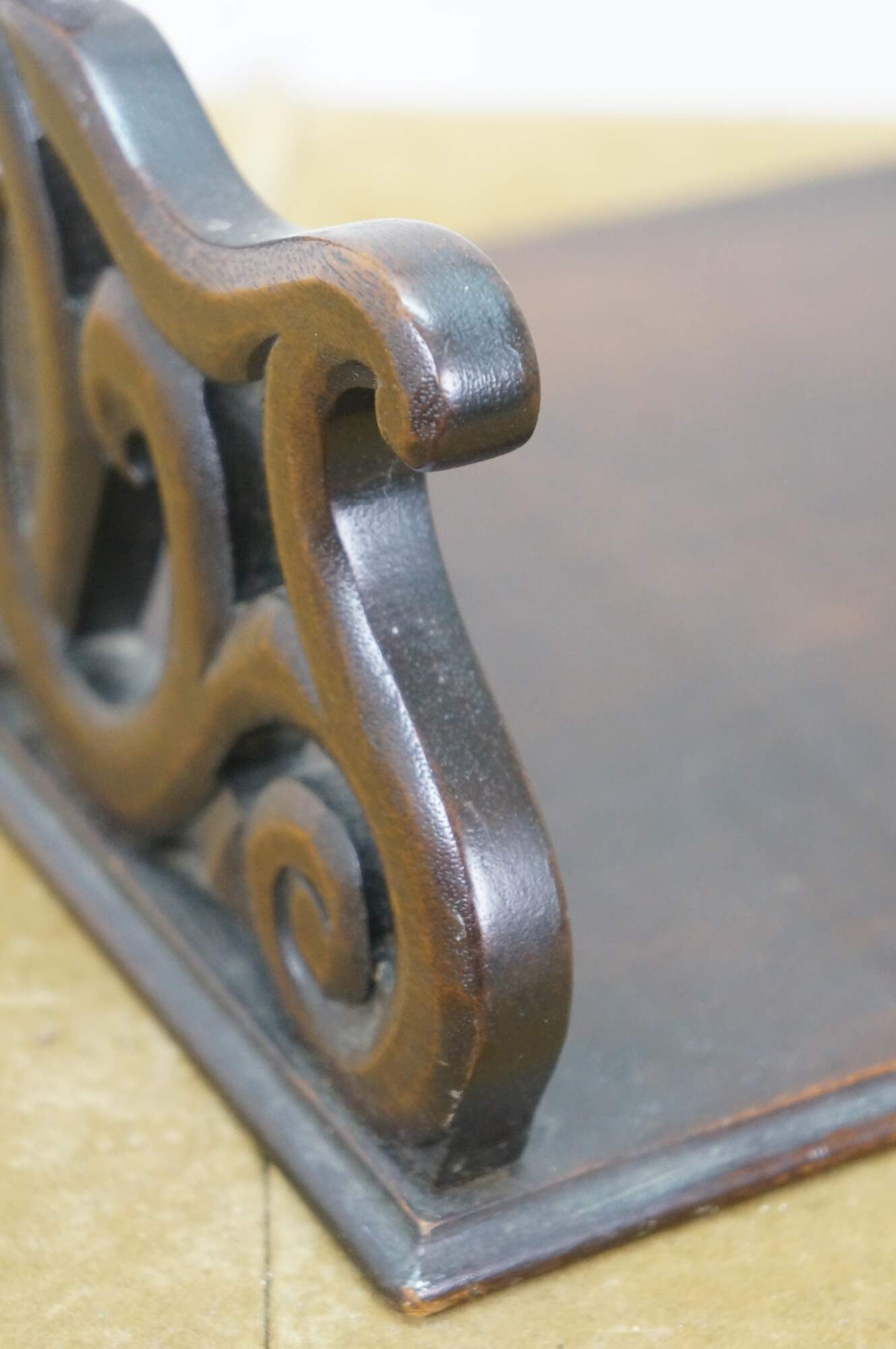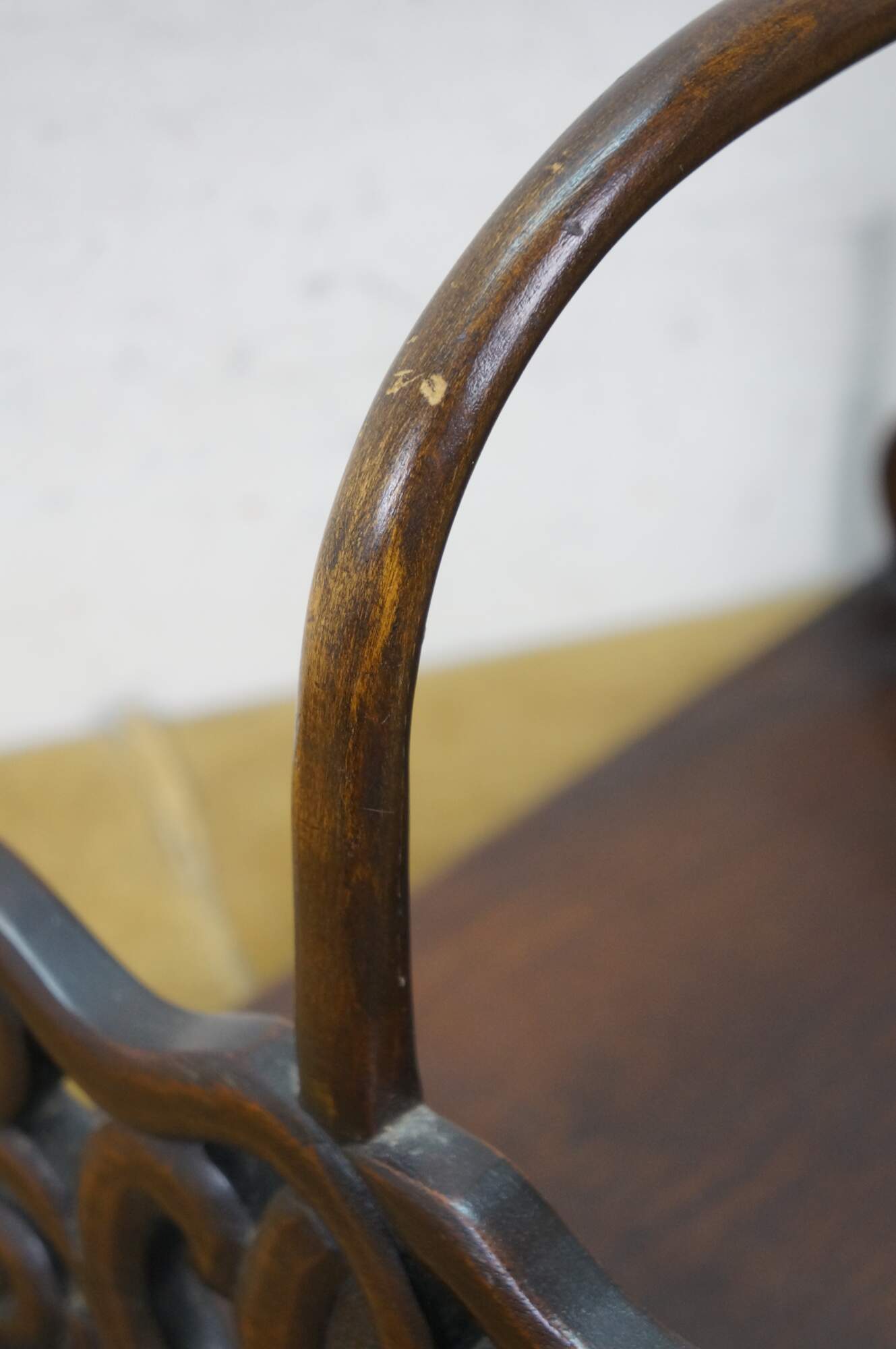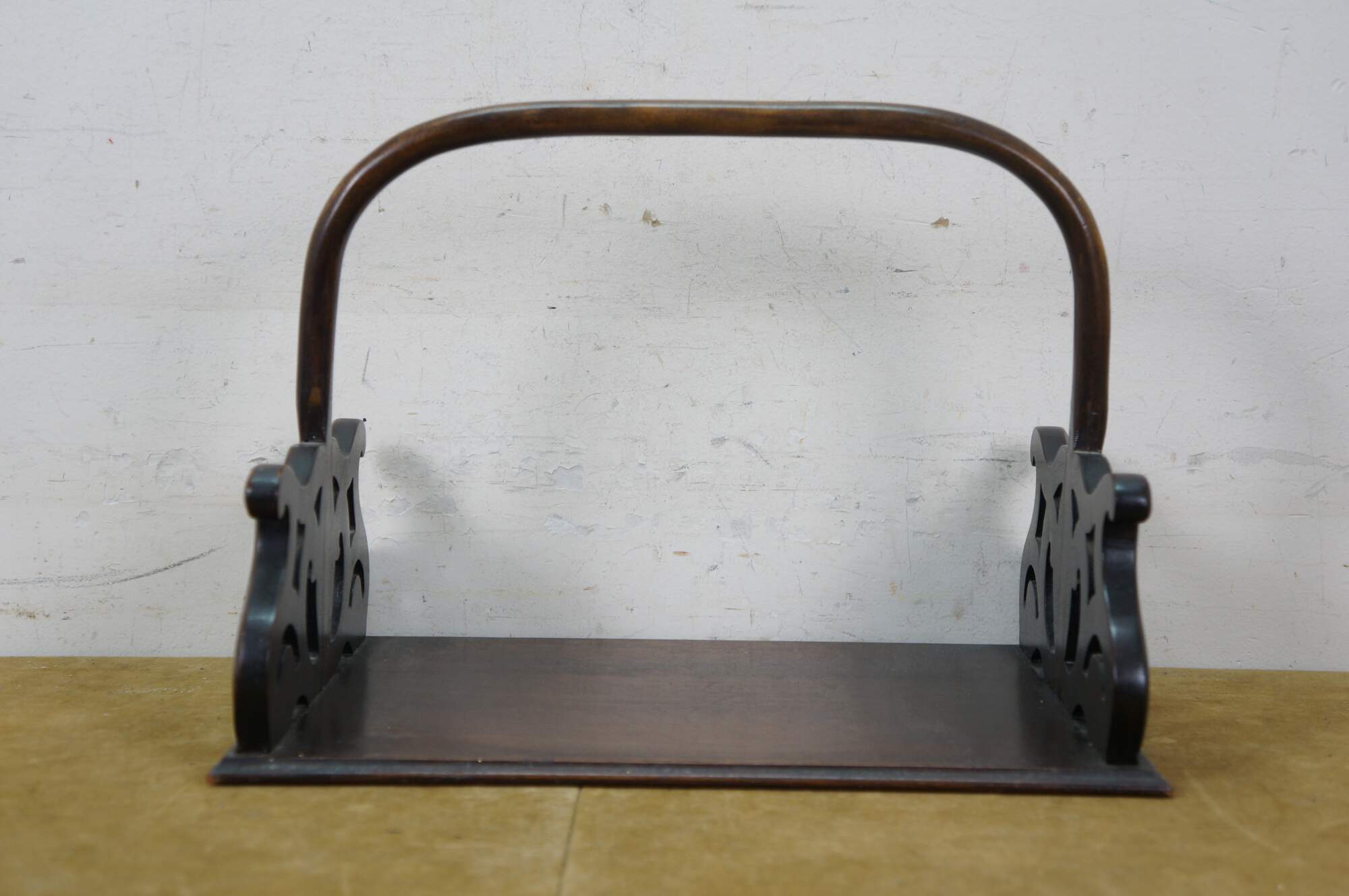 Late 20th century mahogany book rack / library tray / magazine holder. Rectangular base with pierced scrollwork ends joined with a fixed bentwood handle.