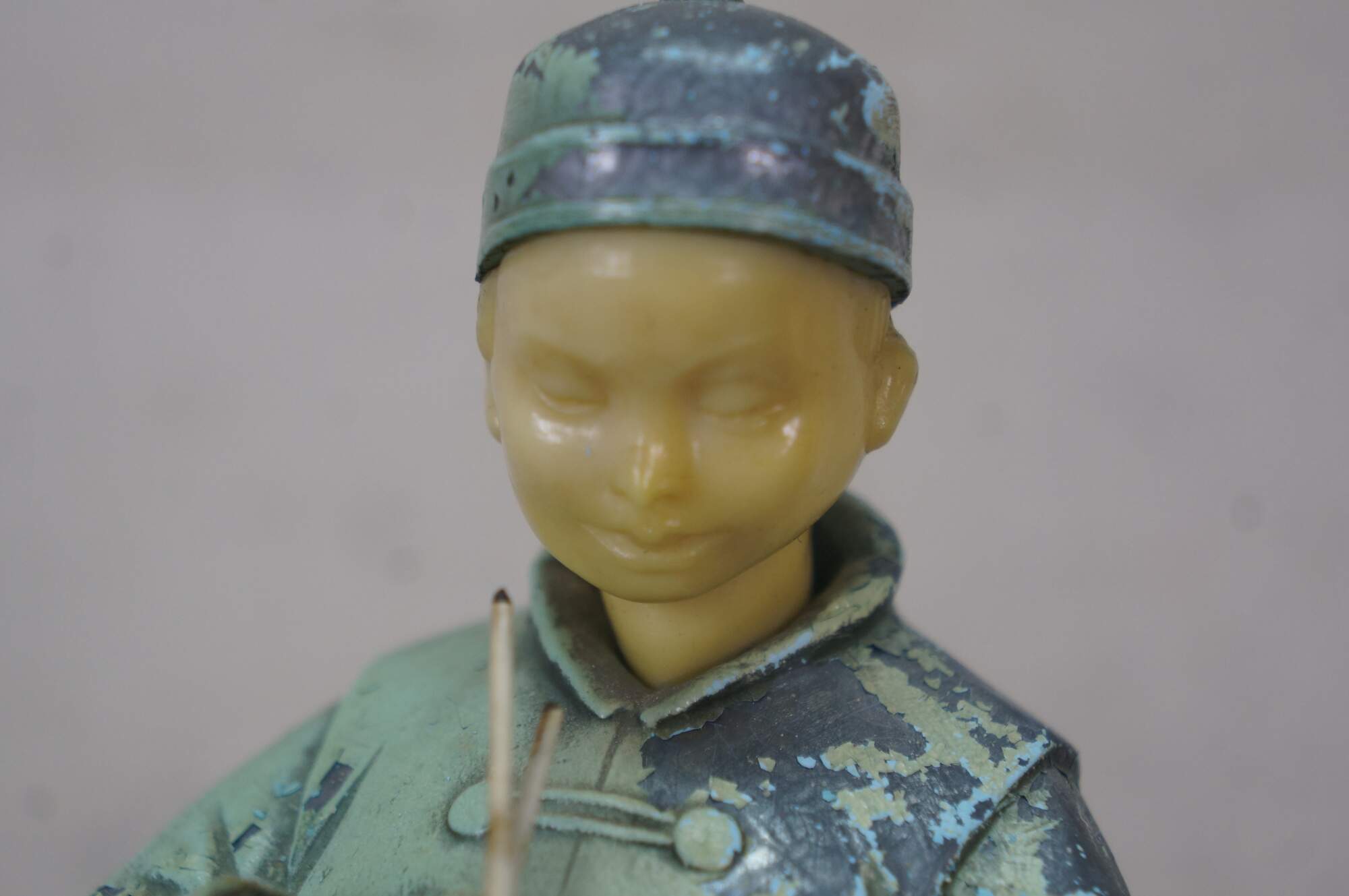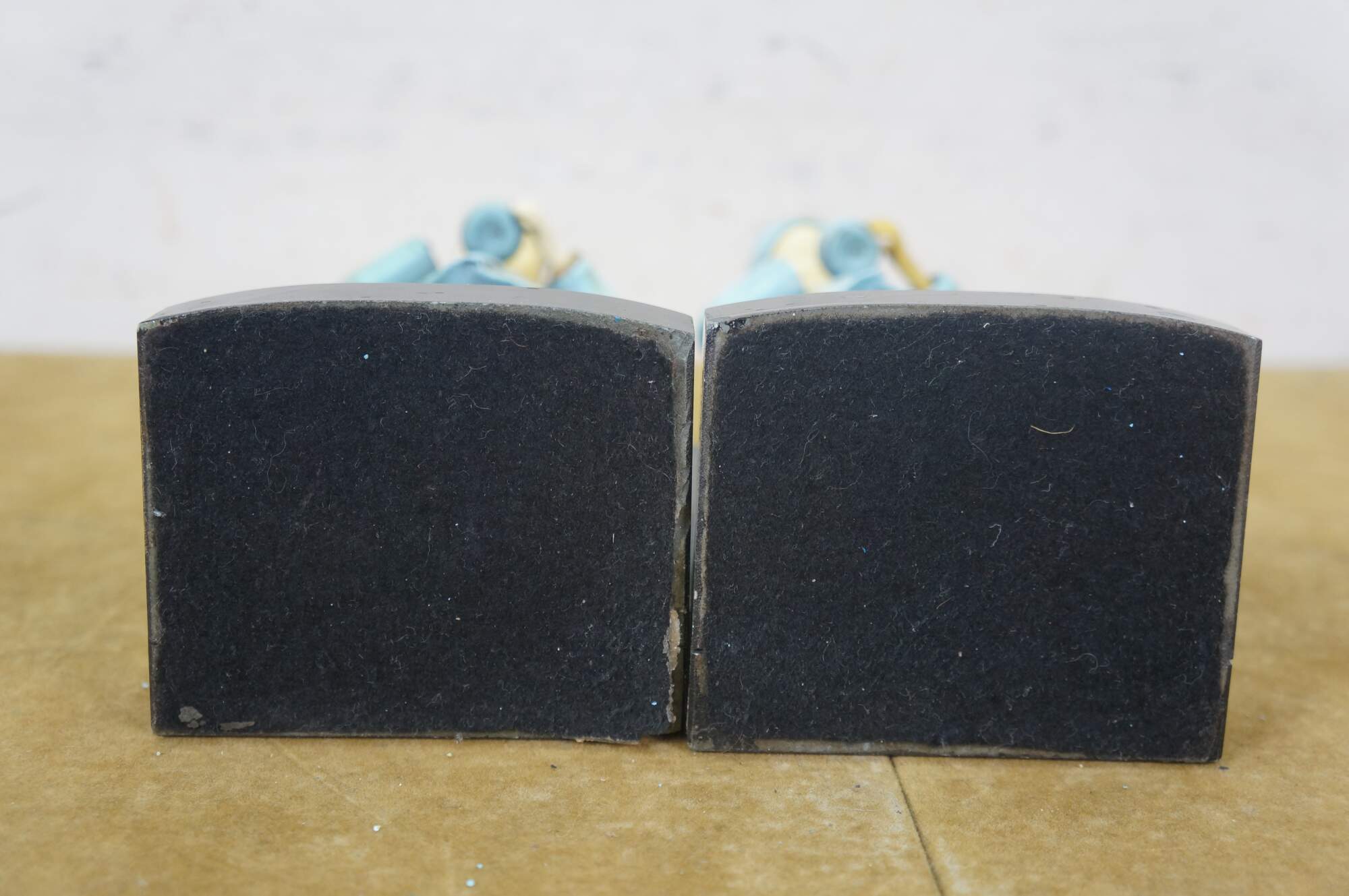 Early 20th century, circa 1930's, pair of cold painted spelter bronze figural bookends attributed to J.B. Hirch. Metal figurines with plastic/celluloid hands and heads, in the shape of men in light blue-teal painted Chinese clothing, holding a bowls with chopsticks. Mounted on L-shaped plinths of black marble.