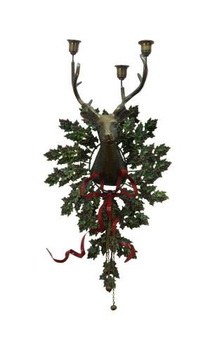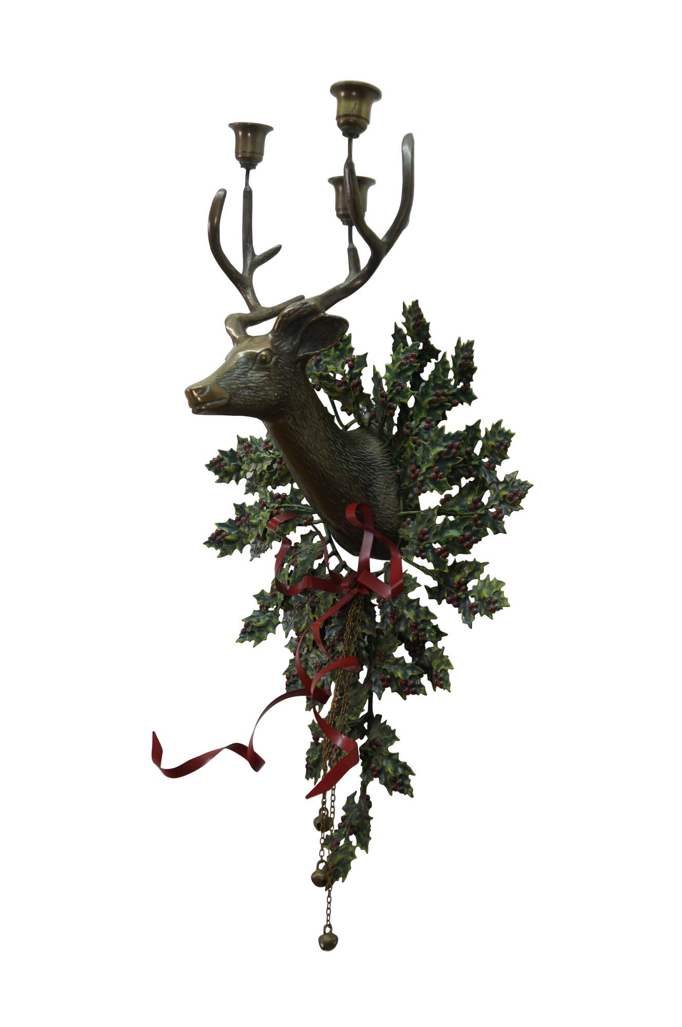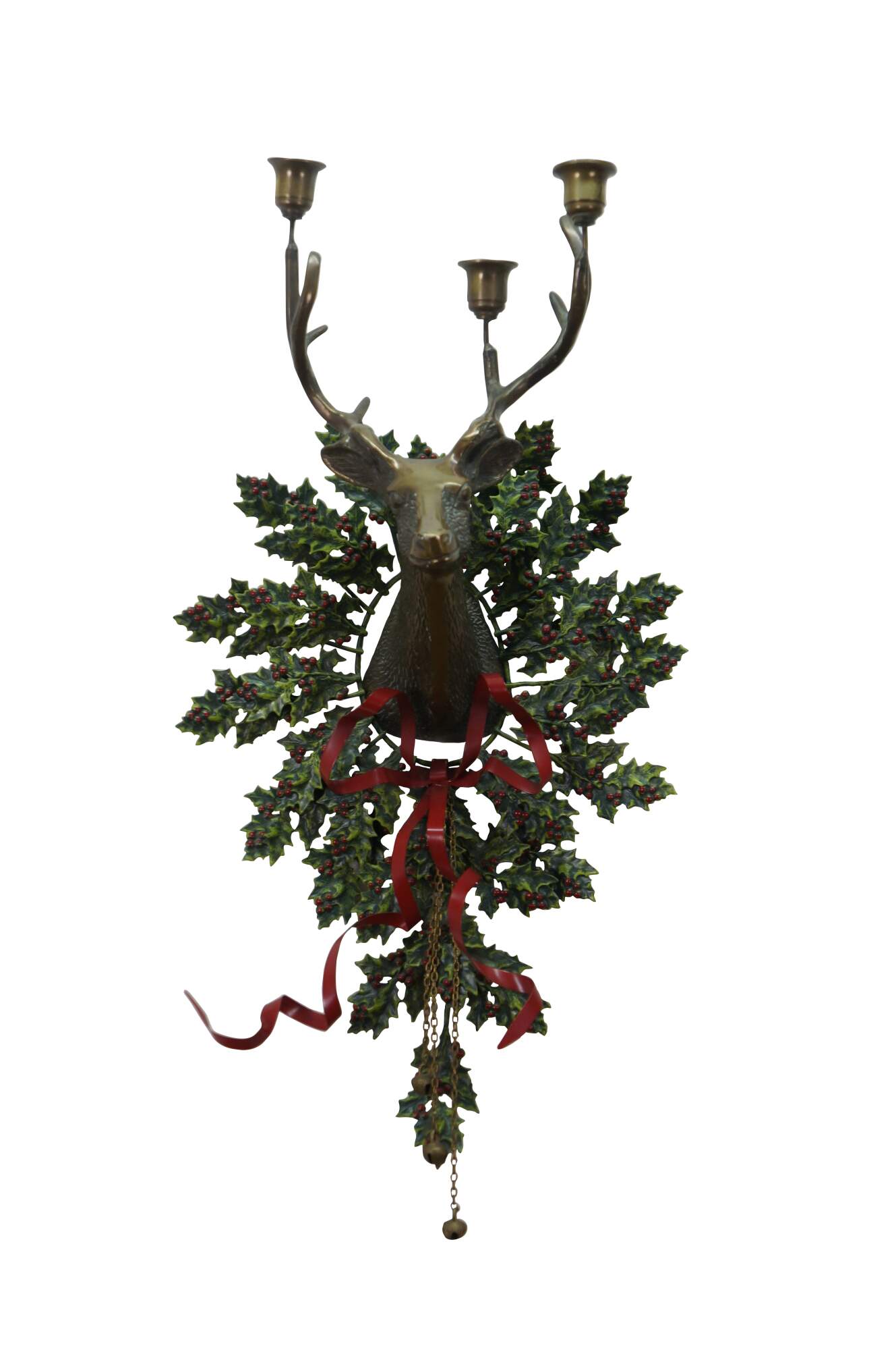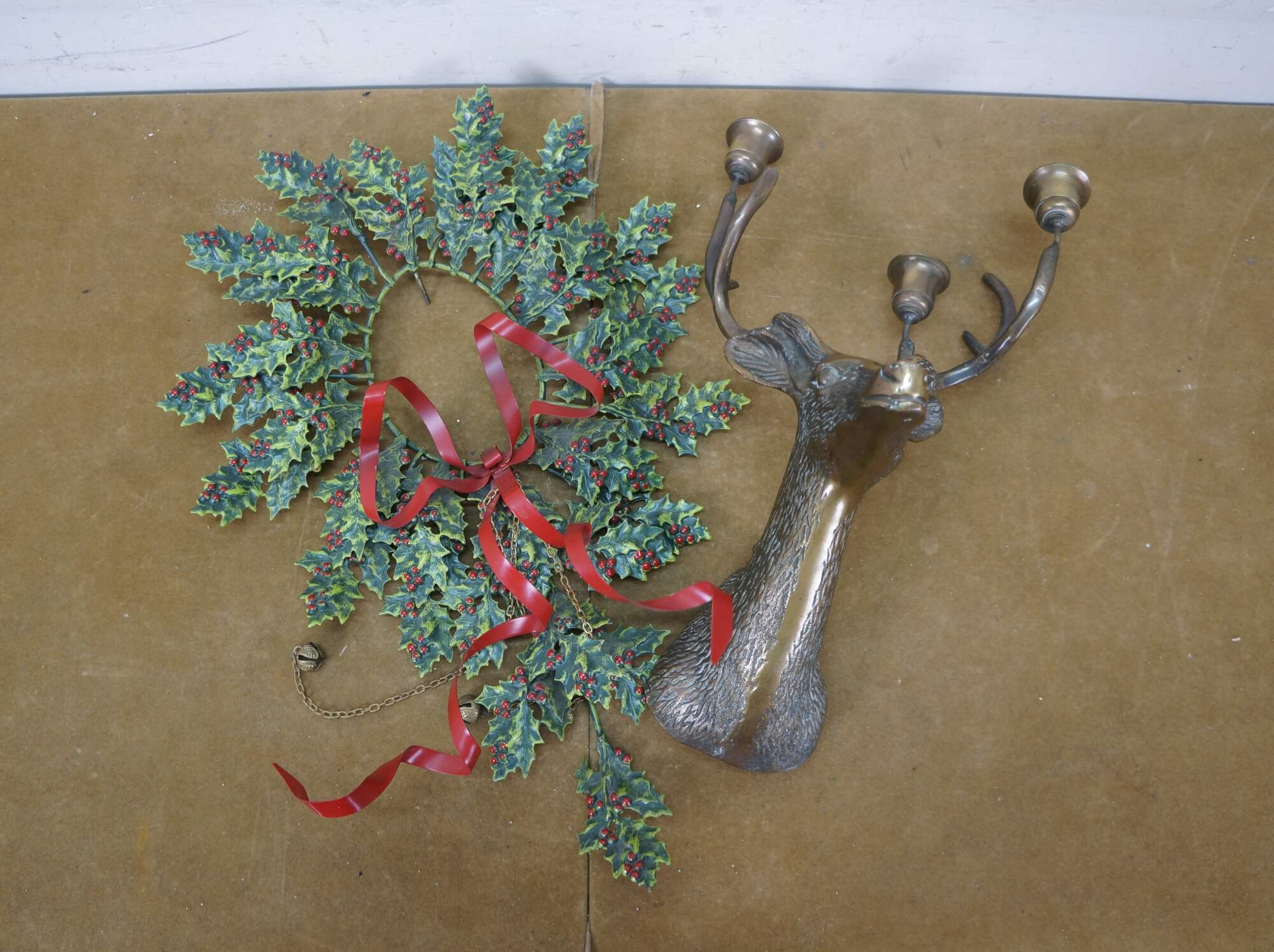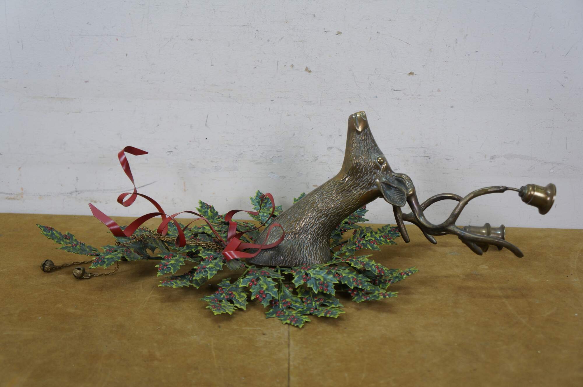 Circa mid 20th century brass stag / deer / reindeer wall hanging three light taper candle holder / candelabra with removable painted holly leaf wreath, accented with a red metal ribbon and three hanging bells.