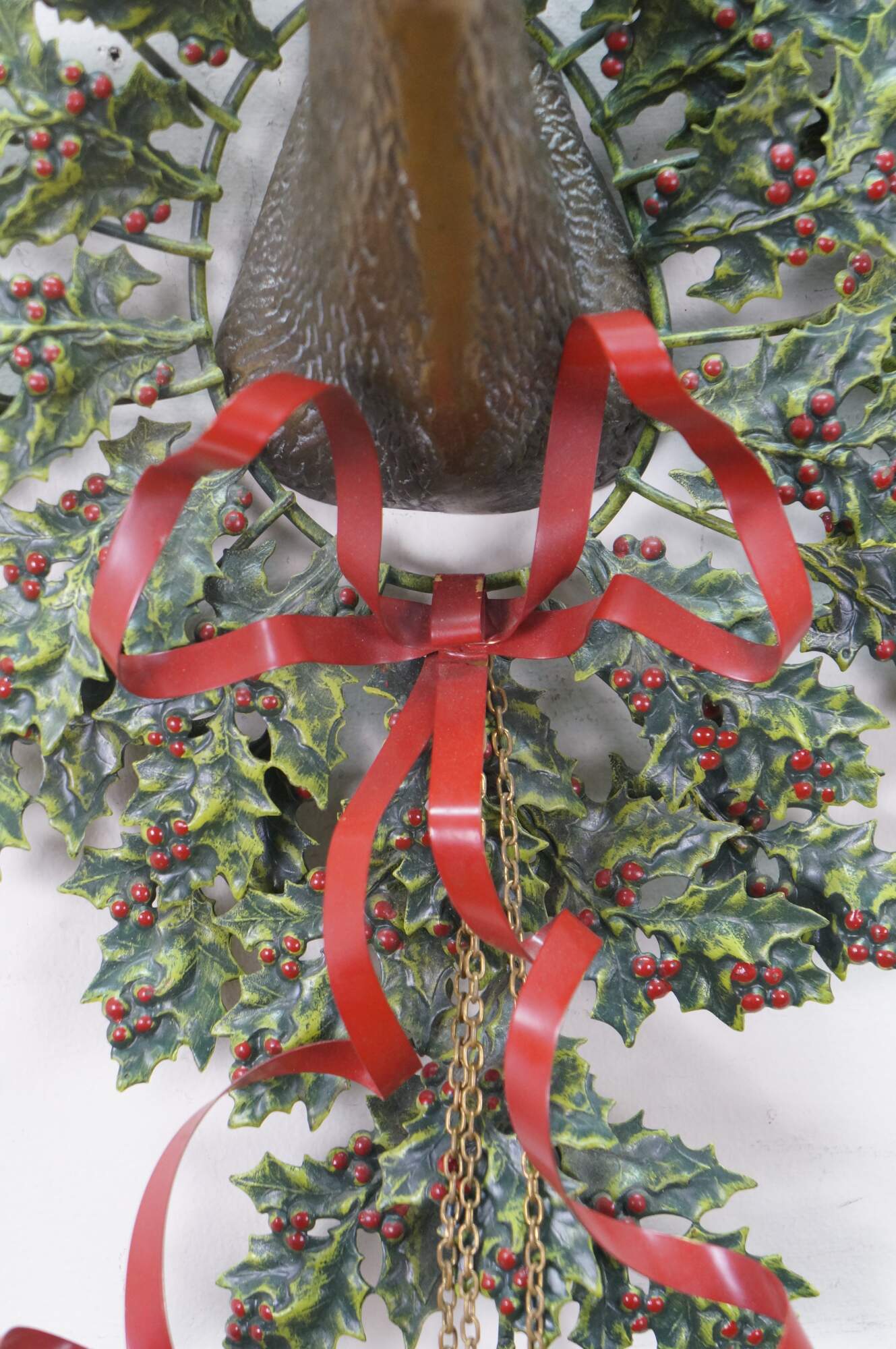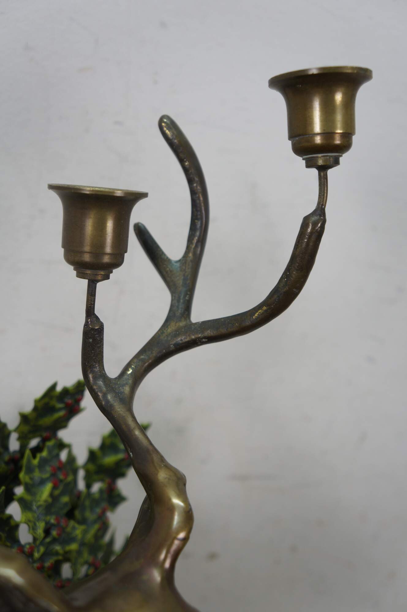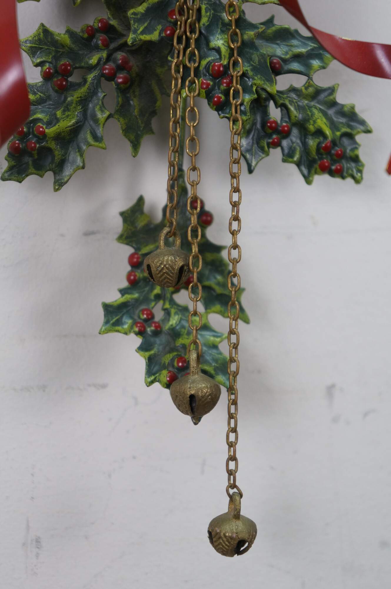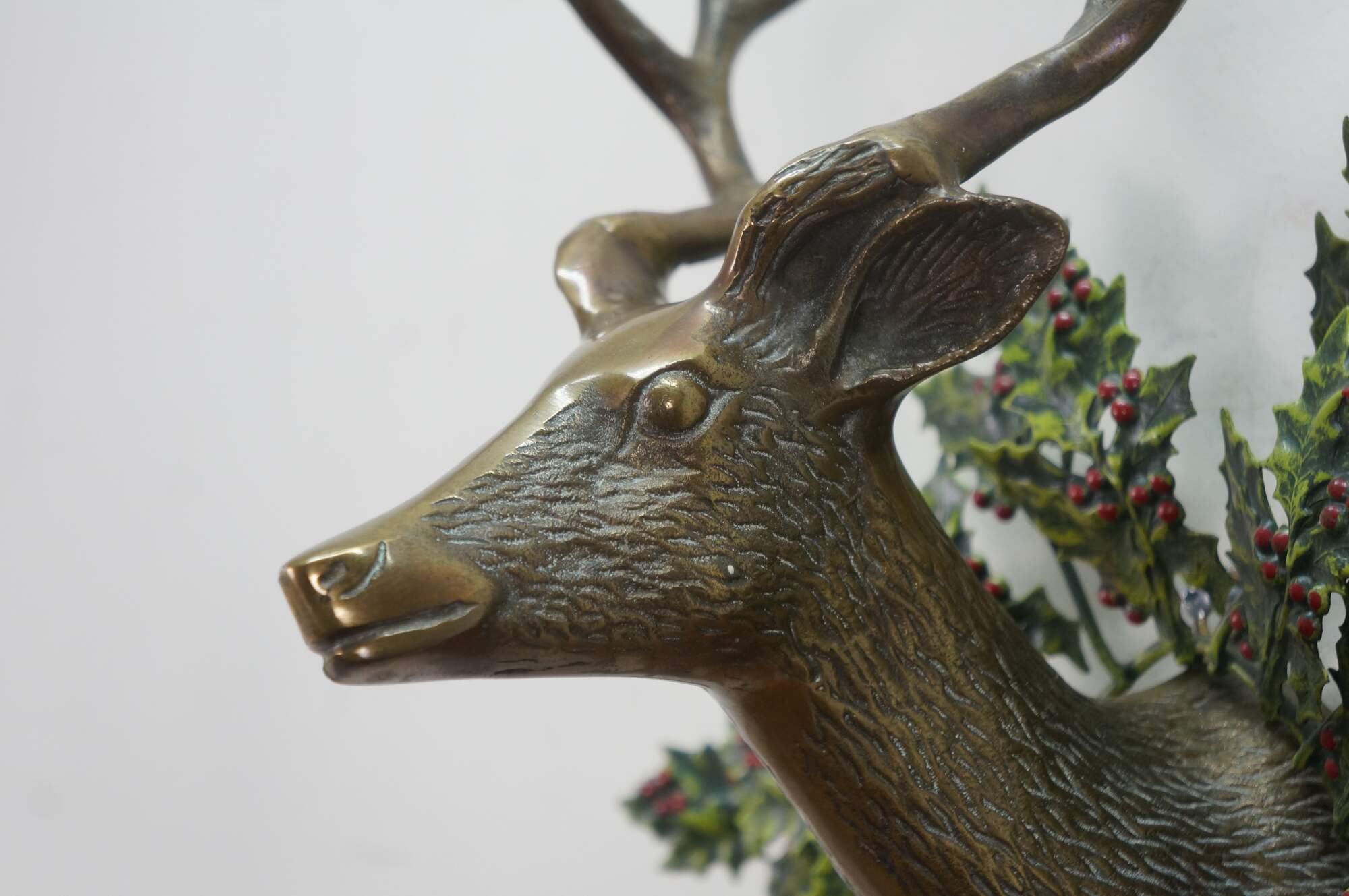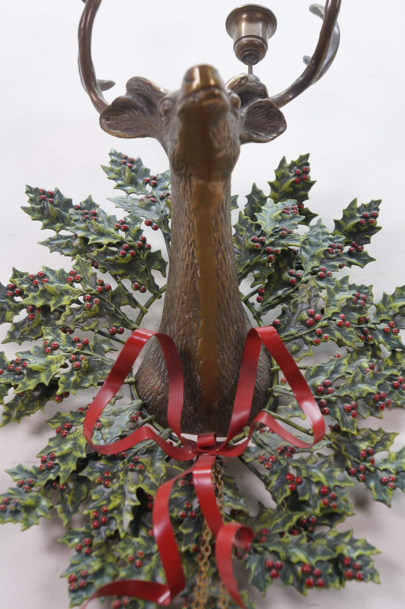 Circa mid 20th century brass stag / deer / reindeer wall hanging three light taper candle holder / candelabra with removable painted holly leaf wreath, accented with a red metal ribbon and three hanging bells.