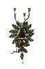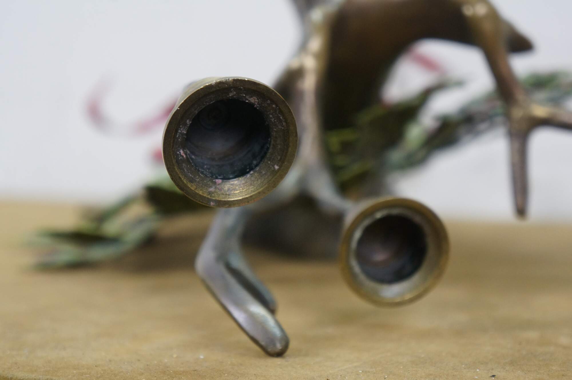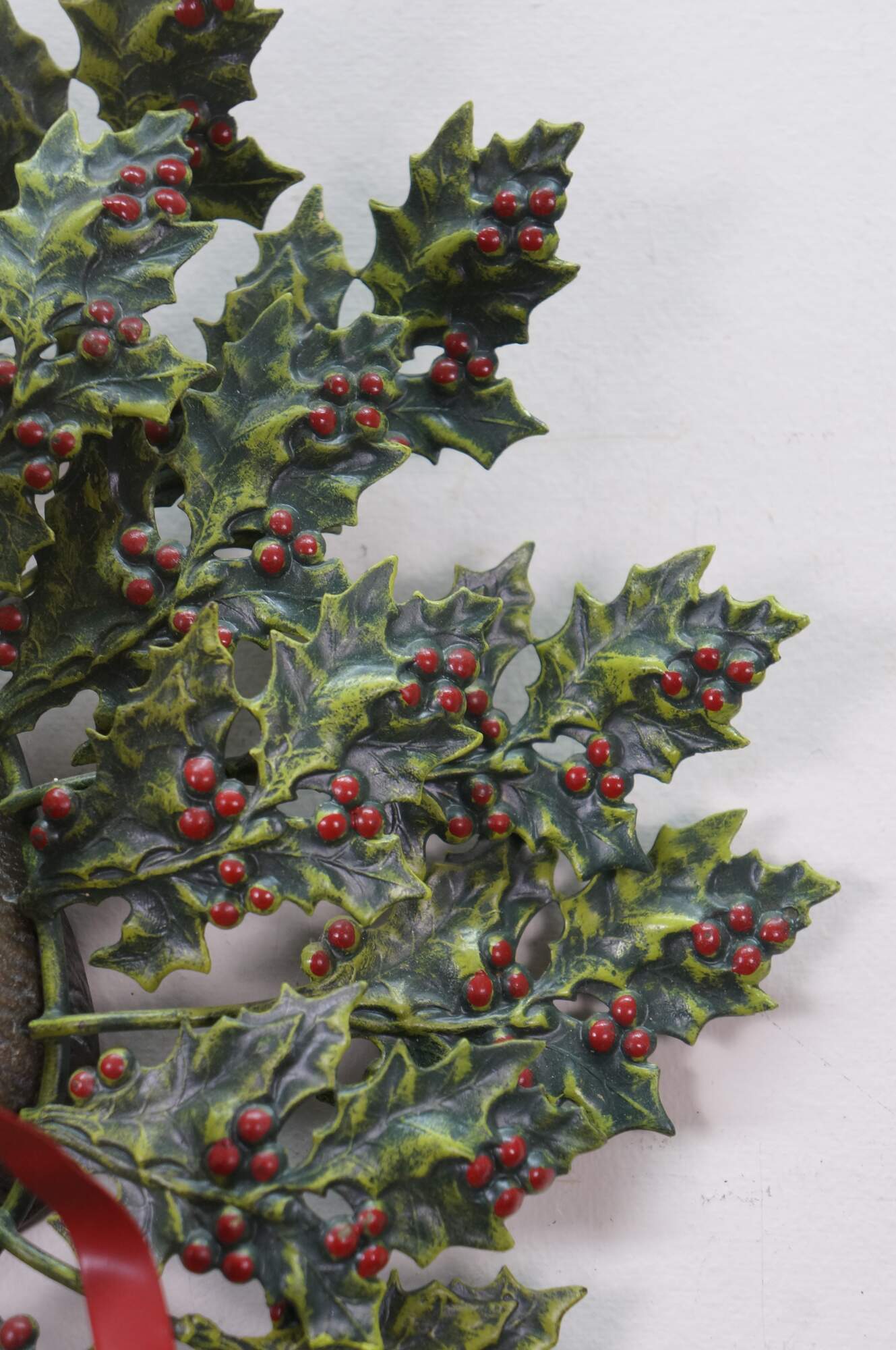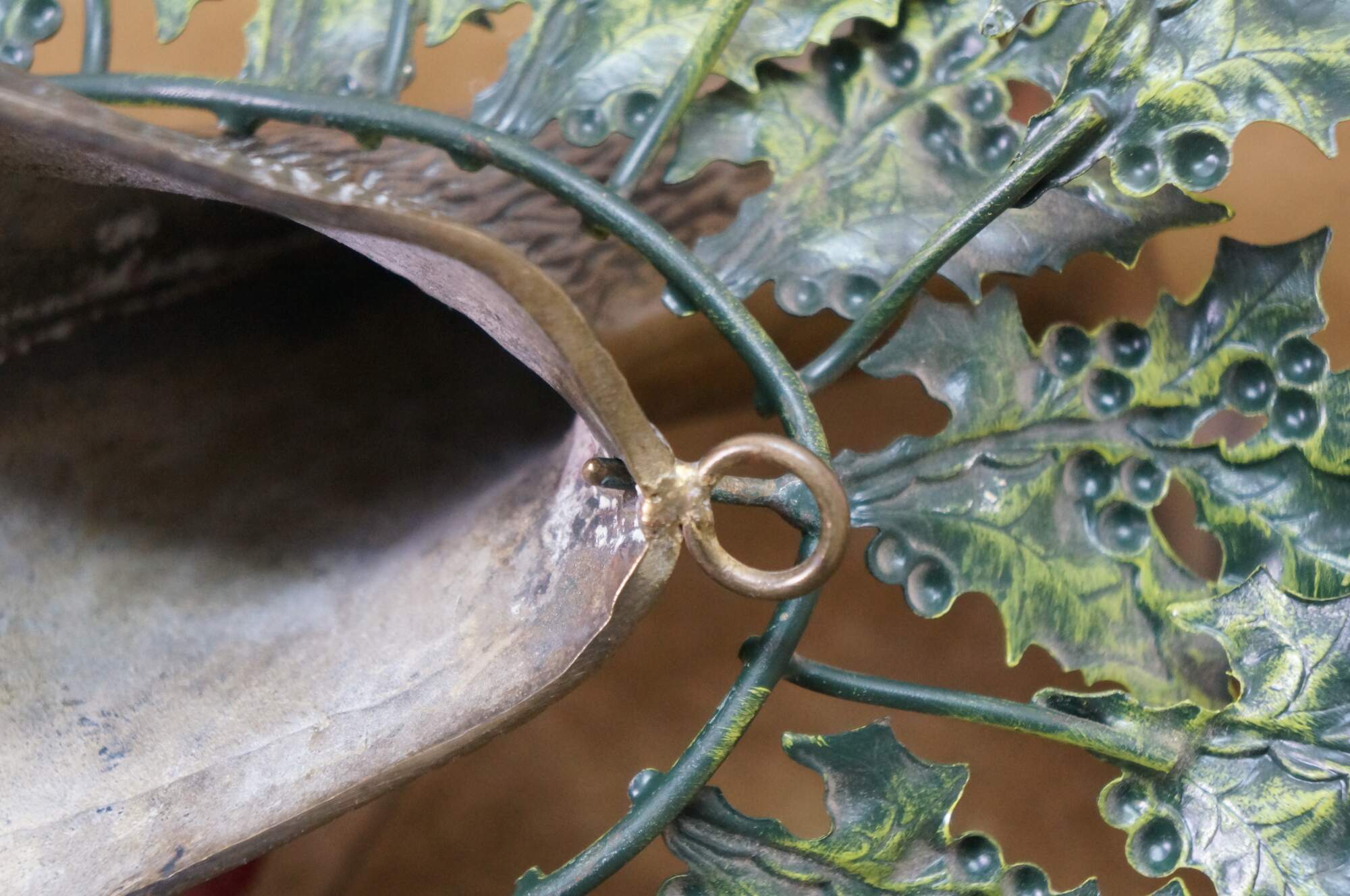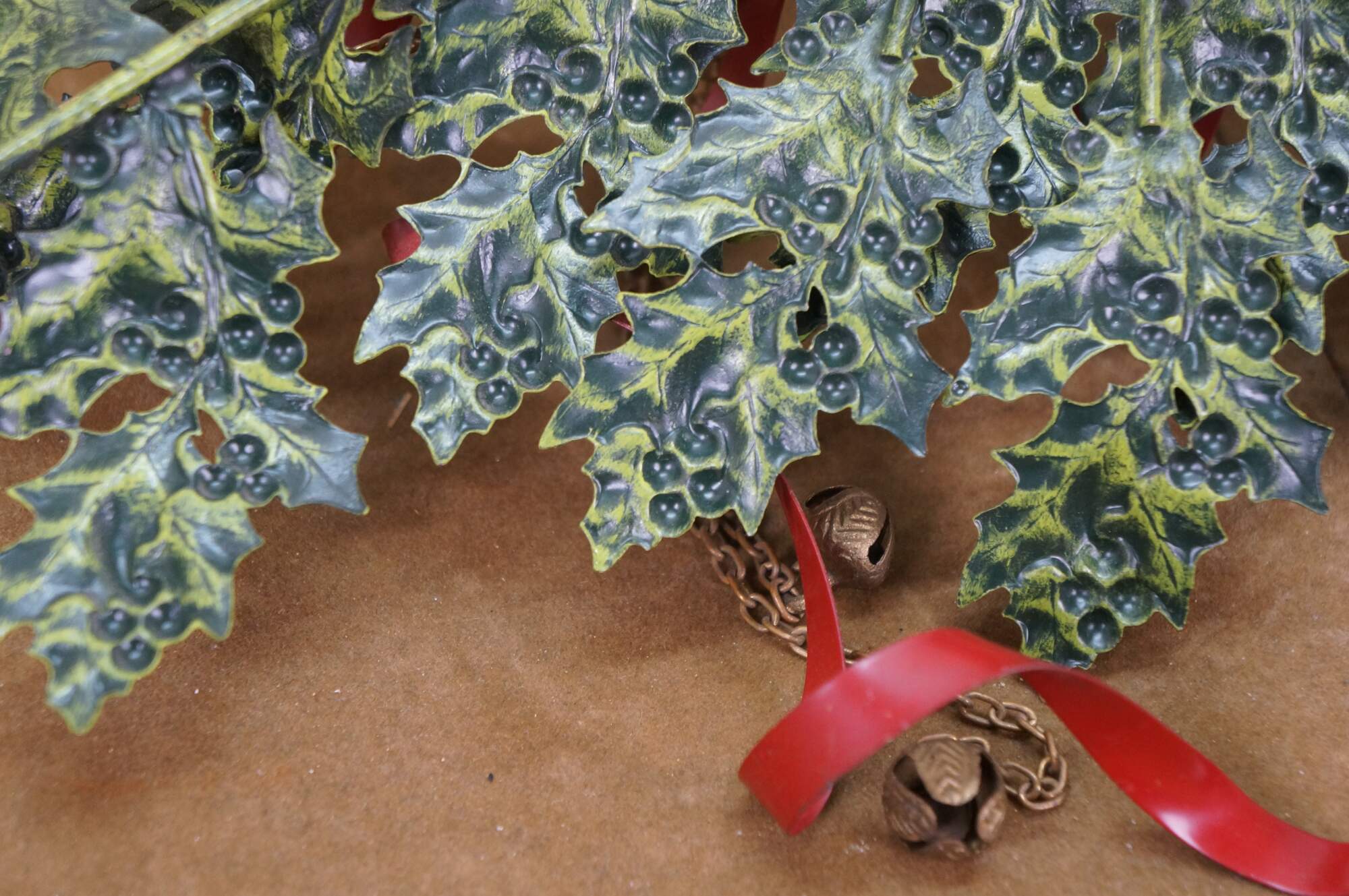 Circa mid 20th century brass stag / deer / reindeer wall hanging three light taper candle holder / candelabra with removable painted holly leaf wreath, accented with a red metal ribbon and three hanging bells.