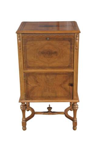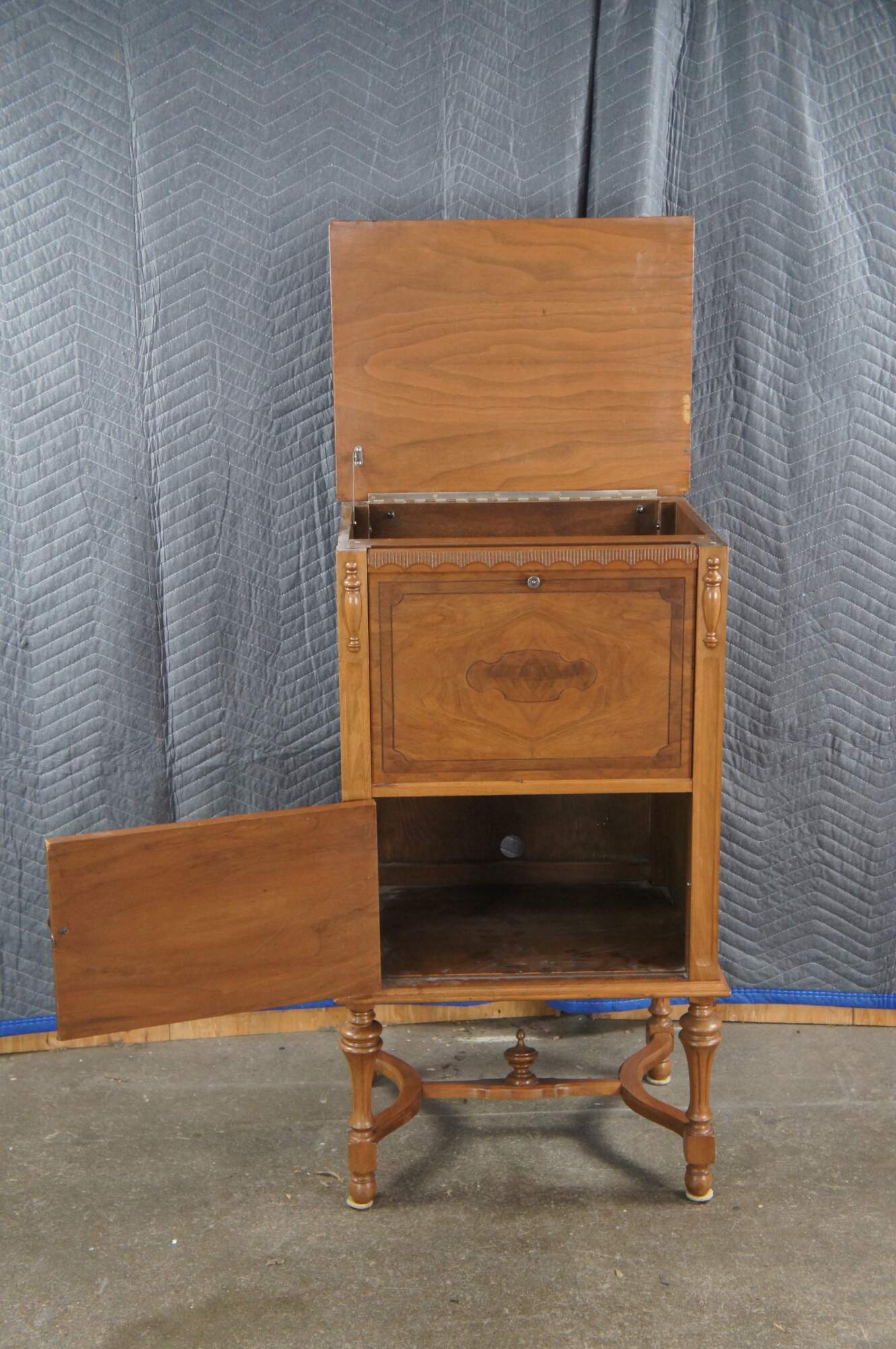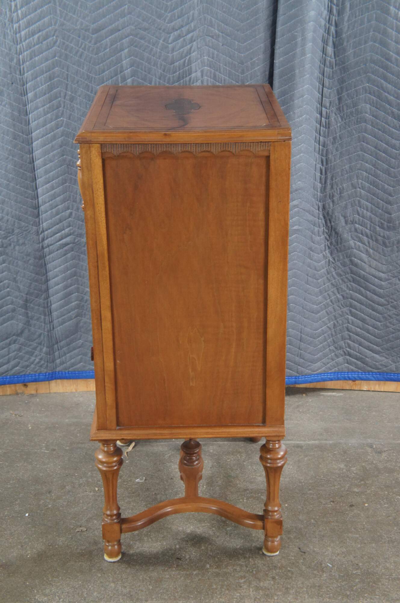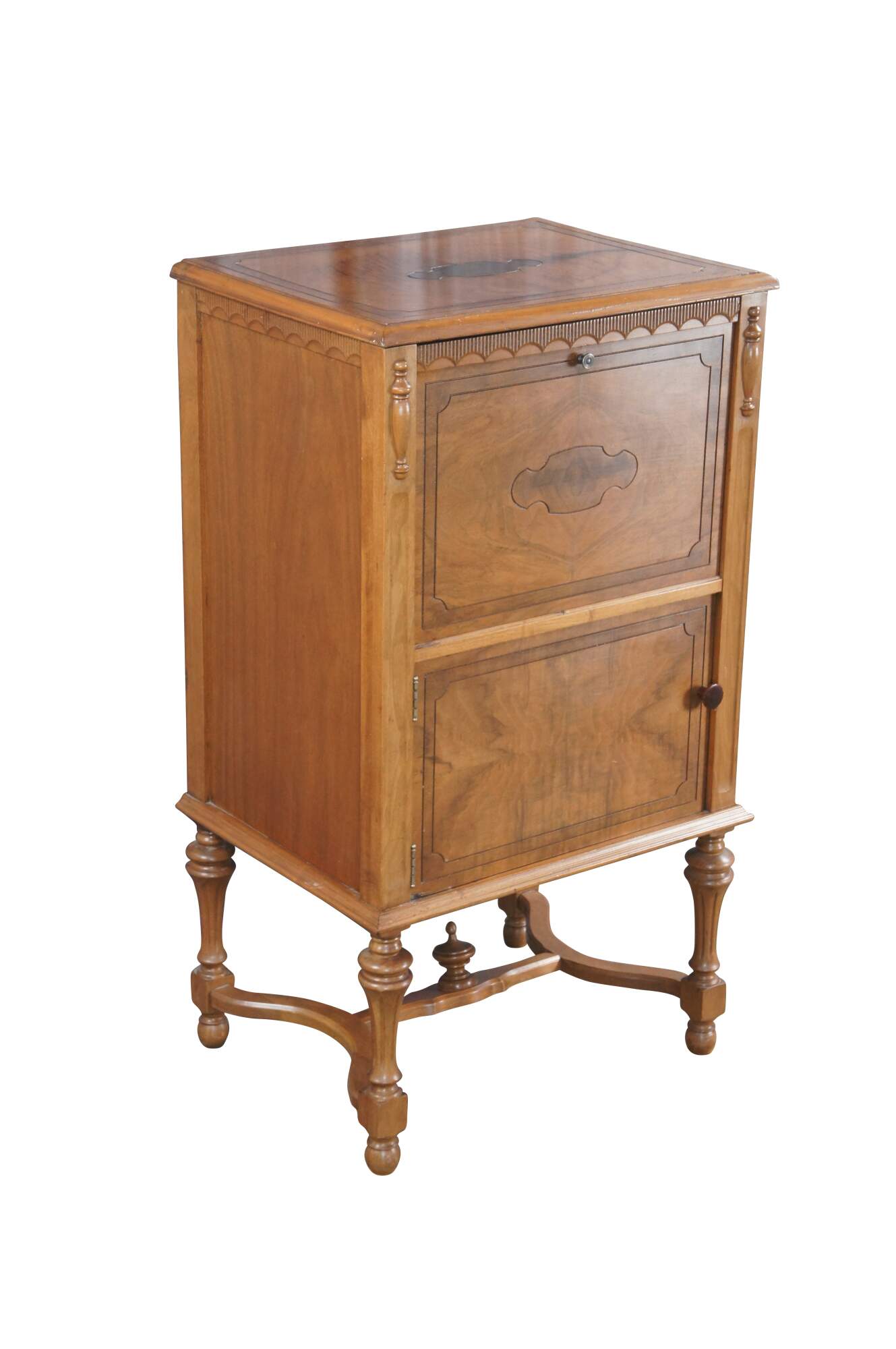 A beautiful early 20th Century Phonograph Console Cabinet. Made from walnut with matchbook burled front panels. The lid opens up to a fretwork carved front trim and a drop front where the speaker would have been The bottom cabinet opens for record stroage. The console is features a fluted and arcaded molding along the top and applied spindles along the front. The cabinet is supported by turned fluted and tapered legs connected by a trestle base with a finial. Ready for use with a modern record player and speaker swap.