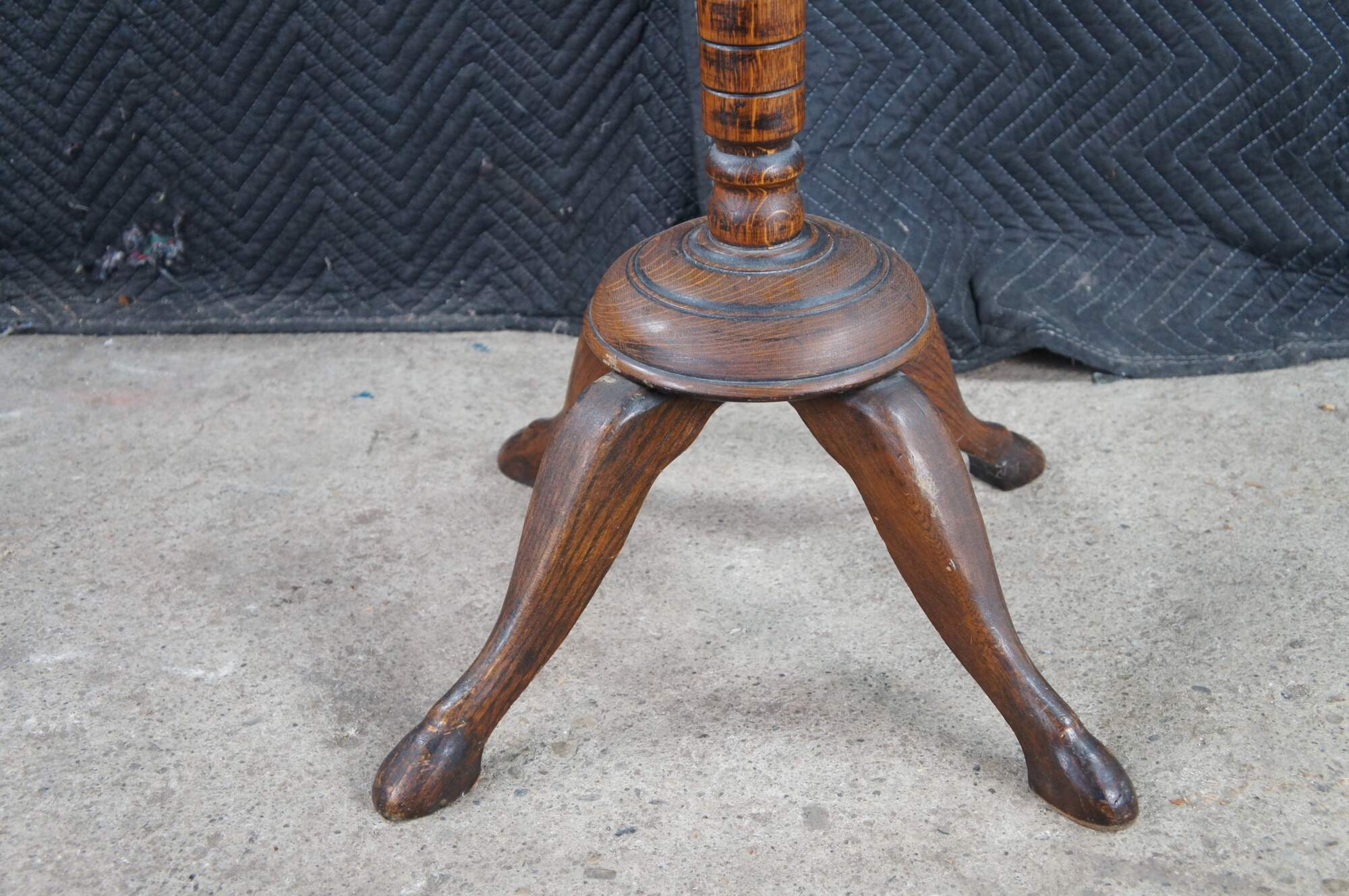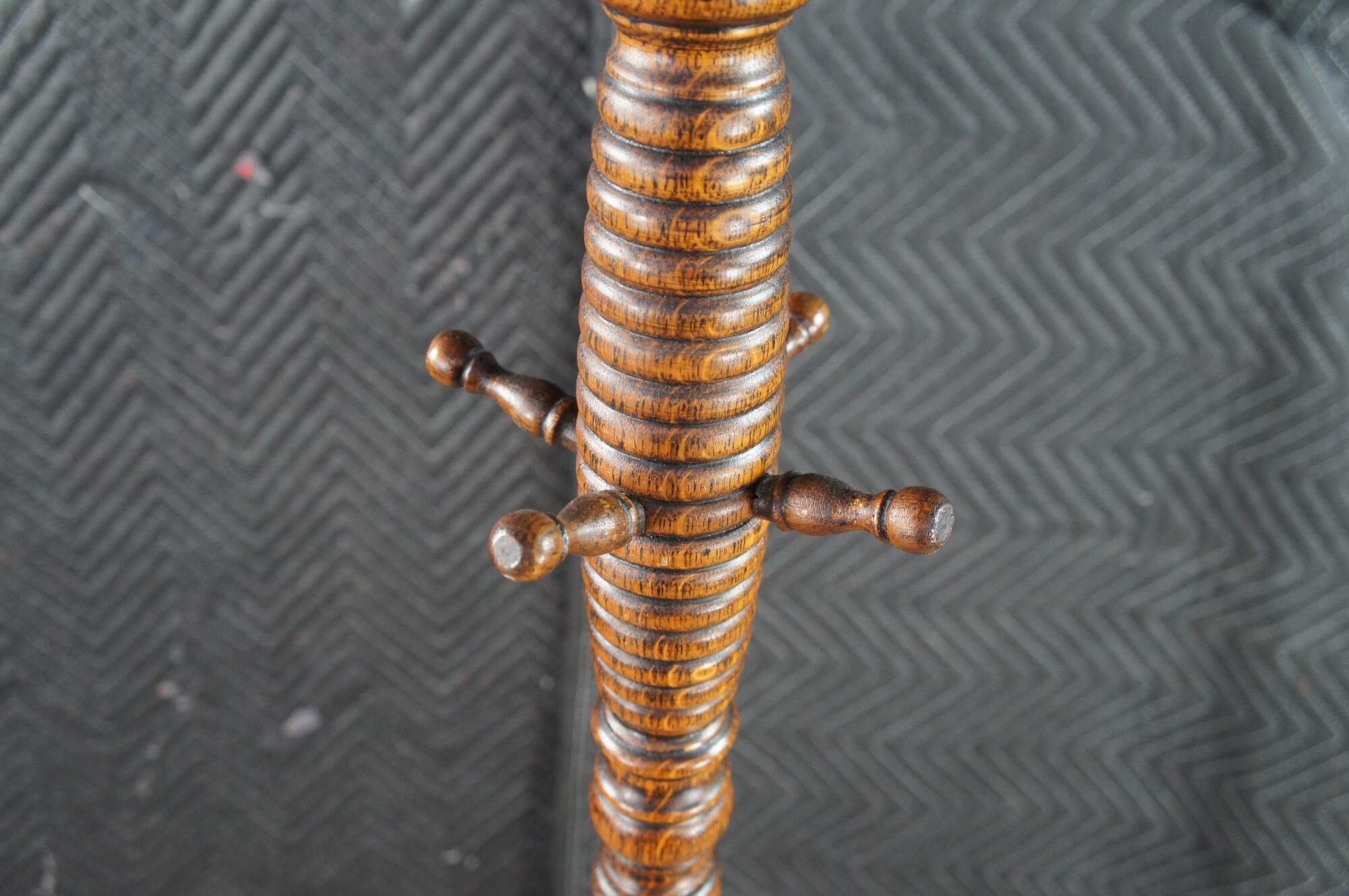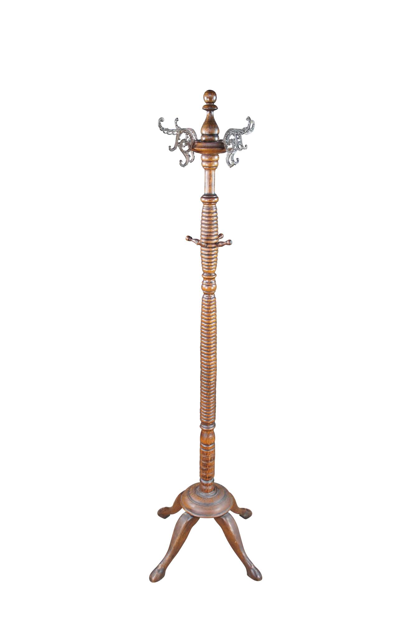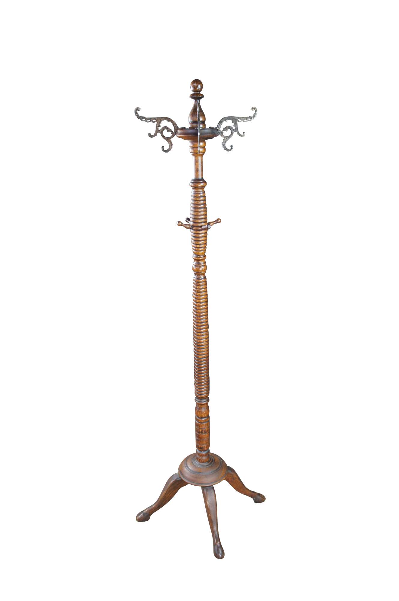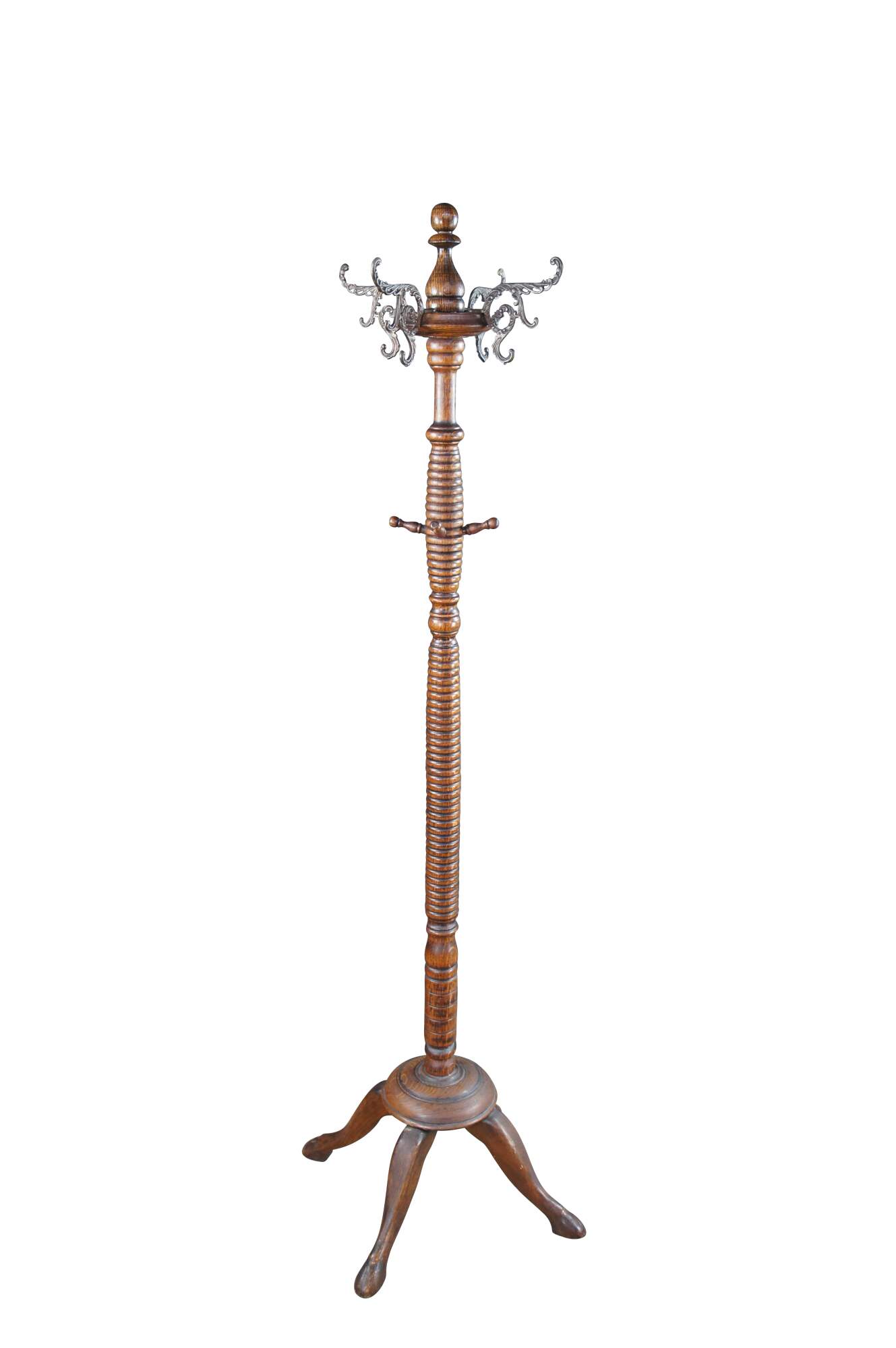 Antique Victorian coat rack / hall tree featuring pierced scrollwork hangers and a long turned ribbed post supported by four splay hoof style feet.