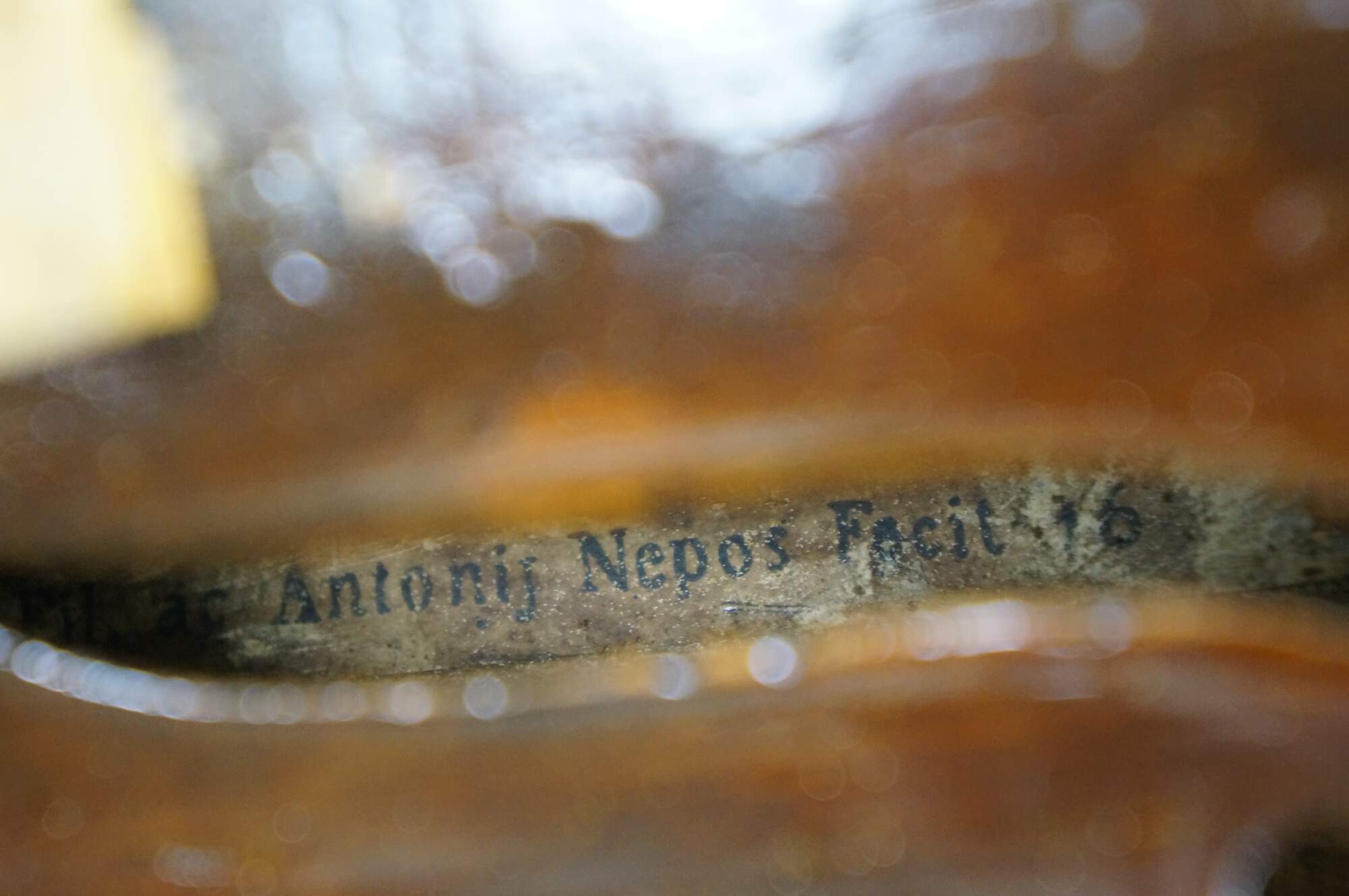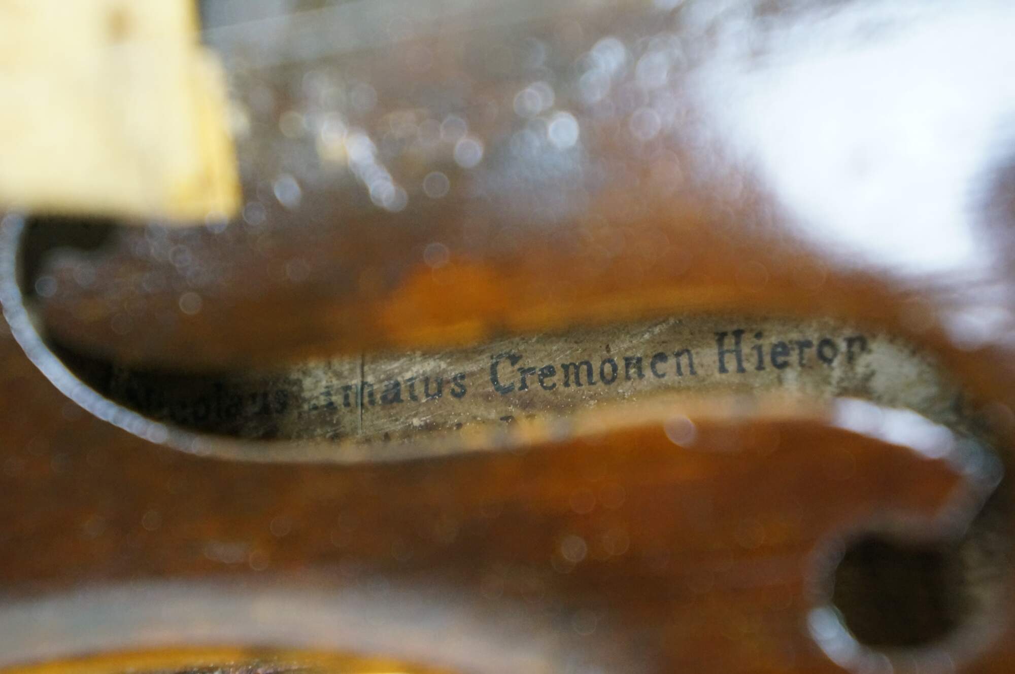 Antique Nicolaus Amatus Cremonen Hieronymi violin. Label reads: Nicolaus Amatus Cremonen Hieronymi / xxx Antonij Nepos Fecit 16xx. C.F. Albert chin rest - Pat'd Feb 23, 1875. John Juzek bridge. Repaired and Adjusted by the Dayton String Instrument Co, Dayton, Ohio, 1938. Includes one bow and hard sided case; no key. Made of maple.