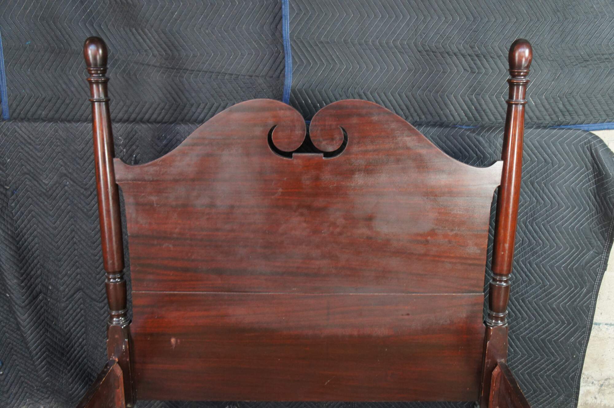 Antique Sheraton style mahogany full-size four-poster bed. Made from mahogany with an open pediment headboard featuring turned and fluted posts with trophy finials.