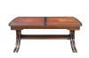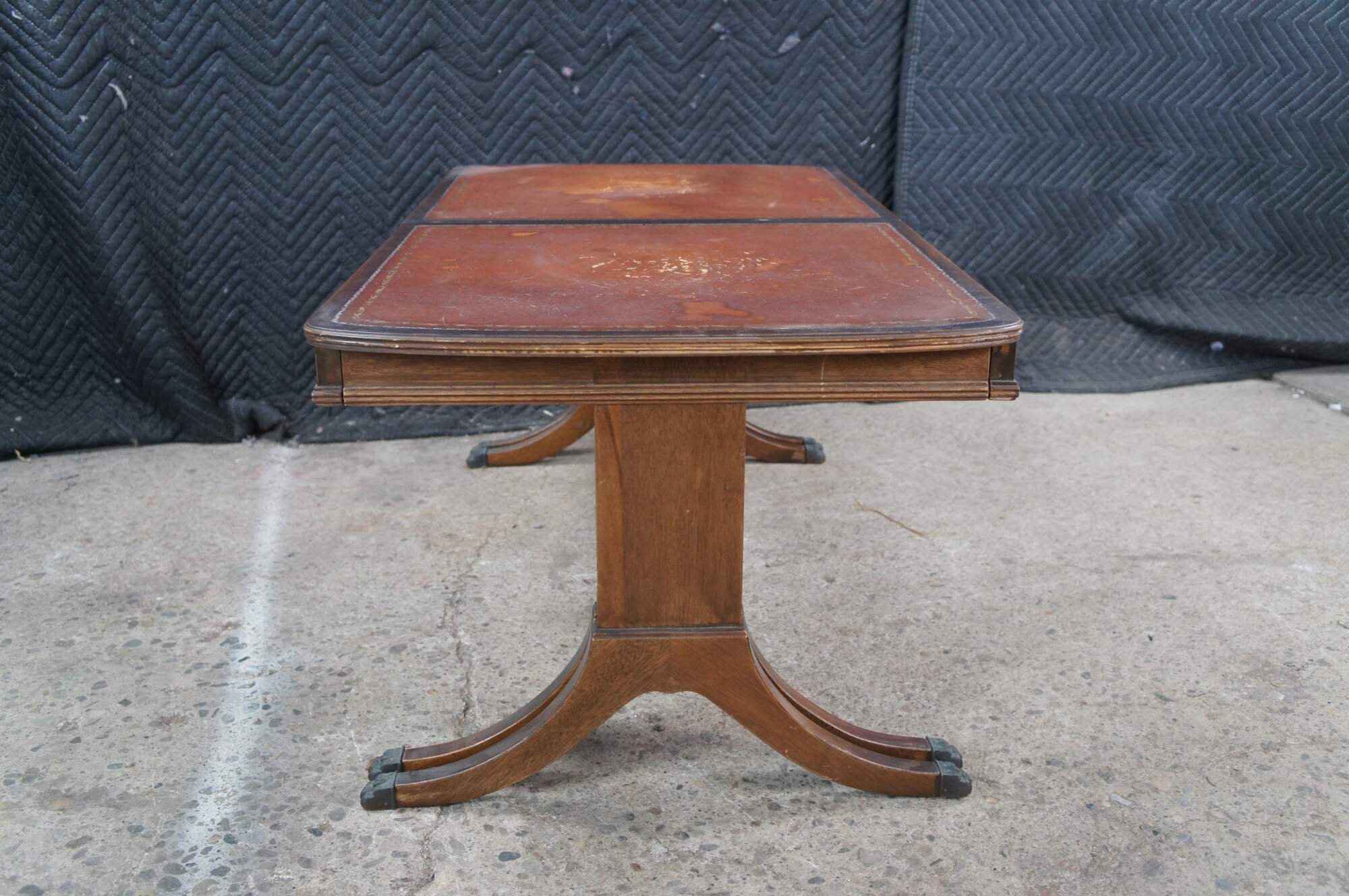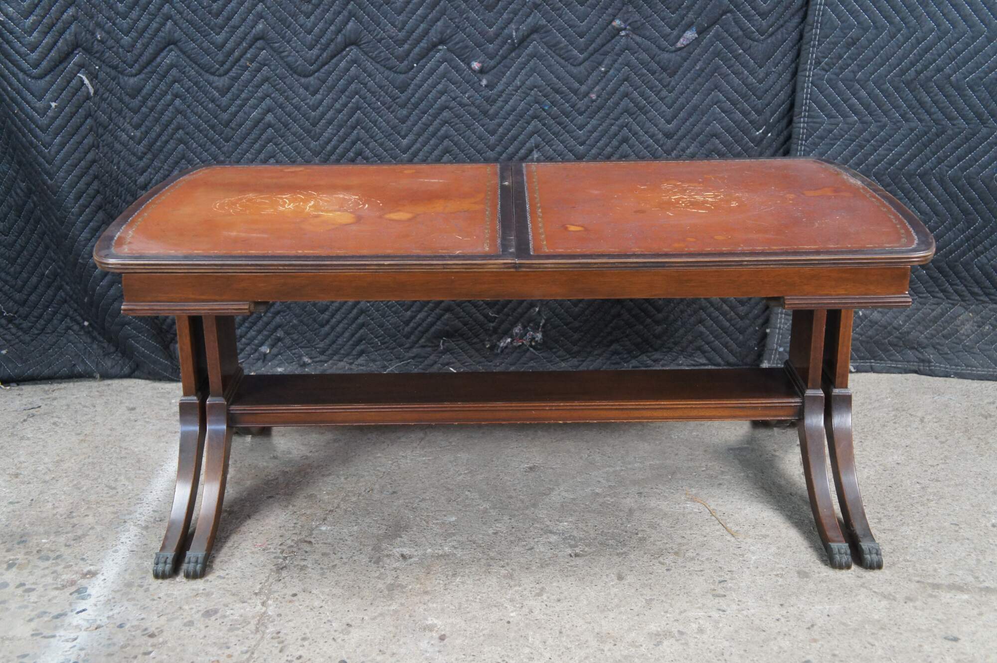 An intriguing mid 20th century Duncan Phyfe style extendable coffee table. Made from mahogany with a brown tooled leather top. The table has a 8 leg sliding base that opens from 40" to 64" to accomodate a 24" leaf. Attributed to Baker, Unmarked.
