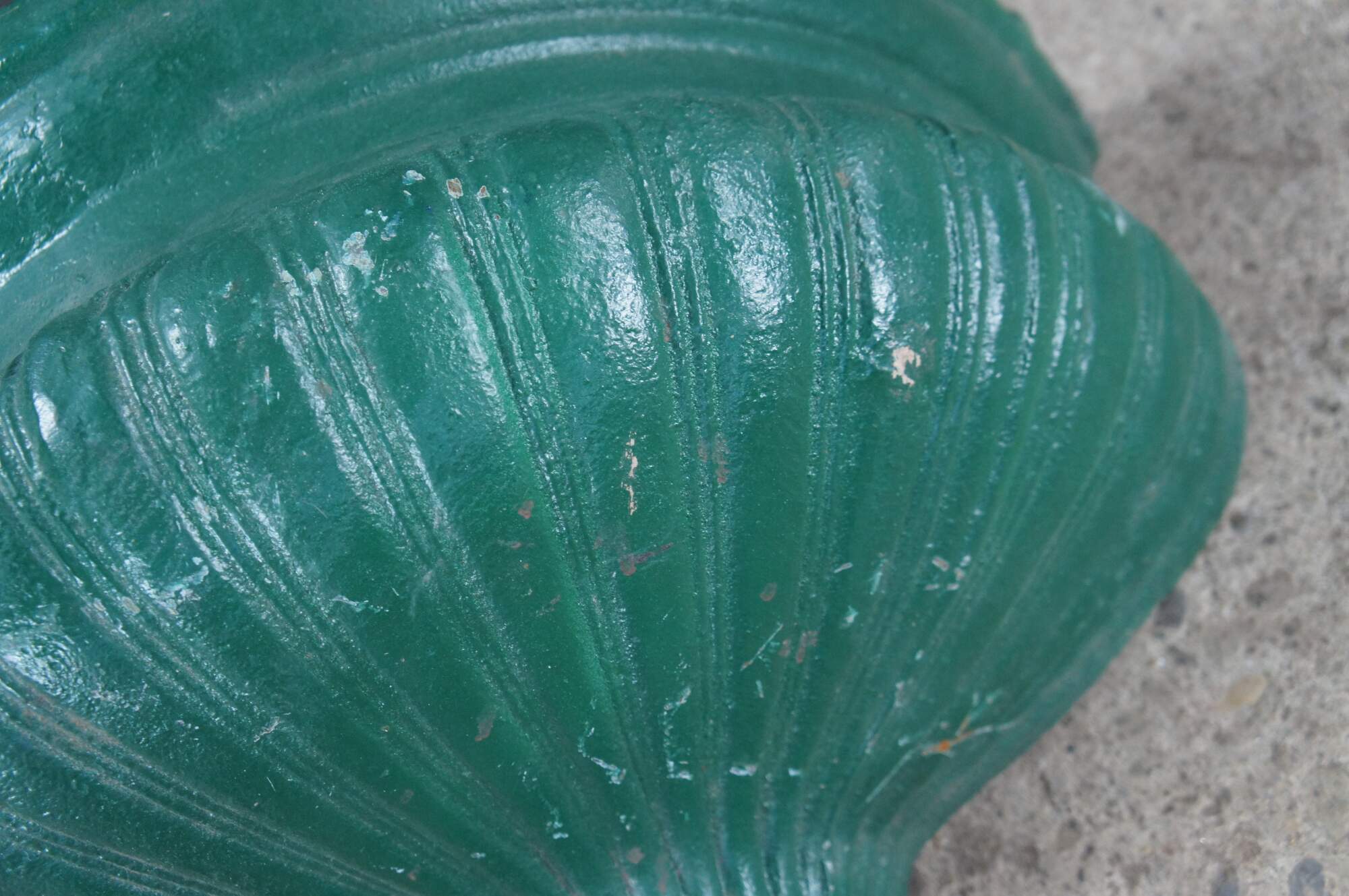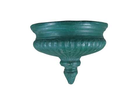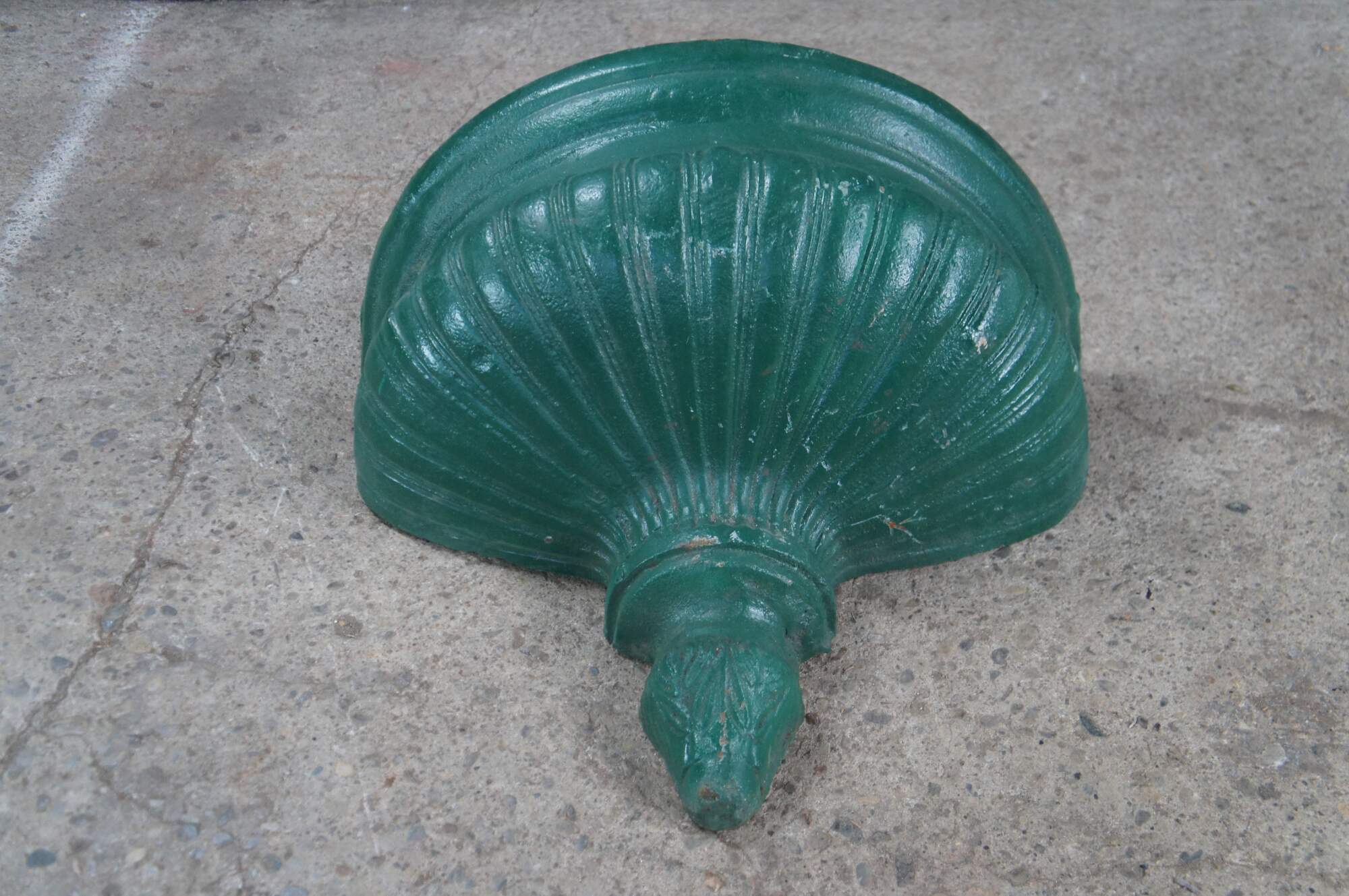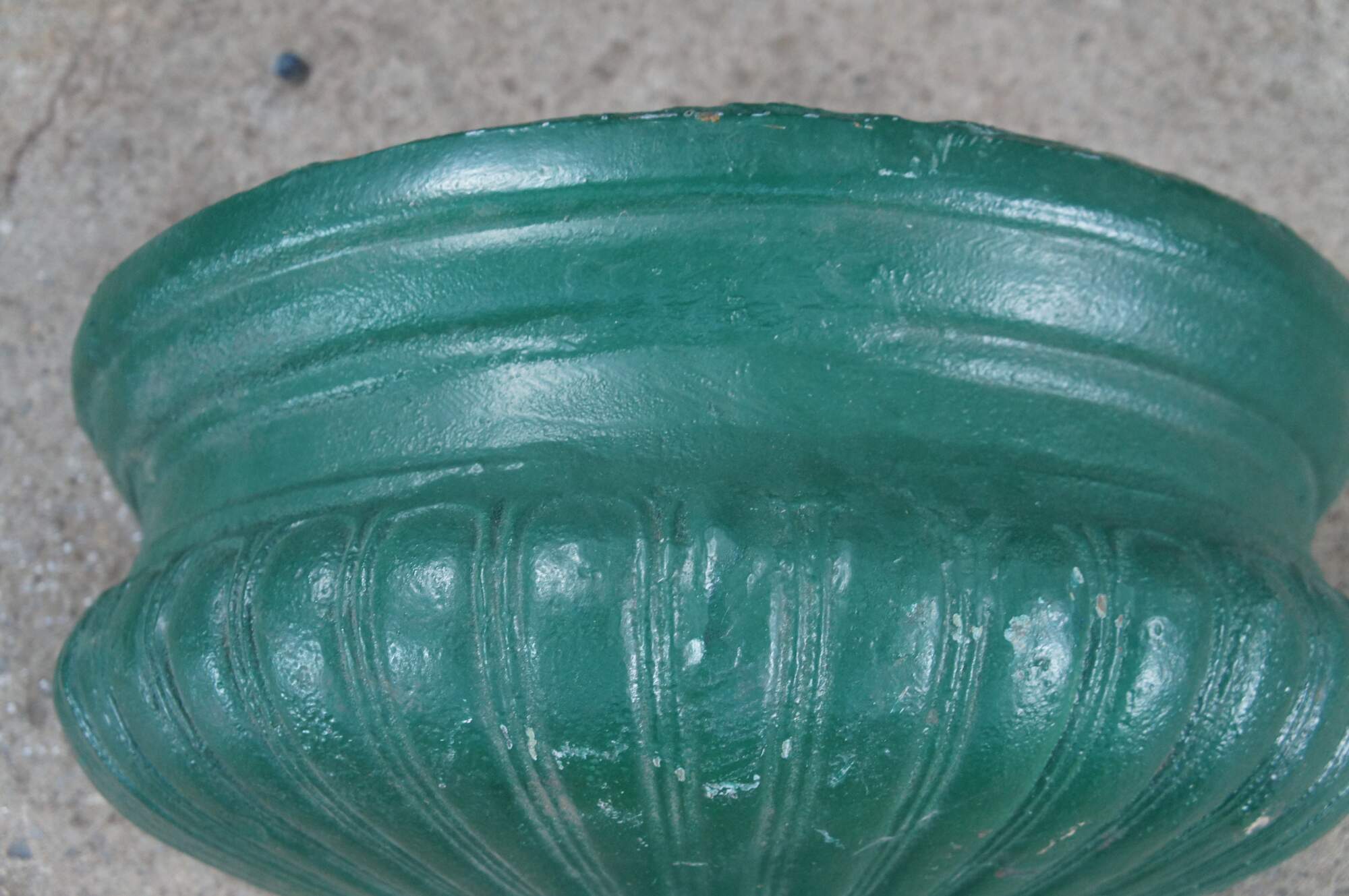 Heavy cast iron wall hanging fountain bowl / planter / garden urn. Demilune / half round shape with fluted Neoclassical styling and an acanthus foliate drop finial.