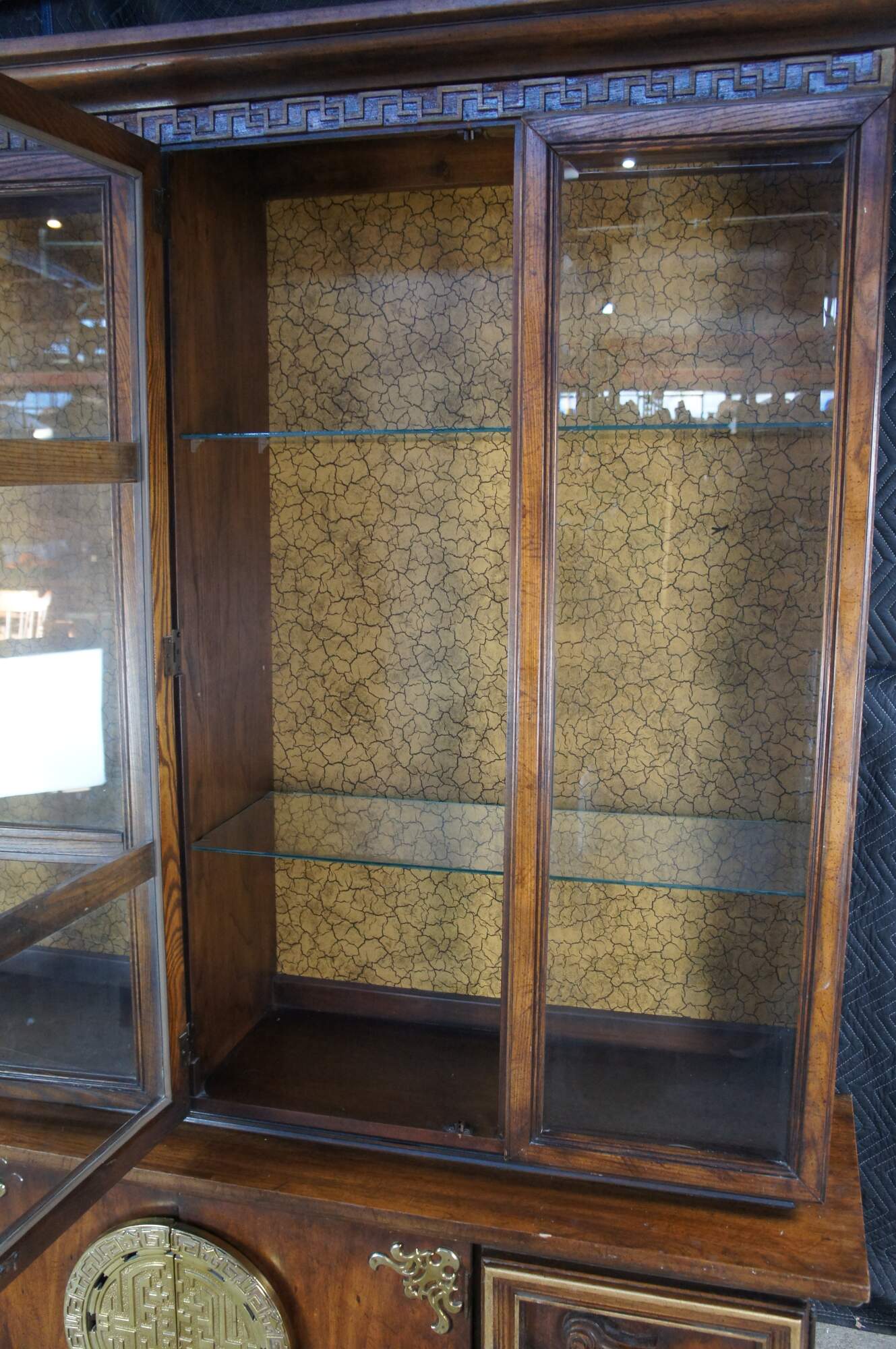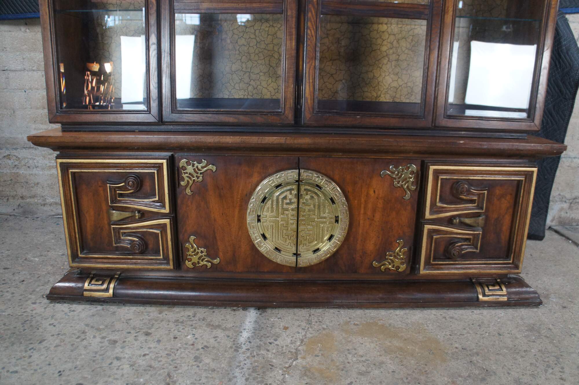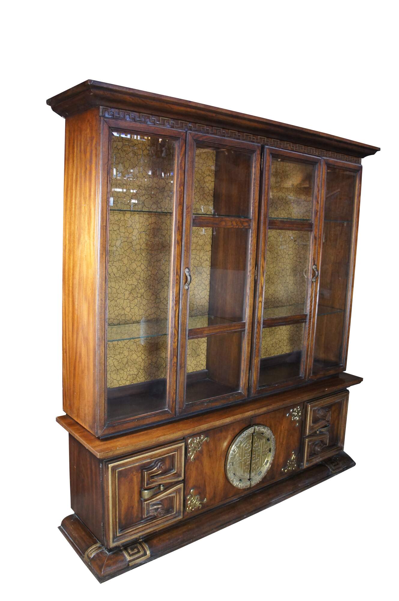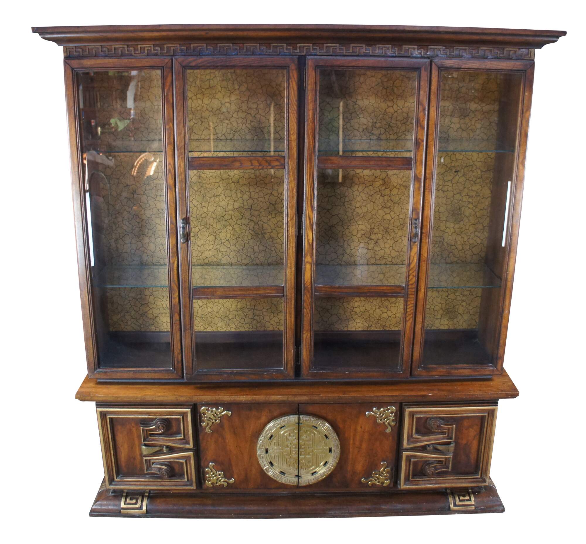 Vintage Ming style china display cabinet / cupboard / credenza by Jessup Furniture Company. Made of oak featuring a large upper curio cabinet with Chinese Greek Key fretwork supported by a lower credenza with large brass Shou style medallion. Circa 1975.
