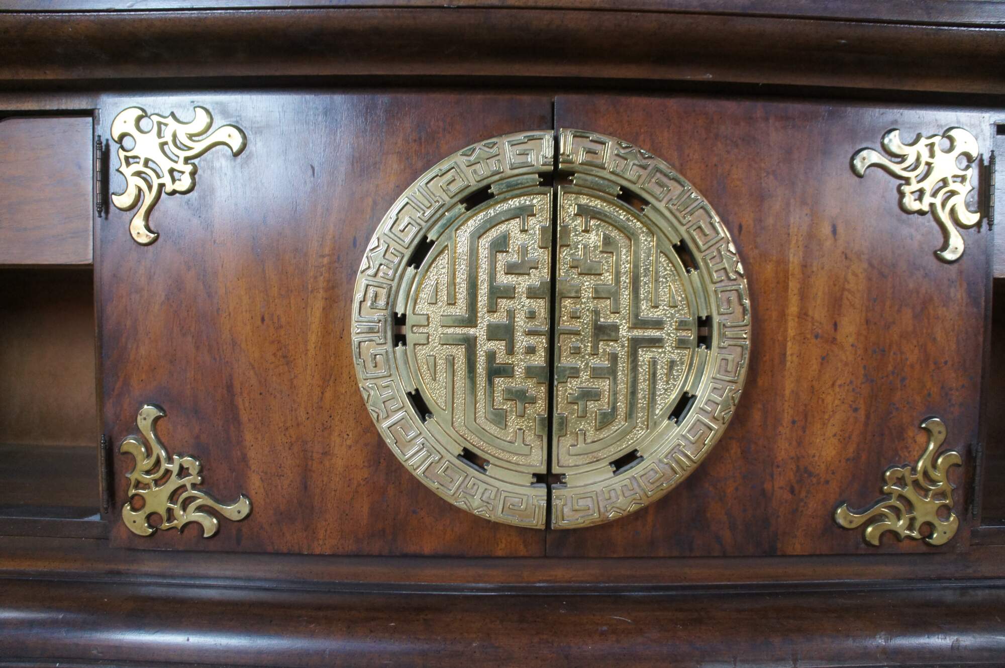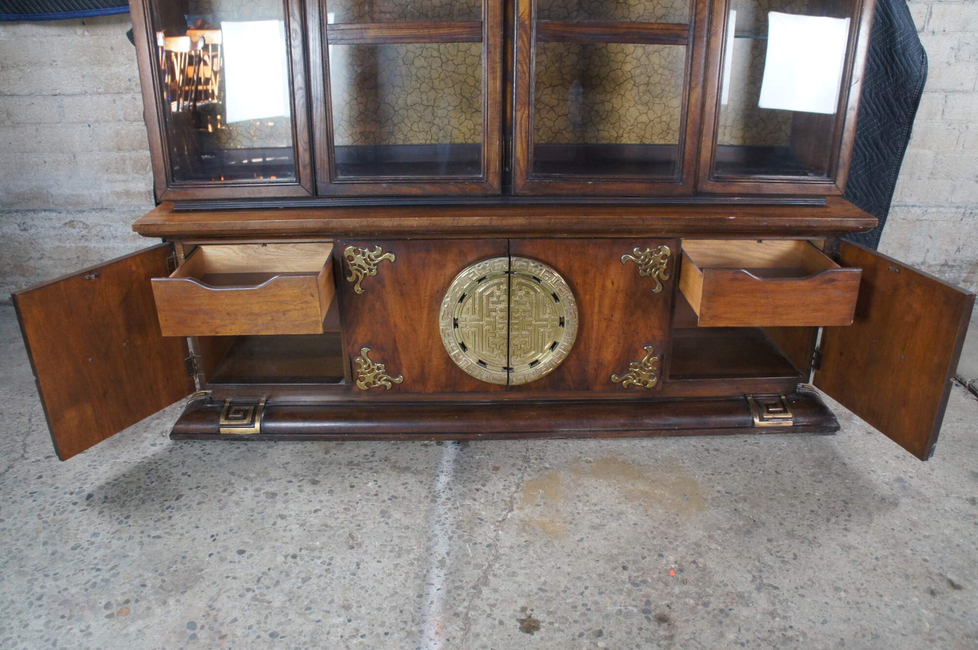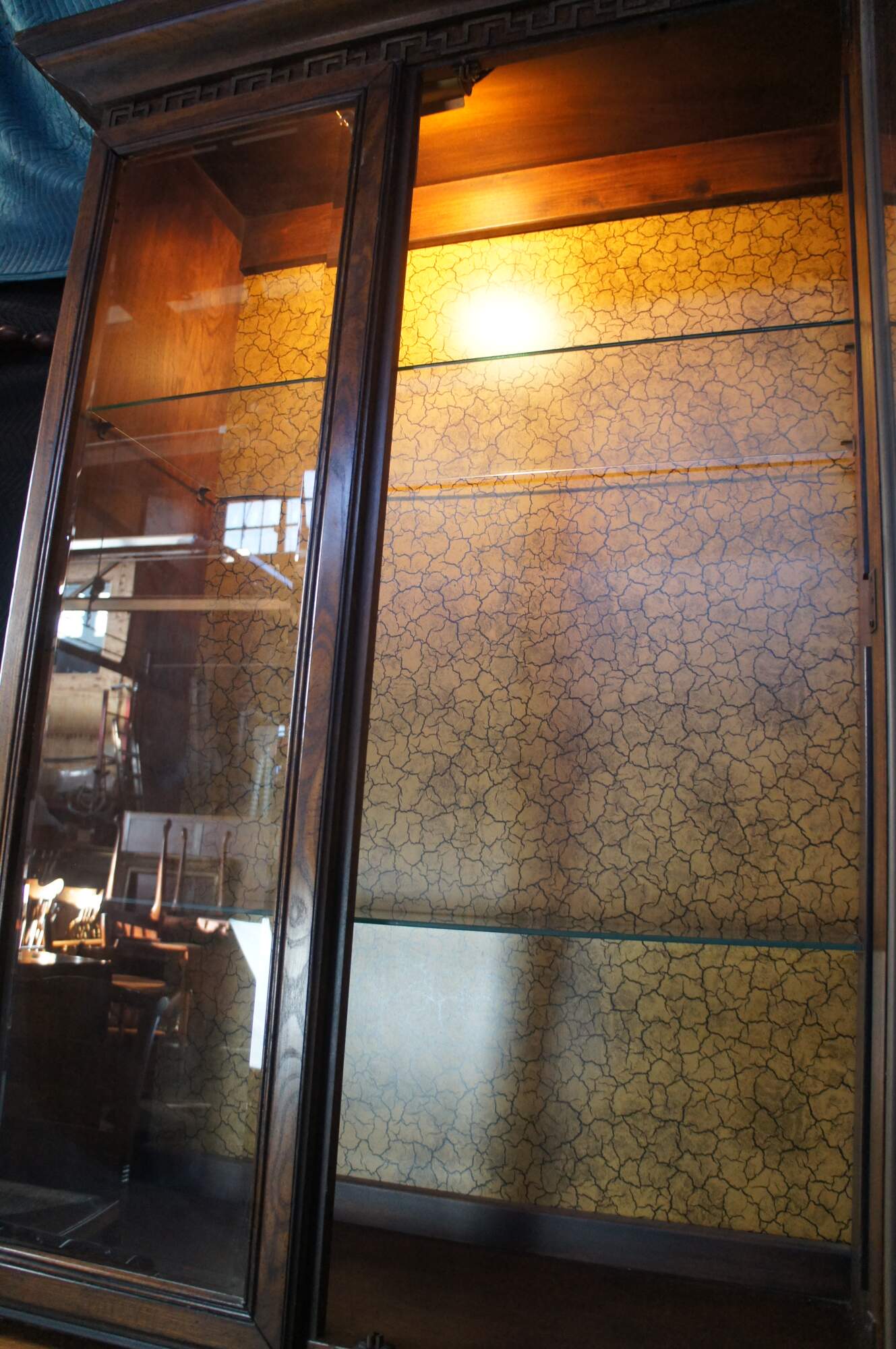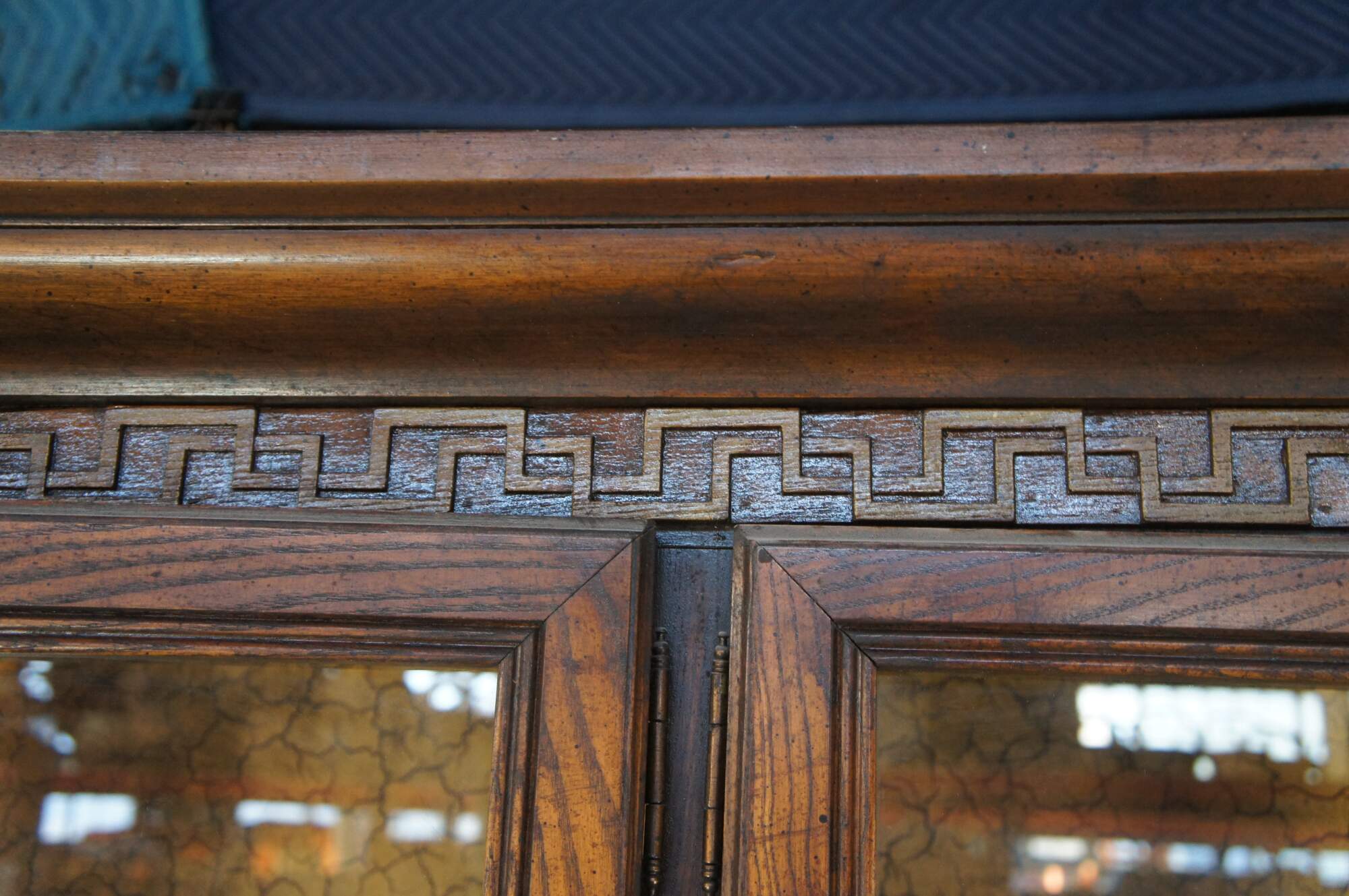 Vintage Ming style china display cabinet / cupboard / credenza by Jessup Furniture Company. Made of oak featuring a large upper curio cabinet with Chinese Greek Key fretwork supported by a lower credenza with large brass Shou style medallion. Circa 1975.