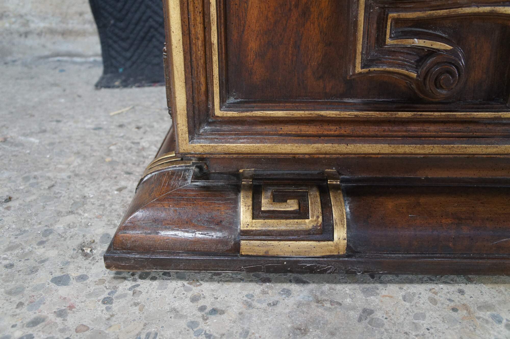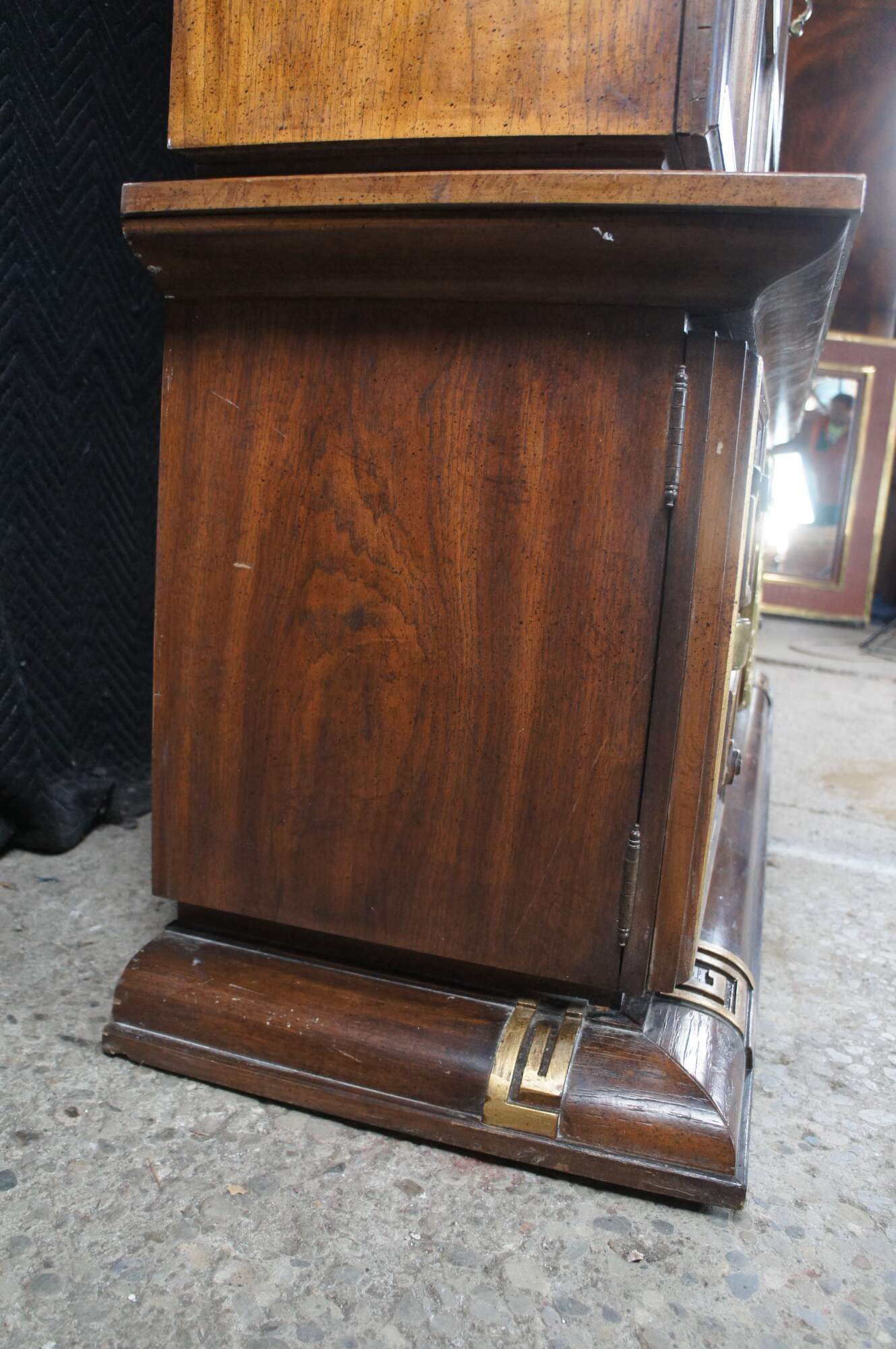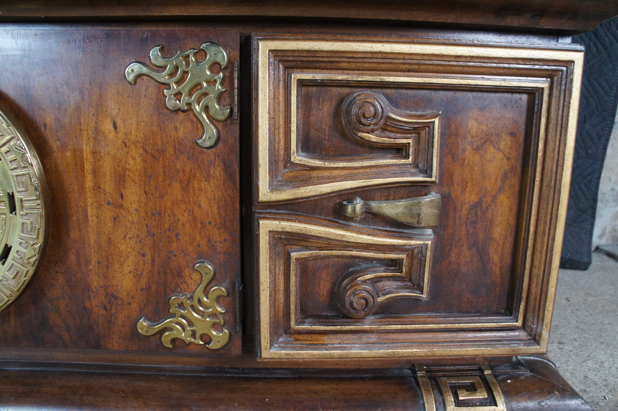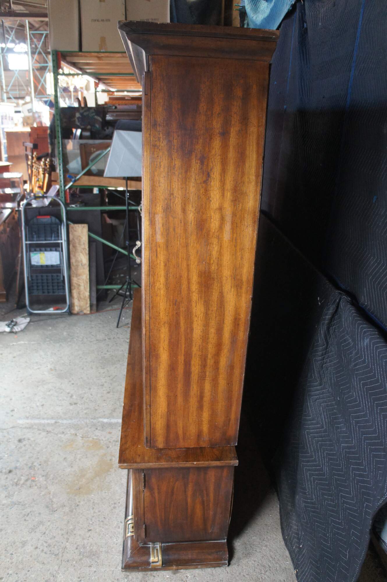 Vintage Ming style china display cabinet / cupboard / credenza by Jessup Furniture Company. Made of oak featuring a large upper curio cabinet with Chinese Greek Key fretwork supported by a lower credenza with large brass Shou style medallion. Circa 1975.