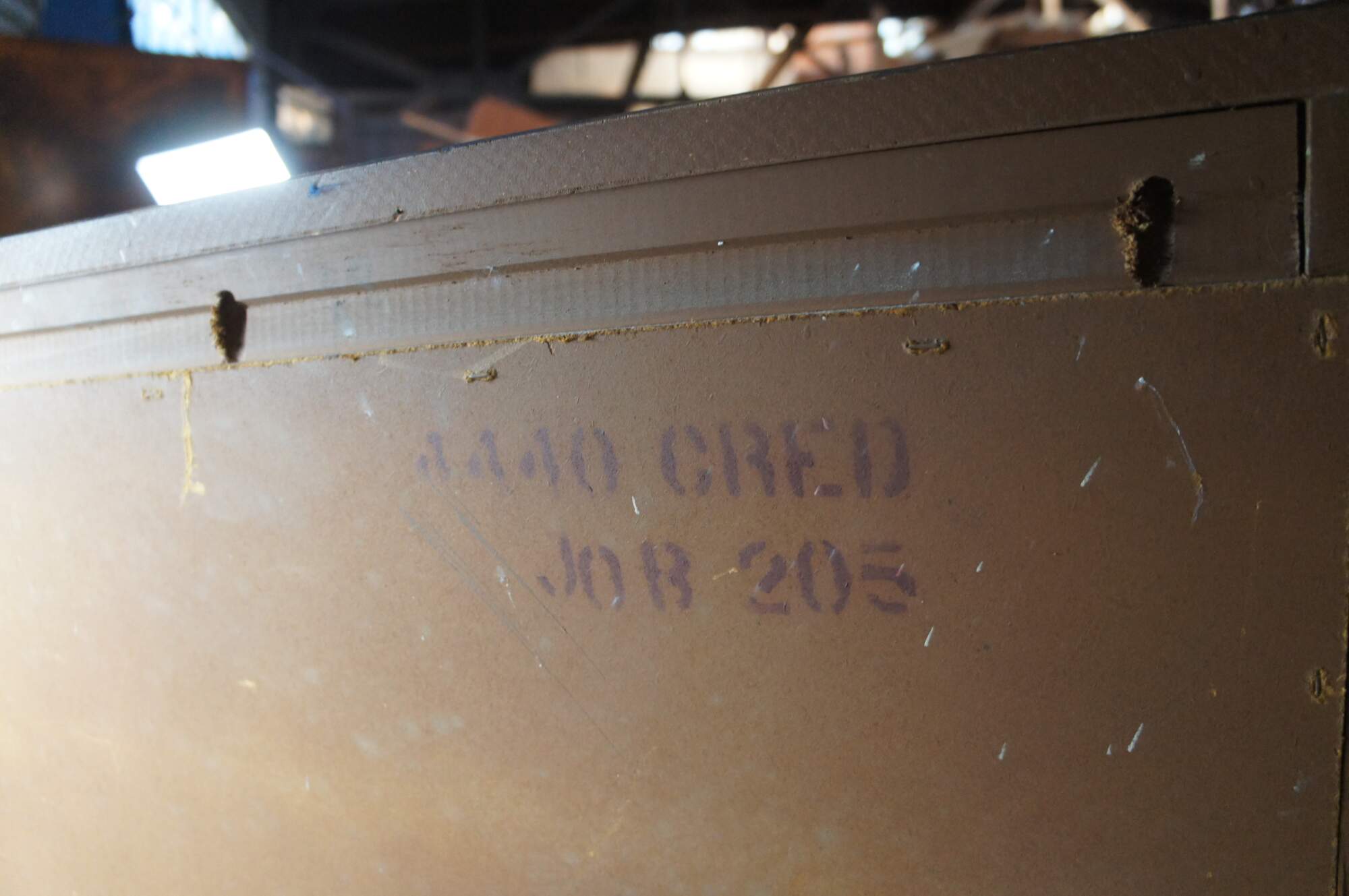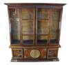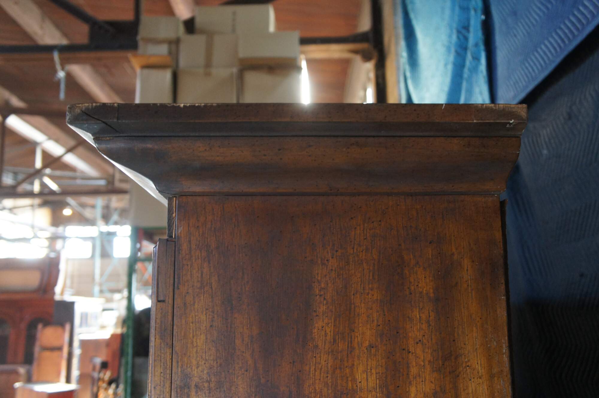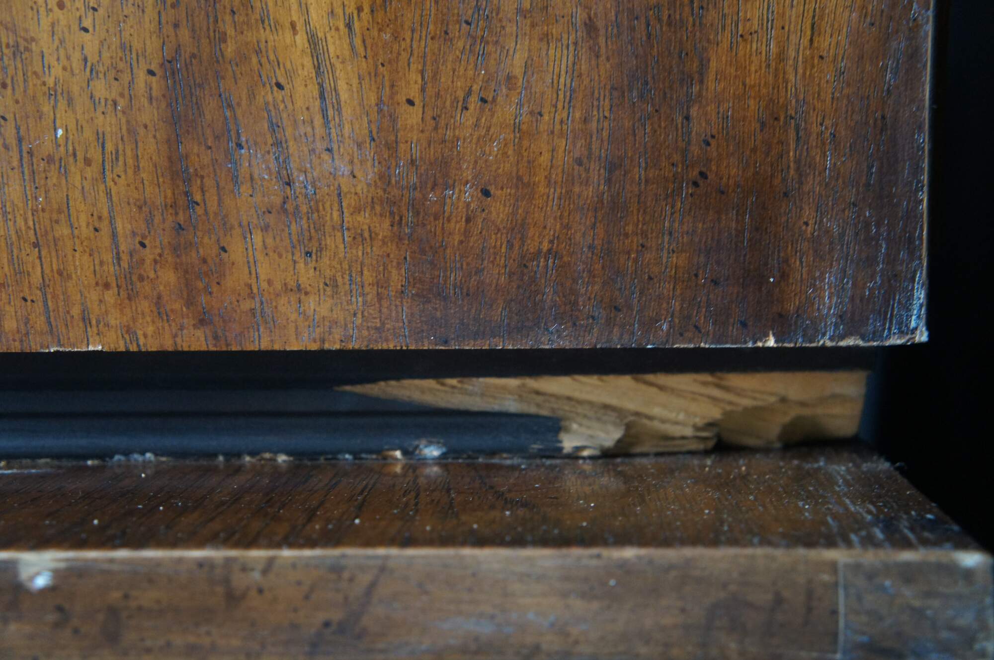 Structurally solid, very heavy, wear from age and use, edge wear, finish loss, scuffing, fading, chipped glass shelves on corners, chunk of trim missing on back right between top and bottom - hard to see unless eye level - will be touched up.