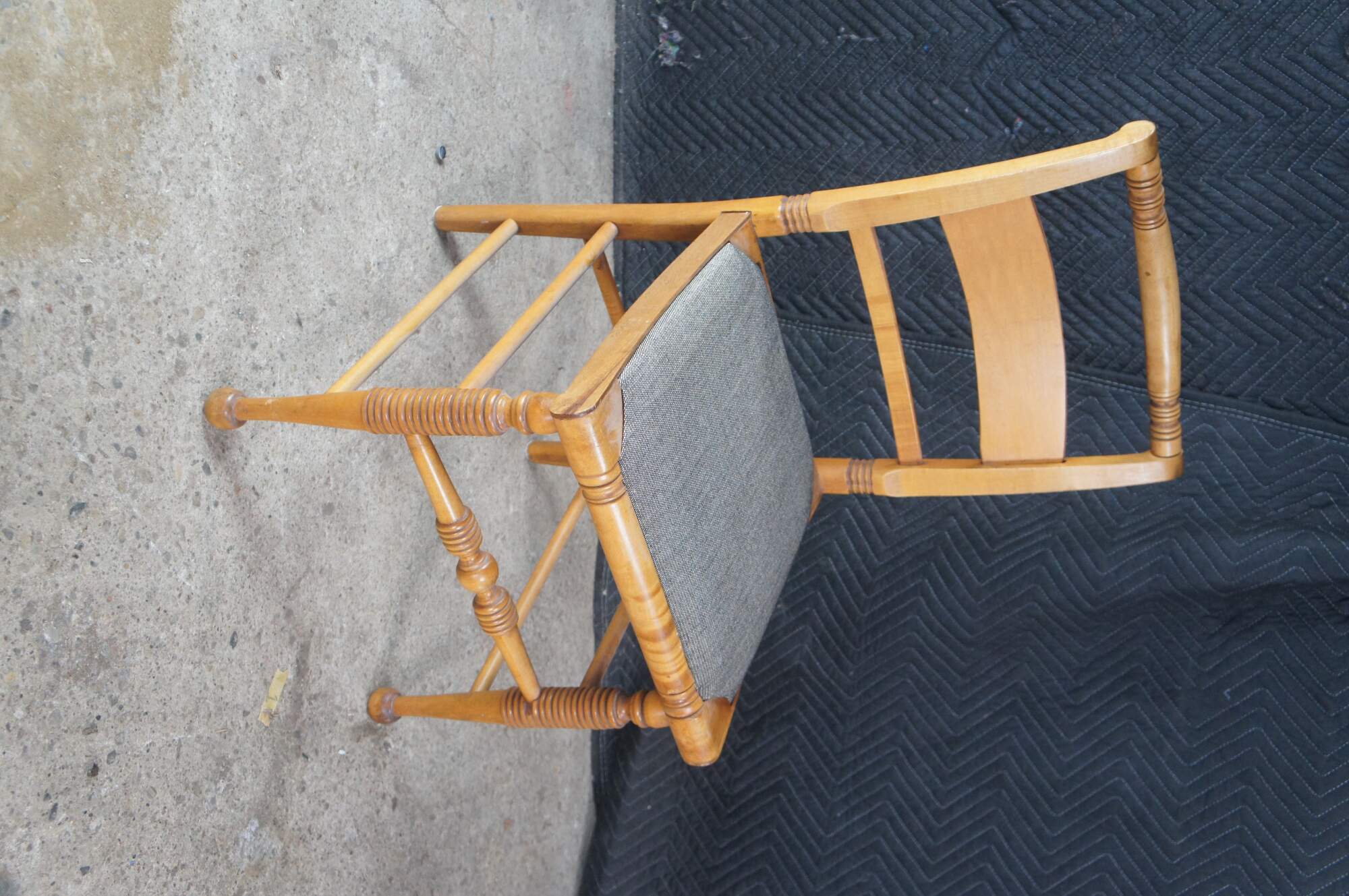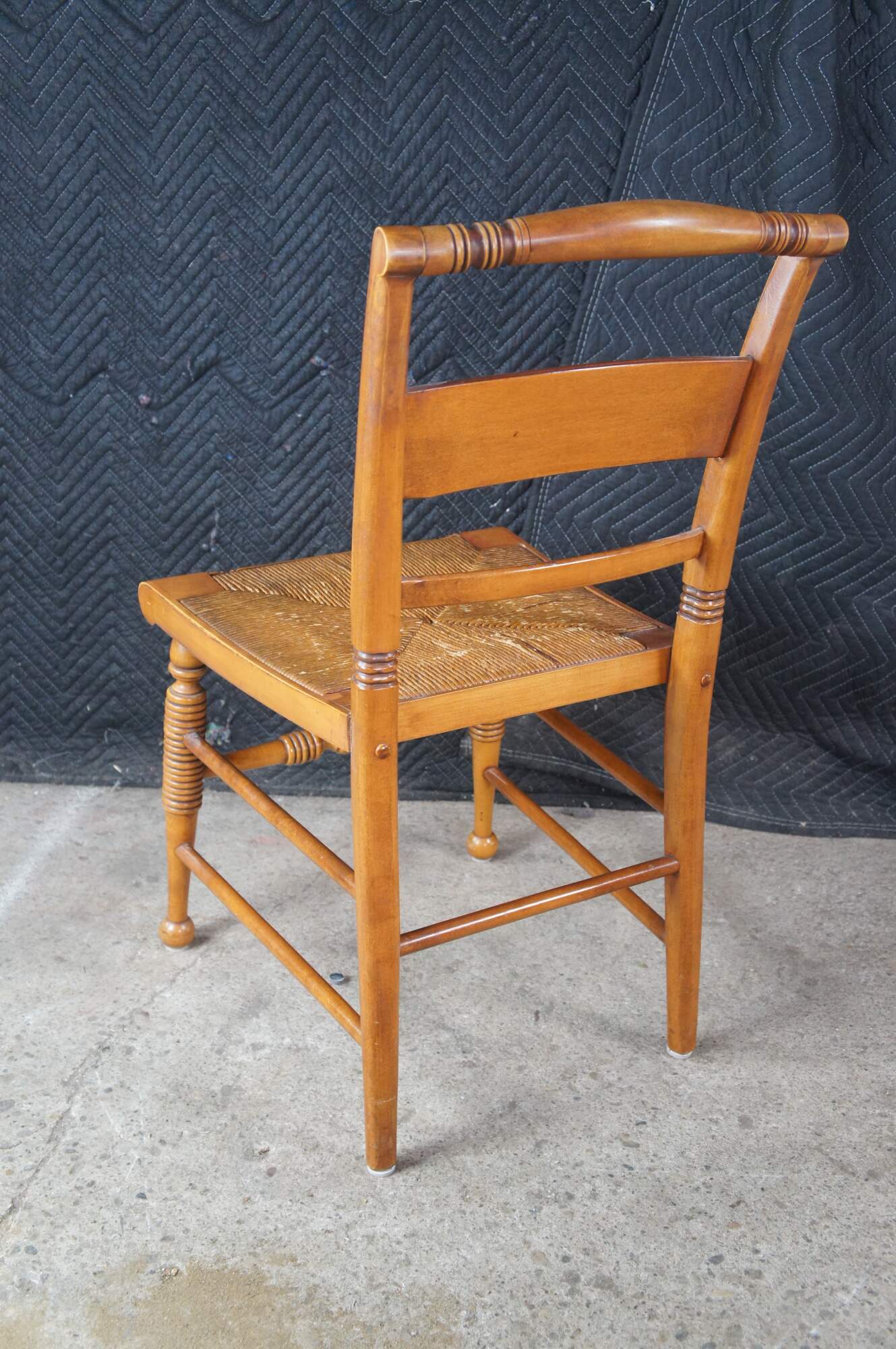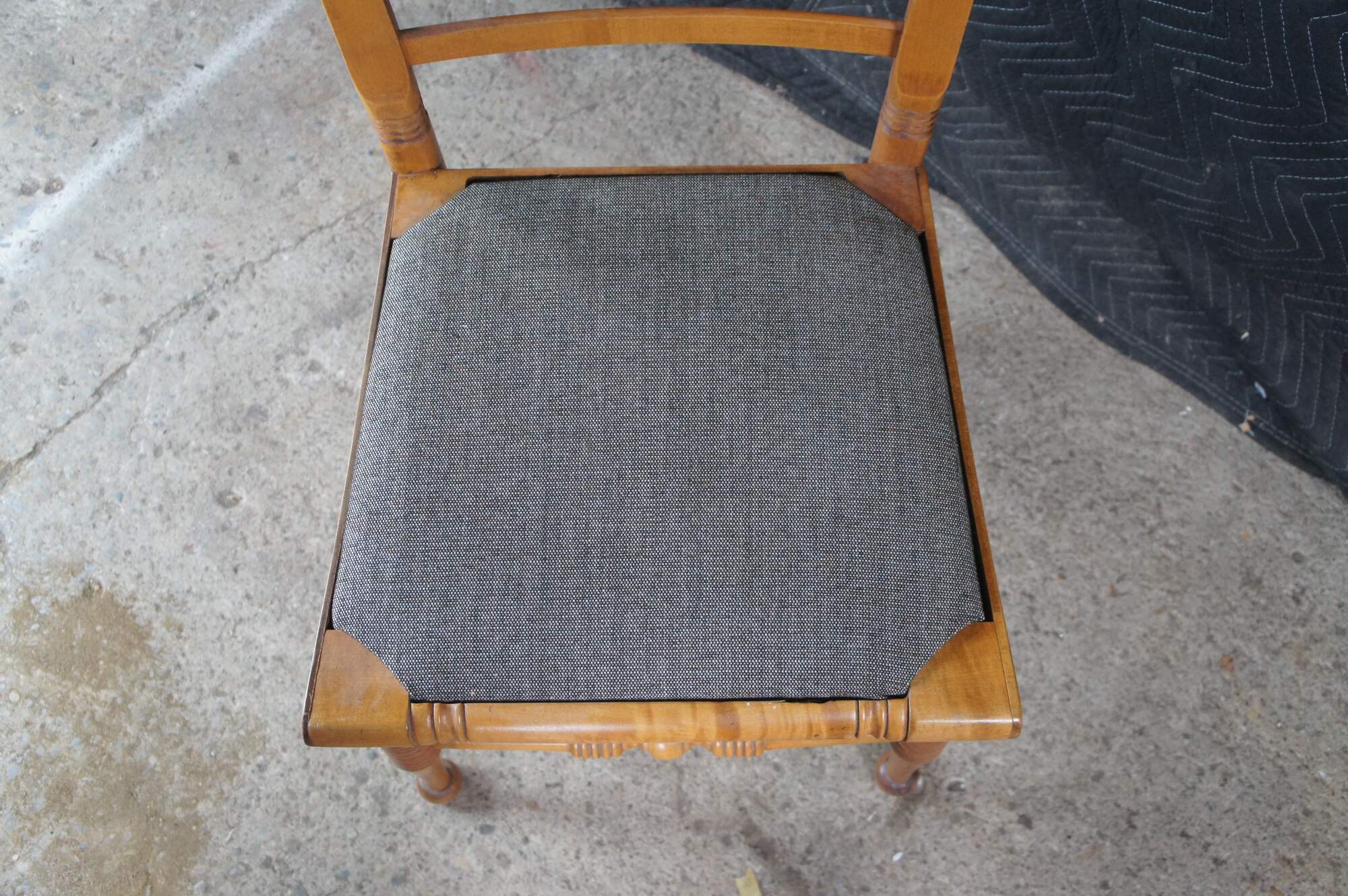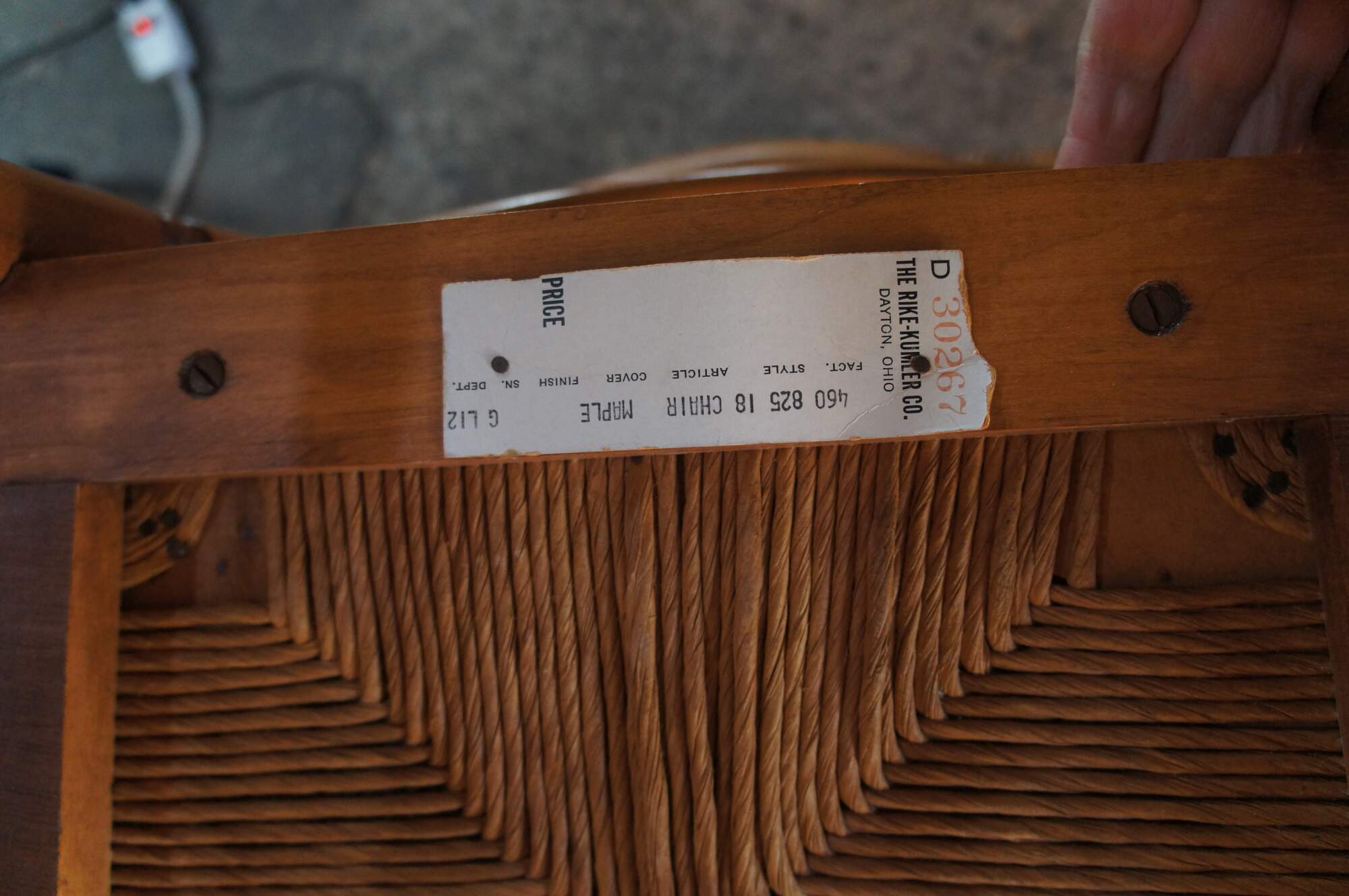 Six vintage Rike-Kumler Early American style dining chairs. Made of maple featuring rush seats and turned accents. Two of the chairs of been reupholstered in a grey tweed seat.