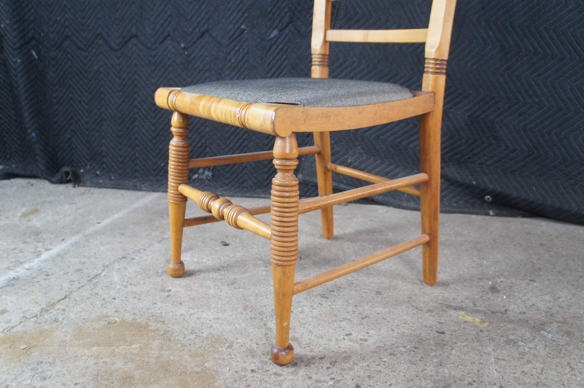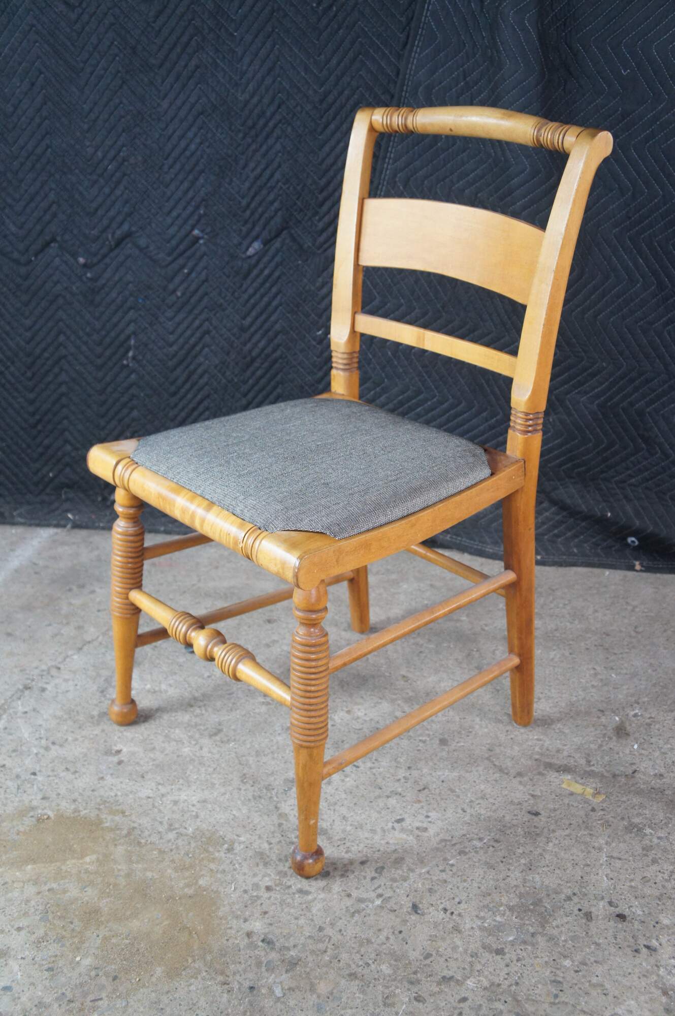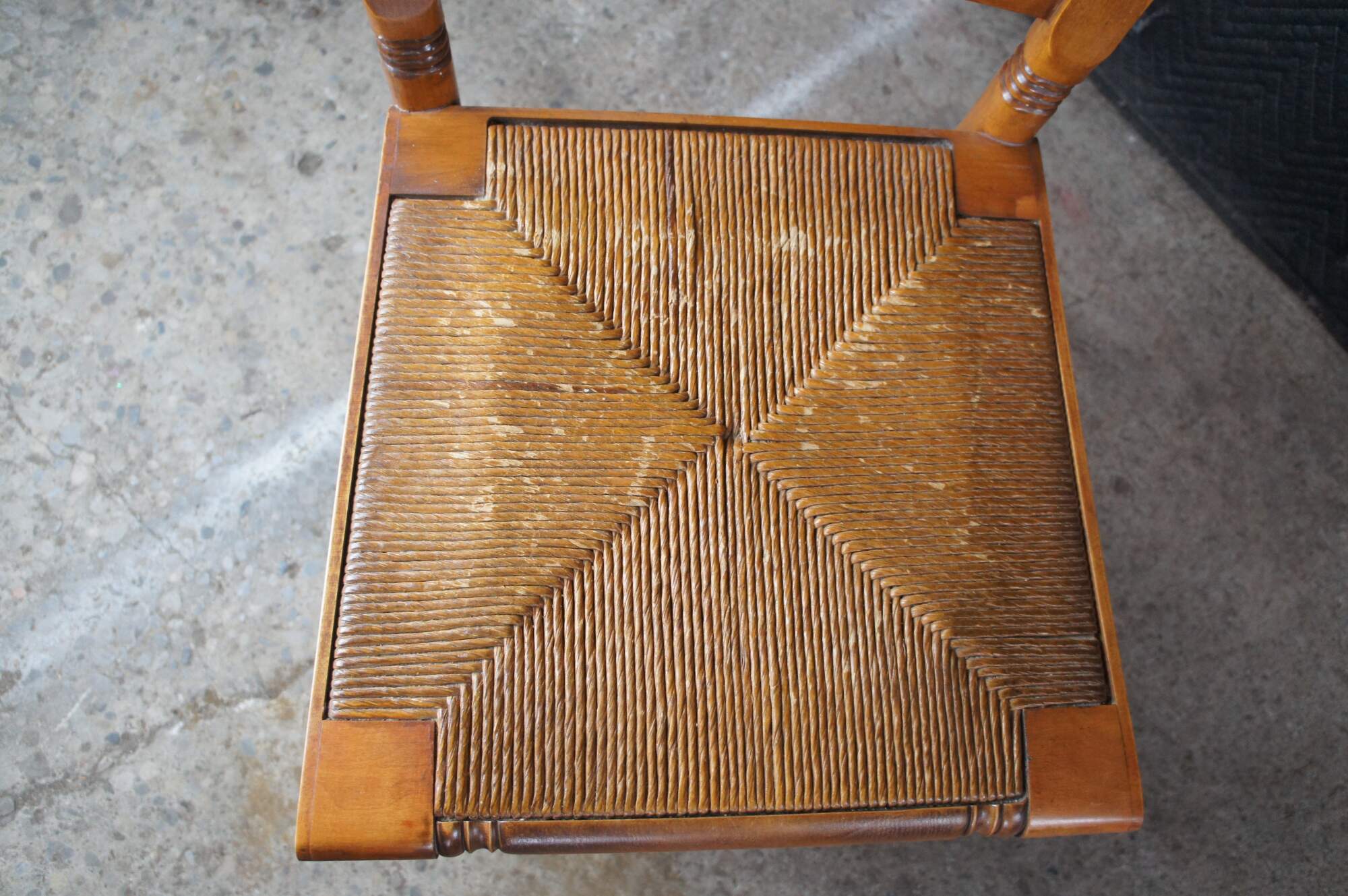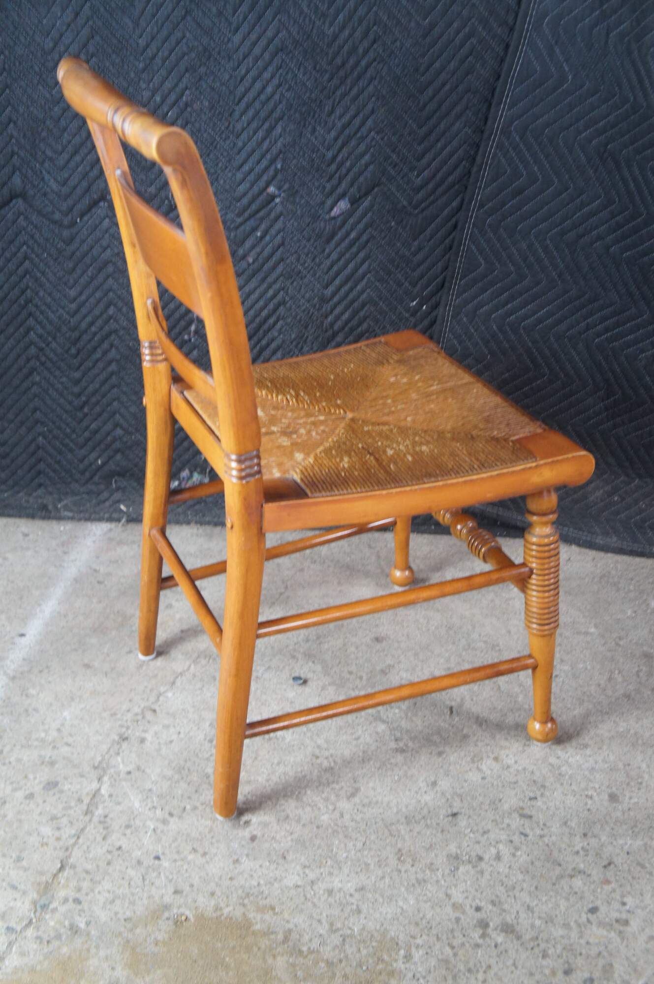 Six vintage Rike-Kumler Early American style dining chairs. Made of maple featuring rush seats and turned accents. Two of the chairs of been reupholstered in a grey tweed seat.