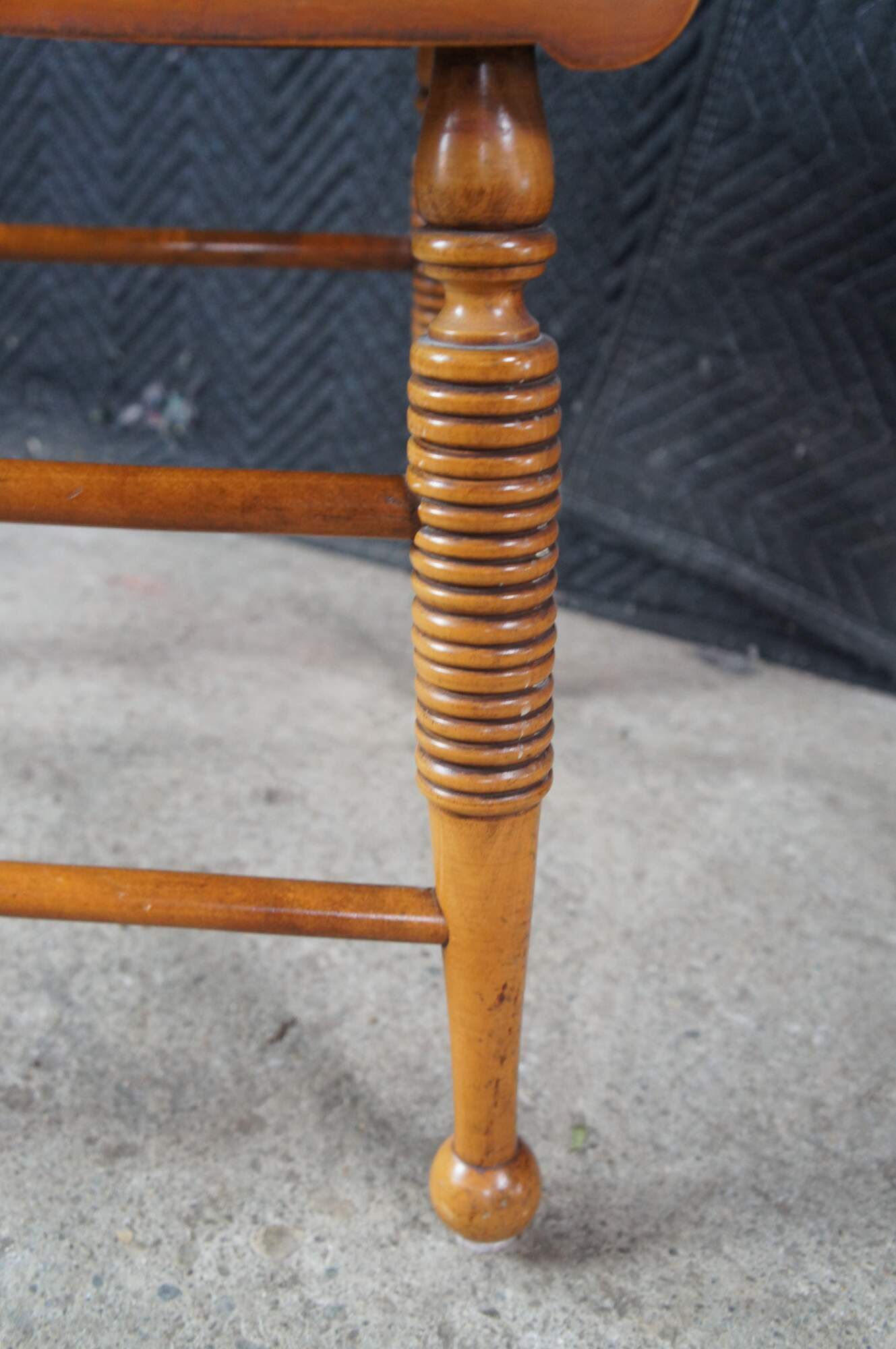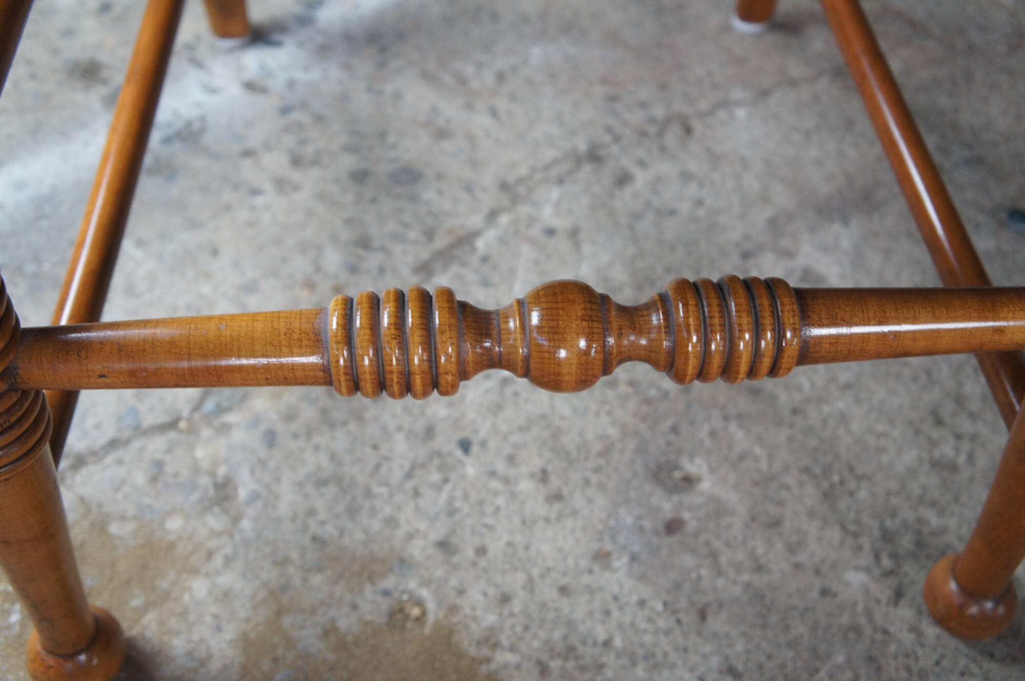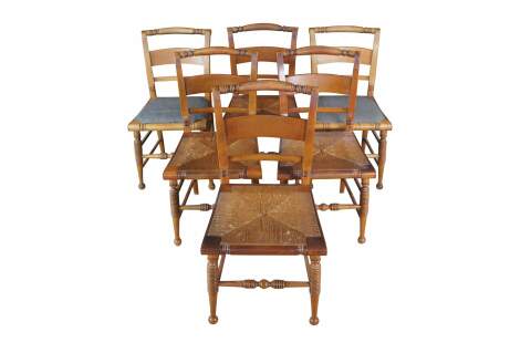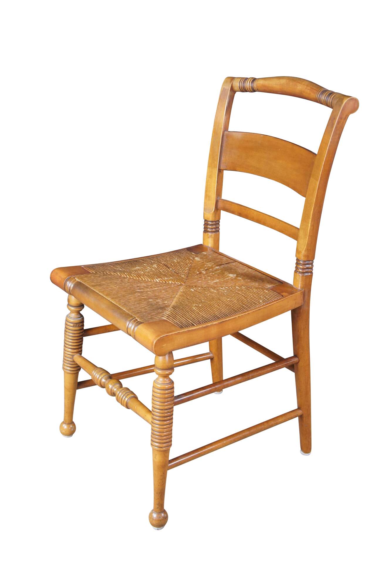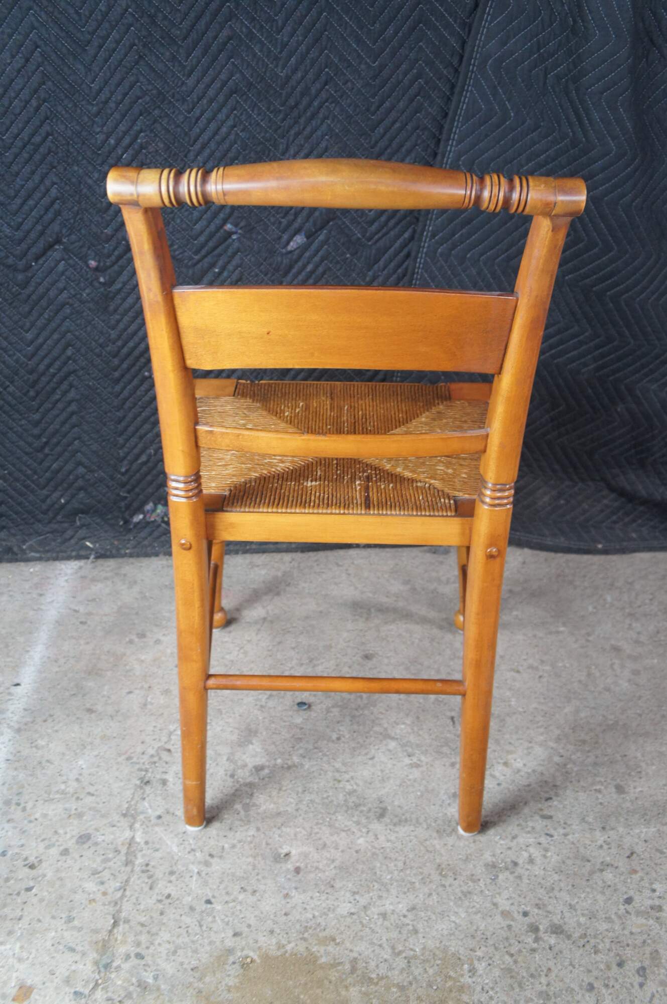 Six vintage Rike-Kumler Early American style dining chairs. Made of maple featuring rush seats and turned accents. Two of the chairs of been reupholstered in a grey tweed seat.