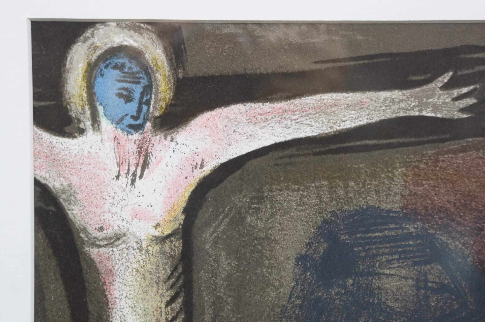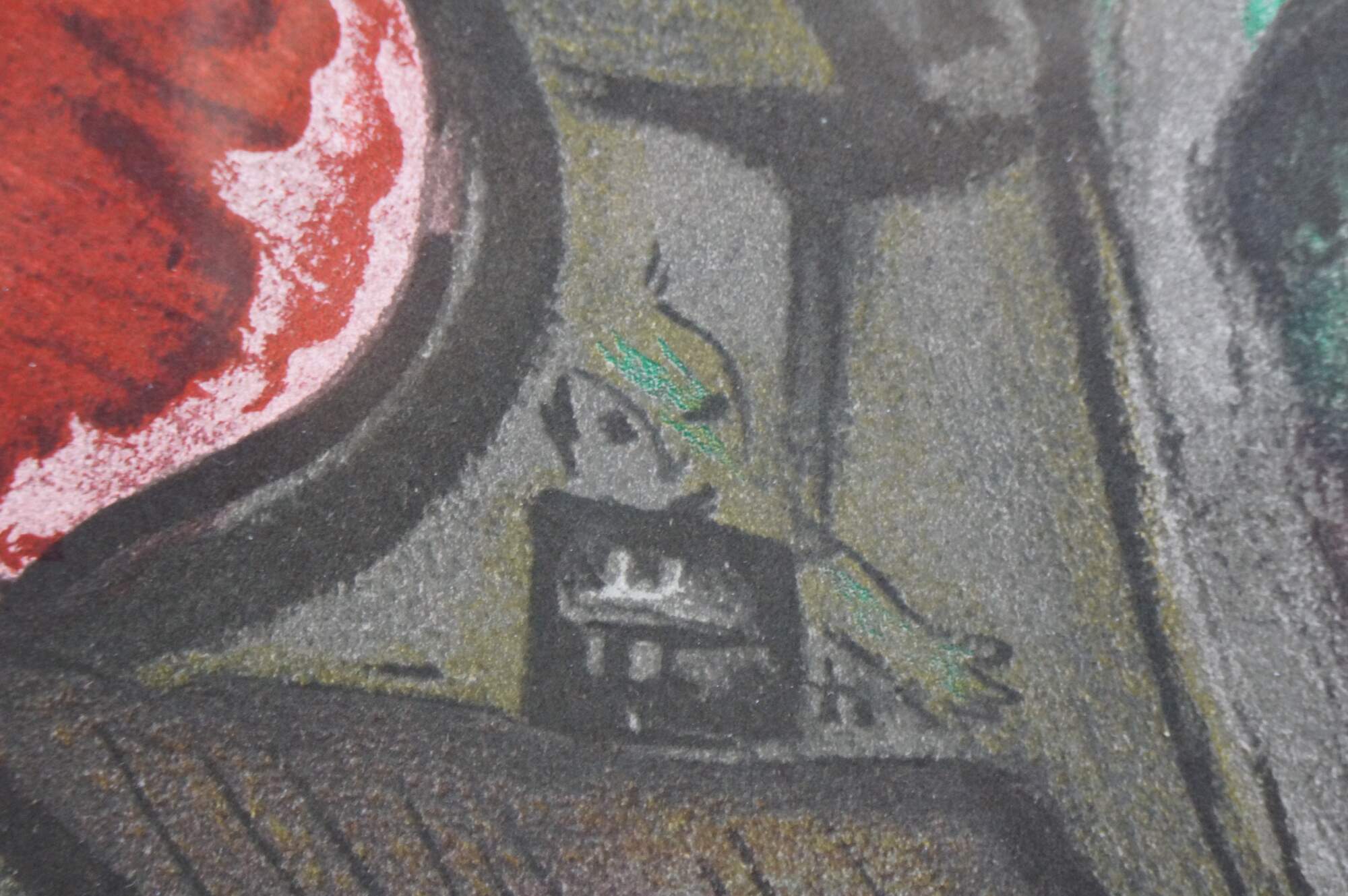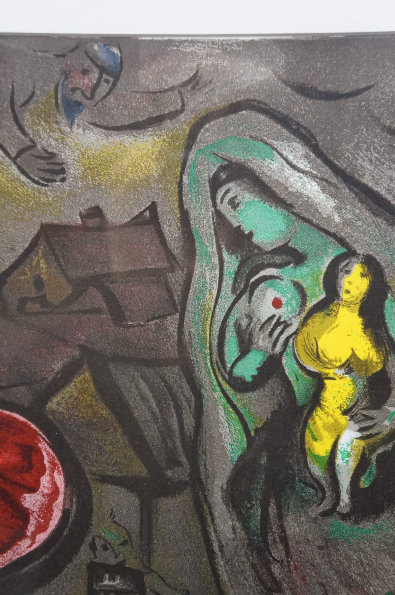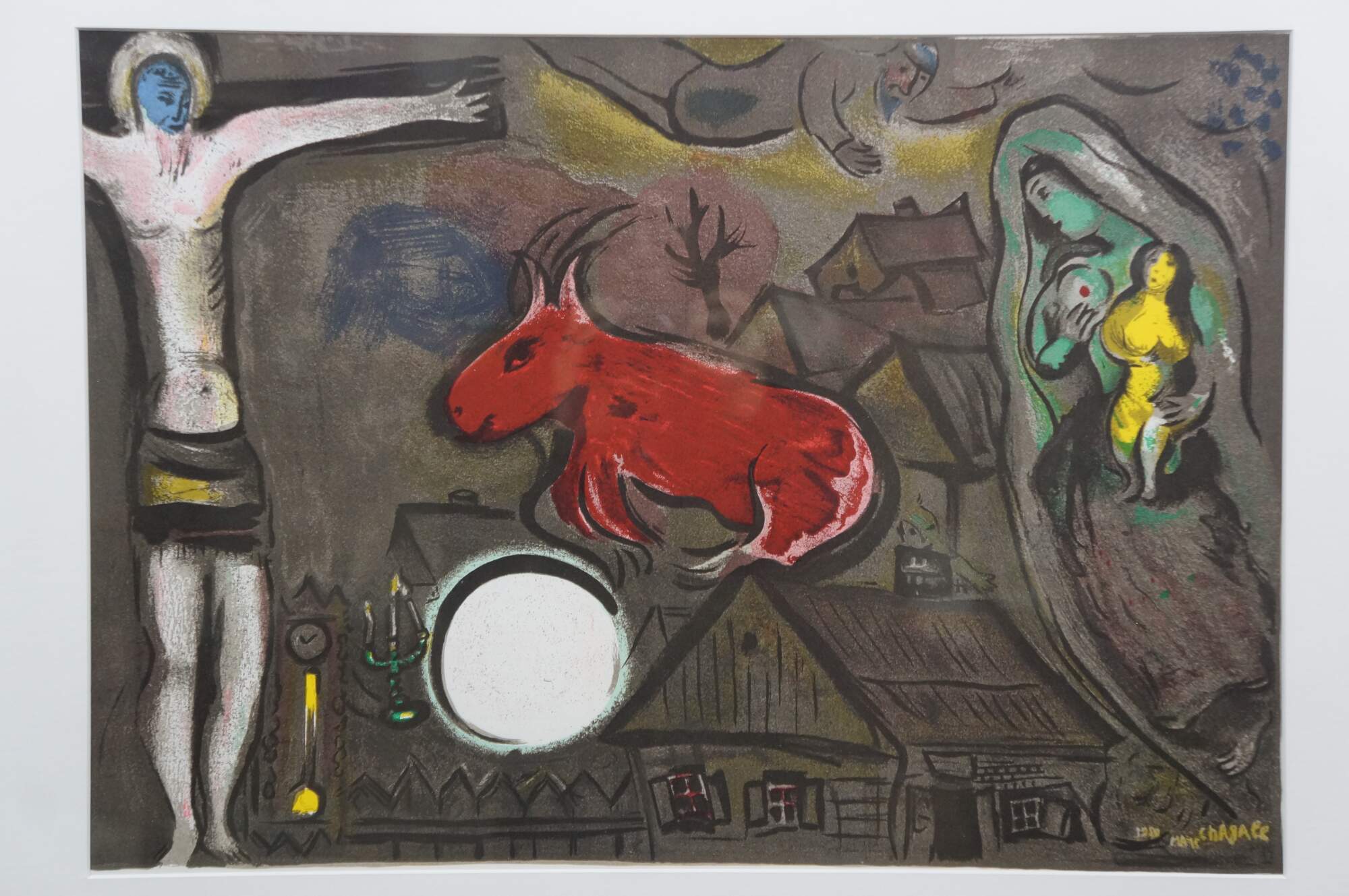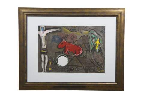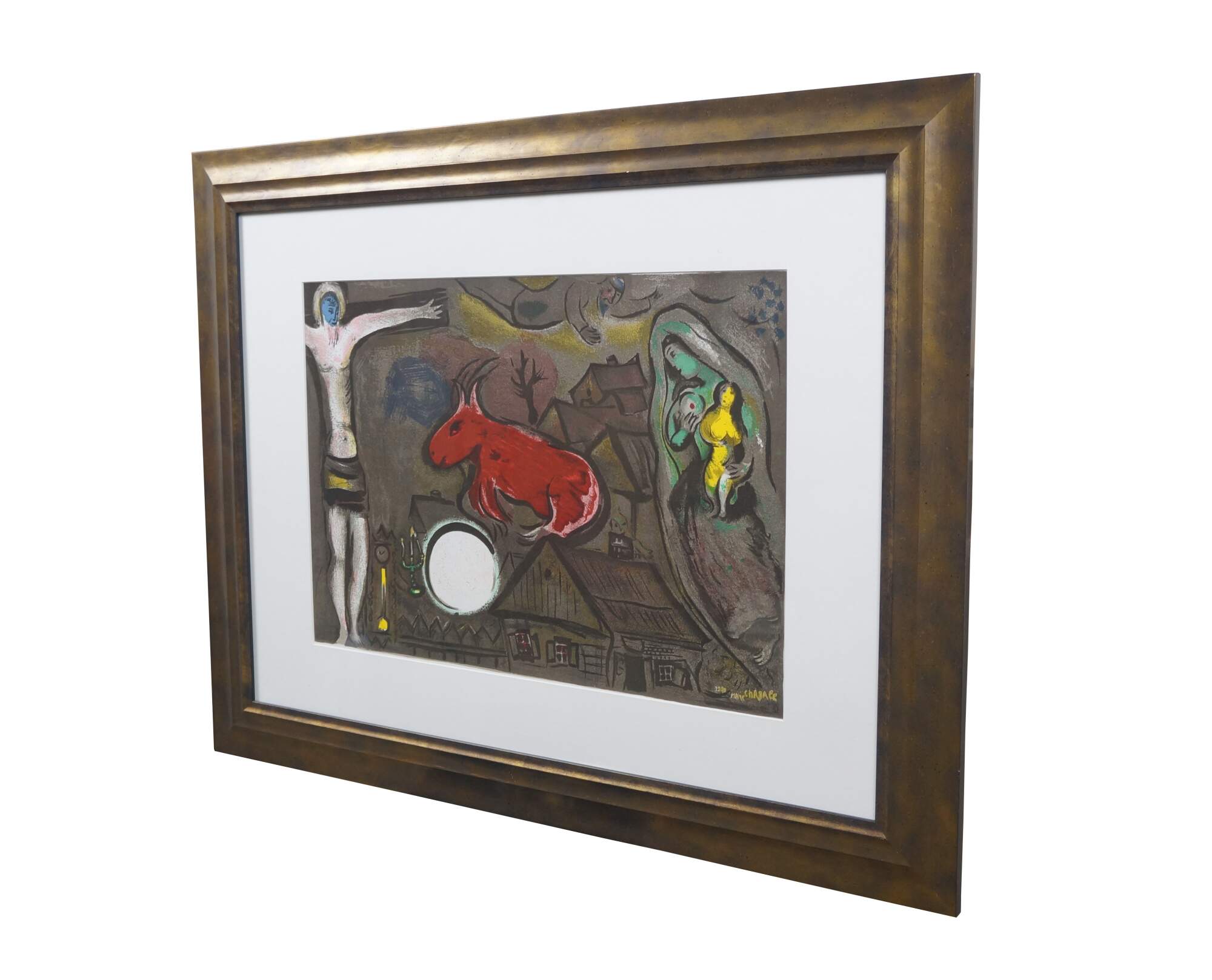 Vintage 1950 lithograph print depicting "The Mystical Crucifixion" by Marc Chagall (1887-1985). Published for "Derriere le Miroir" (Behind the Mirror) No 27-28 - March-April 1950 - 2nd Edition. "Marc Chagall, born in Vitebsk, Belarus, into a traditional Hasidic Jewish family, has been called the quintessential Jewish artist of the 20th century, and one of the foremost visual interpreters of the Bible. He believed that the Bible is the greatest book of poetry of all time. It’s this poetry that he interpreted in his Bible lithographs. He once said that the Bible “is like an echo of nature and this is the secret I’ve tried to transmit.” One of the most fascinating of his lithographs is “Mystical Crucifixion.” Each element in this lithograph contains personal or symbolic meaning for Chagall: a Russian village for the earthly home; a candlestick for the Hebrew Bible, or Judaism; a clock for time, past or present; Madonna and Child for Mary and Jesus, or the relationship of mother and child; a red ox for sacrifice; the Crucifixion for Christ. A prayer shawl covers the loins of Jesus to remind us, lest we forget, that Christ was a Jew. That Chagall, himself a Jew, would have used the Crucifixion in many of his works suggests that he must have understood the event as one of the most poignant symbols of suffering in all of history." (The Antiques Almanac) Beveled bronze gilt frame; white mat. Includes Certificate of Authenticity.