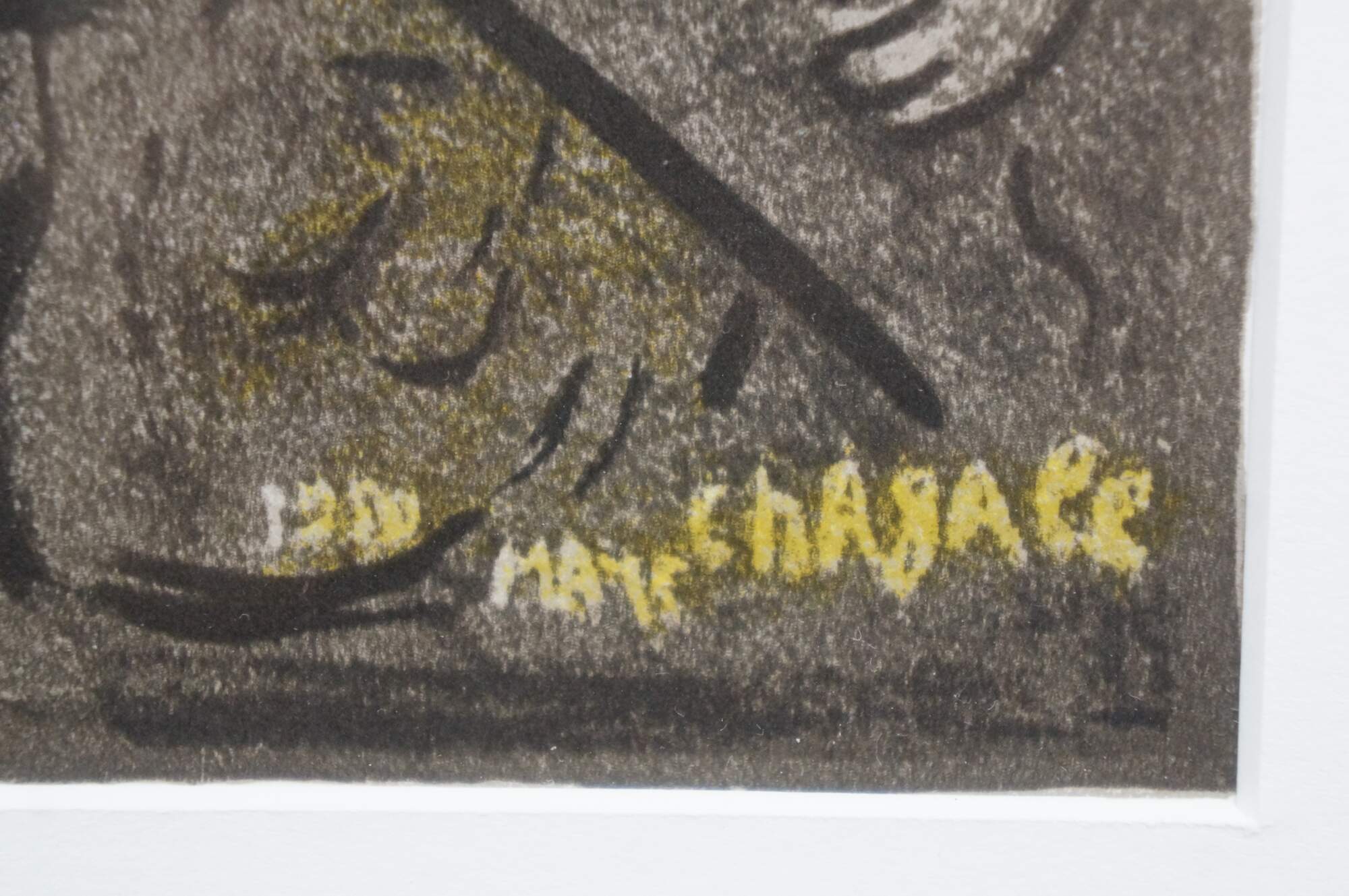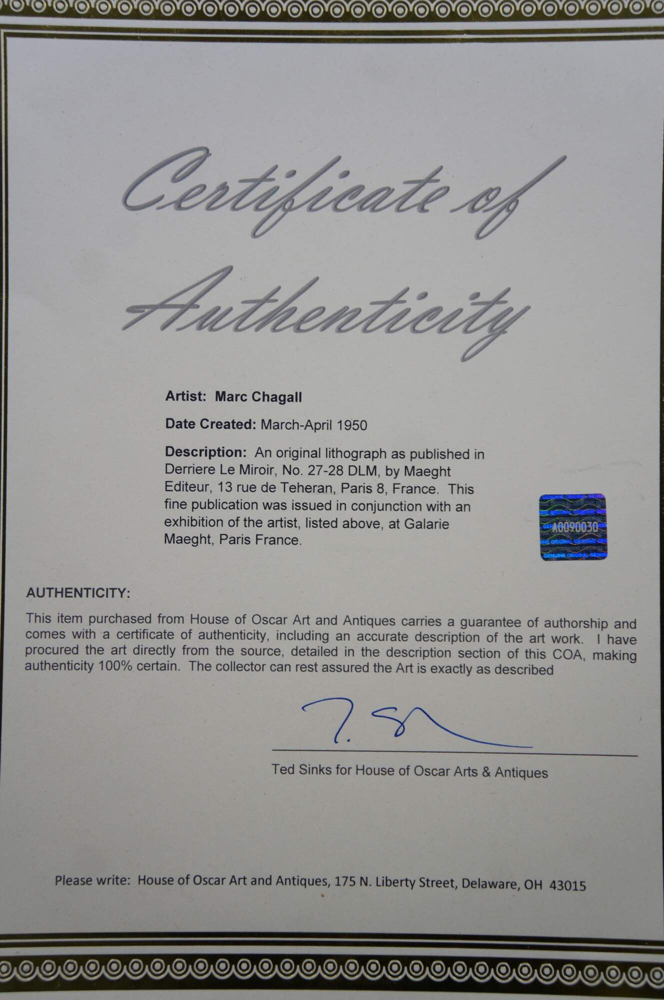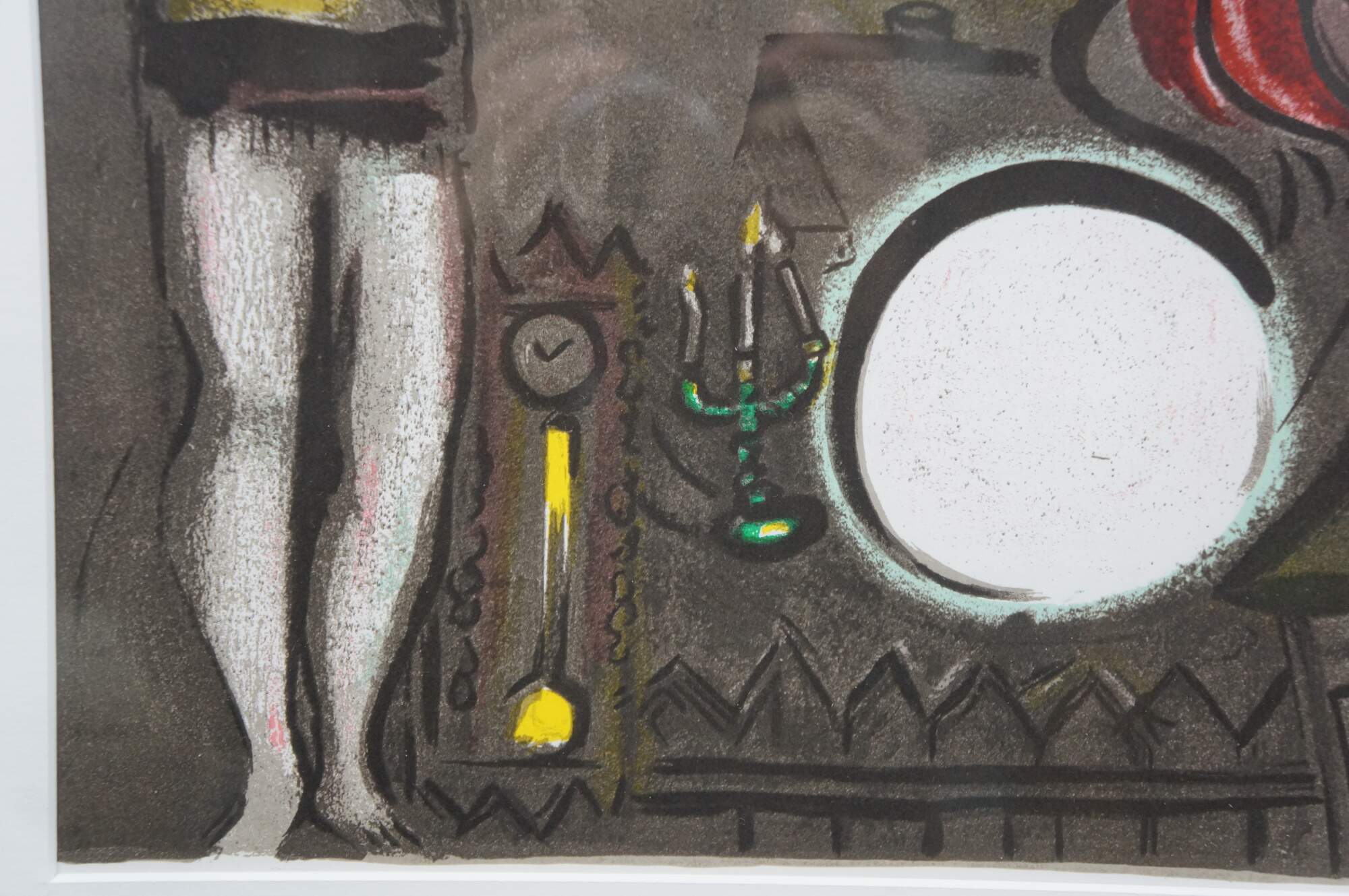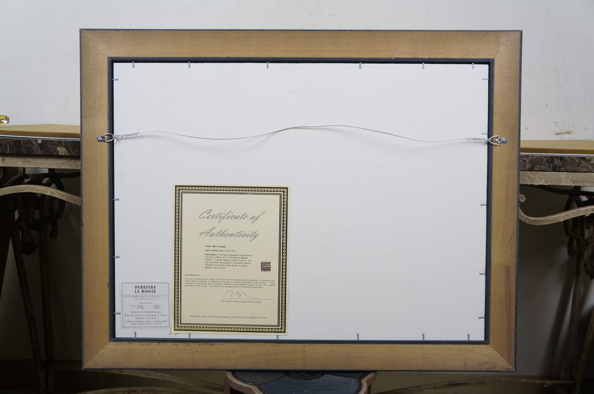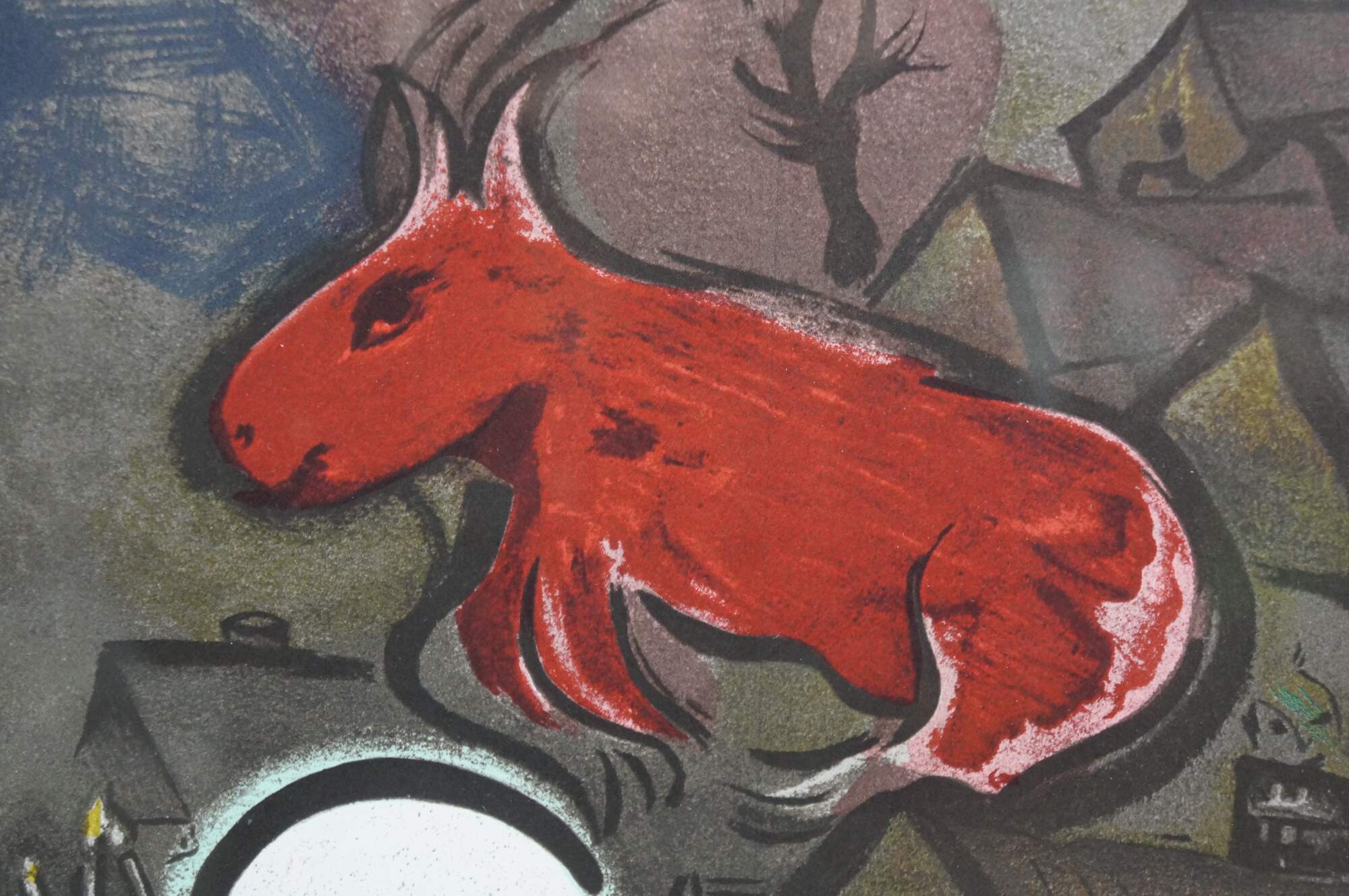 Vintage 1950 lithograph print depicting "The Mystical Crucifixion" by Marc Chagall (1887-1985). Published for "Derriere le Miroir" (Behind the Mirror) No 27-28 - March-April 1950 - 2nd Edition. "Marc Chagall, born in Vitebsk, Belarus, into a traditional Hasidic Jewish family, has been called the quintessential Jewish artist of the 20th century, and one of the foremost visual interpreters of the Bible. He believed that the Bible is the greatest book of poetry of all time. It’s this poetry that he interpreted in his Bible lithographs. He once said that the Bible “is like an echo of nature and this is the secret I’ve tried to transmit.” One of the most fascinating of his lithographs is “Mystical Crucifixion.” Each element in this lithograph contains personal or symbolic meaning for Chagall: a Russian village for the earthly home; a candlestick for the Hebrew Bible, or Judaism; a clock for time, past or present; Madonna and Child for Mary and Jesus, or the relationship of mother and child; a red ox for sacrifice; the Crucifixion for Christ. A prayer shawl covers the loins of Jesus to remind us, lest we forget, that Christ was a Jew. That Chagall, himself a Jew, would have used the Crucifixion in many of his works suggests that he must have understood the event as one of the most poignant symbols of suffering in all of history." (The Antiques Almanac) Beveled bronze gilt frame; white mat. Includes Certificate of Authenticity.