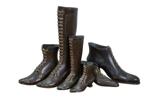 Set of six late 20th century Theodore Alexander bronze figurines in the shape of Victorian boots in a variety of heights and styles. Leather laces and pads on the soles.