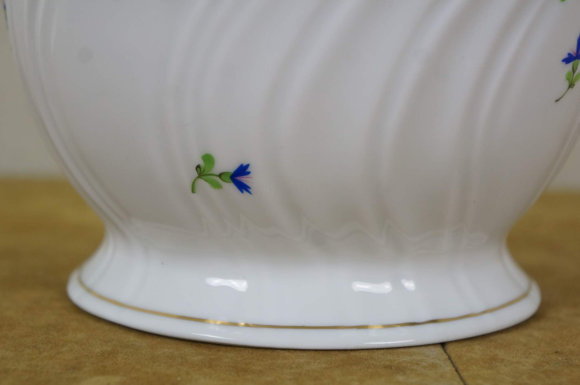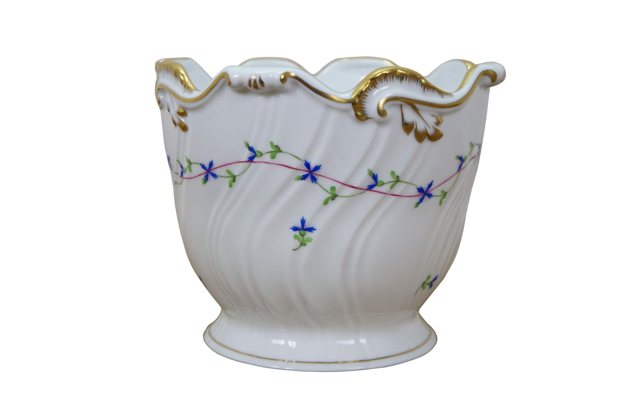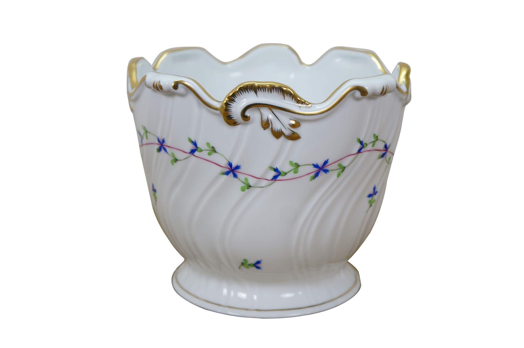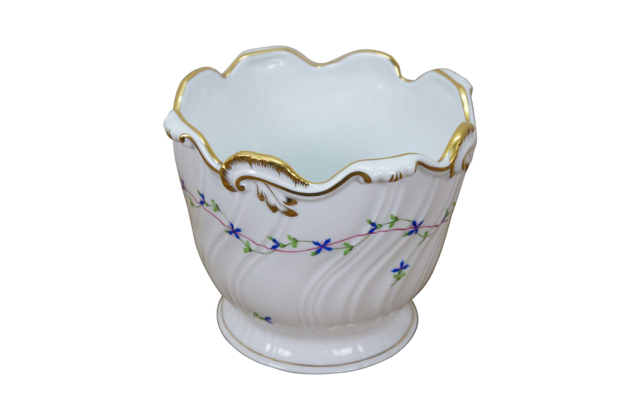 Late 20th century Herend Blue Garland ribbed cachepot / jardiniere / compote. Round form with swirled ridges on the sides, scrolled foliate rim trimmed with gilt, hand painted with a pink and green garland of blue flowers. The Blue Garland design was introduced in 1890 by Jeno Farkashazy, grandson of the founder of Herend. Marked on base 1227/PBG 193.