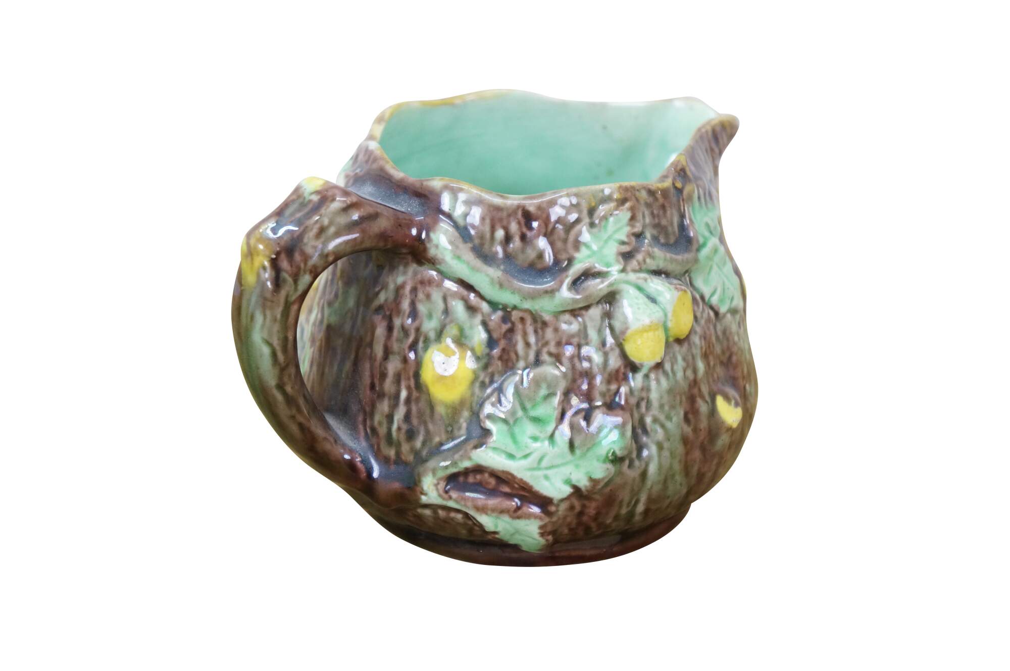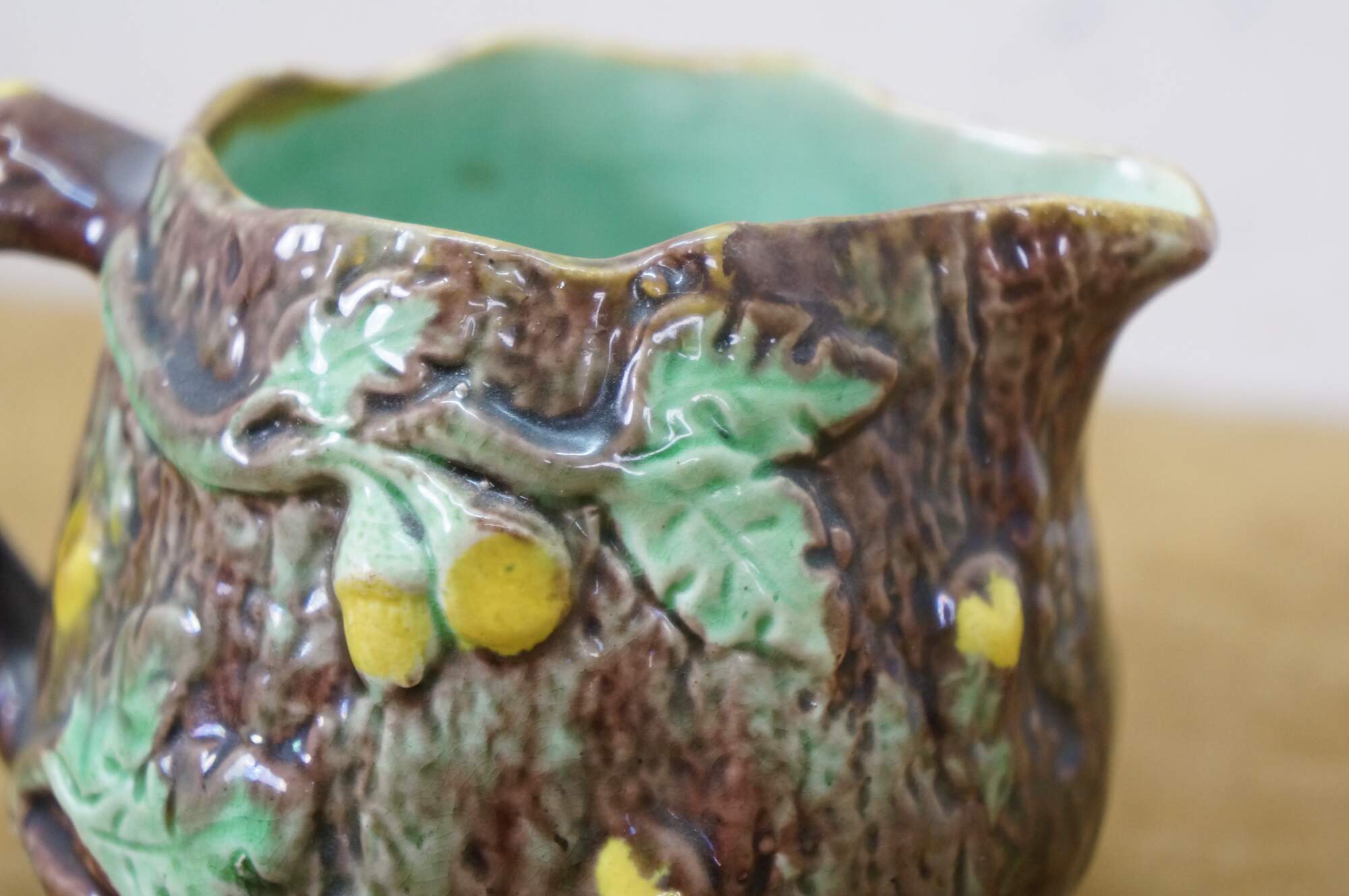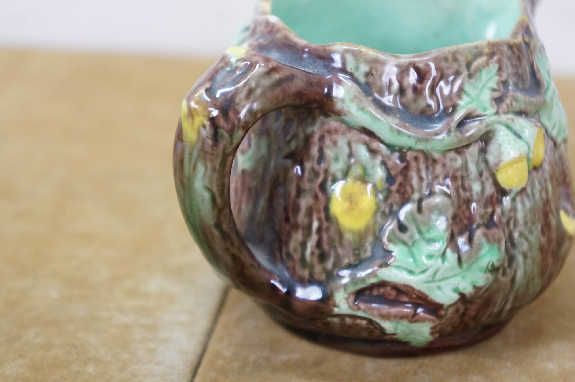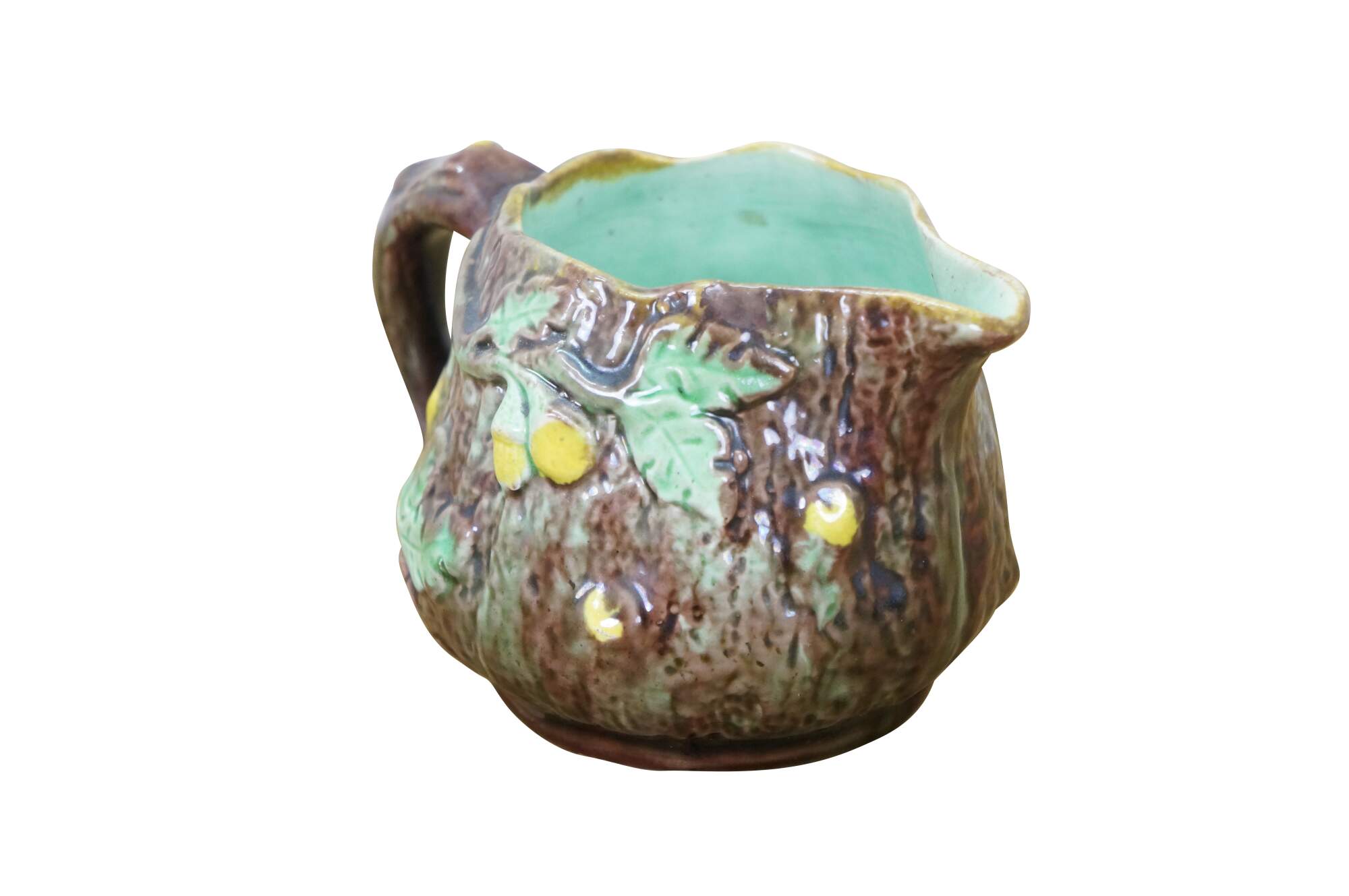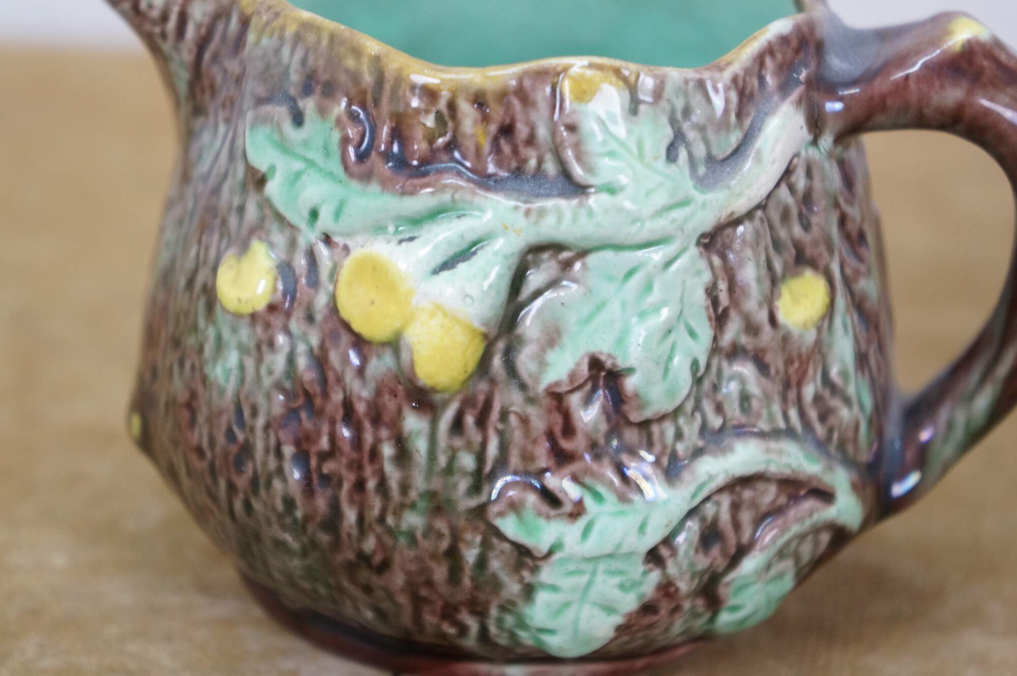 Late 19th to early 20th century majolica porcelain creamer / cream jug - squat shape with tree bark design with leaves and berries or small acorns. Green interior. No marks.
