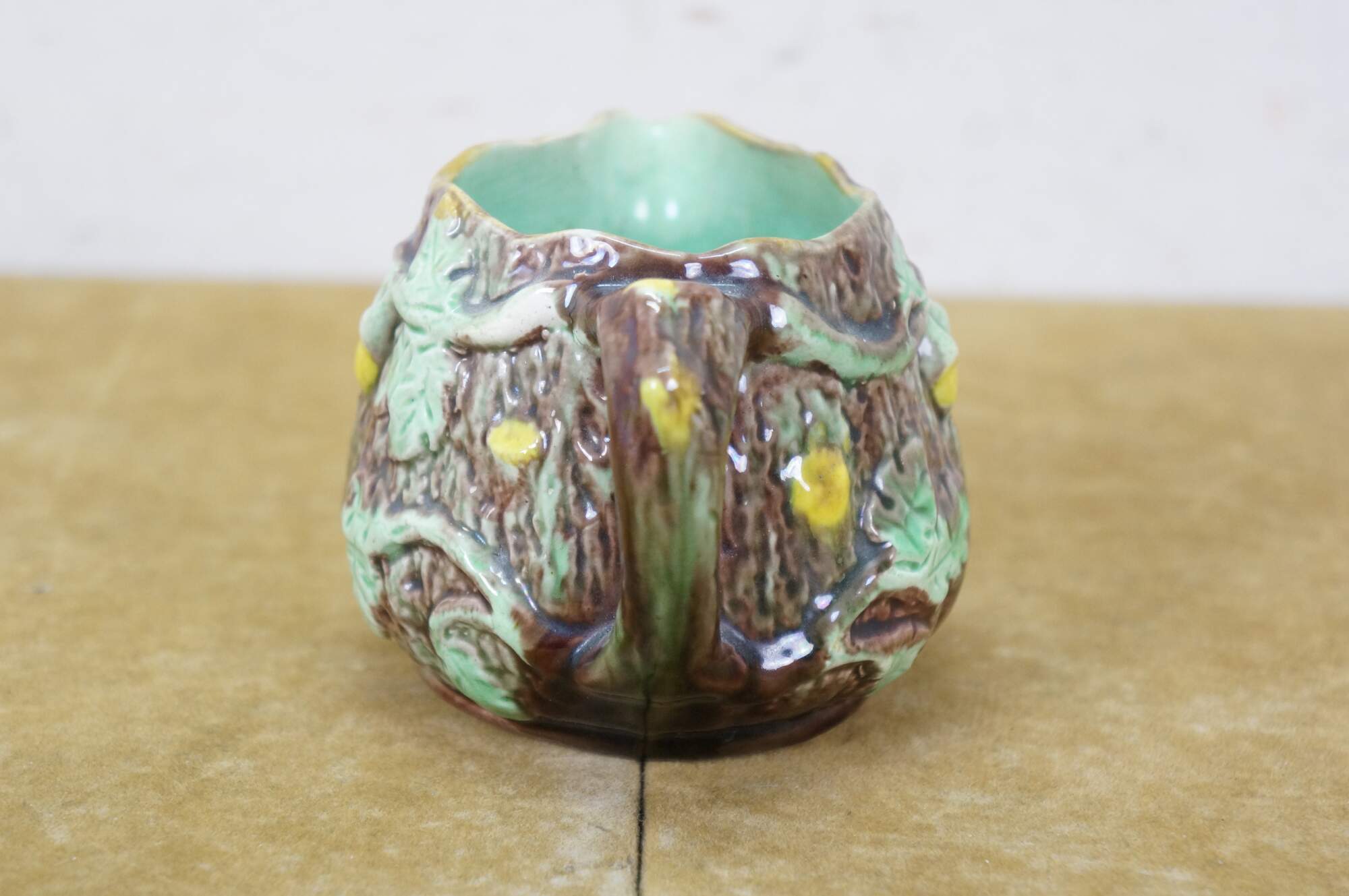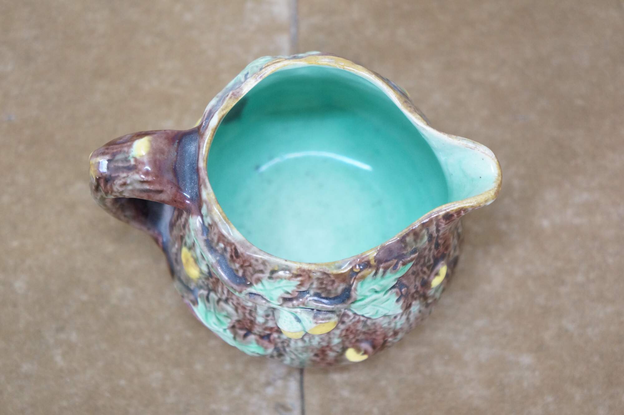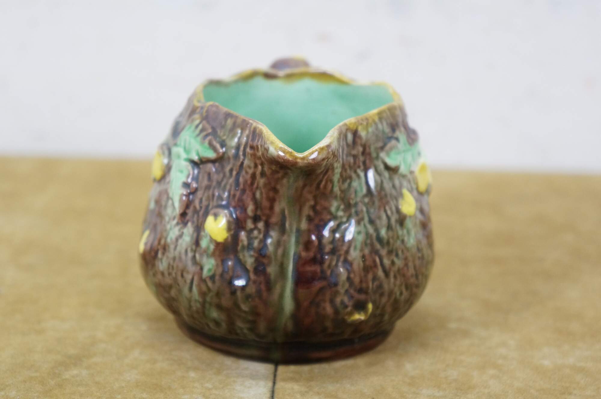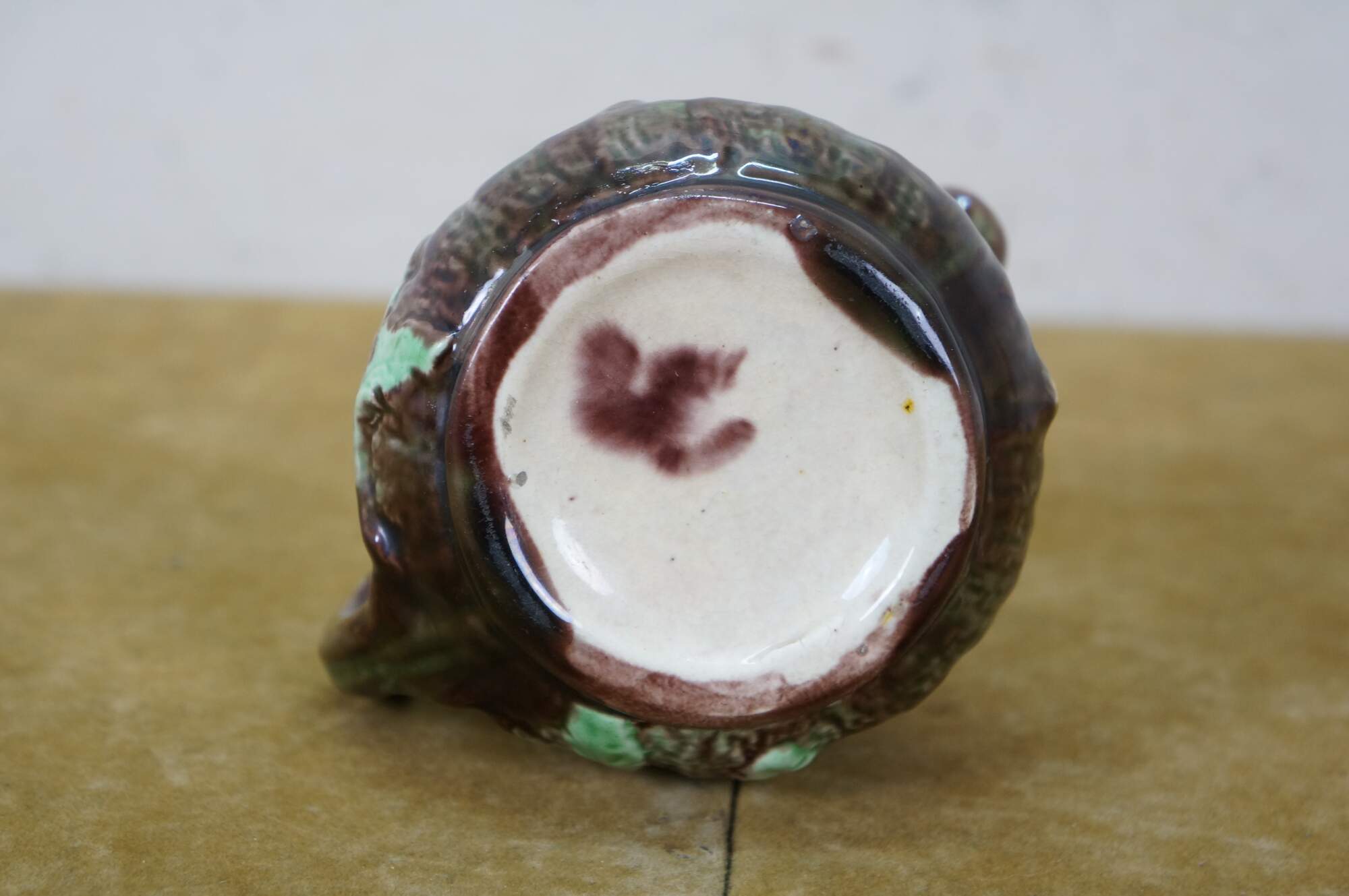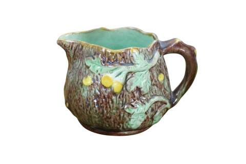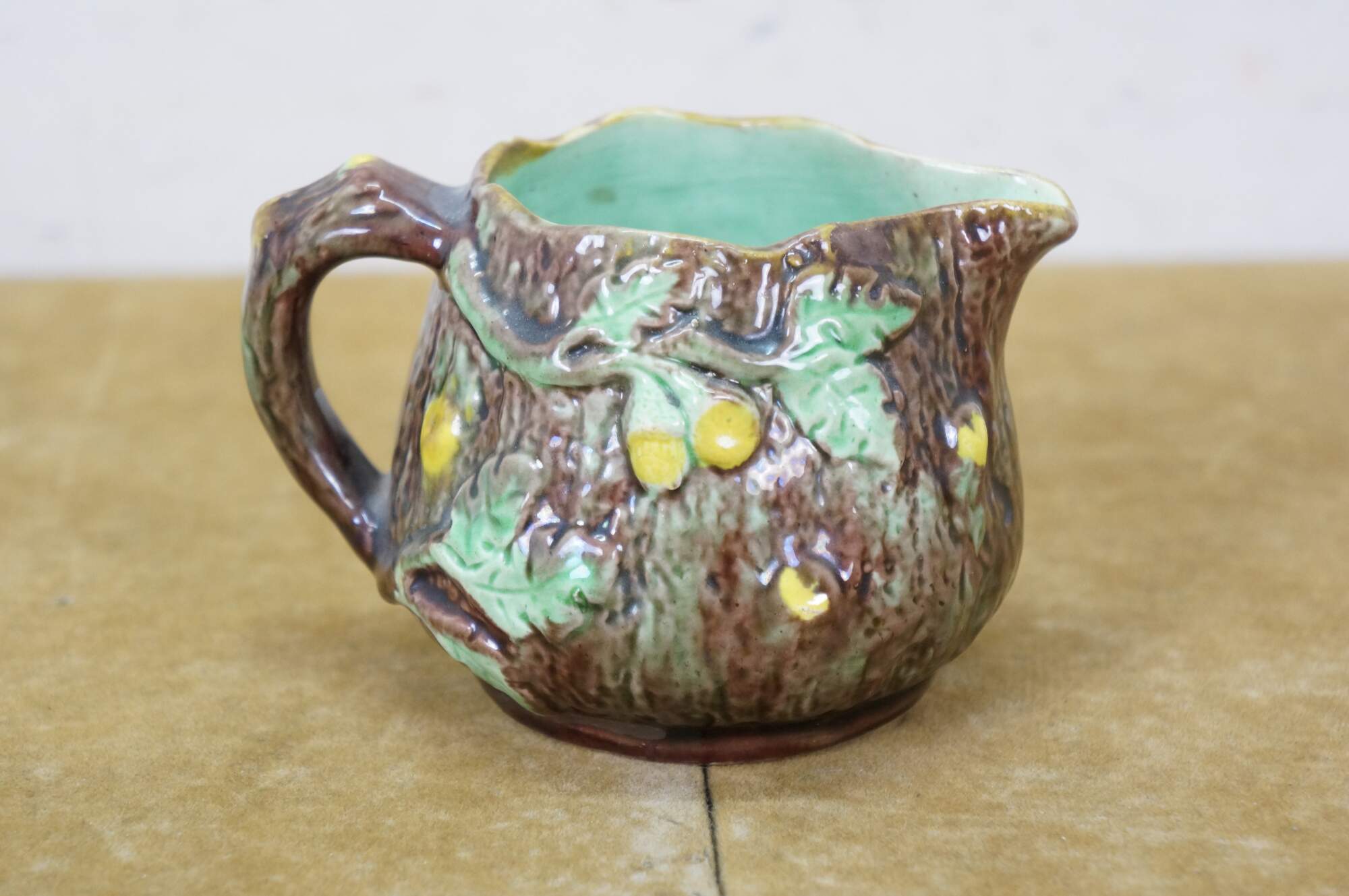 Late 19th to early 20th century majolica porcelain creamer / cream jug - squat shape with tree bark design with leaves and berries or small acorns. Green interior. No marks.